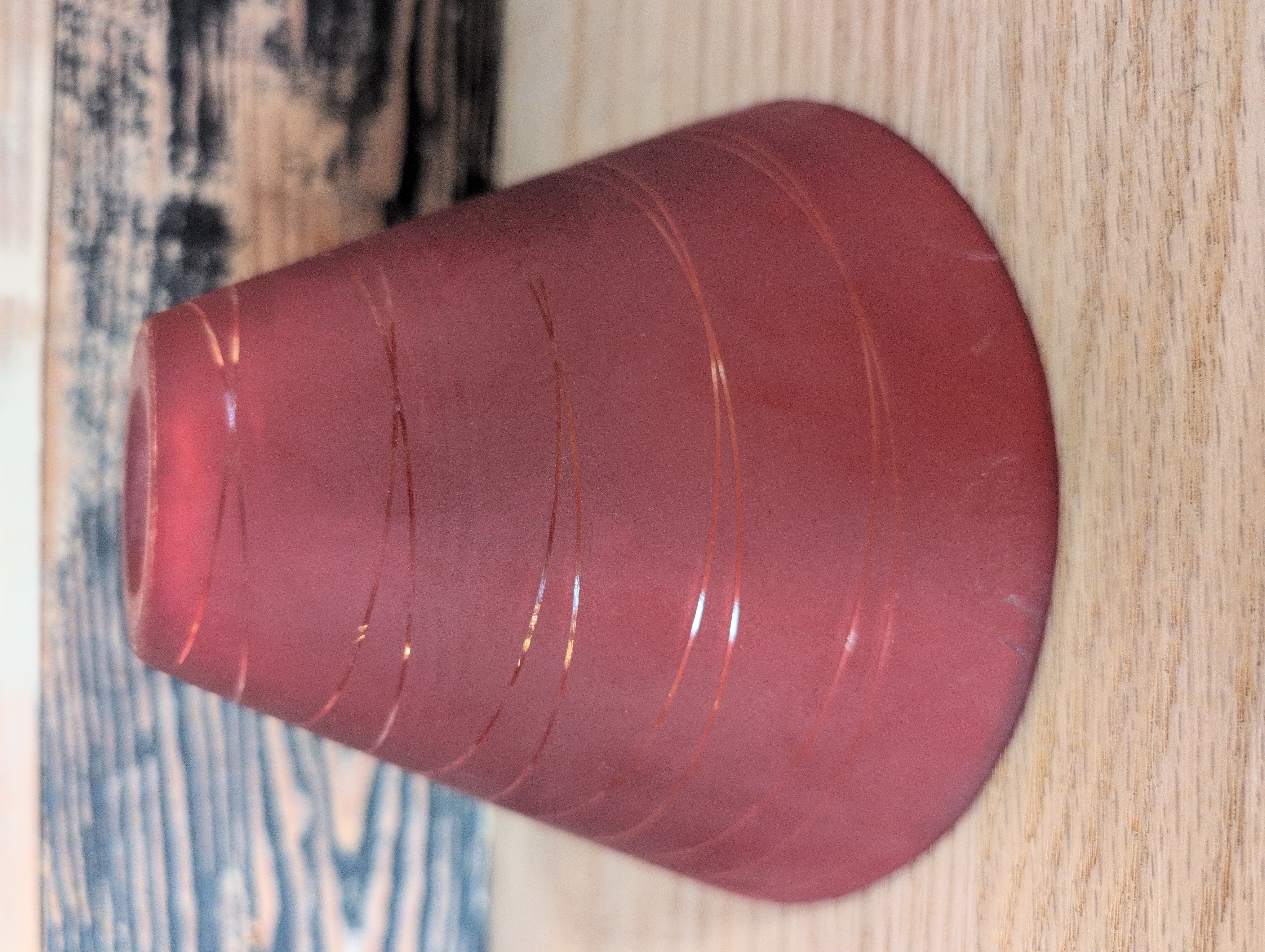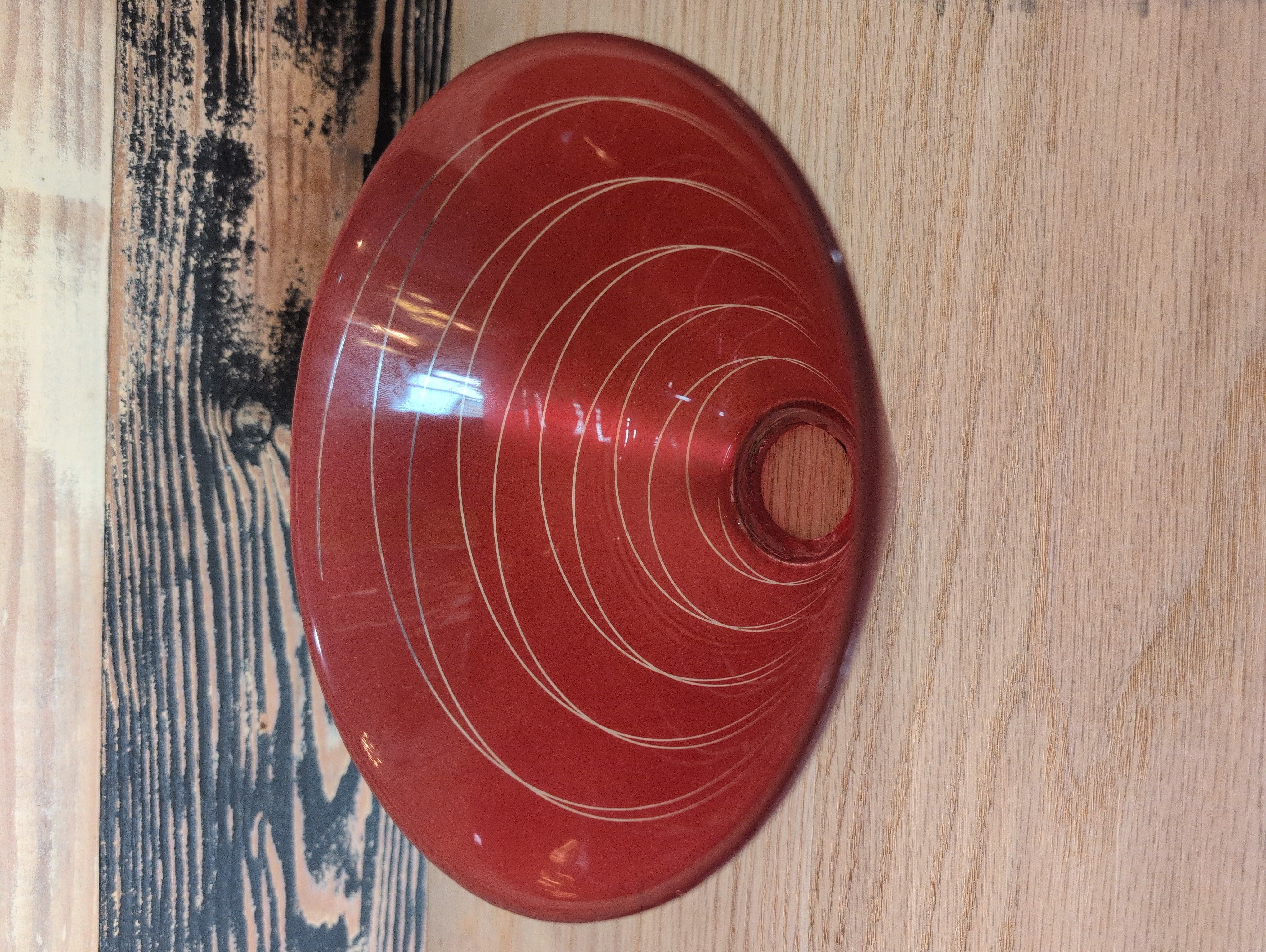 Pendant light shade with a thin concentric circle design and red frosted glass. Images are representational.
