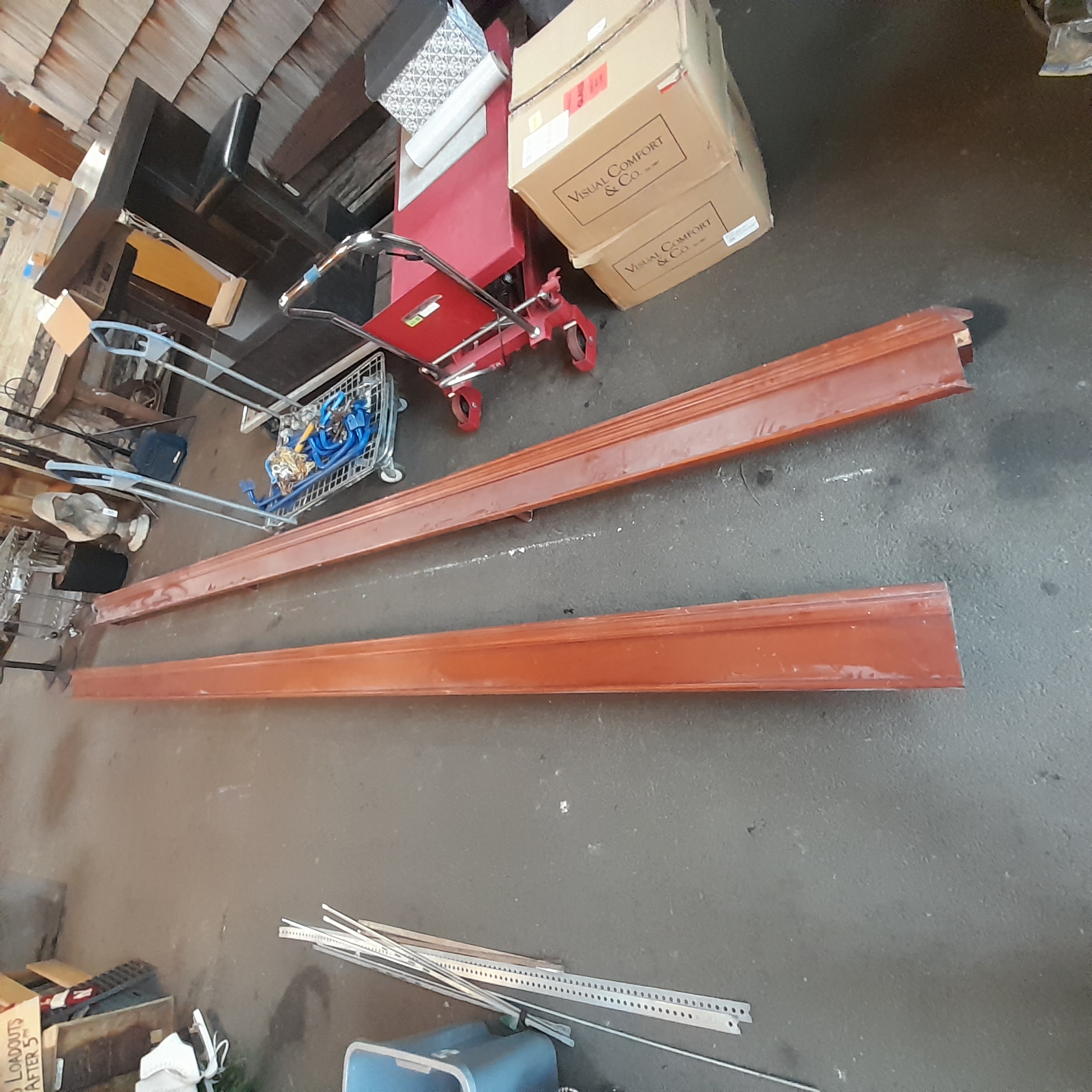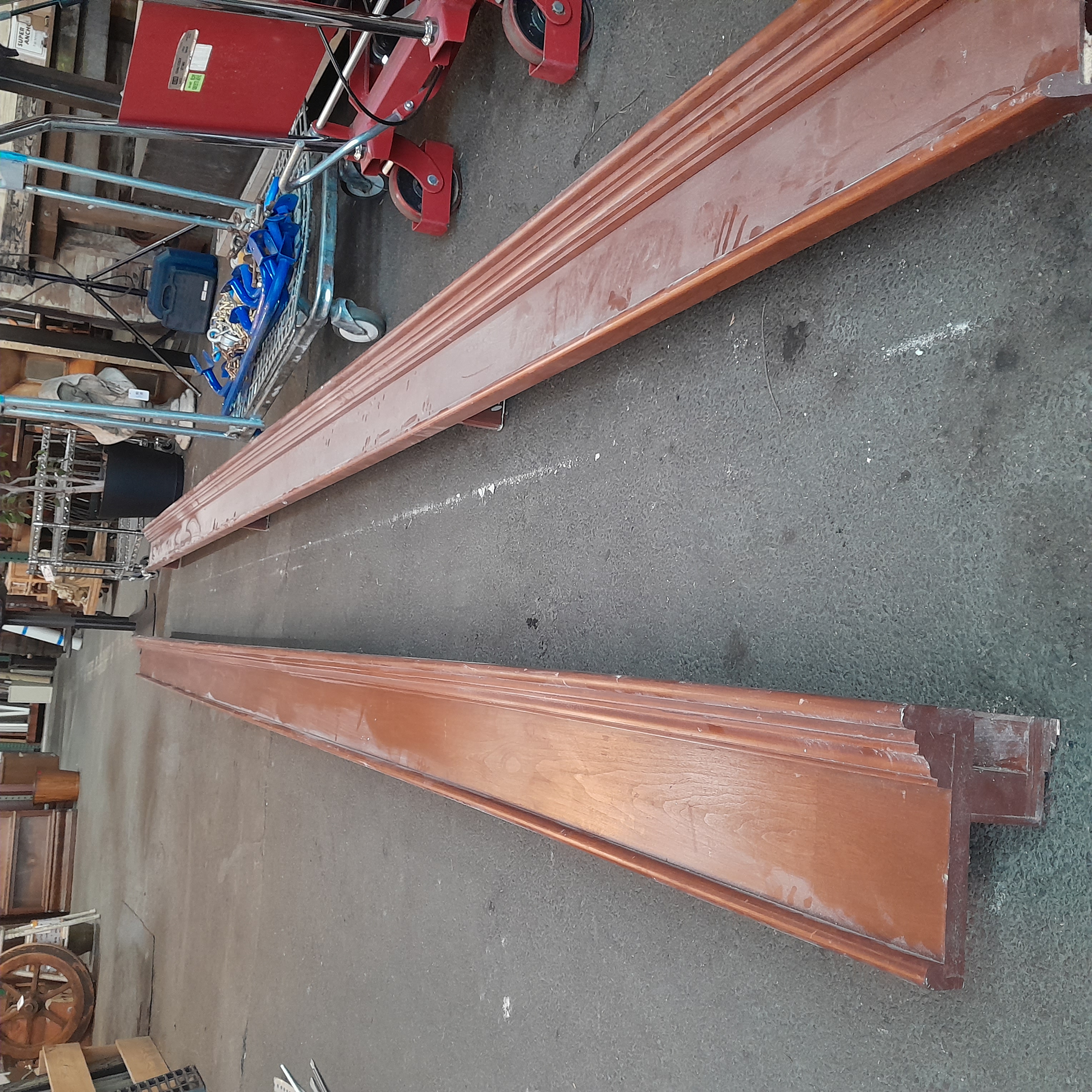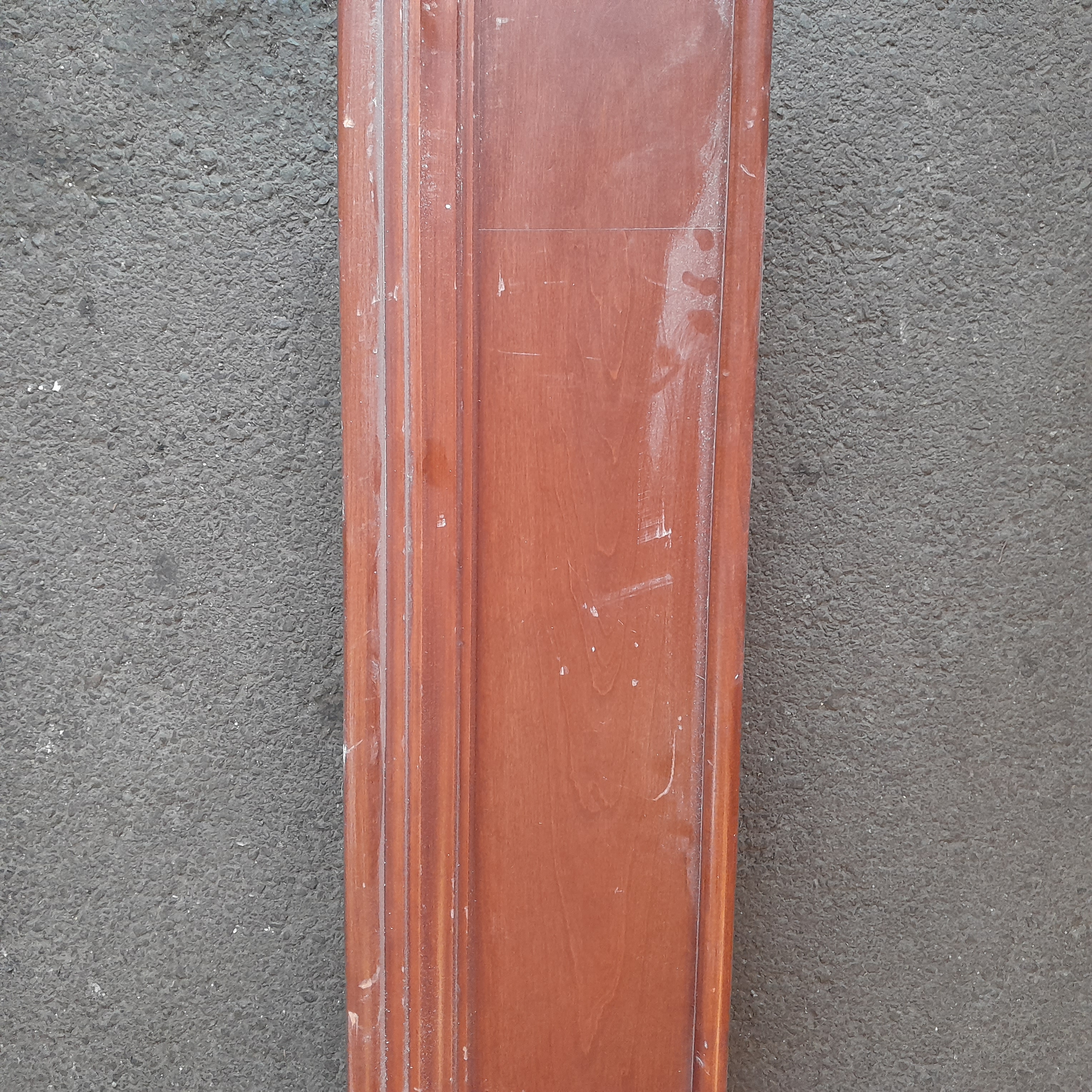 These pieces of cherry wood were apart of a large section above windows in a dining room. They were all connected but once removed they have been split up into a couple sections. The side profile can be seen on photos. The cherry does have a finish on it and the wood only has a few bumps or scuffs but no major damage.