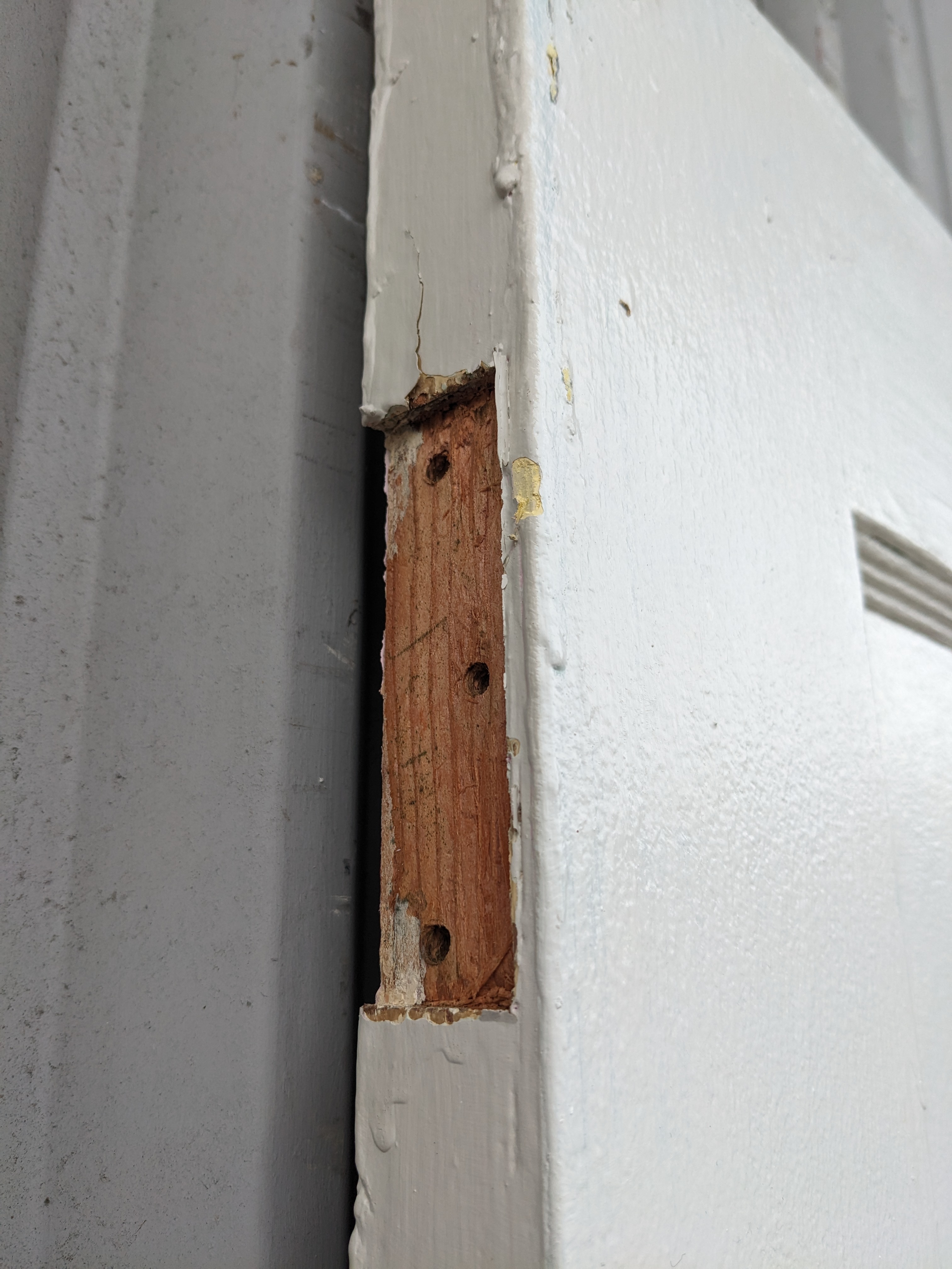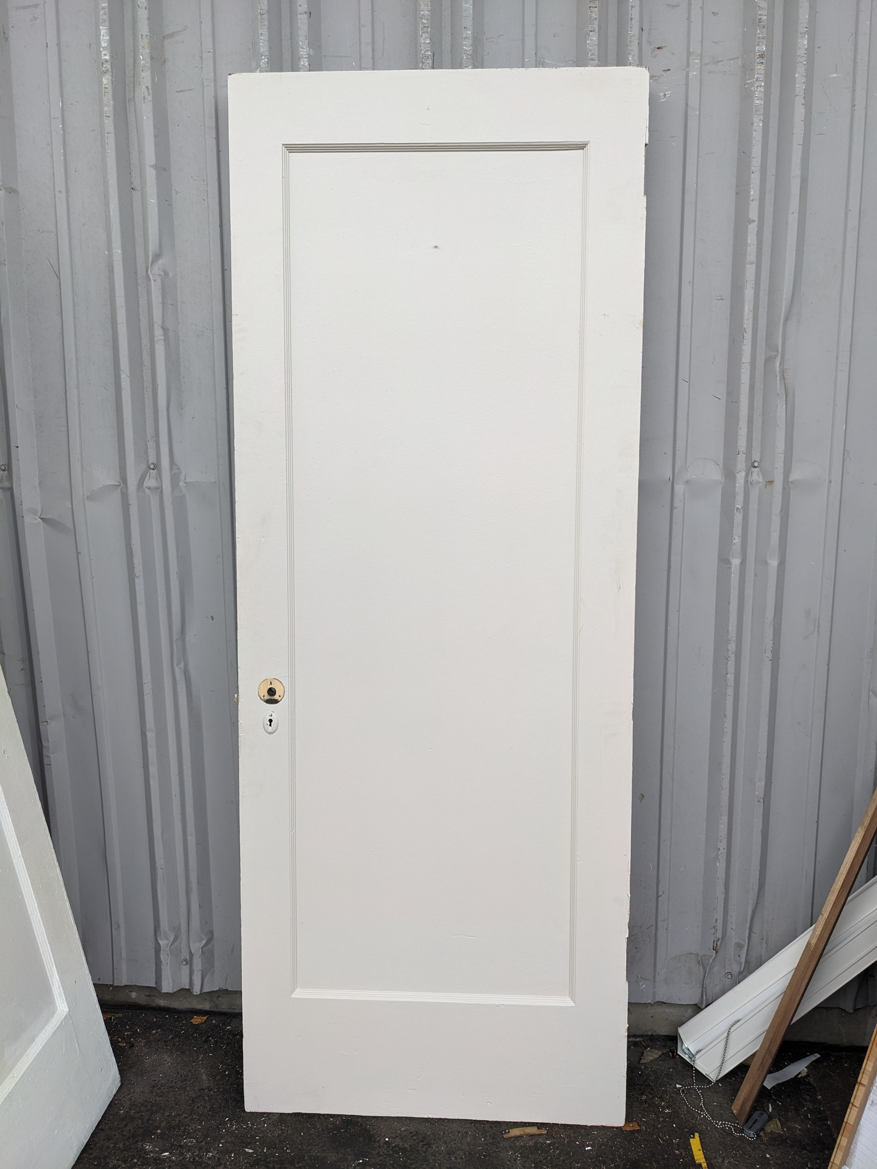 Solid one panel interior slab door. Painted white on both sides. Left swing.