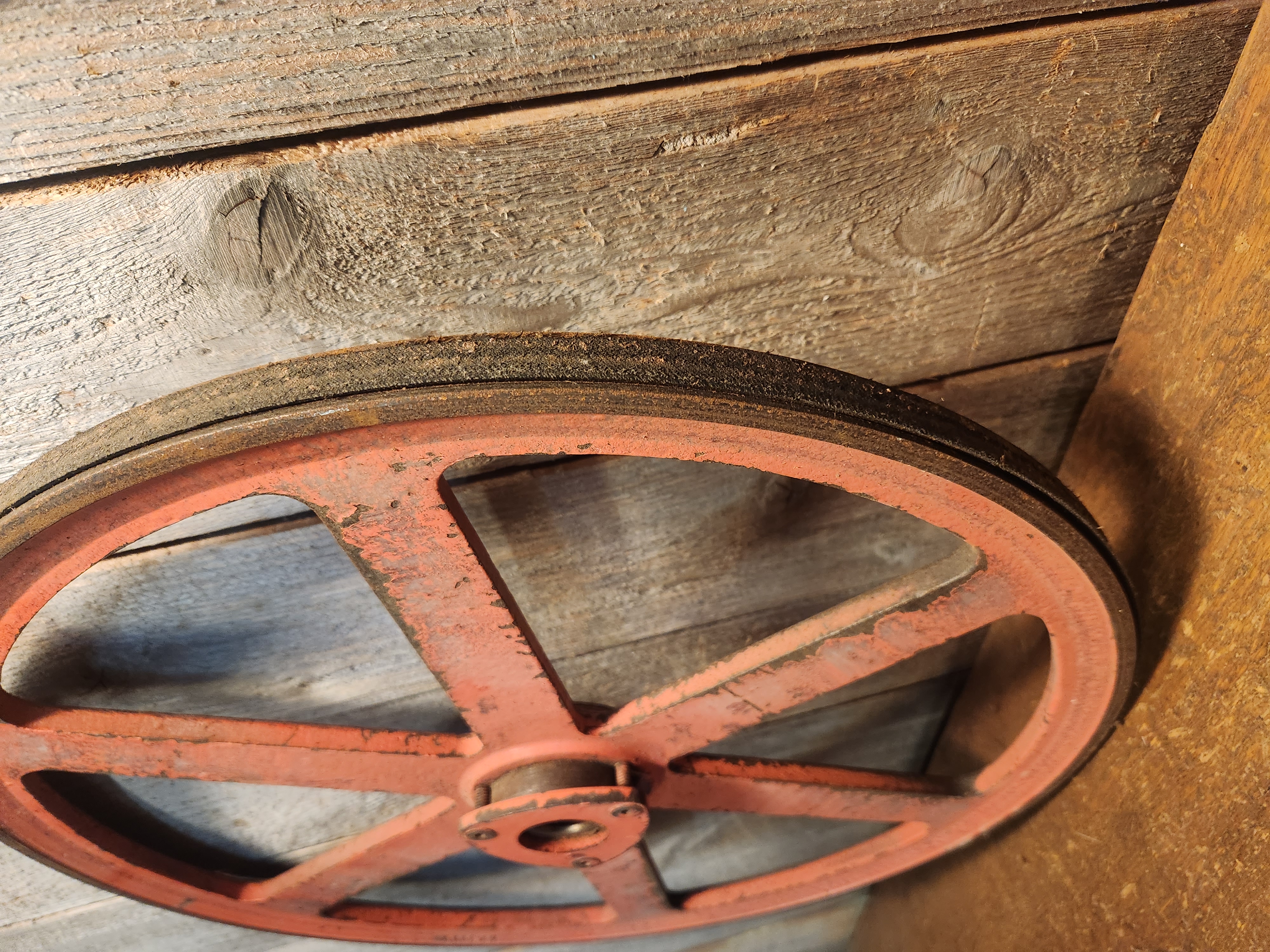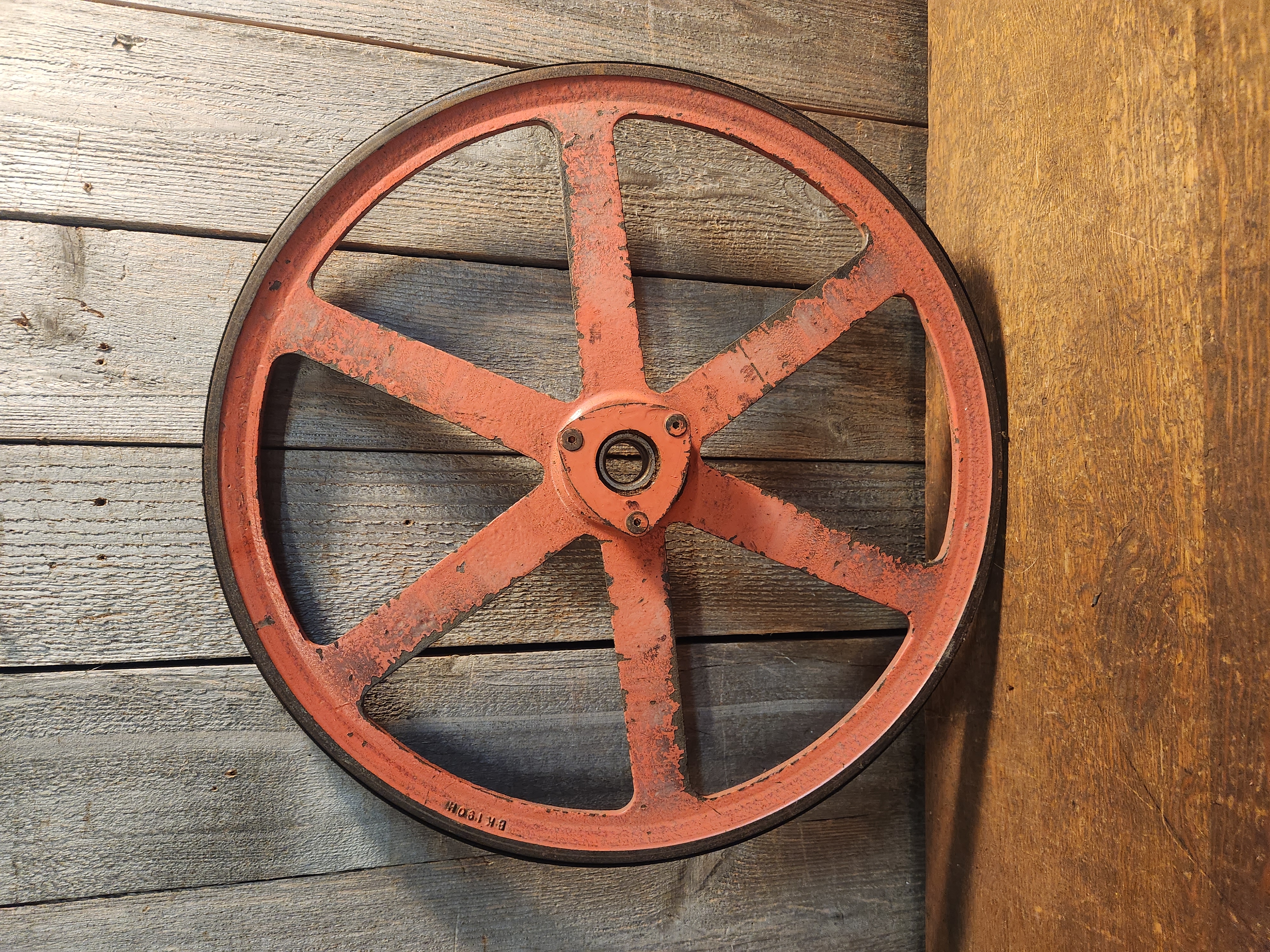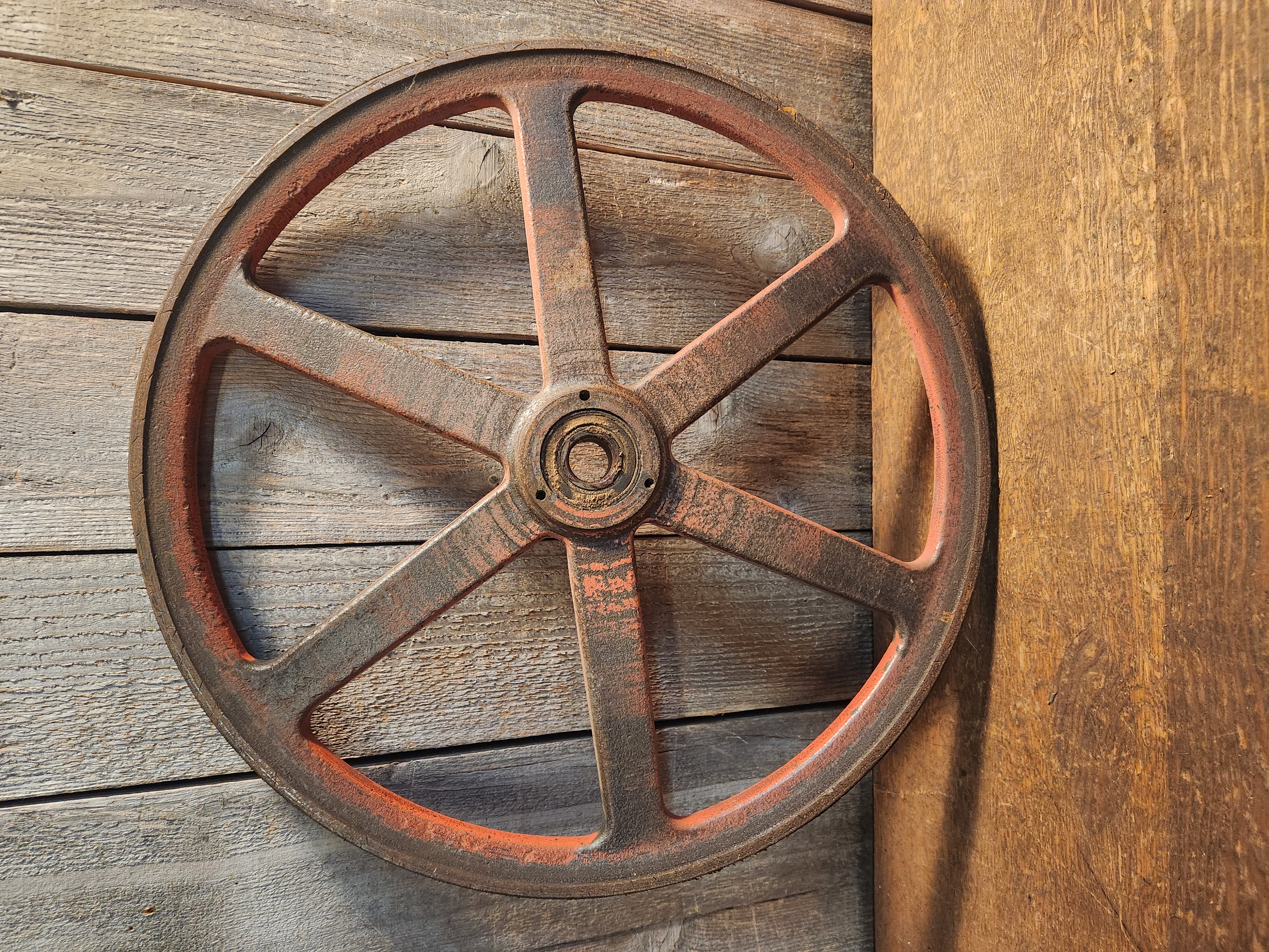 An industrial wheel that came out of Hillsdale lumber mill. Solid and heavy with a rubber lining around the edges. It measures 18.75 x 1.75