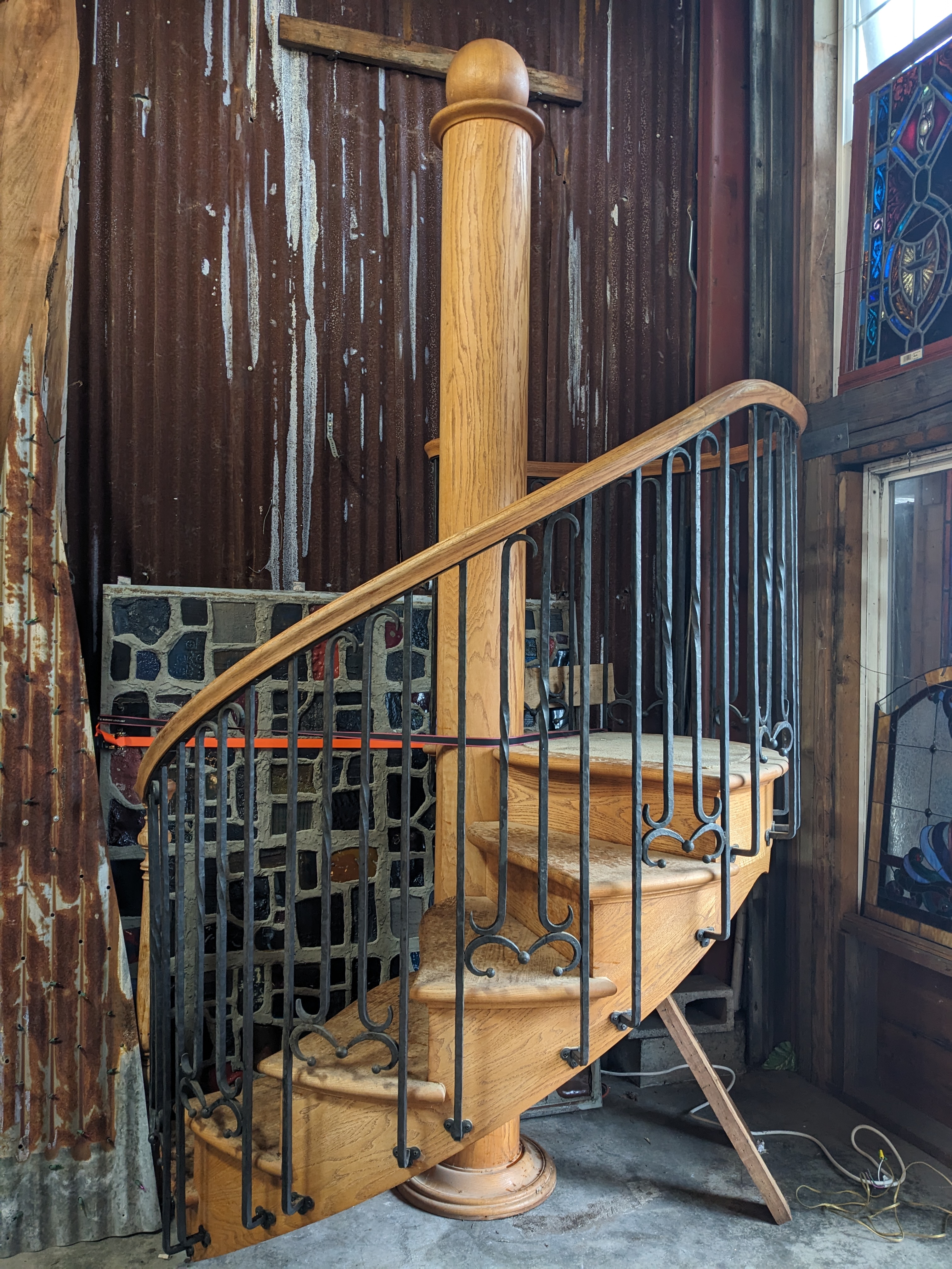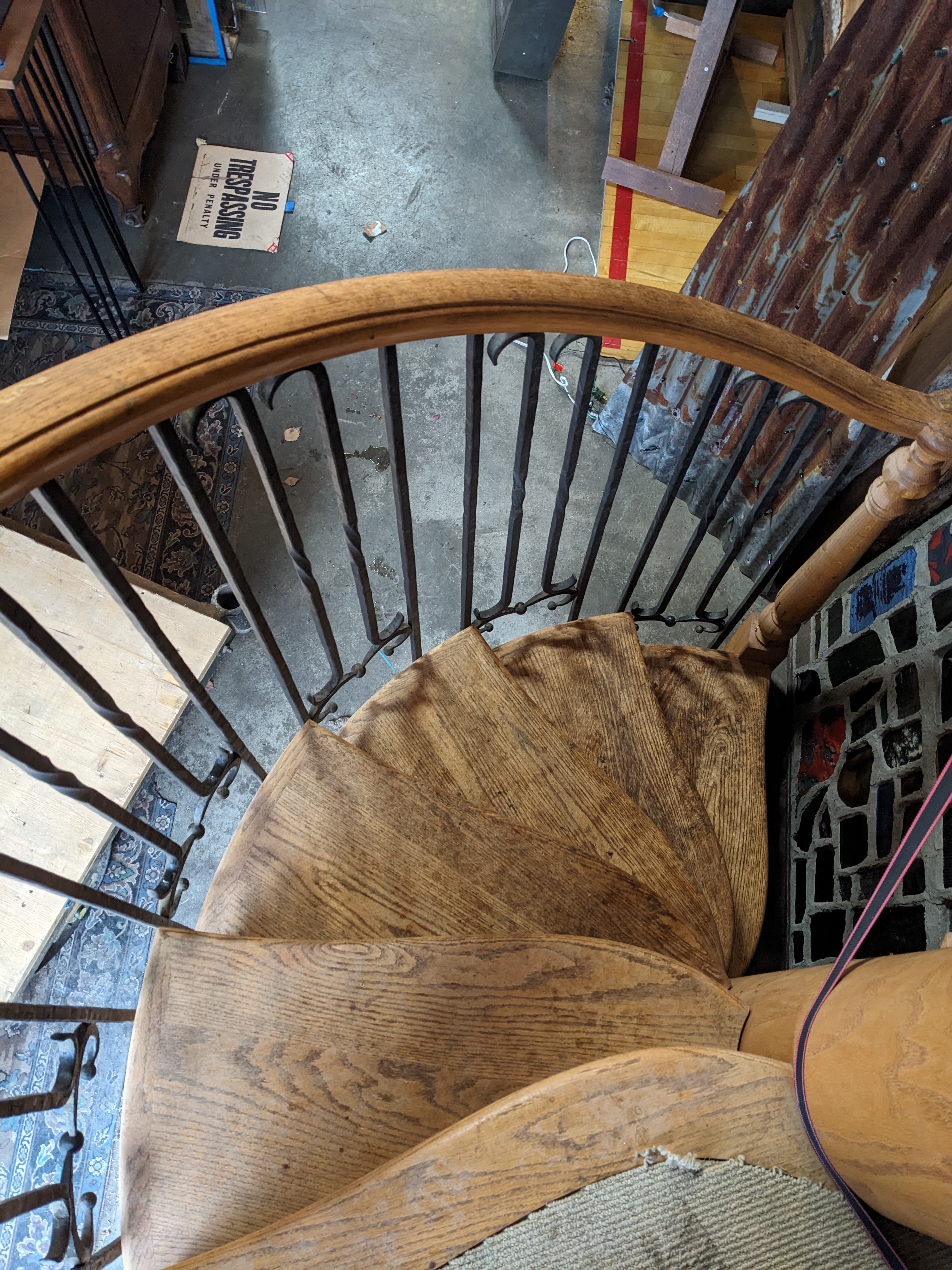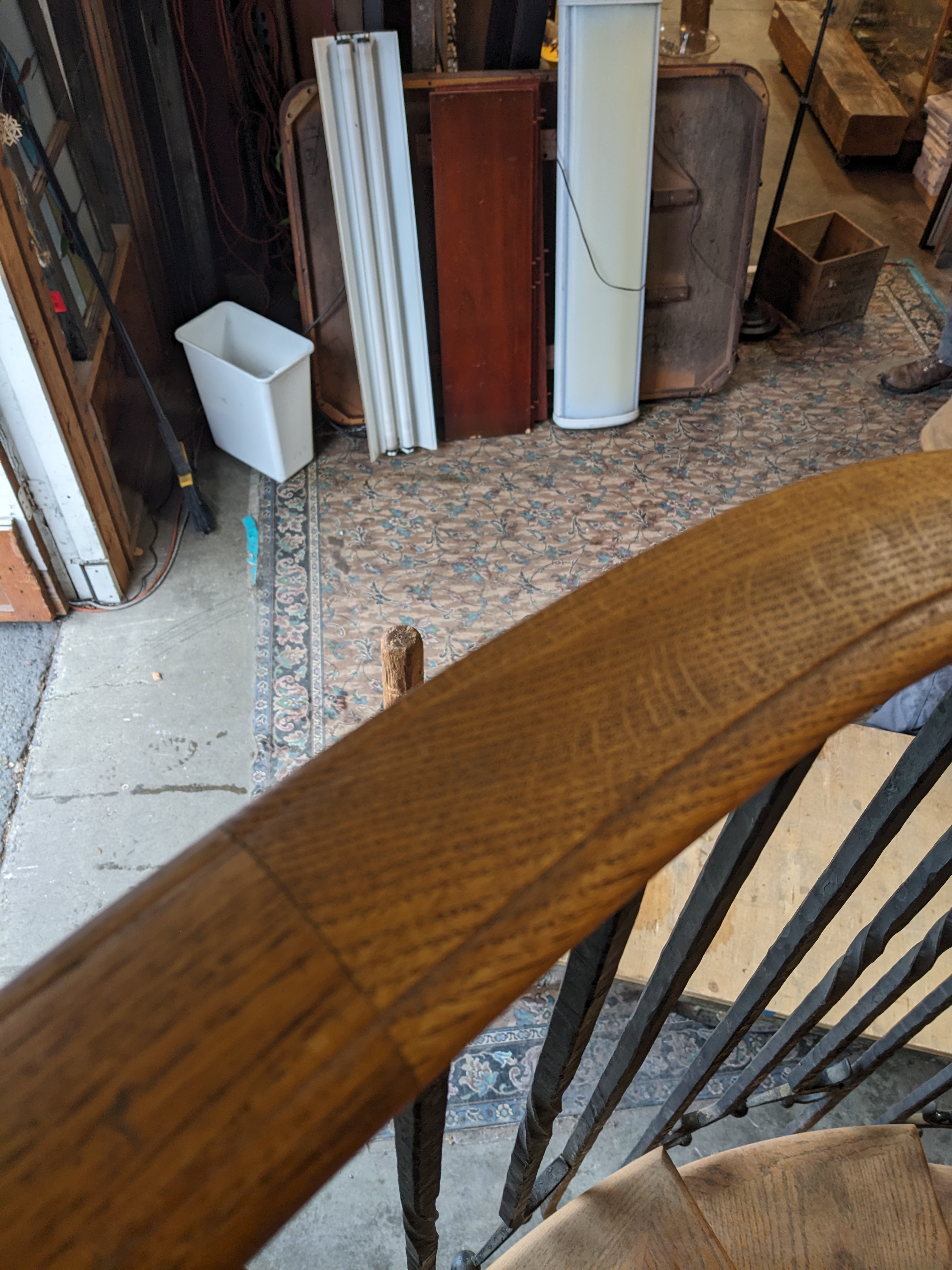 This beautiful 6 stair spiral staircase is sure to be a stunner, no matter how you utilize it. This piece features solid oak wood stairs and railing, with wrought iron spindles. It's in great condition with no damage present. The landing is carpeted and the carpet is also clean and in good condition but would likely need to be replaced to match your unique needs.
