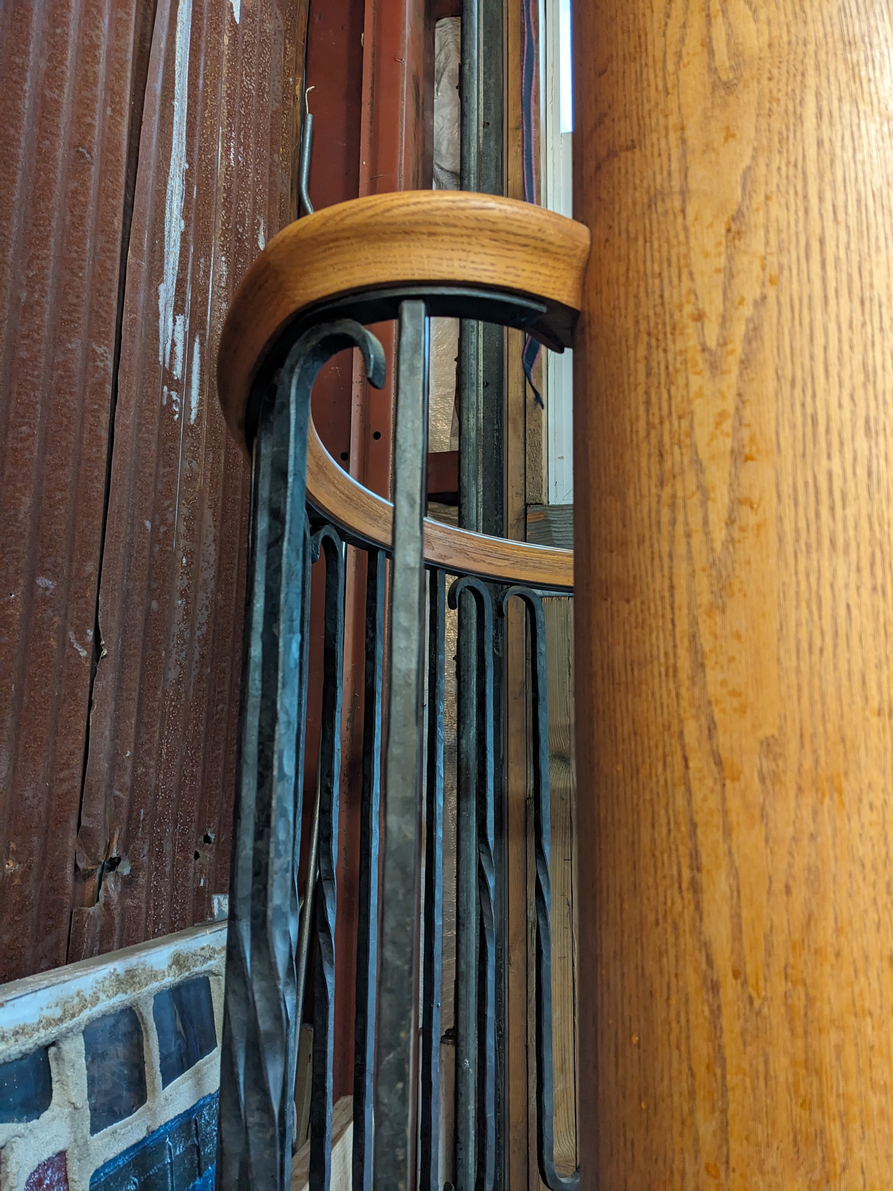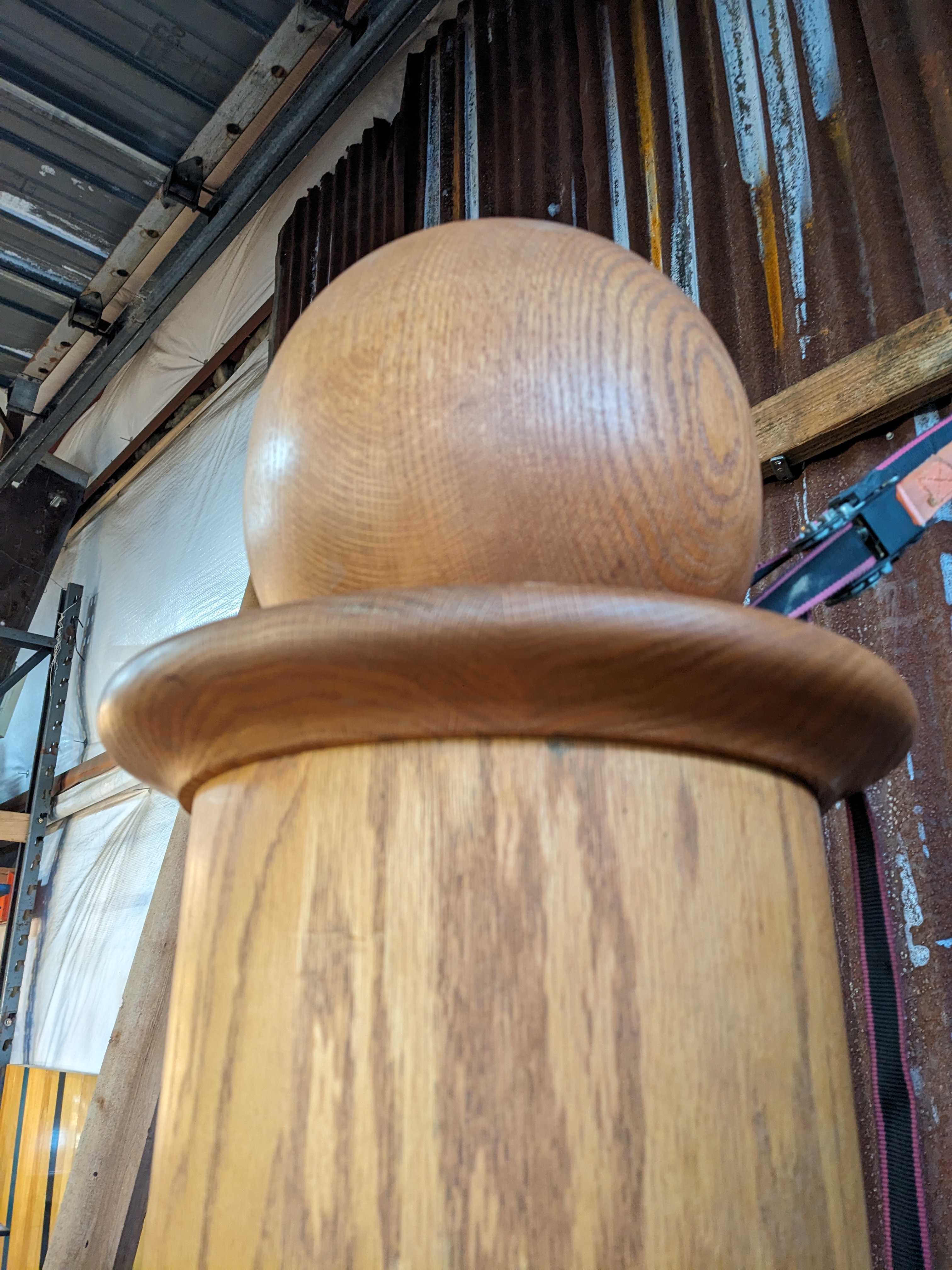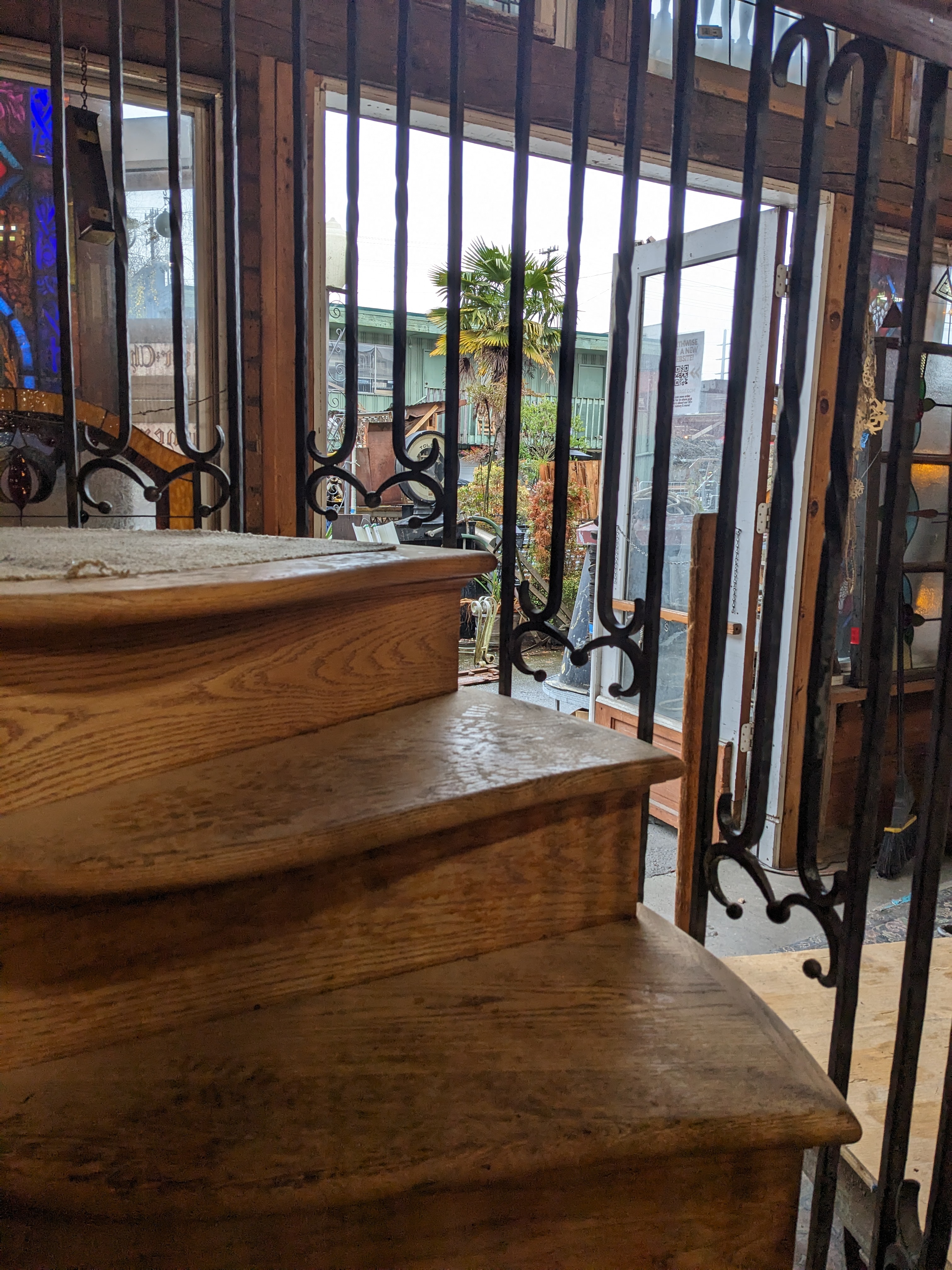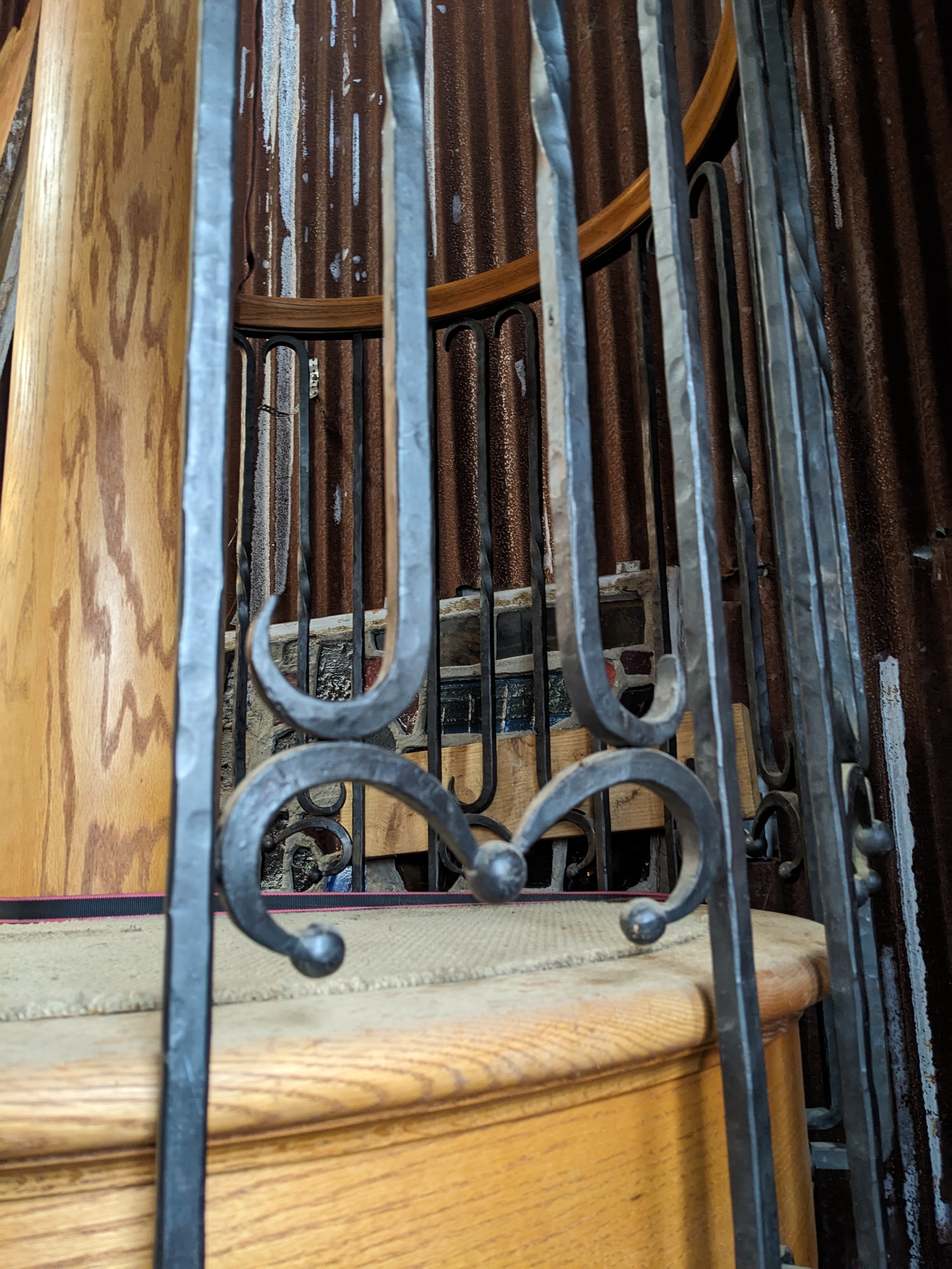 This beautiful 6 stair spiral staircase is sure to be a stunner, no matter how you utilize it. This piece features solid oak wood stairs and railing, with wrought iron spindles. It's in great condition with no damage present. The landing is carpeted and the carpet is also clean and in good condition but would likely need to be replaced to match your unique needs.