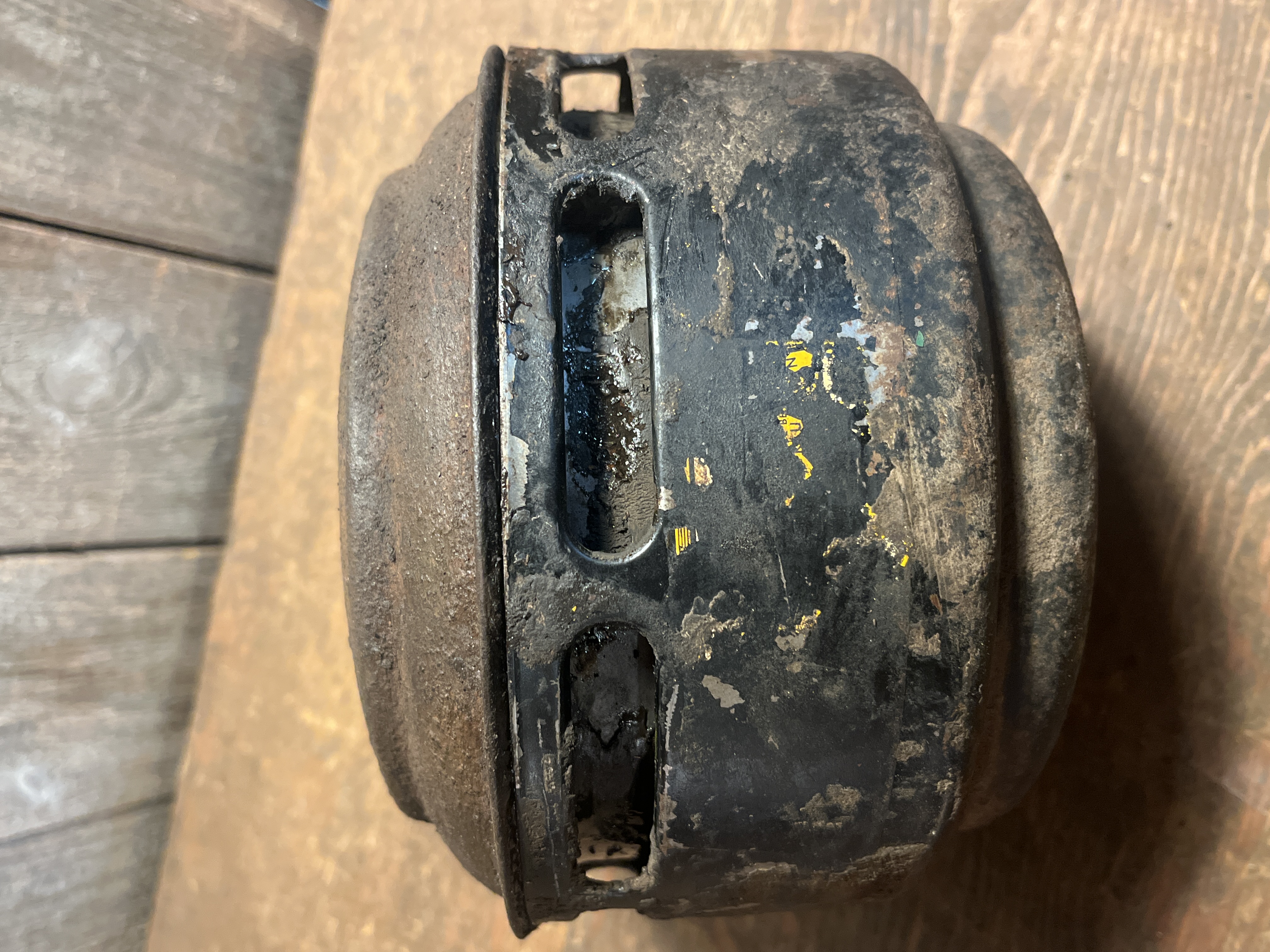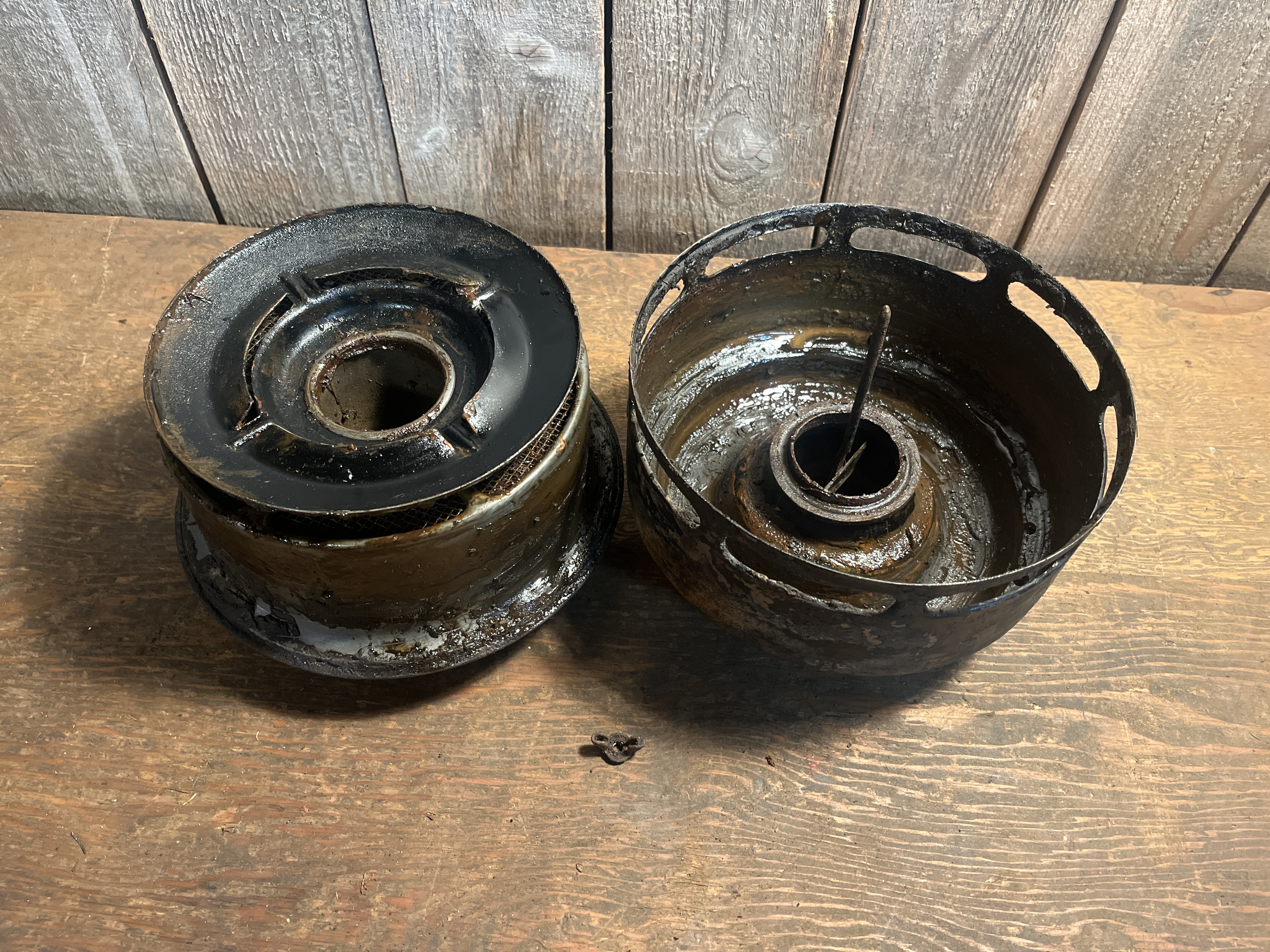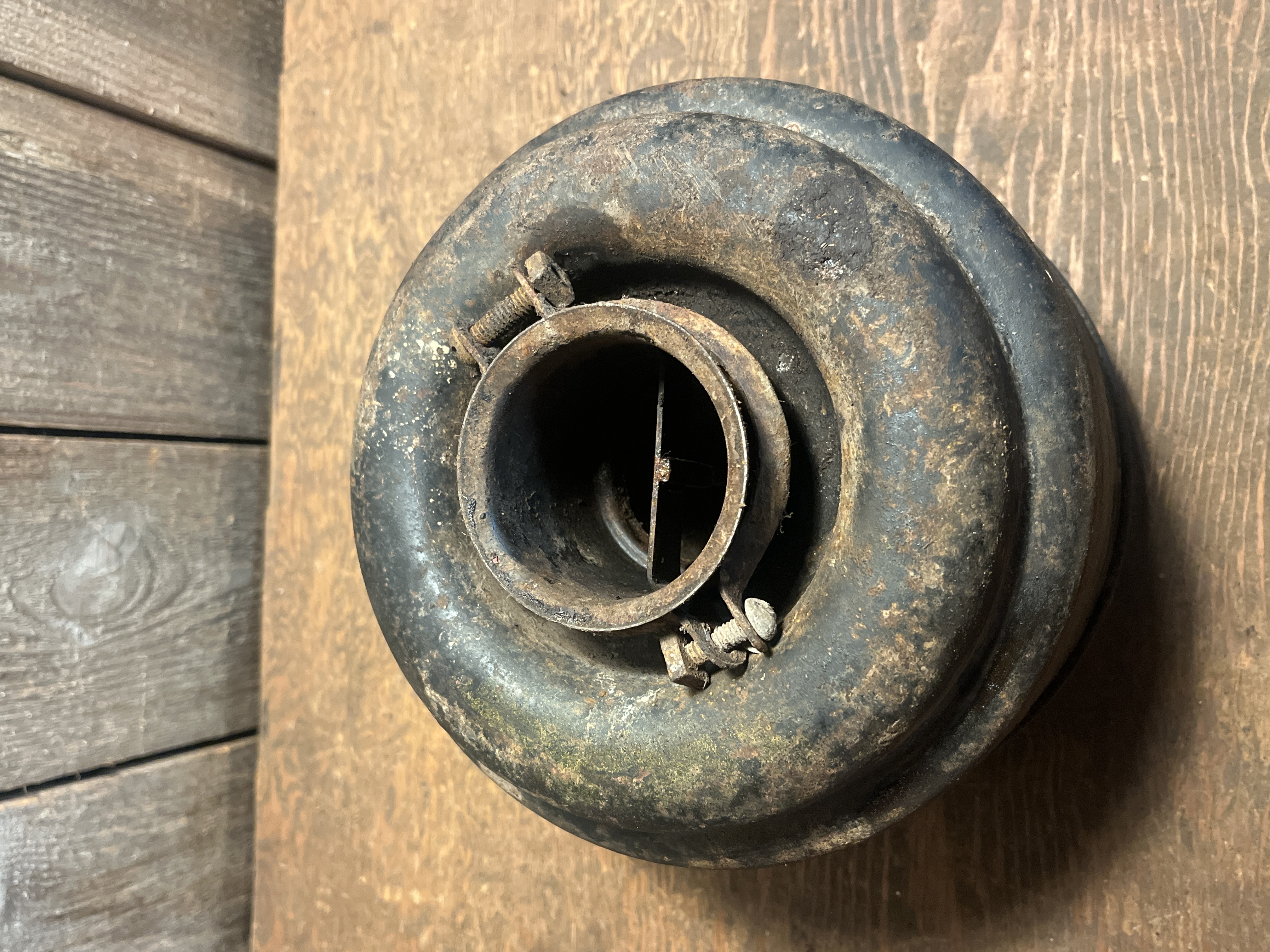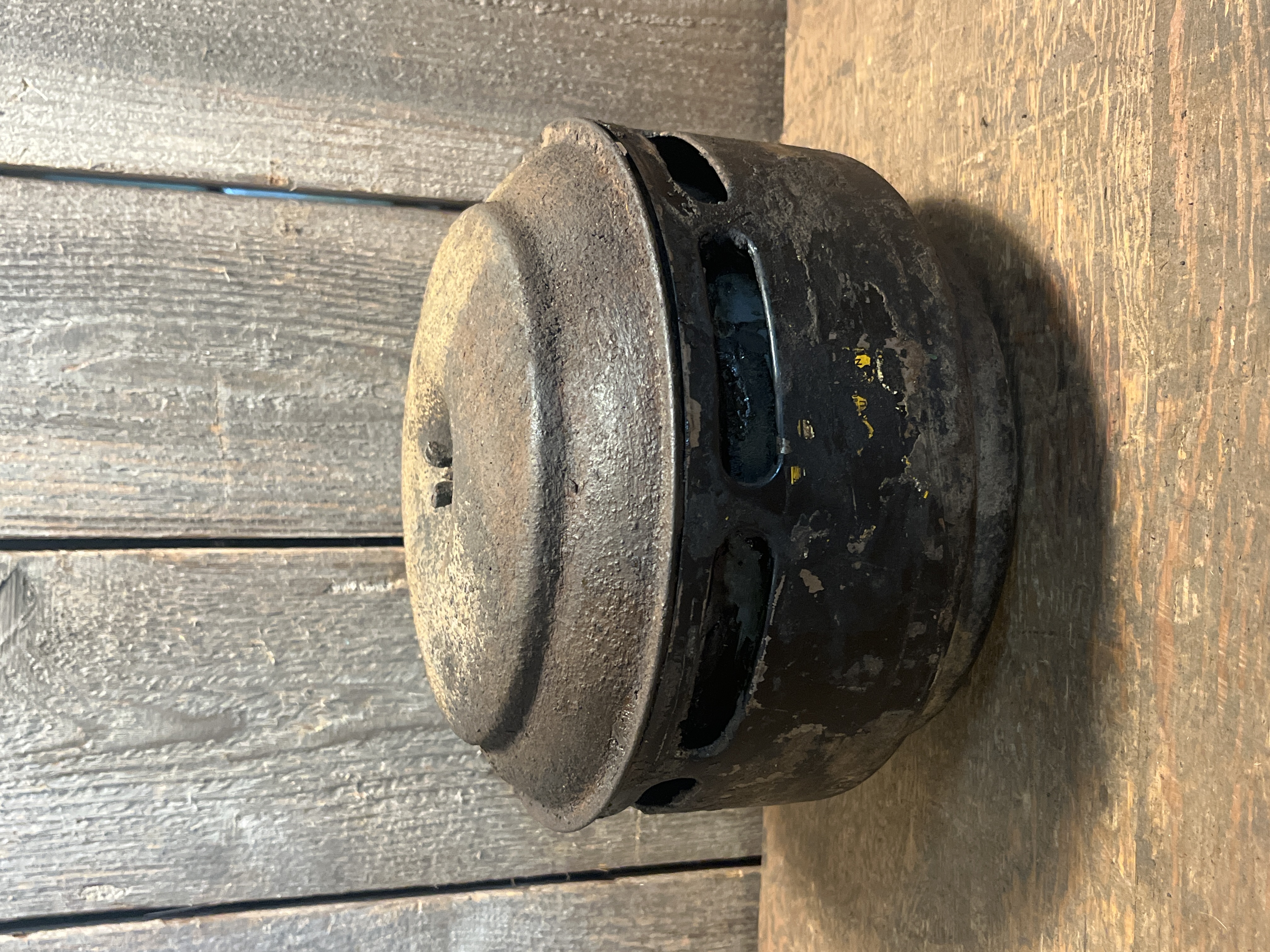 A cool old oil bath air cleaner ready to repurpose or restore to be used again! It retains most of its original paint, and has a remnant of a decal. It would have fit a single barrel carburetor. There is some pitting on top and could use some further cleaning, but it's all there! Measures 8 x 6 inches.