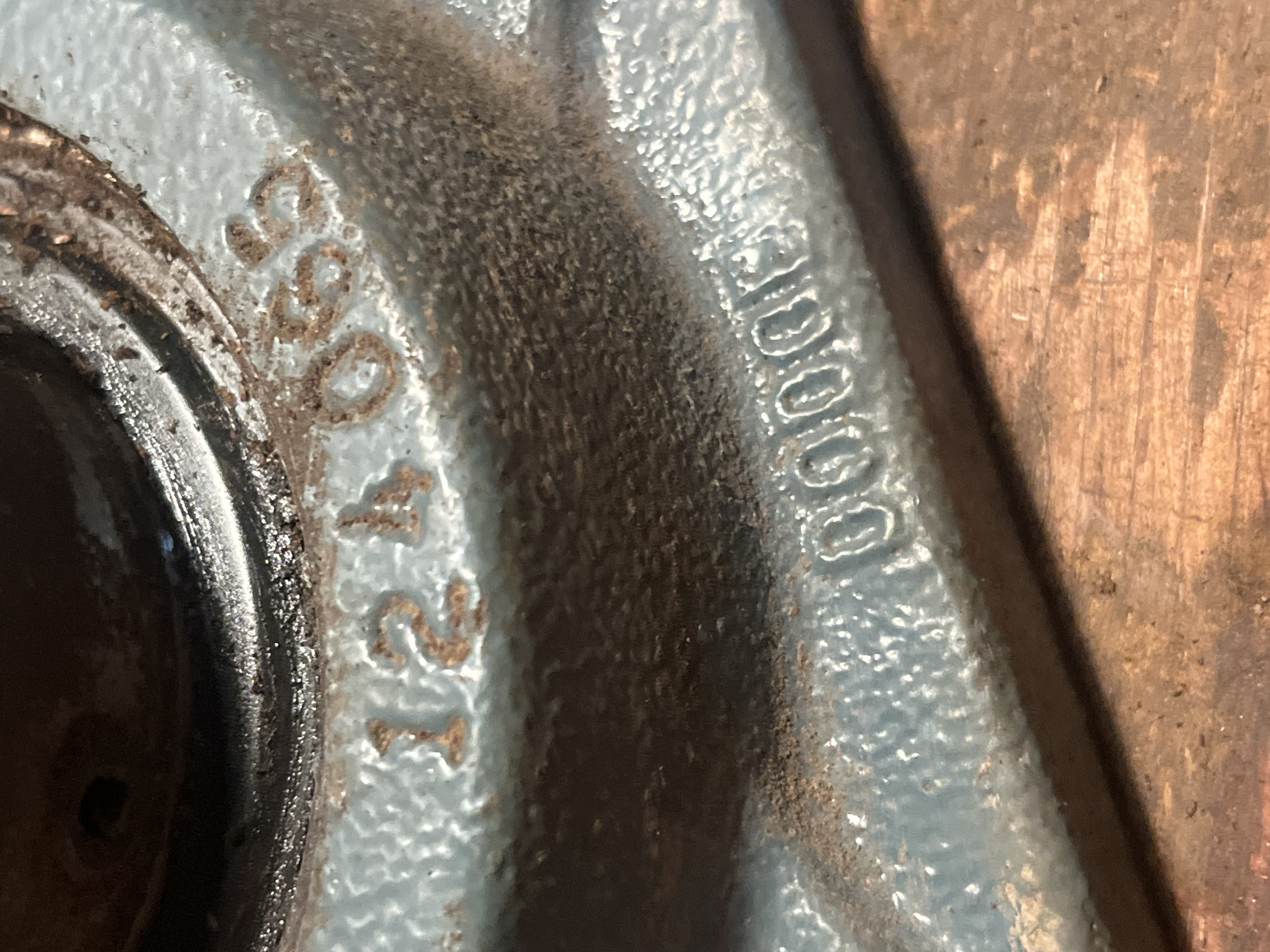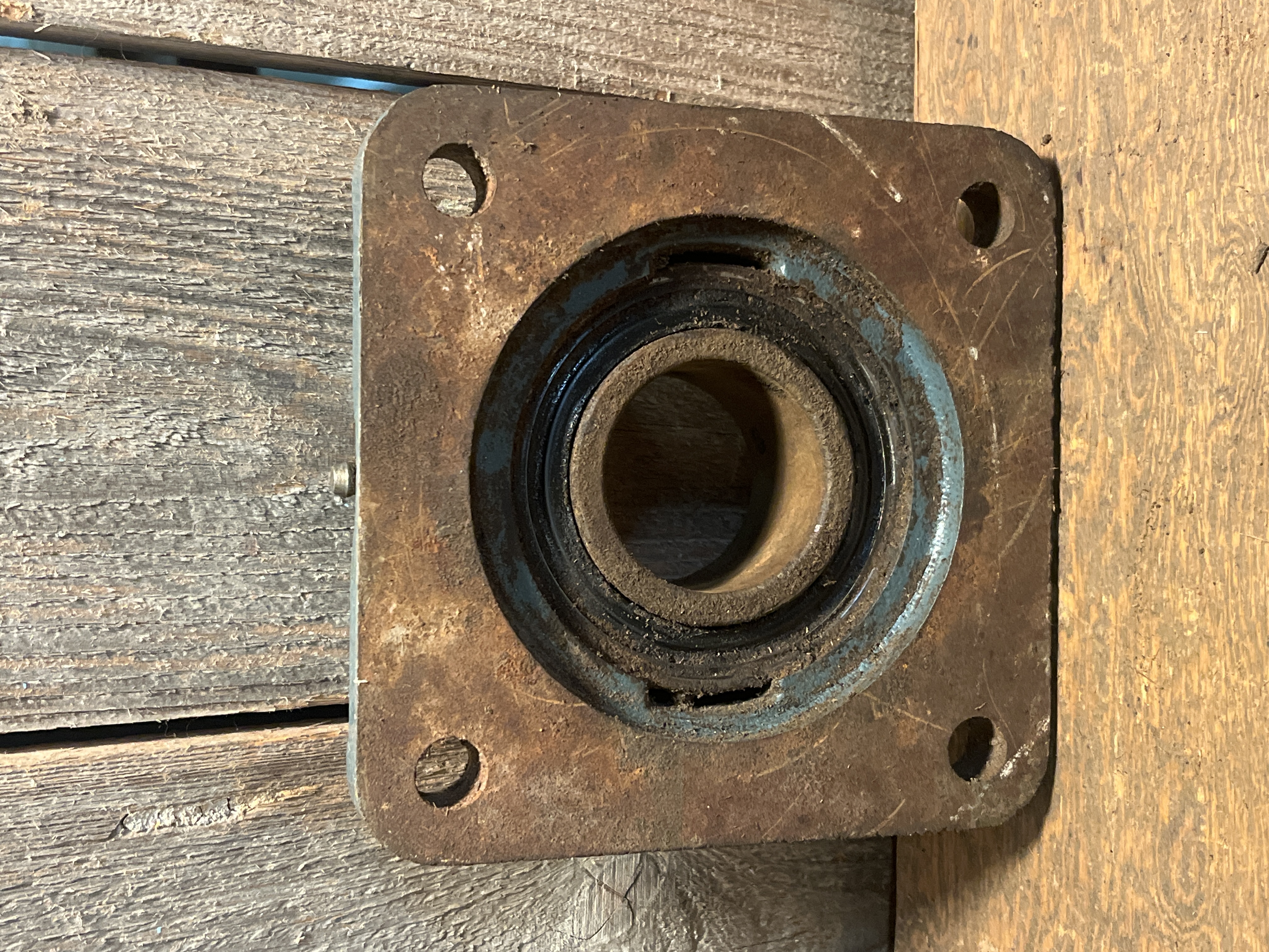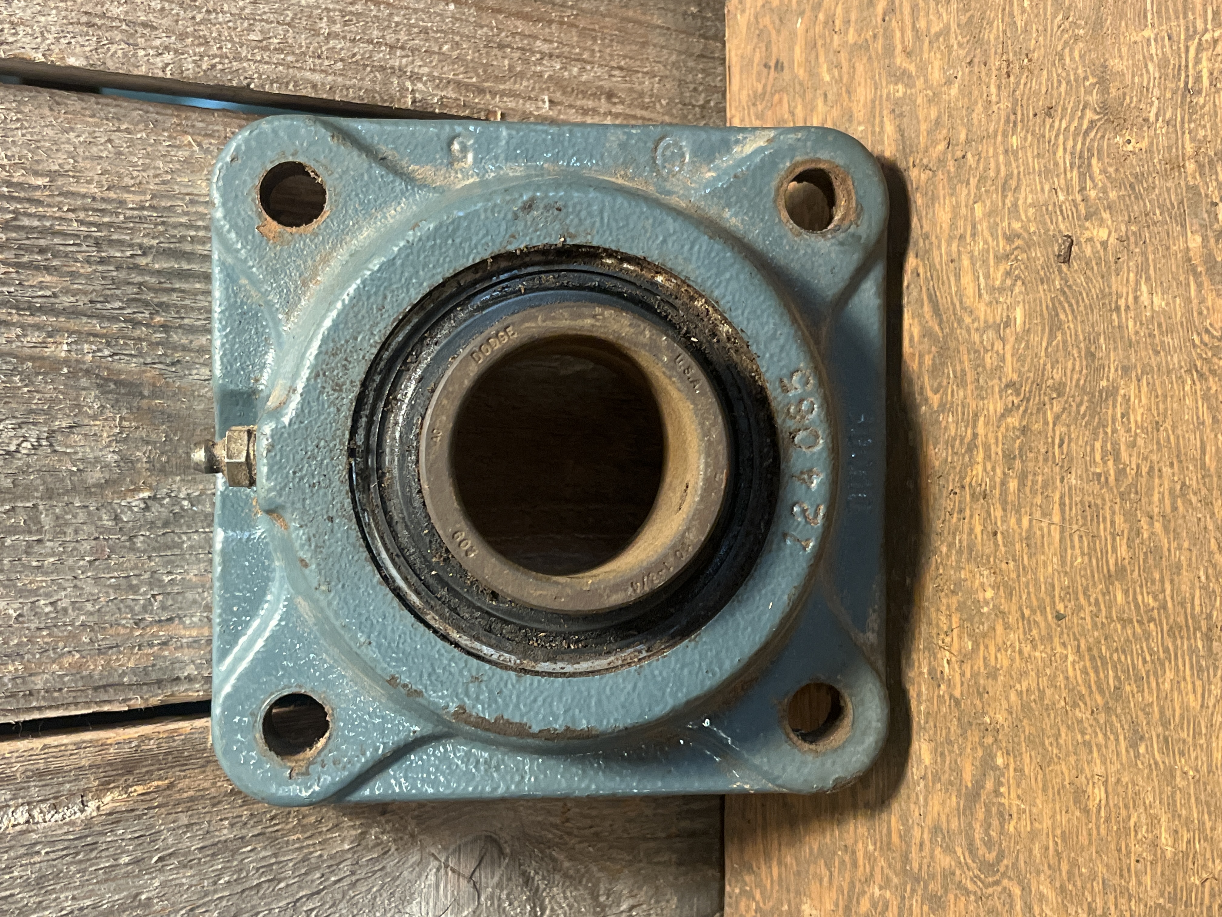This flange bearing is in good shape, it has just been sitting for a while. Bearing spins well with no noise and little resistance. The zerk fitting is still present and in nice shape. The whole casting is 5.25 inches wide and 1.25 deep. The inside diameter of the bearing is 1.75 inches.