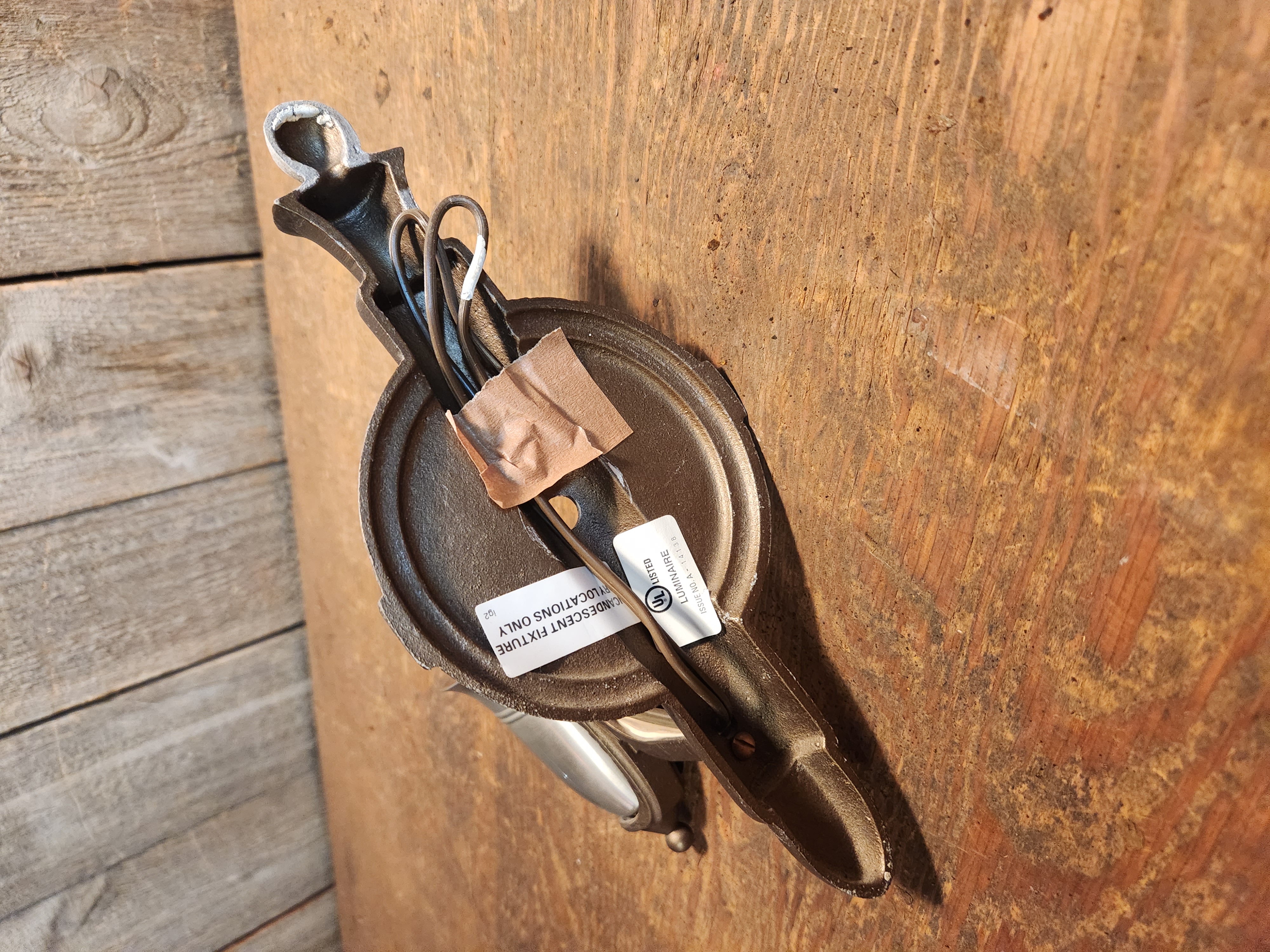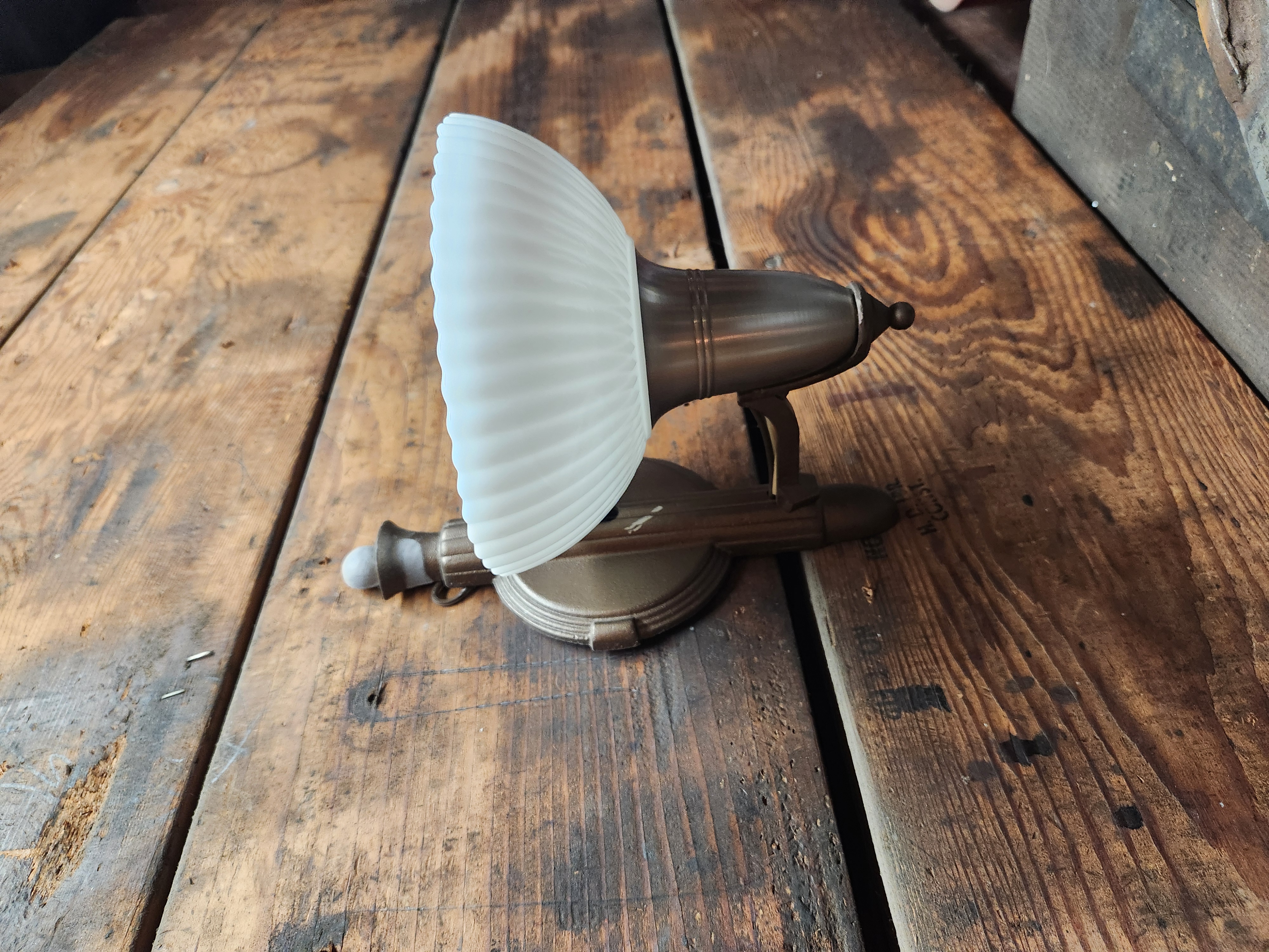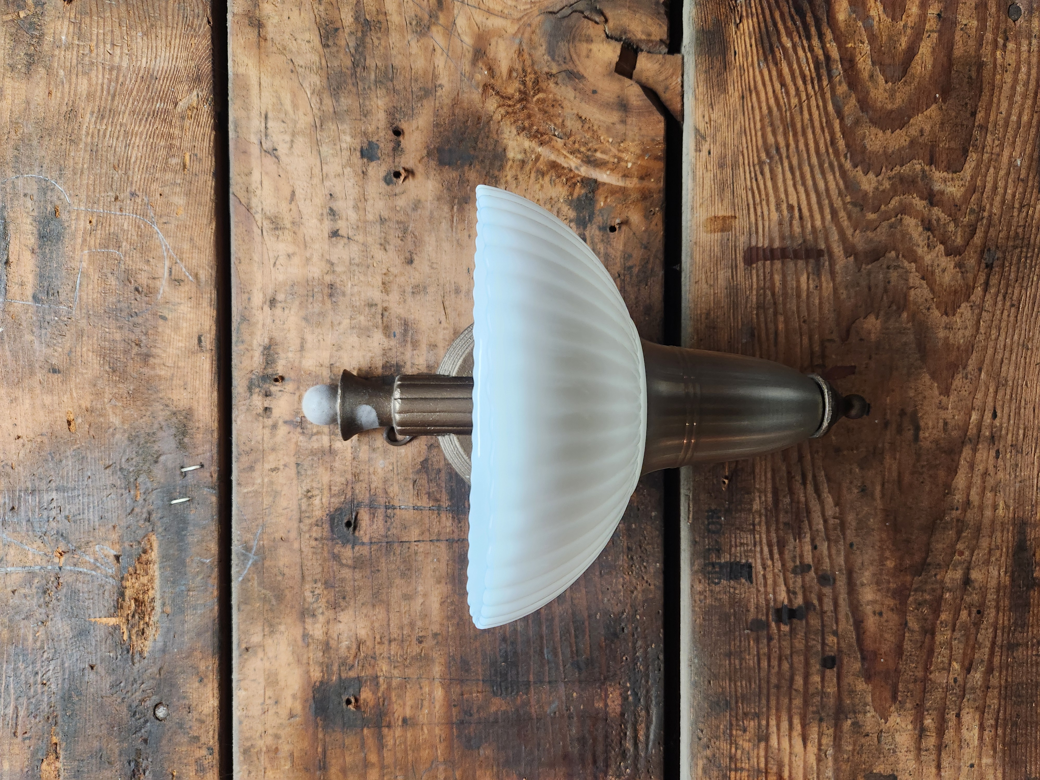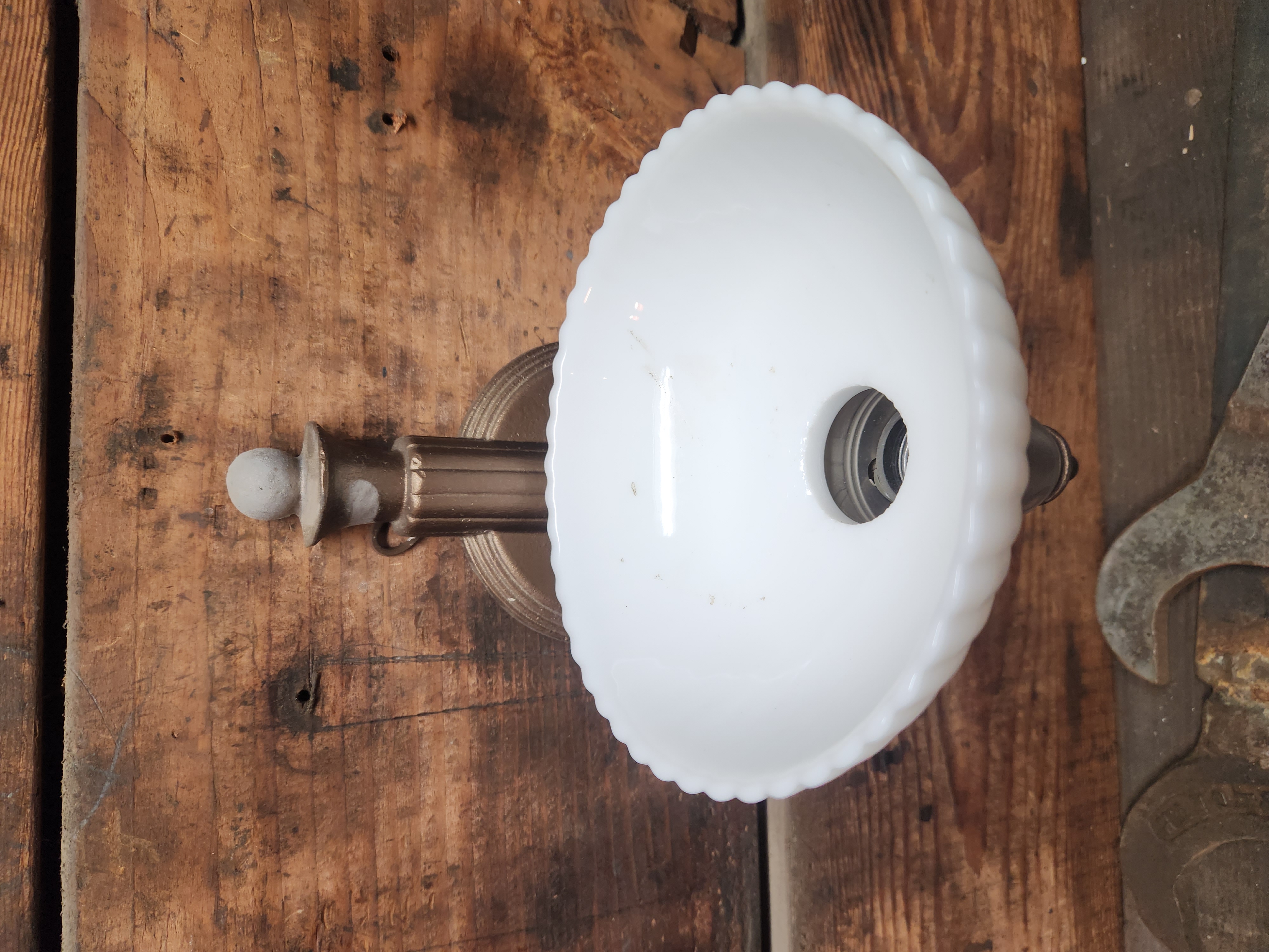 Art deco style wall sconce with a milk glass shade. Cast aluminum fixture with a bit of finish rubbed off. It has a smudge of paint but does not need to be rewired. Measures 6.375 x 9.875 x 7.25.