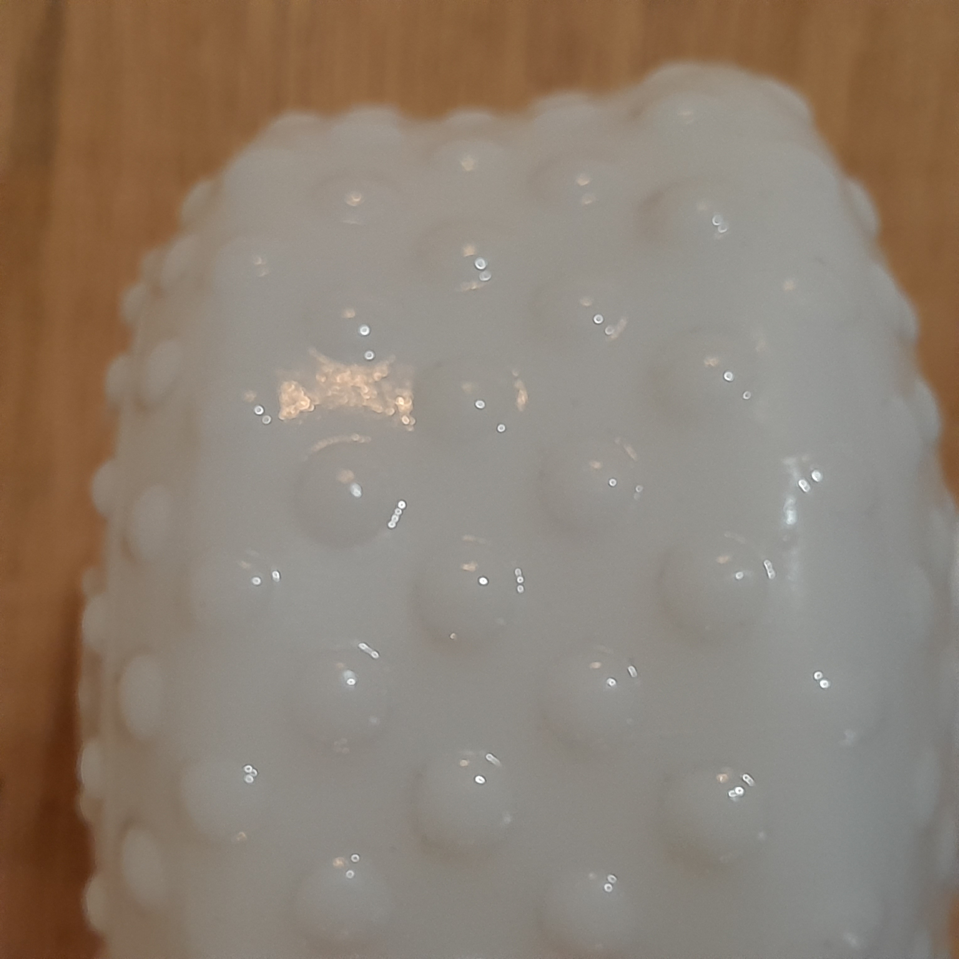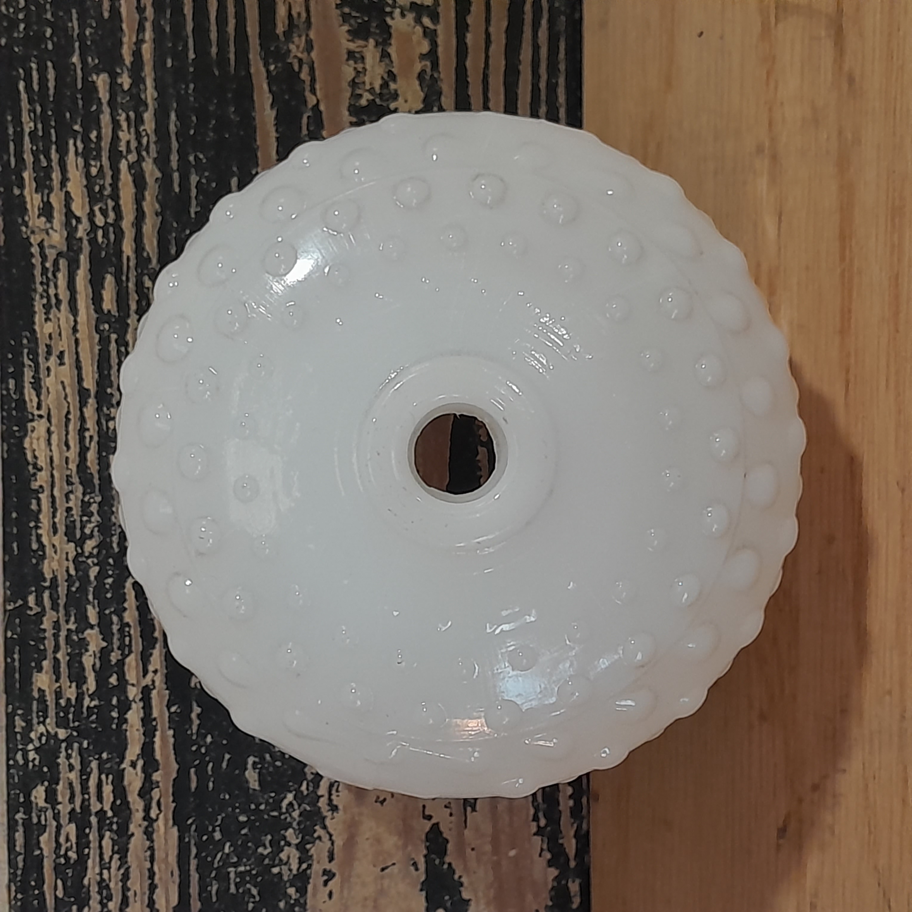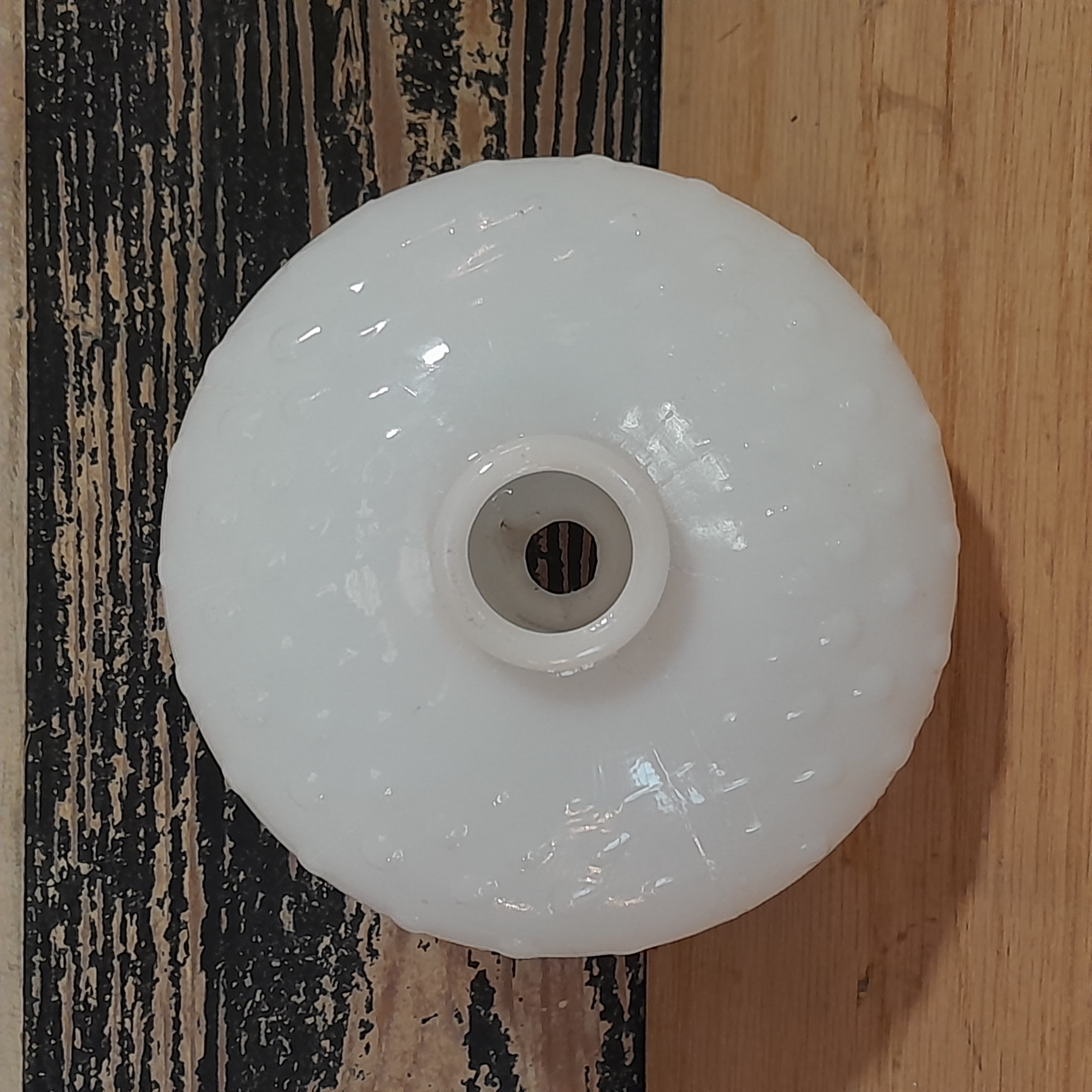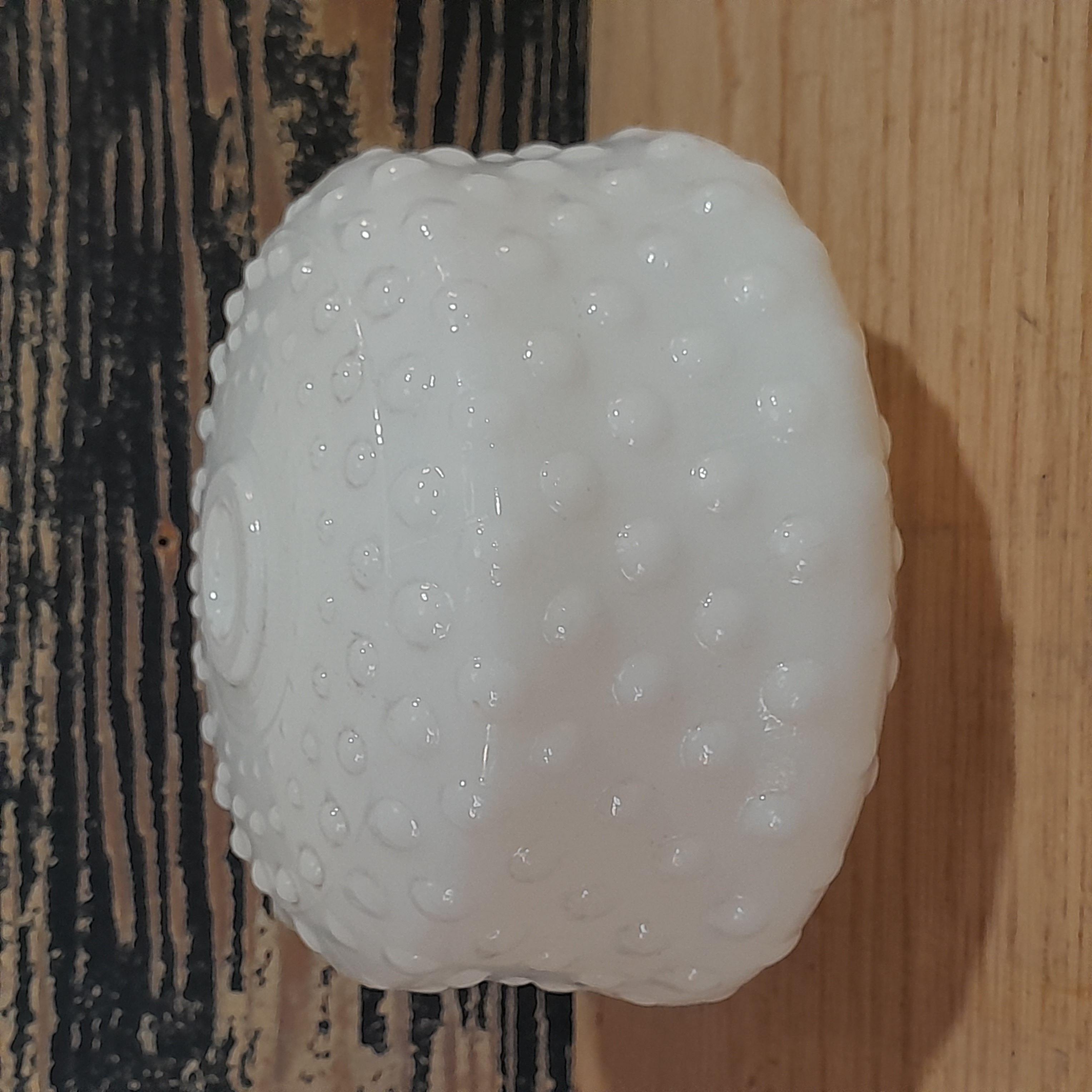 Milk glass shade that is small and has lots of bubble texture. Has a small hole for a small light to fit into.