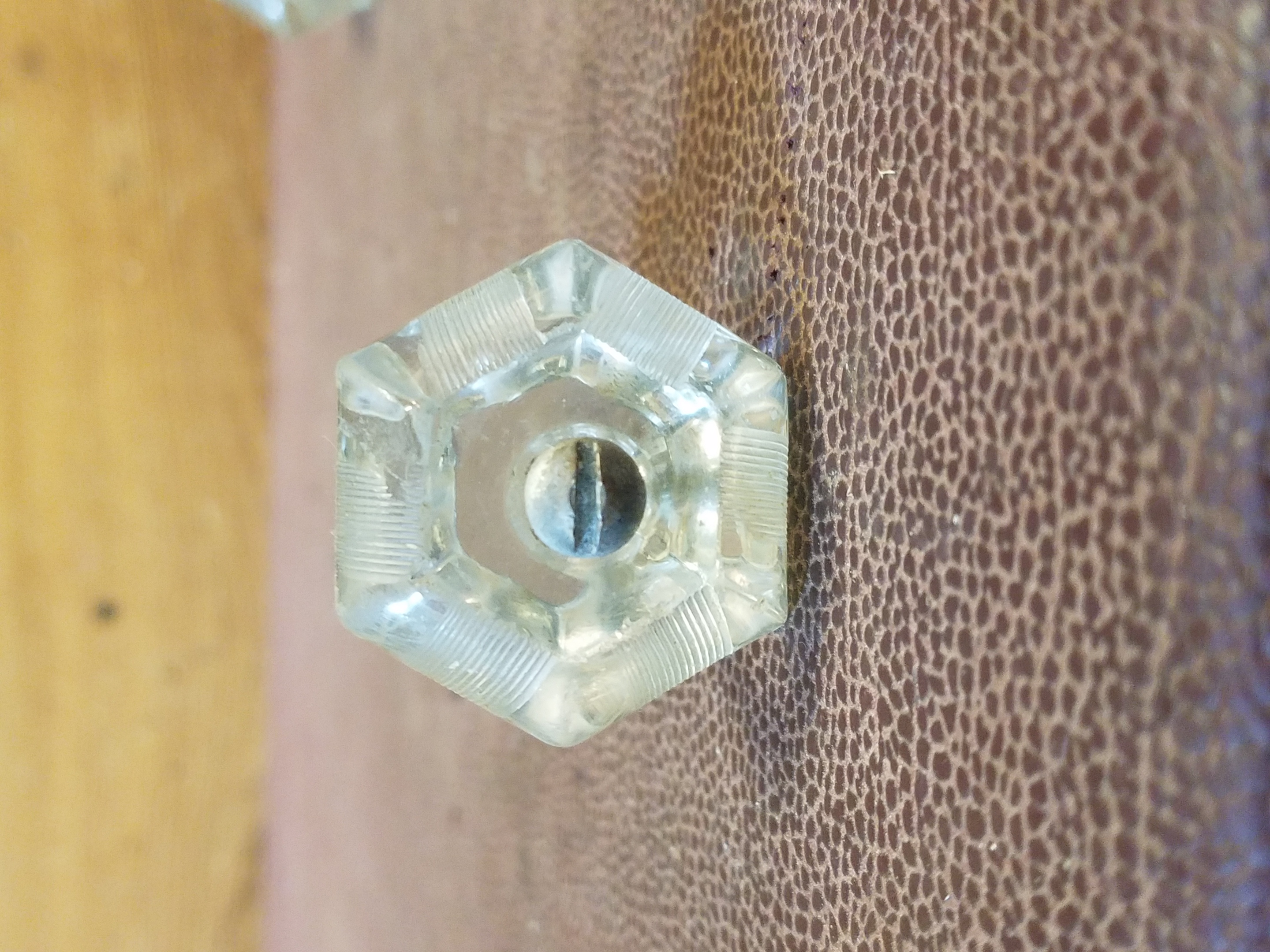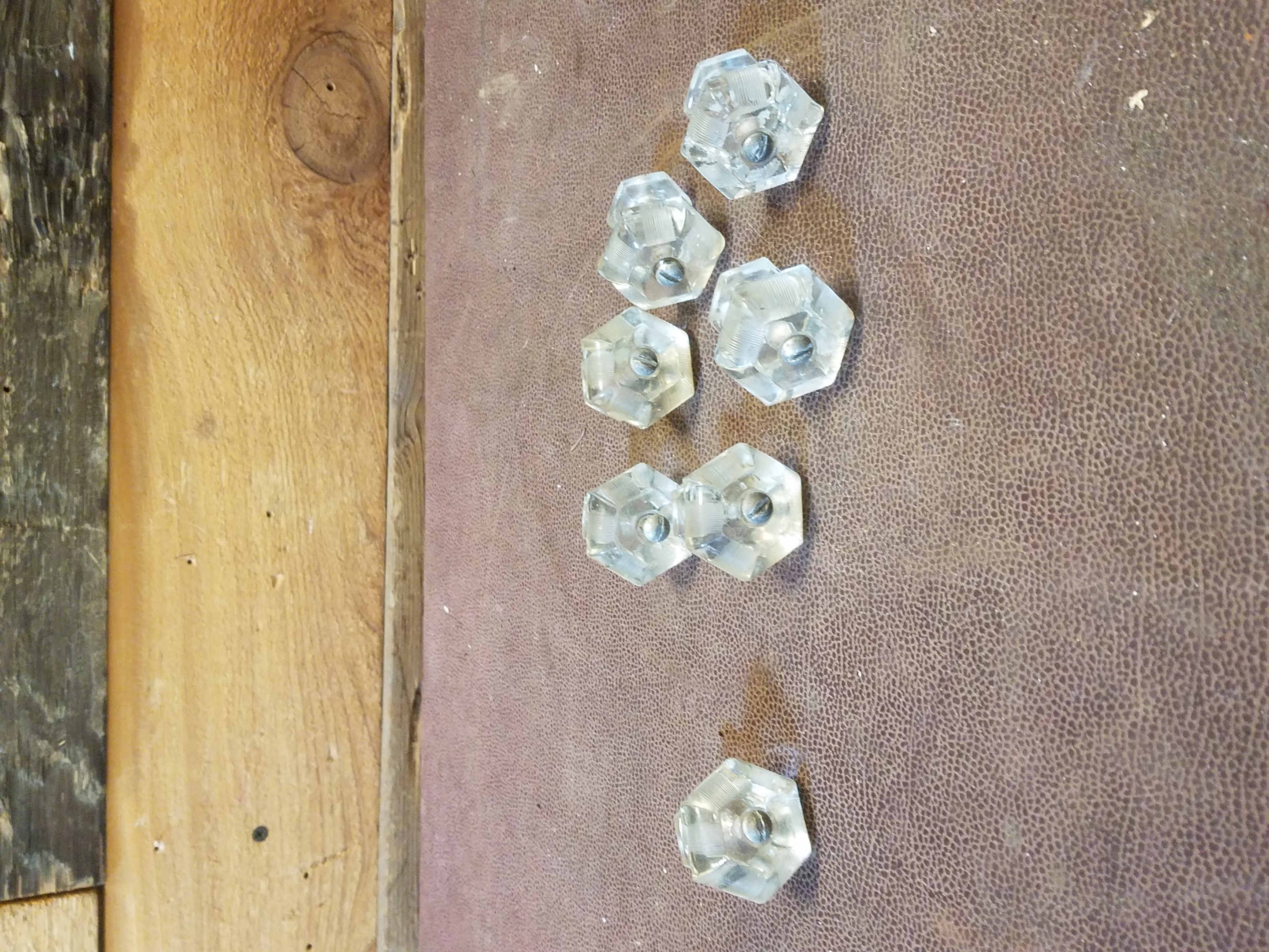 Beautiful set of vintage glass cabinet knobs with a rounded hexagonal design detailed with delicate ridge of texture along the border.