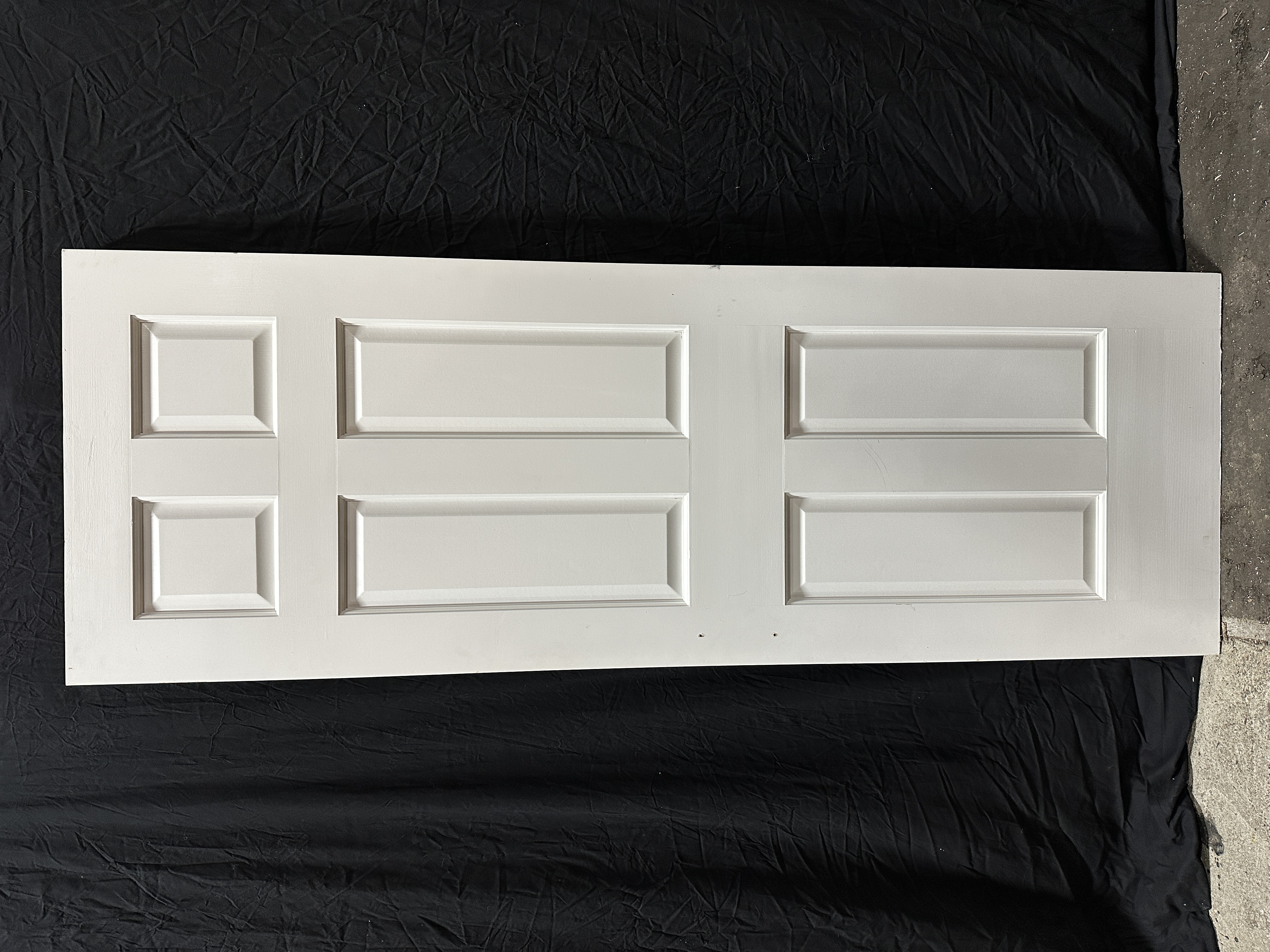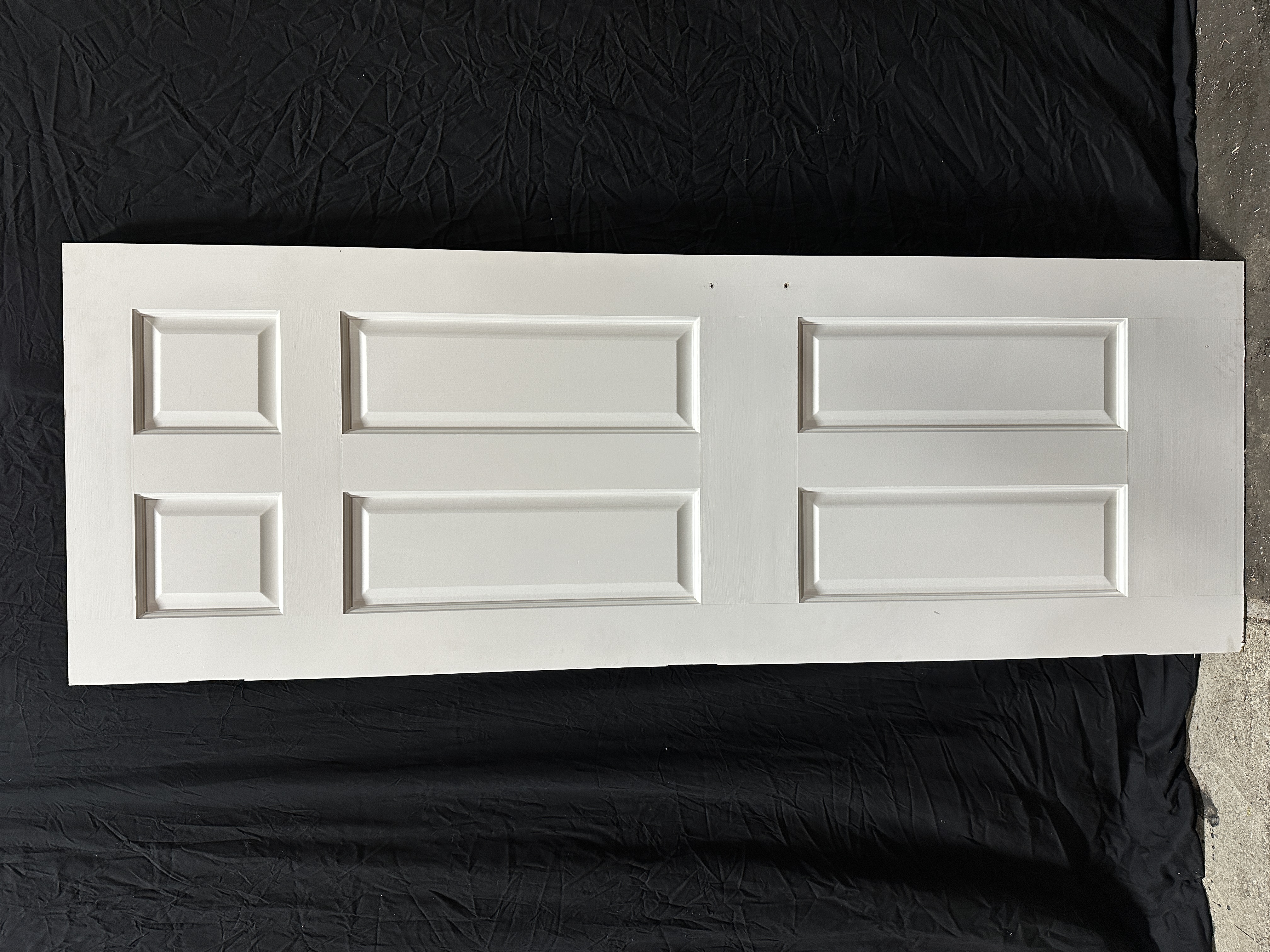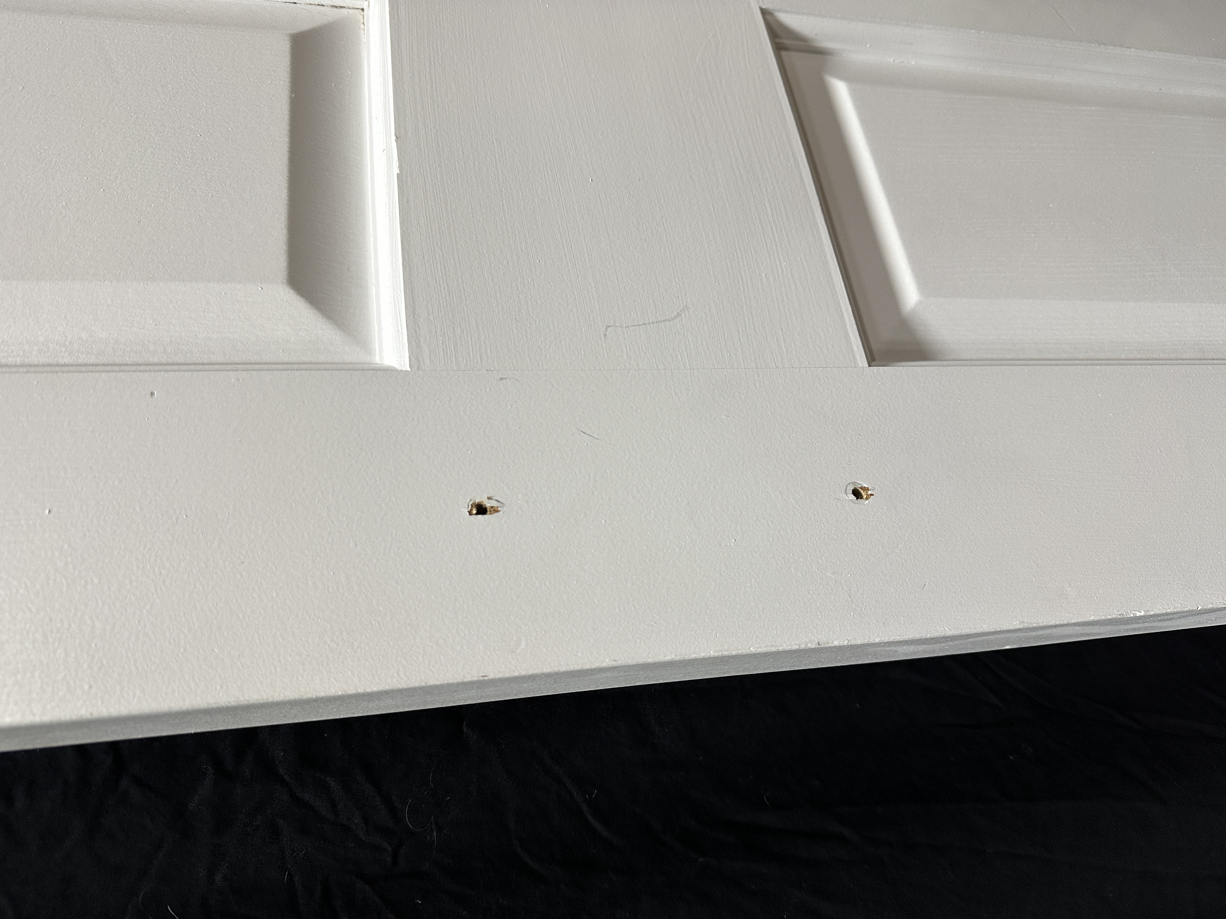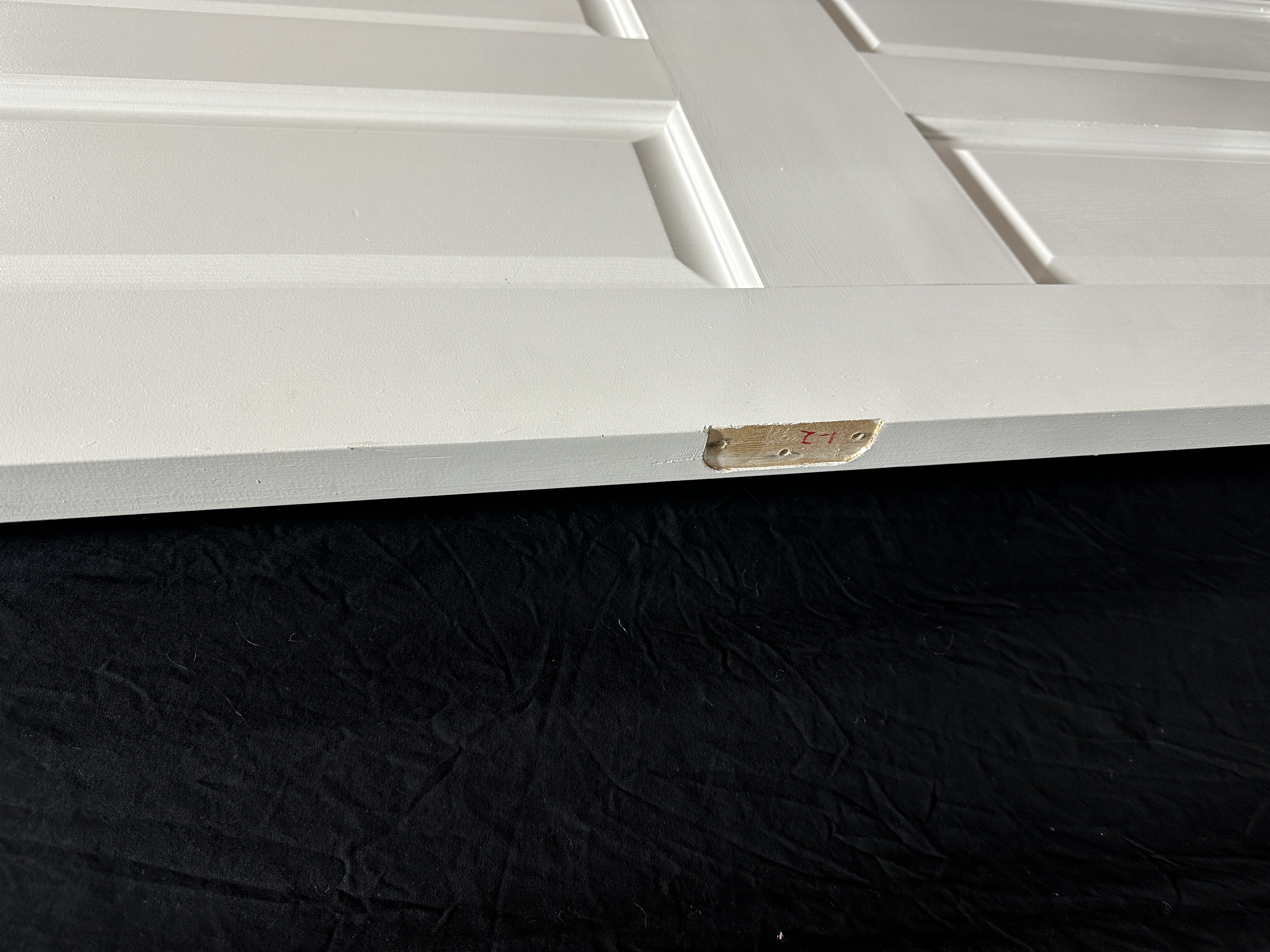Interior solid wood six panel door painted white. Was used for a closet door so it has two small holes where the pull was, not a traditional doorknob set.
