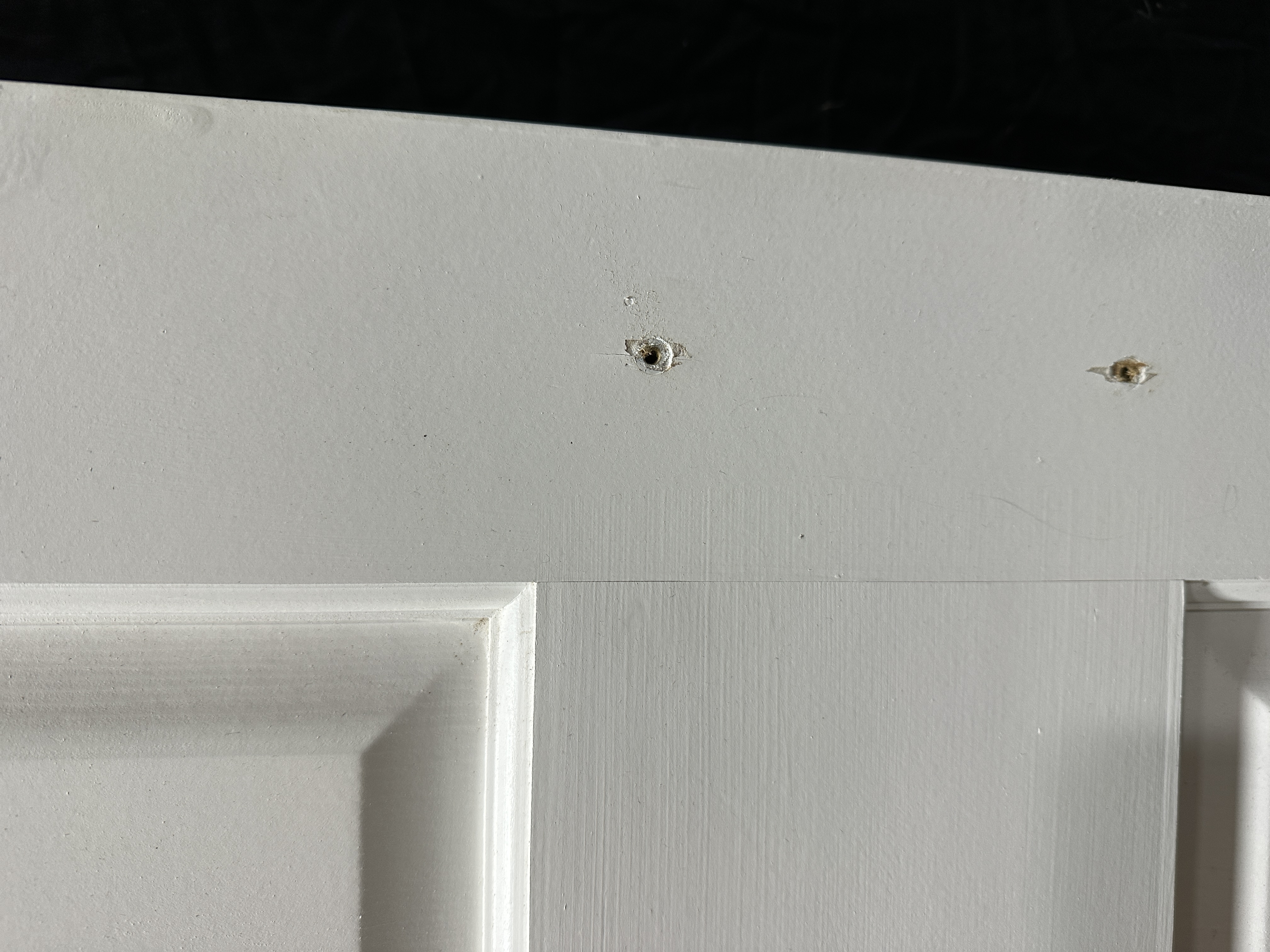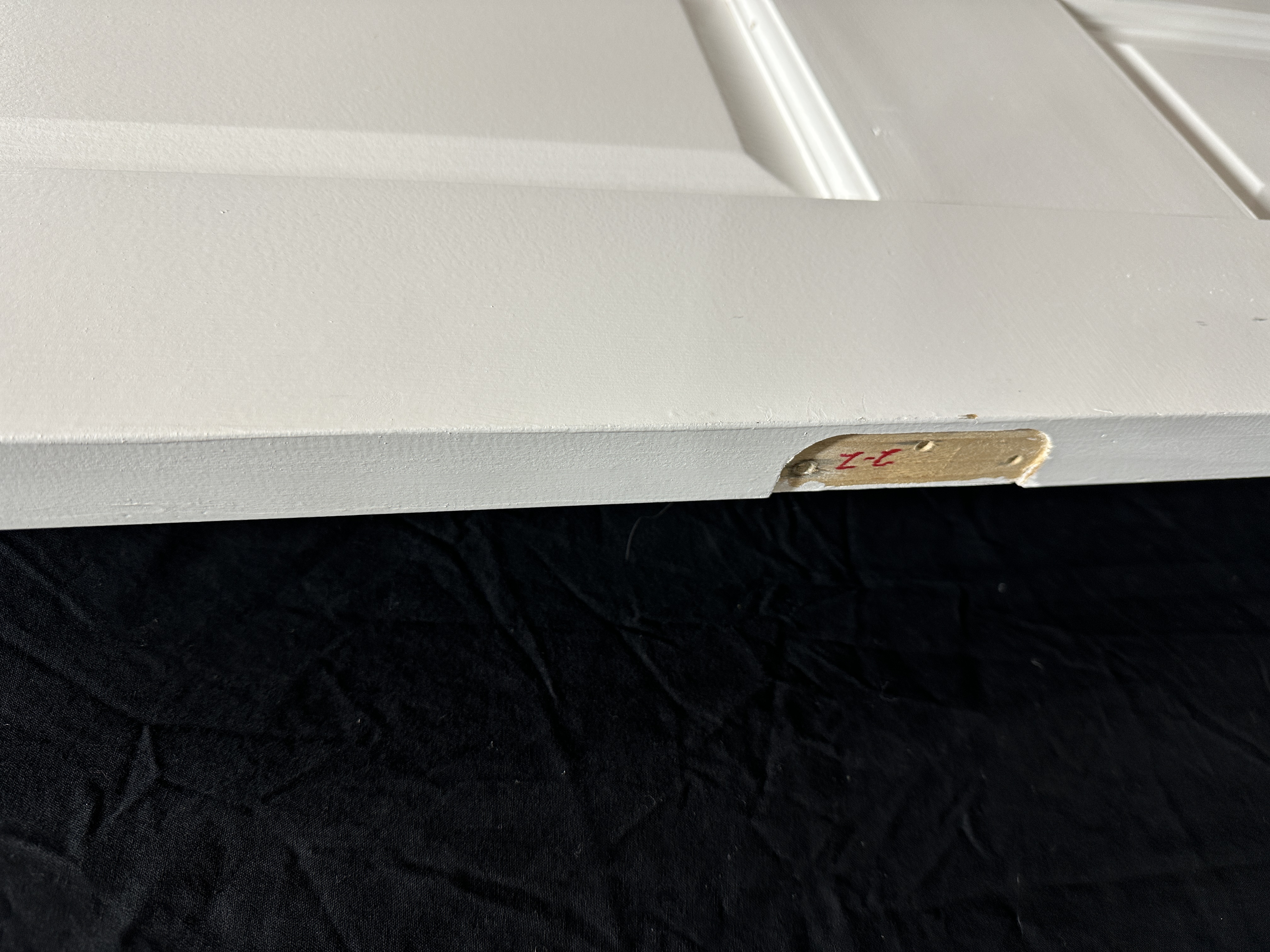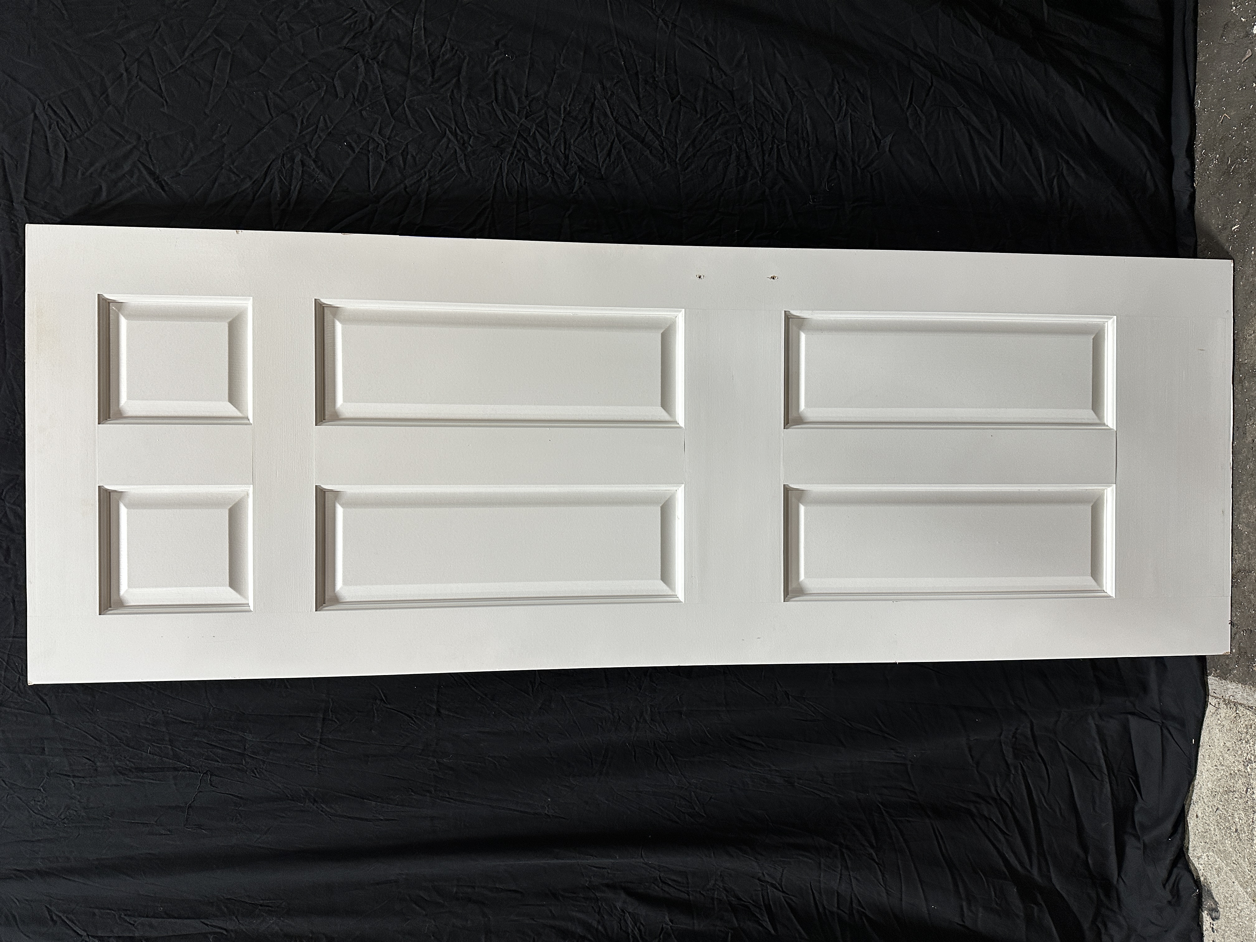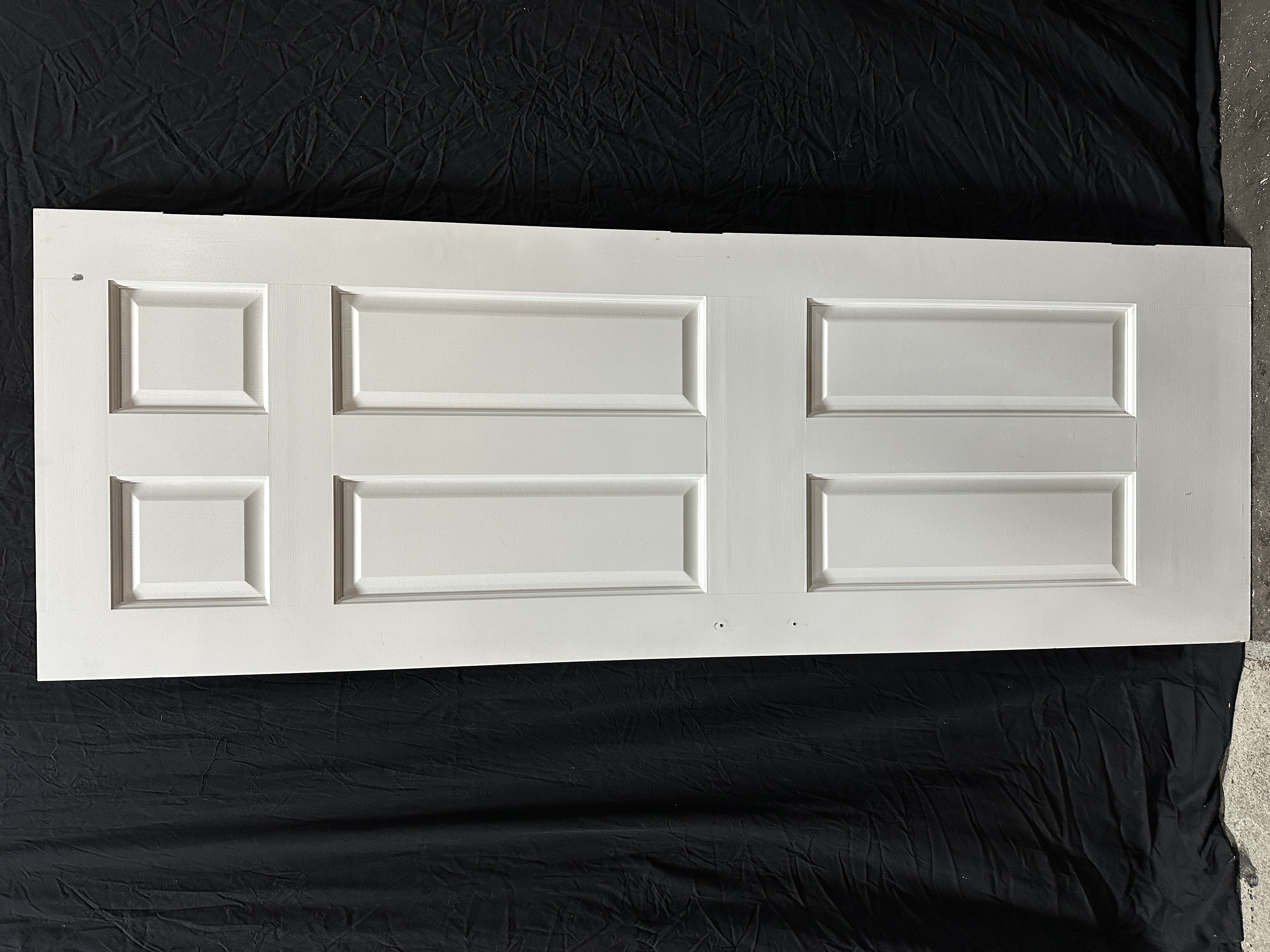 Interior solid wood six panel door painted white. Was used for a closet door so it has two small holes where the pull was, not a traditional doorknob set. Condition is good.