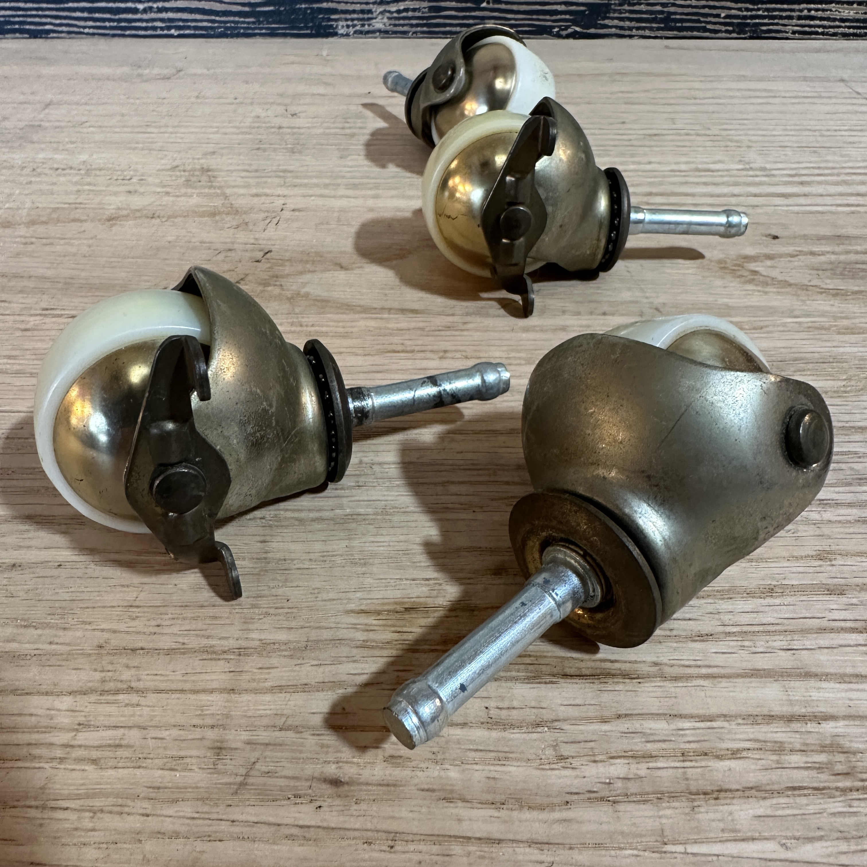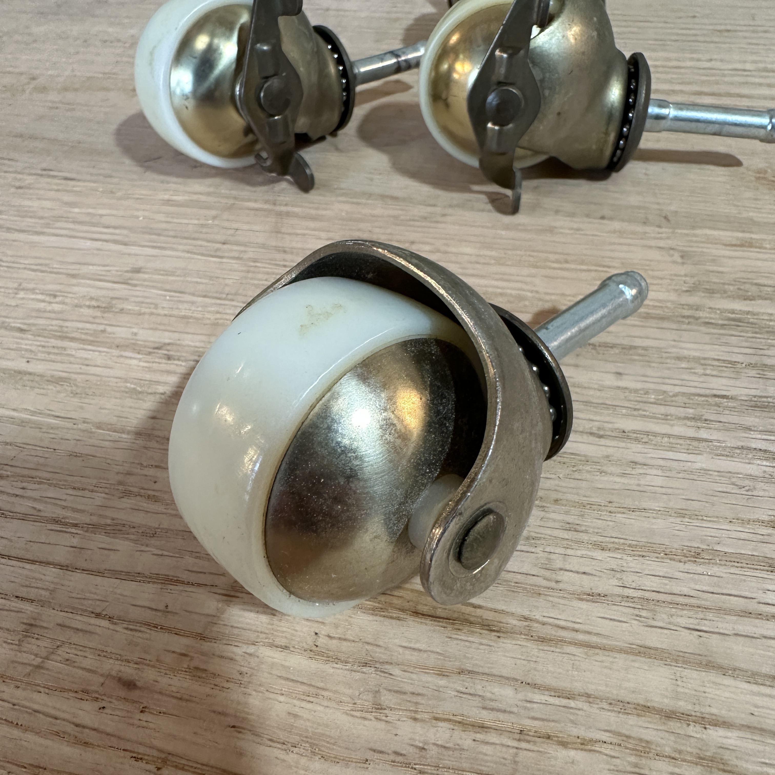 Set of 4 vintage casters, two with locks, two without. They have ball bearings and swivel very smoothly.