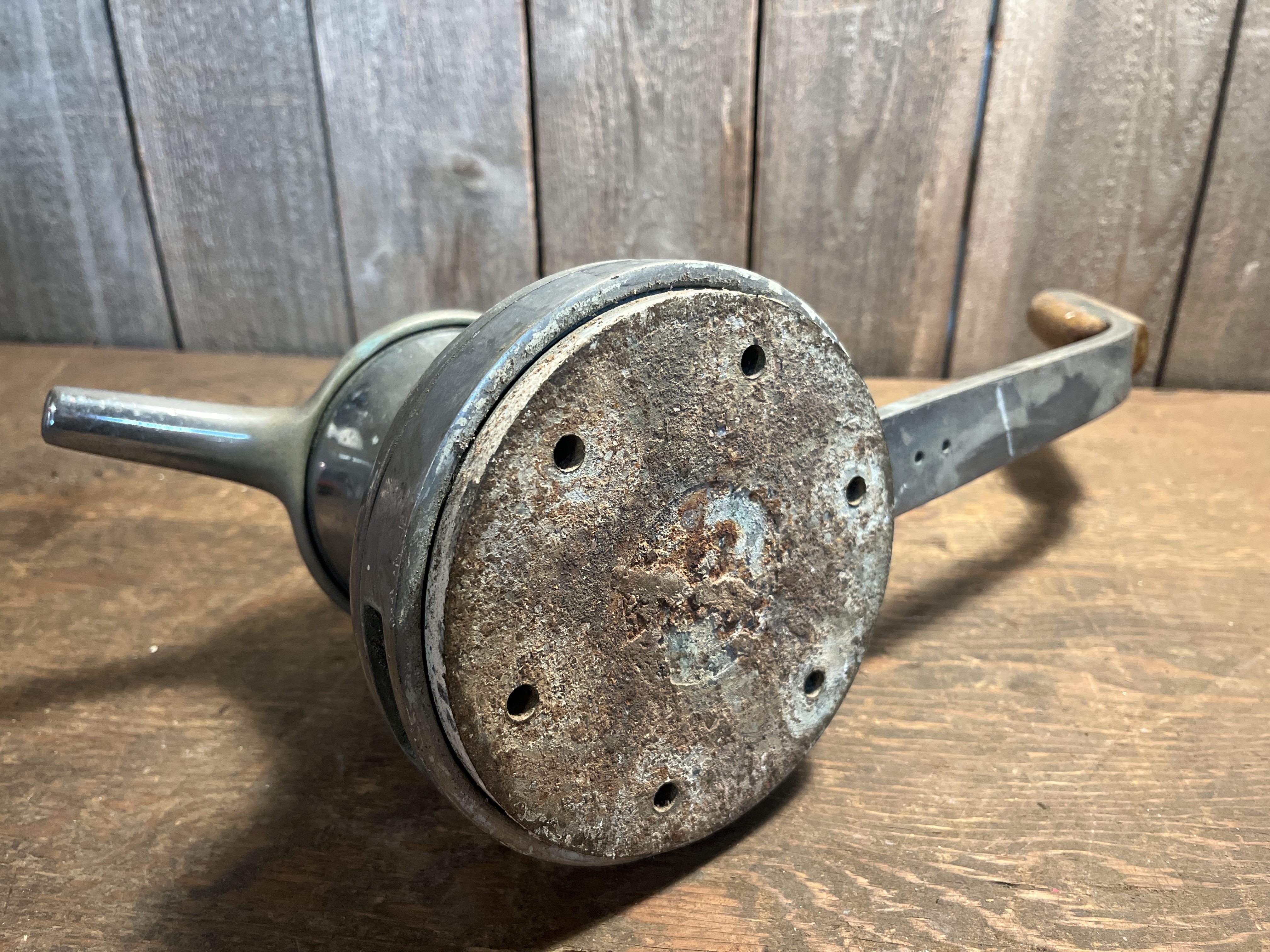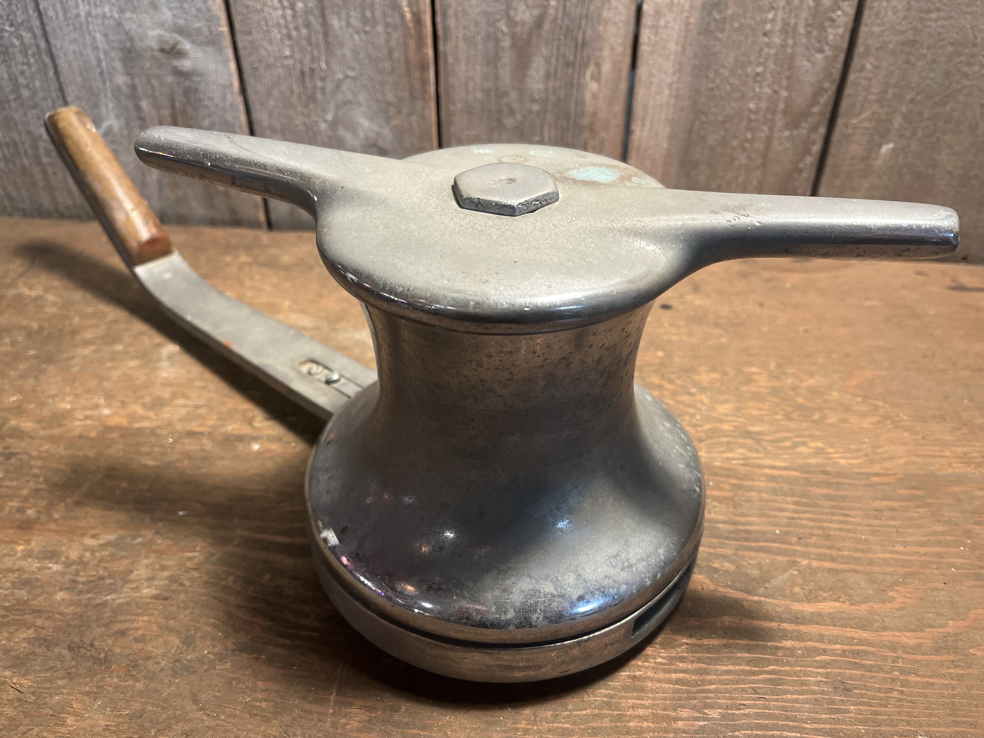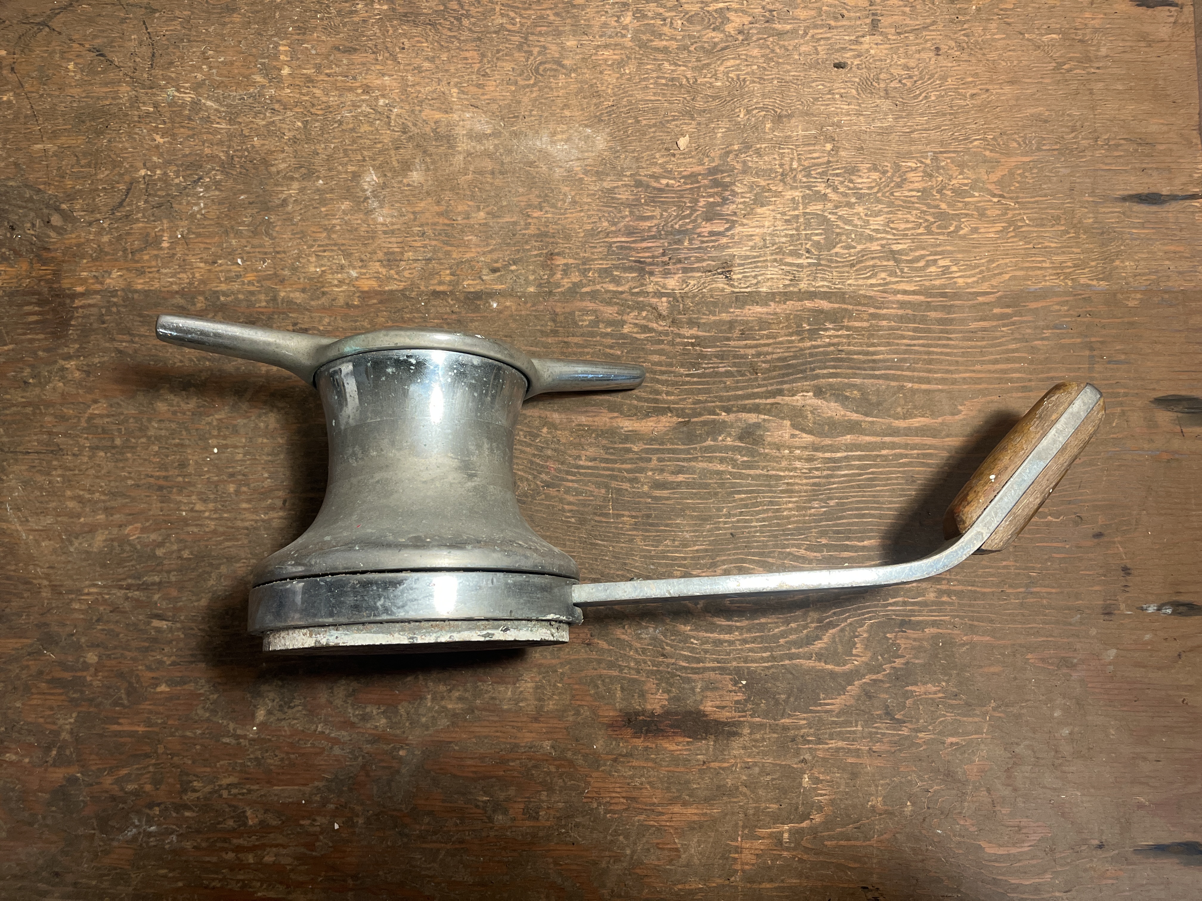 A pretty cool chrome hand crank boat winch that still cranks! The old chrome is pitted but still has some shine. The wooden handle is still in nice shape. A great nautical decor piece or perhaps you see a new use for this! Measures 16.5 x 6 inches.
