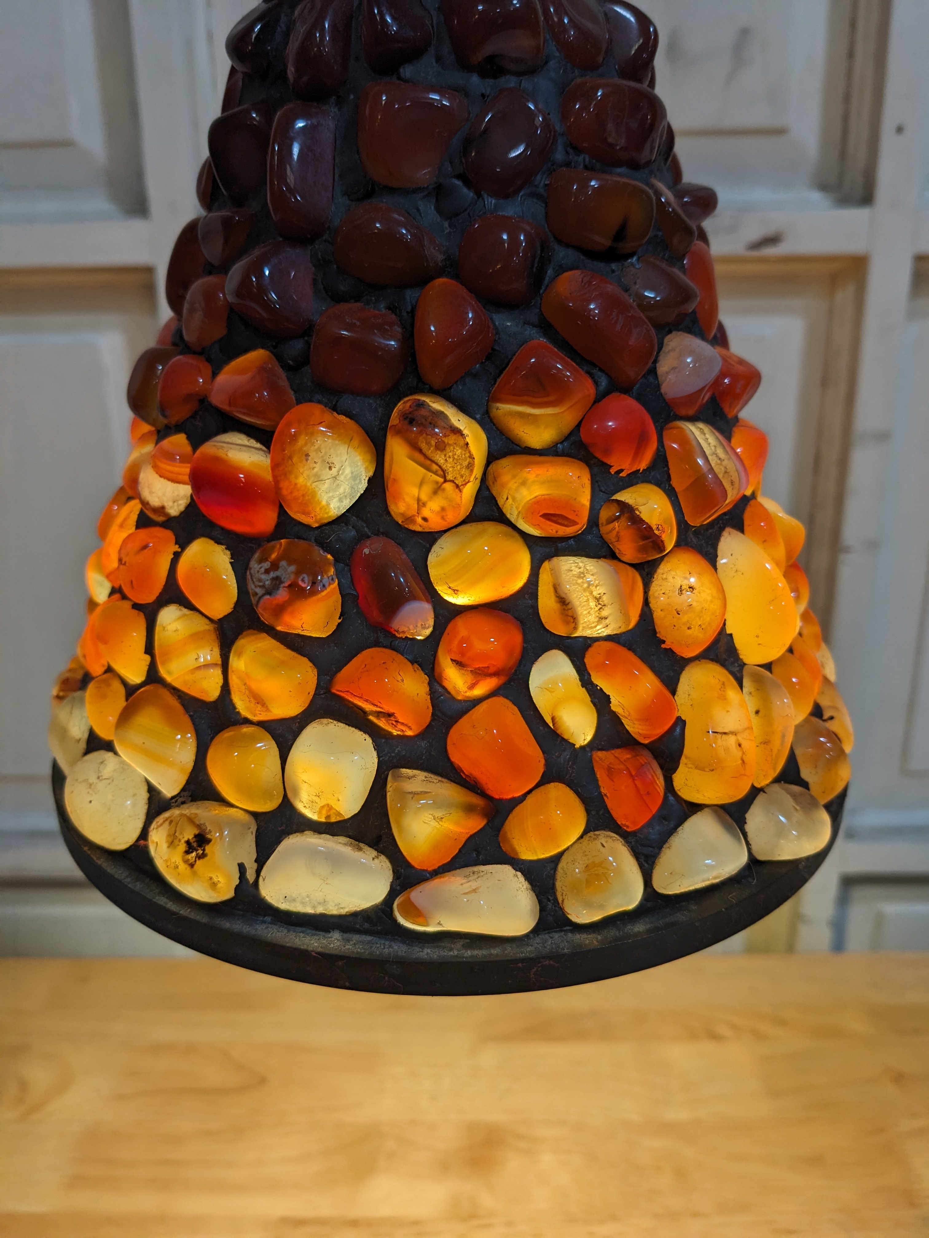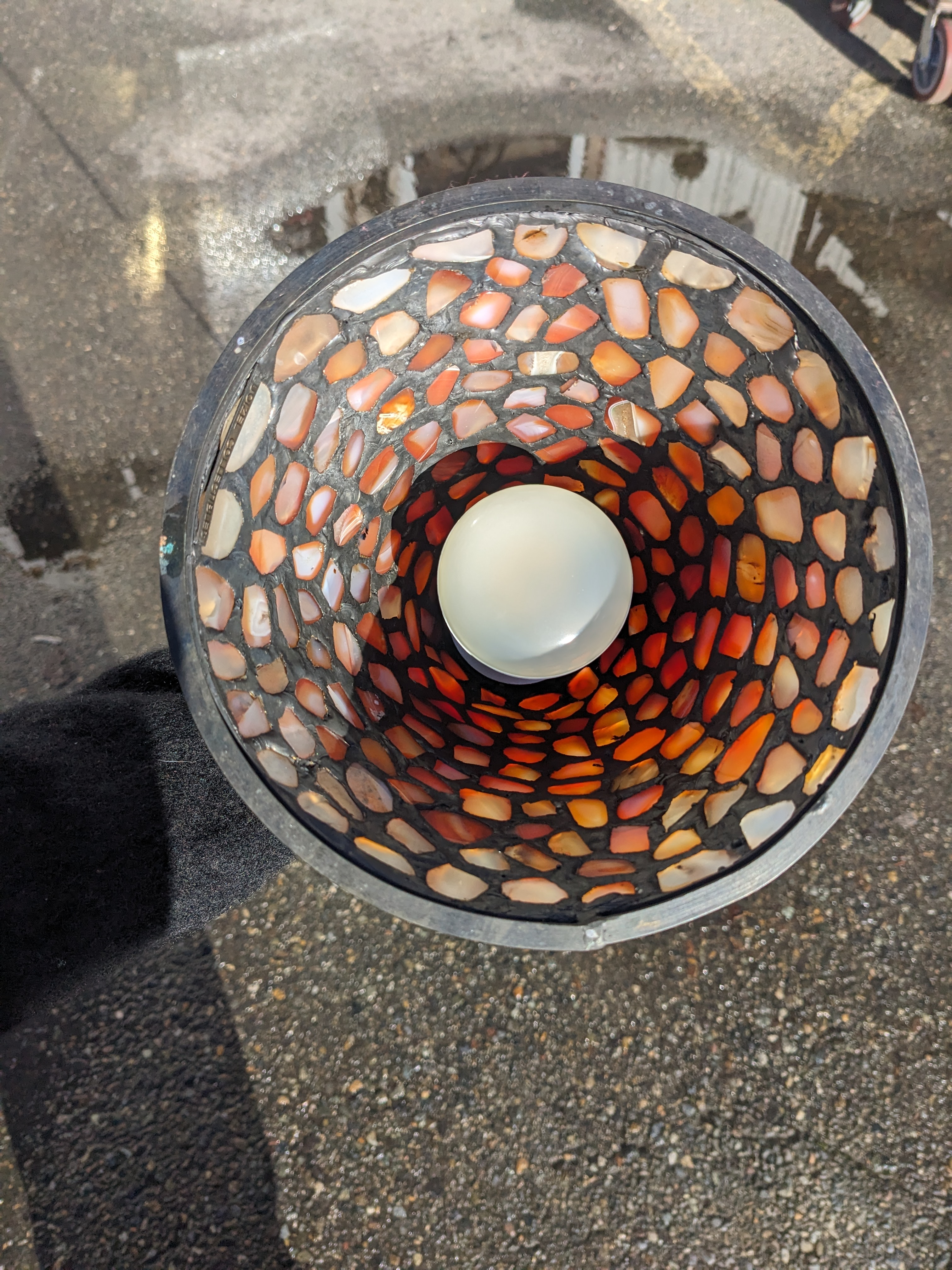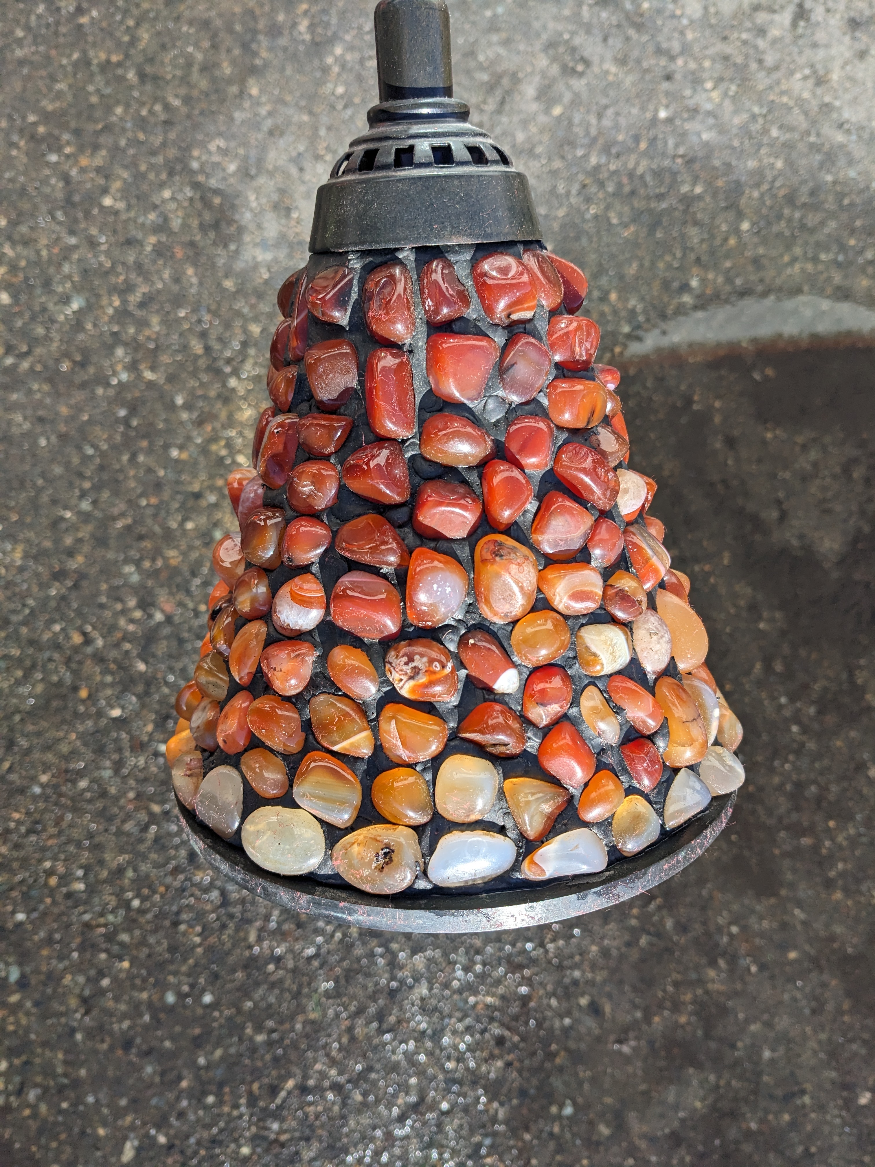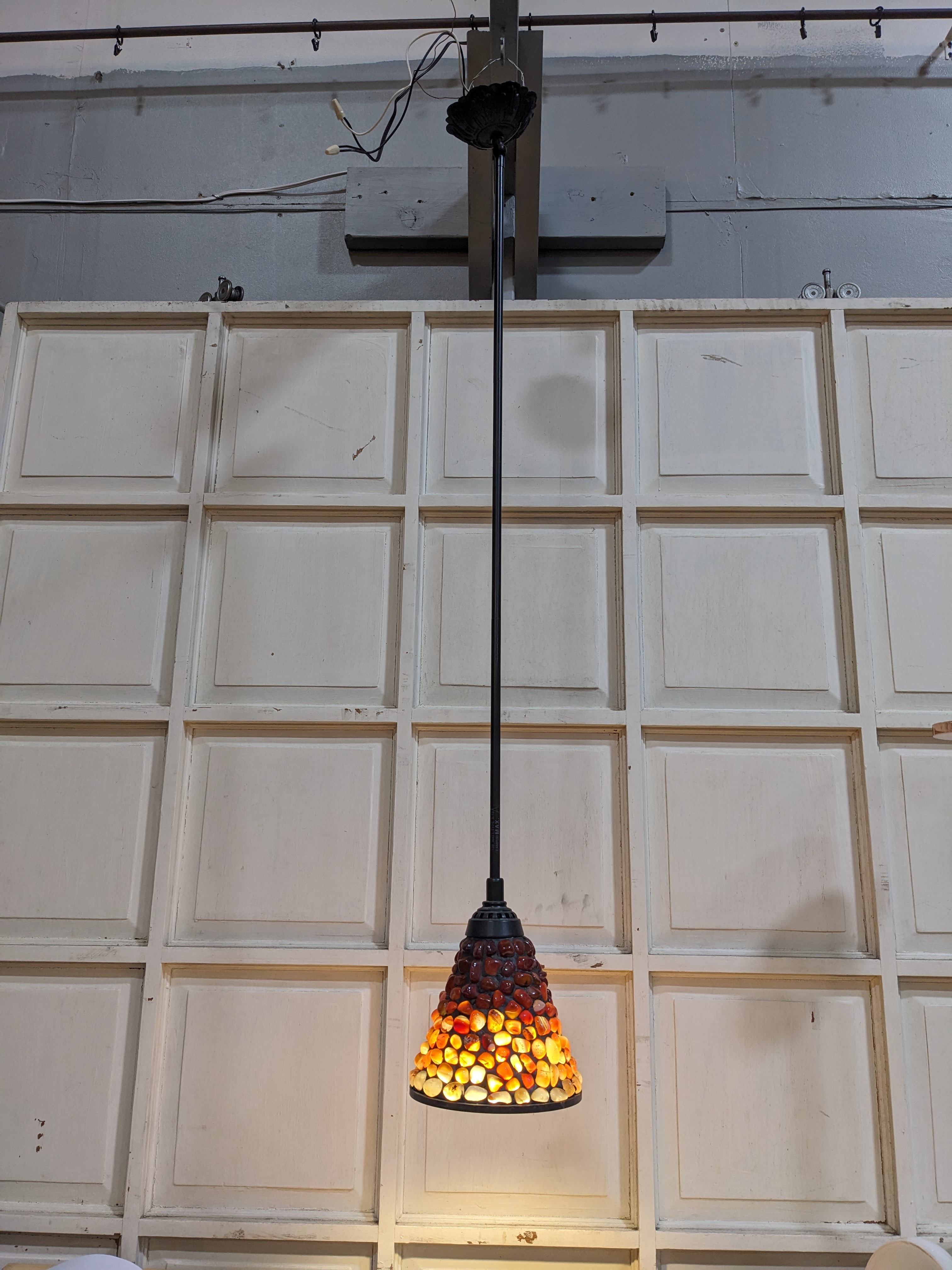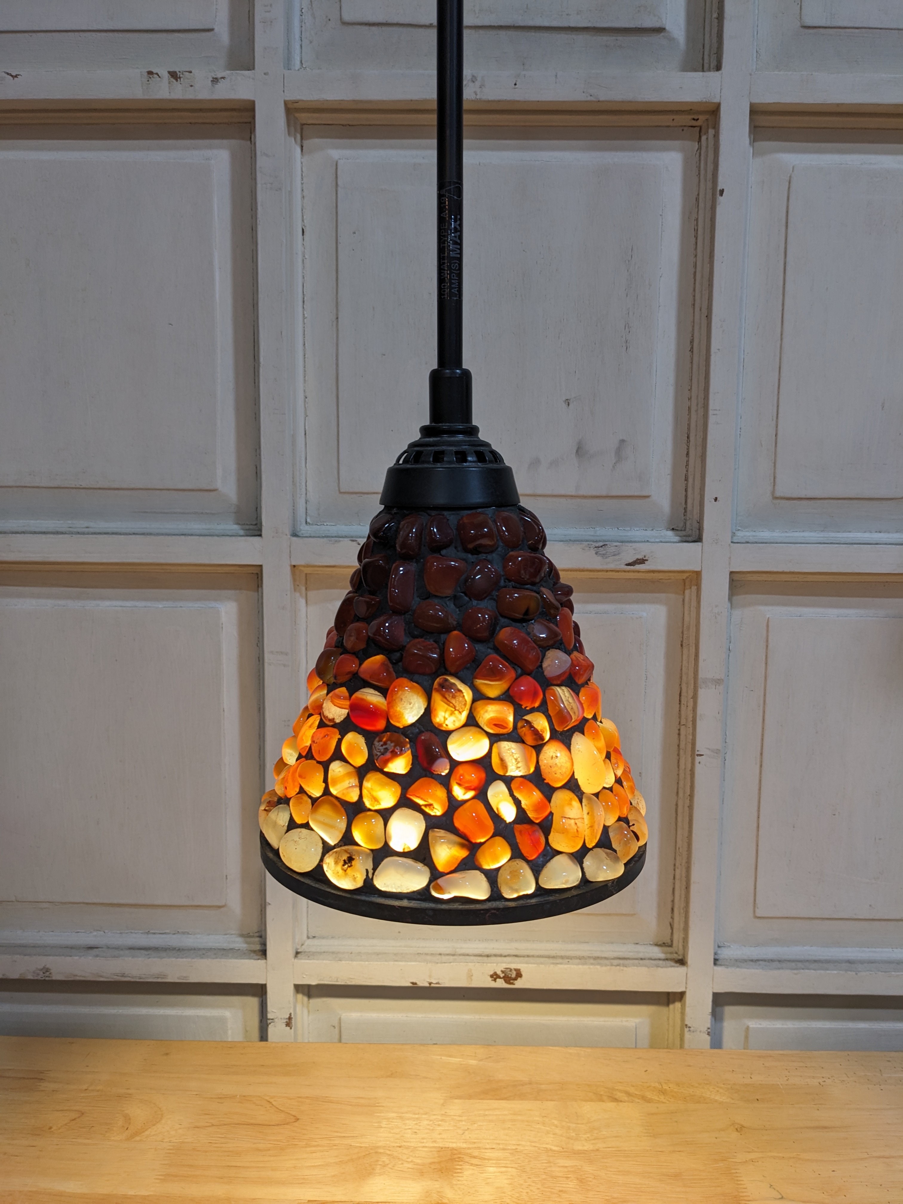 When this light is on I am no better than a moth. How can you not be. The way the light highlights each intricacy of the polished marble agate. Lead filled. Very cool. Shade diameter 7 inches, 6 inches tall. Total hanging length: 48 inches