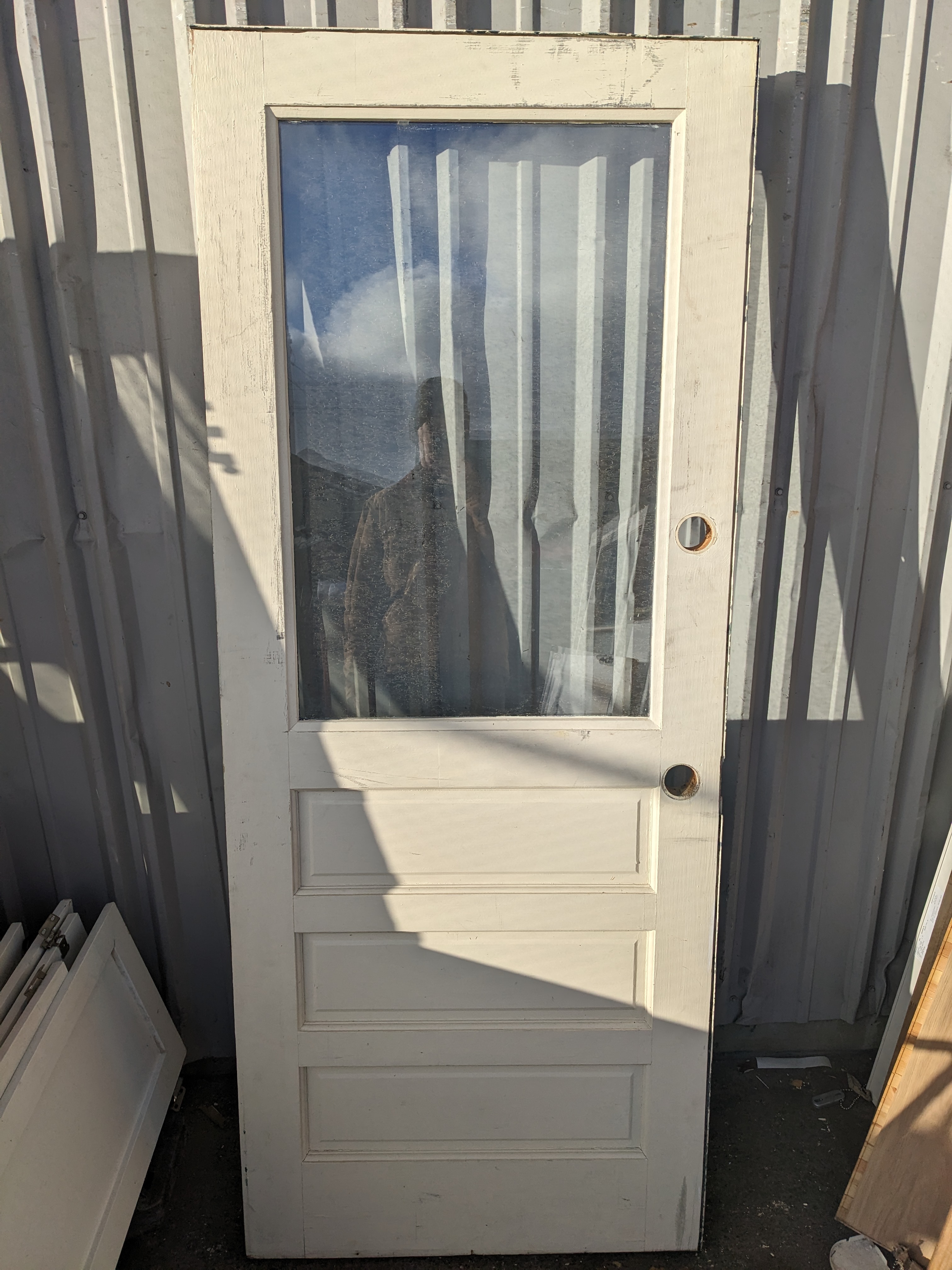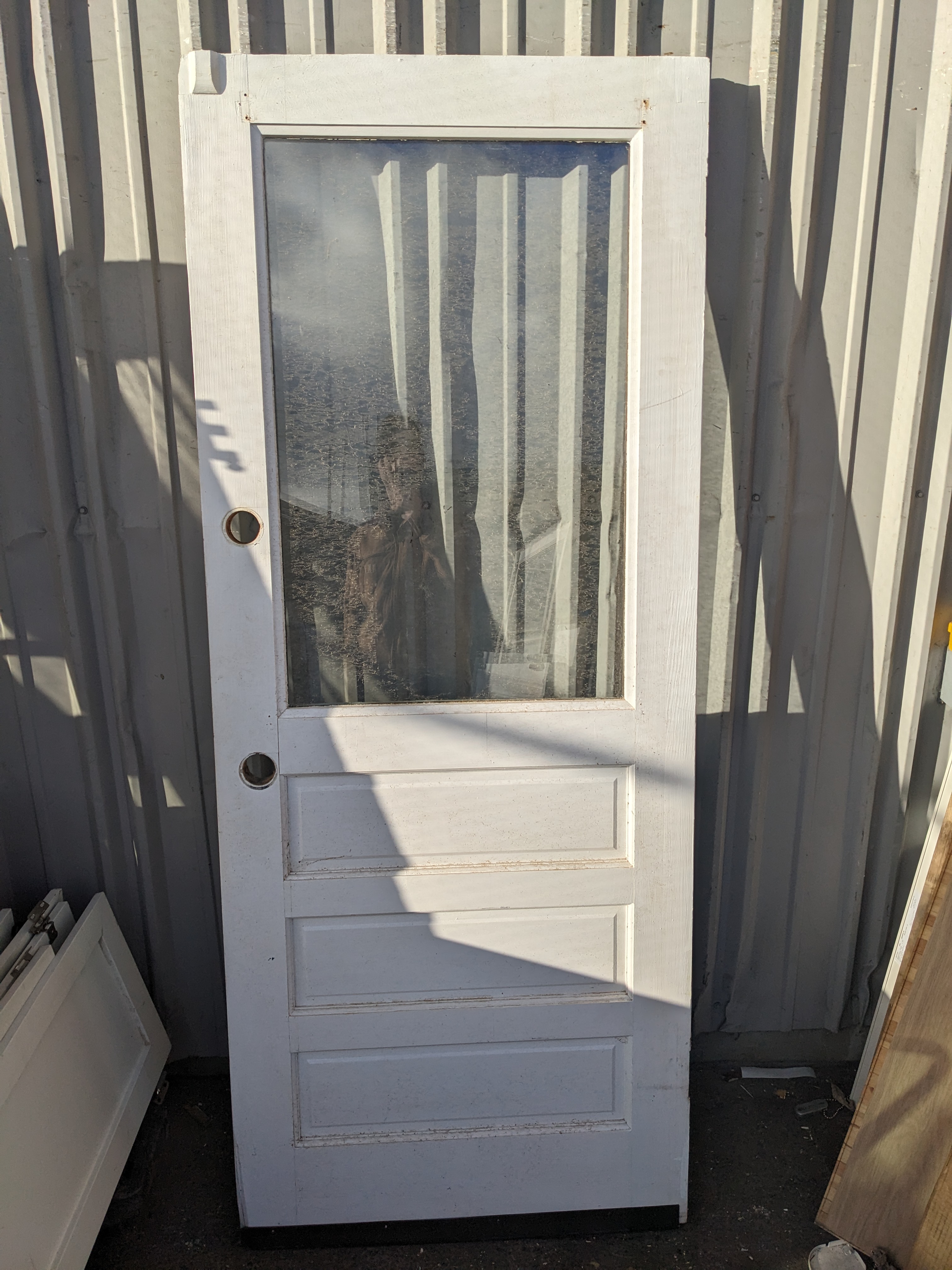 This exterior half Lite wooden door has some dings and blemishes but is in overall pretty decent shape.