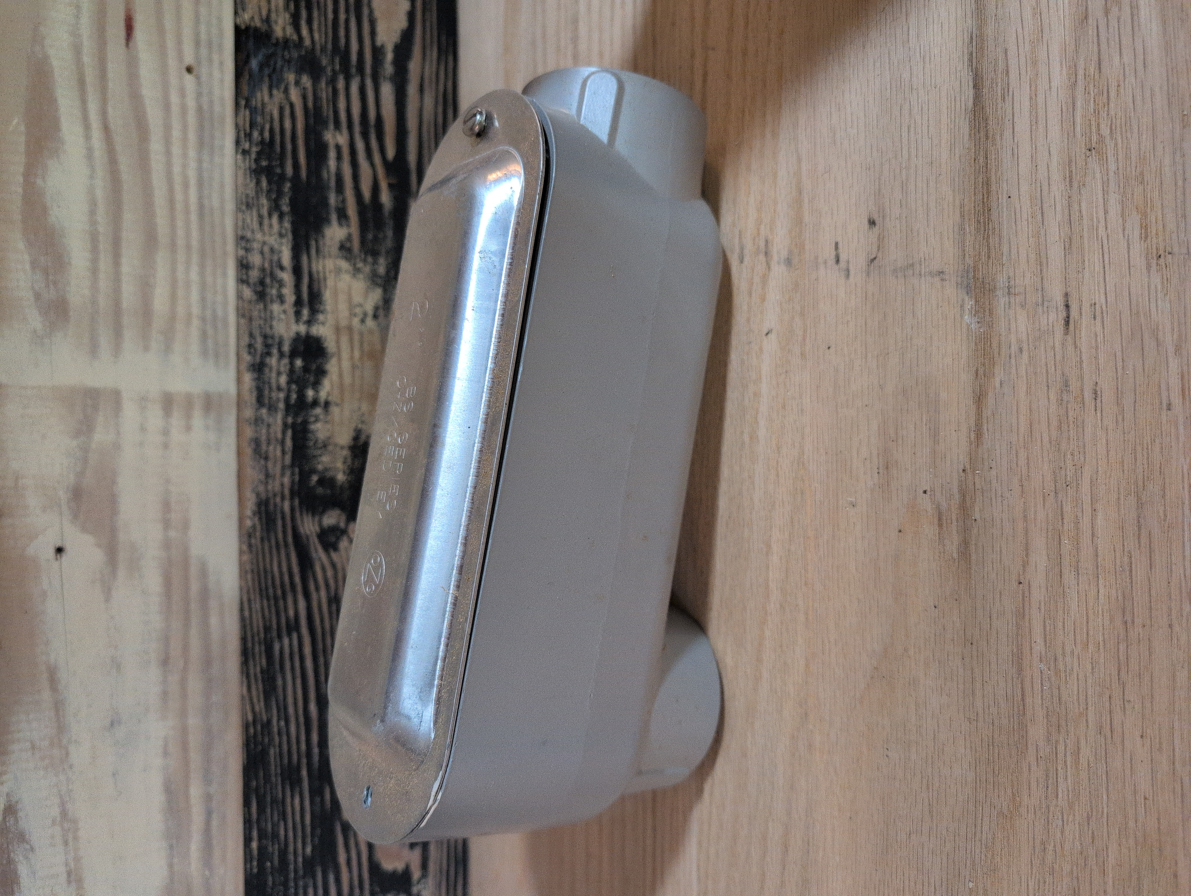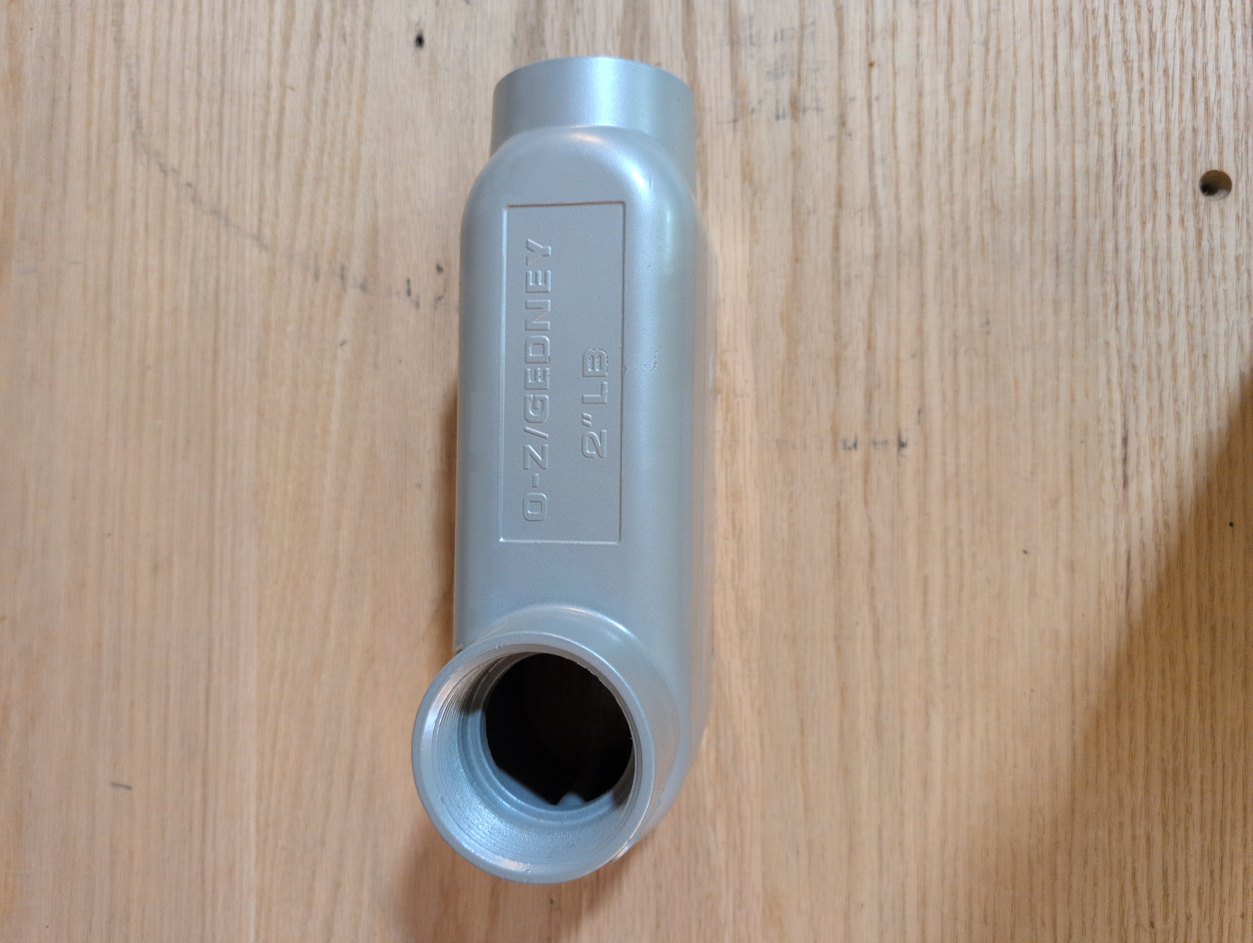 OZ-Gedney LB200A 2 inch hub size aluminum type-LB conduit body. Powder coated finish. Missing one of two screws. 10.25 inches long and 4.5 inches high.