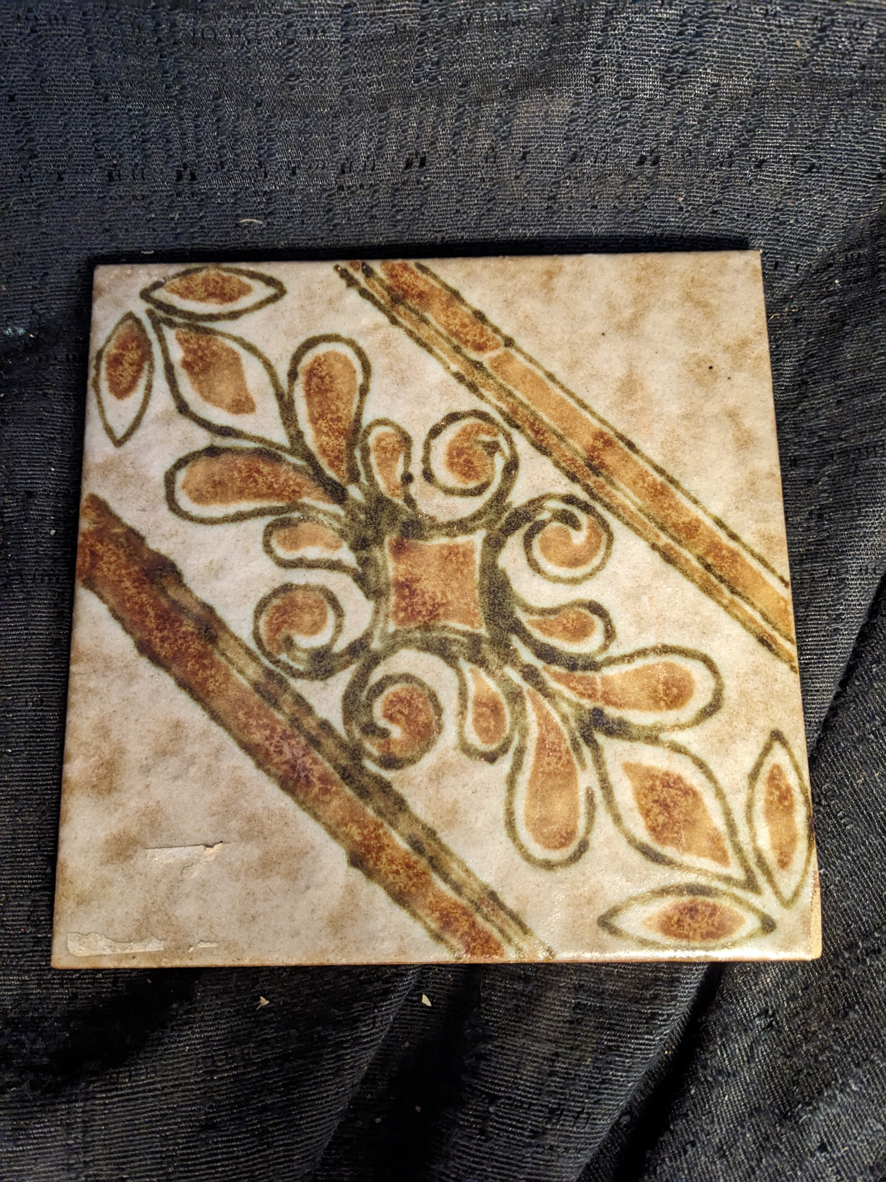 This tile is stunning! Warm toned with a green and orange floral motif in the center, it is ready to be used as a statement piece in your next tiling project or could be repurposed for wall art or other projects. It measures 6 x 6. Pictures may be representative.