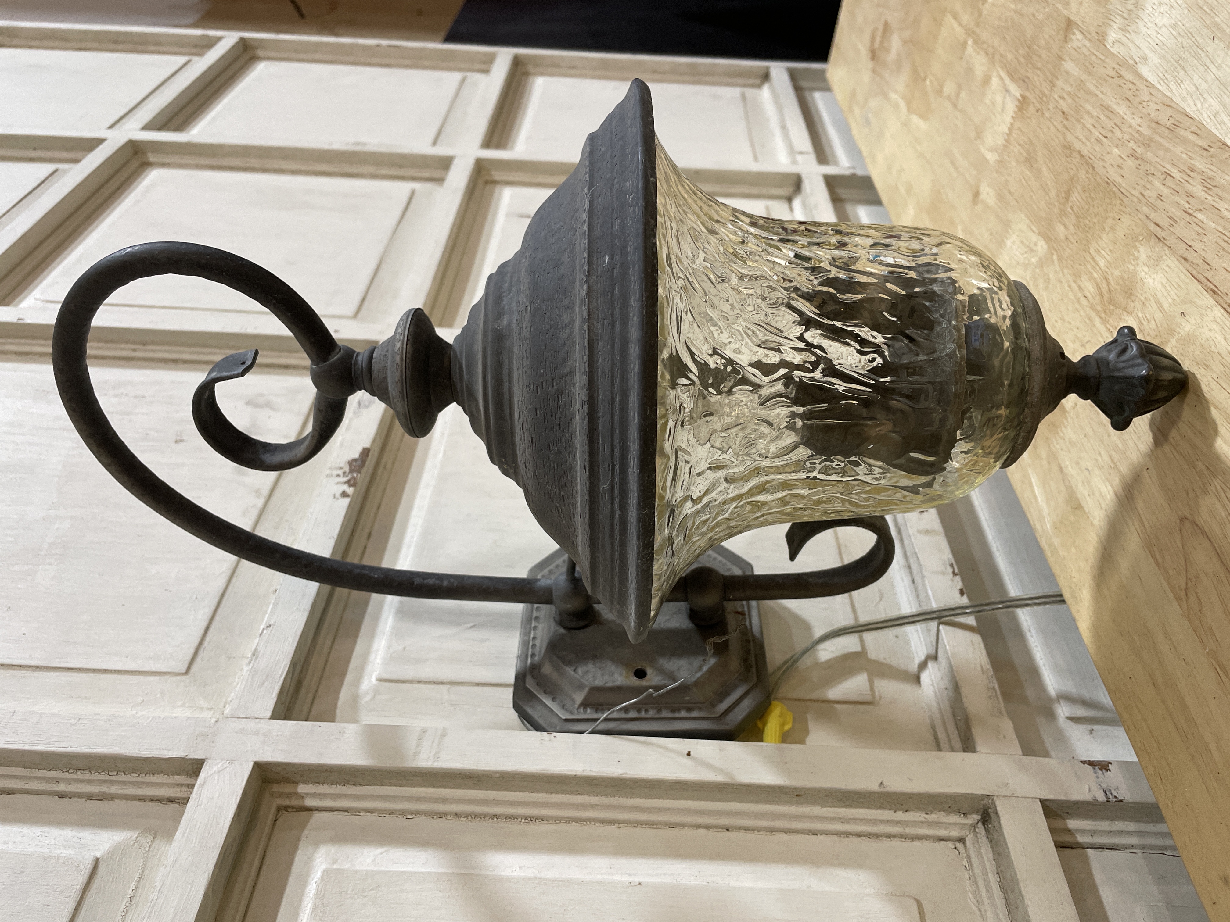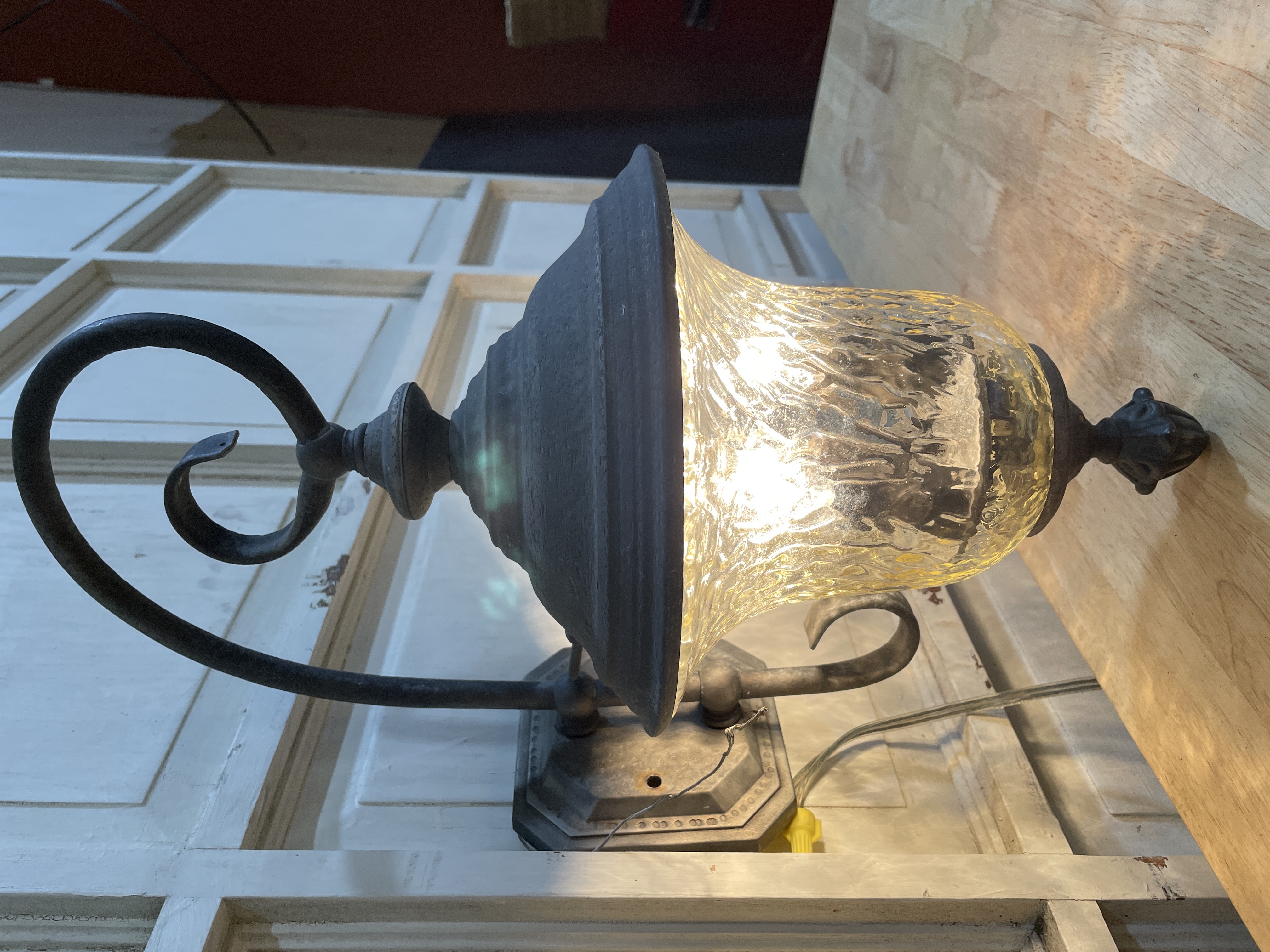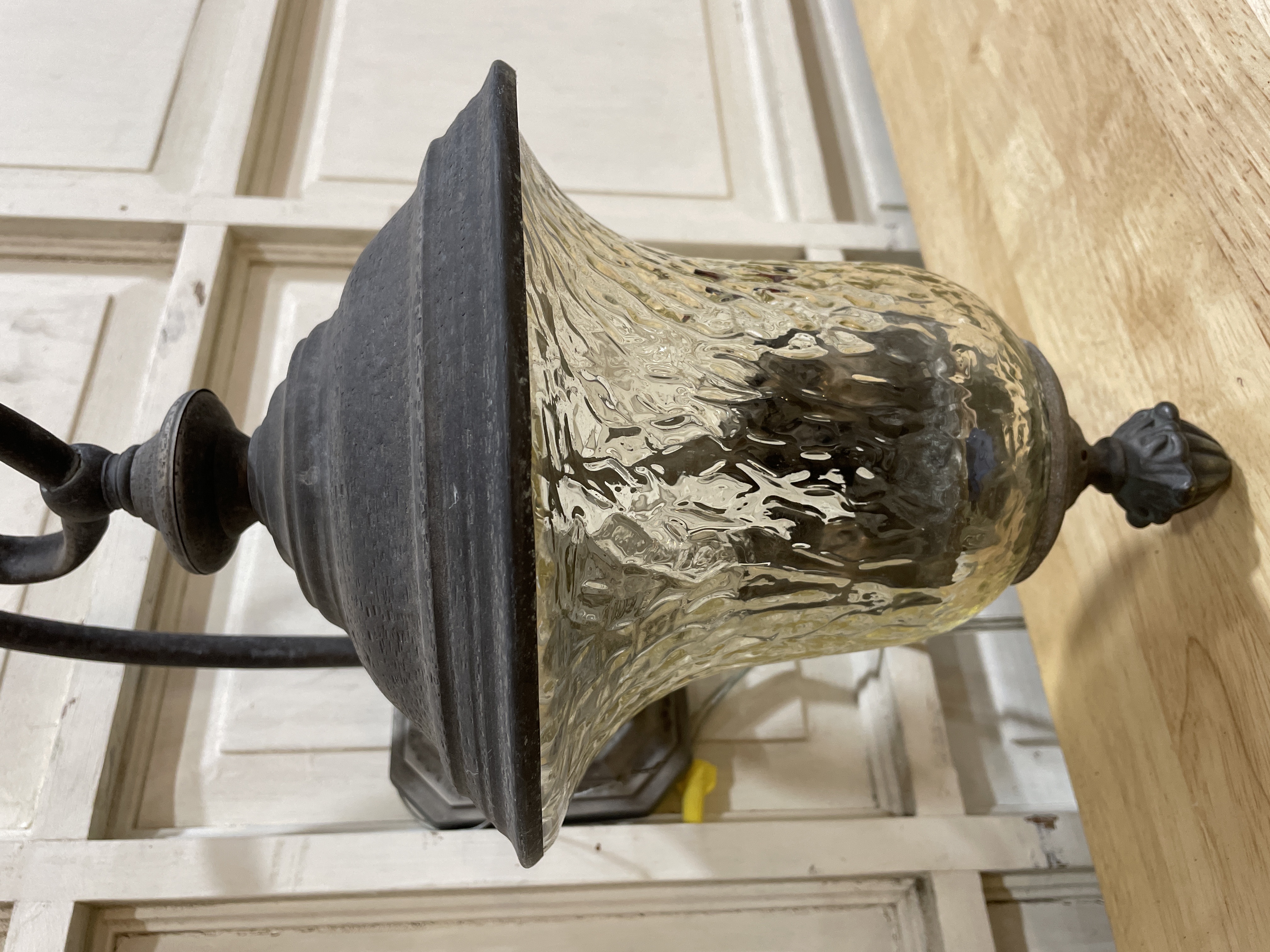 Bronze finish with curved arm, decorative finial and clear textured glass. Takes 3 candelabra bulbs.