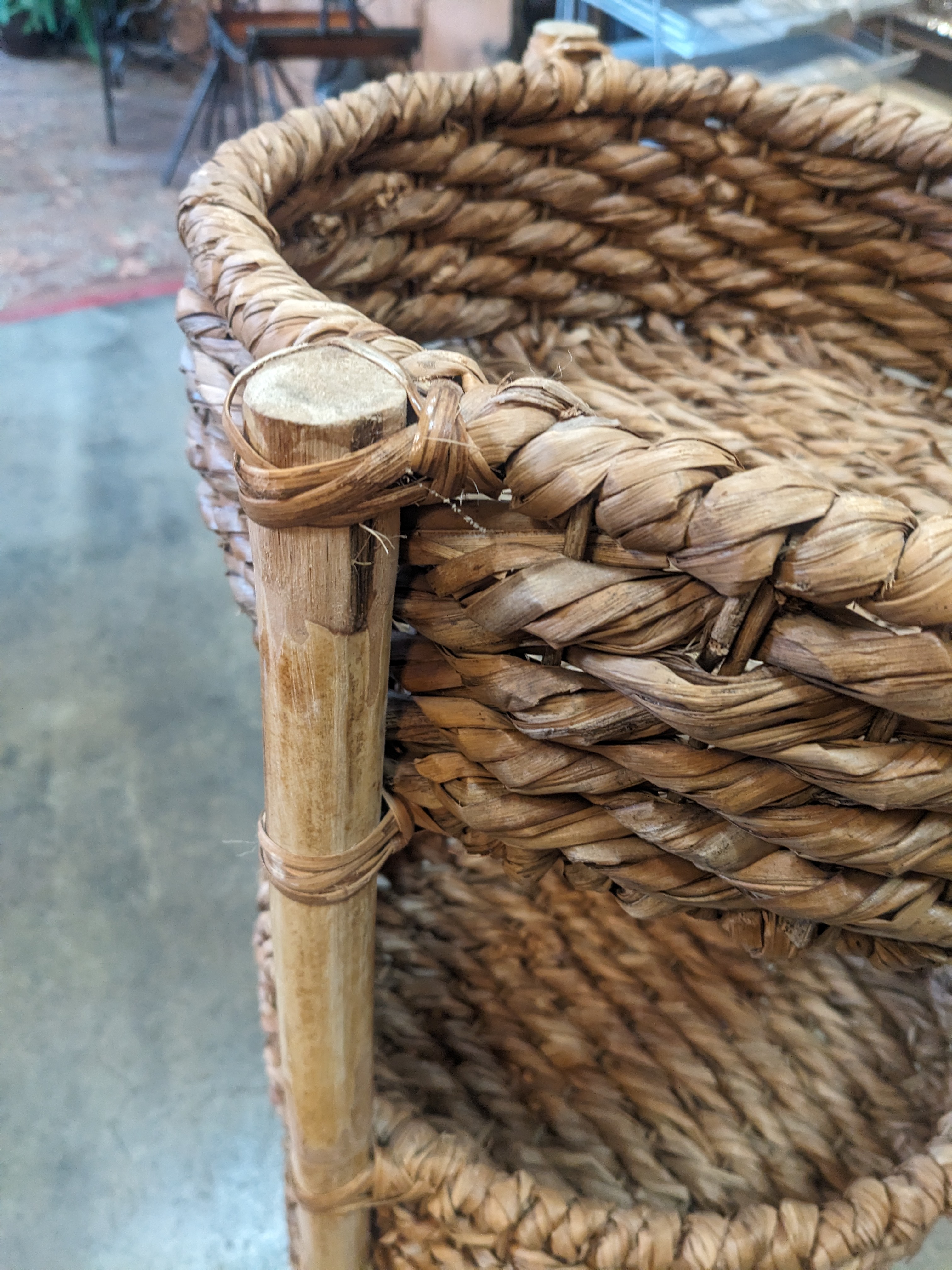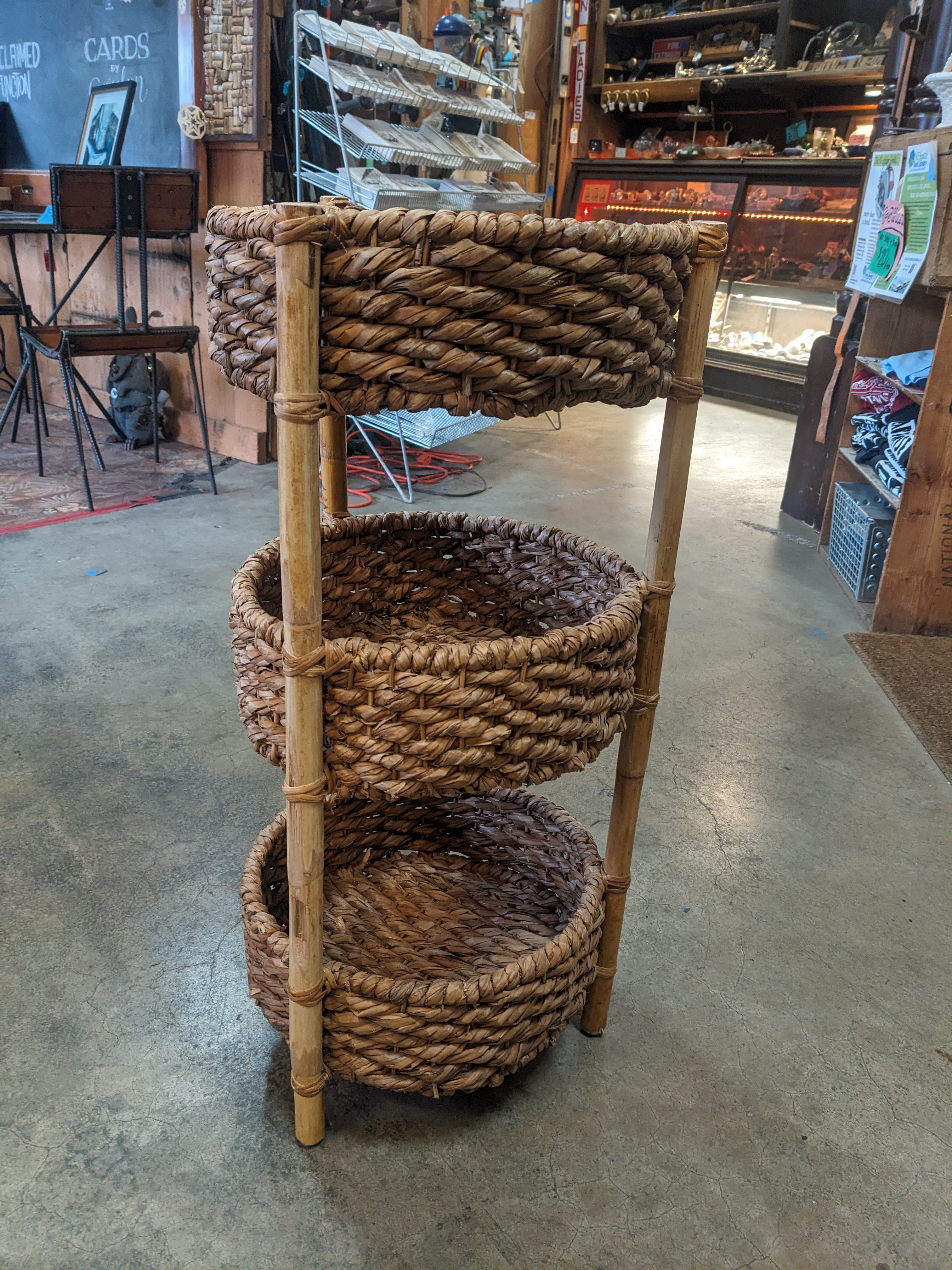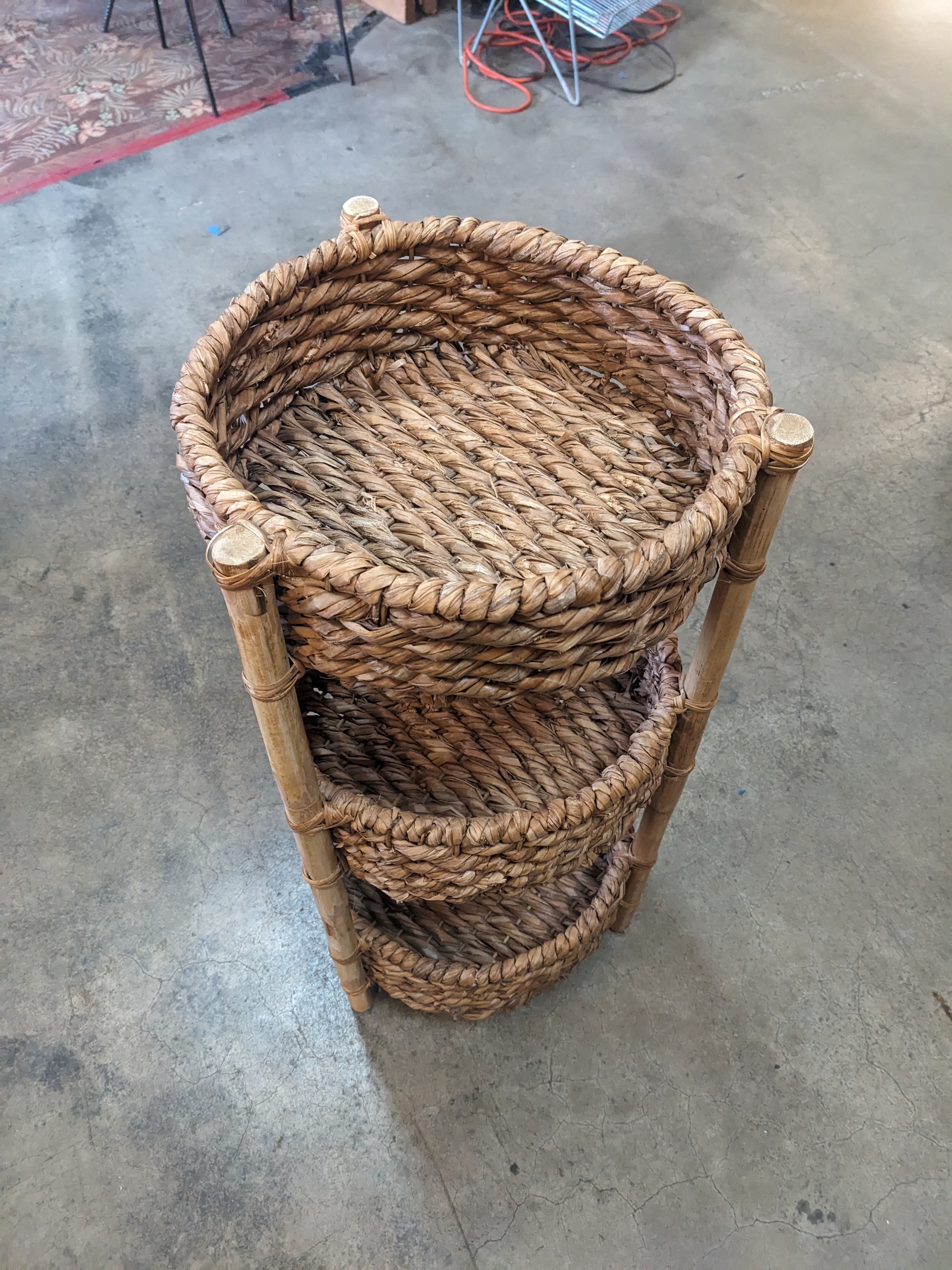 Originally sold for $100 at World Market, this cute 3 tiered shelf is a great storage solution for your apartment or home. It featured 3 reeded baskets attached to sturdy bamboo posts. In great condition. Measures 15 x 32.