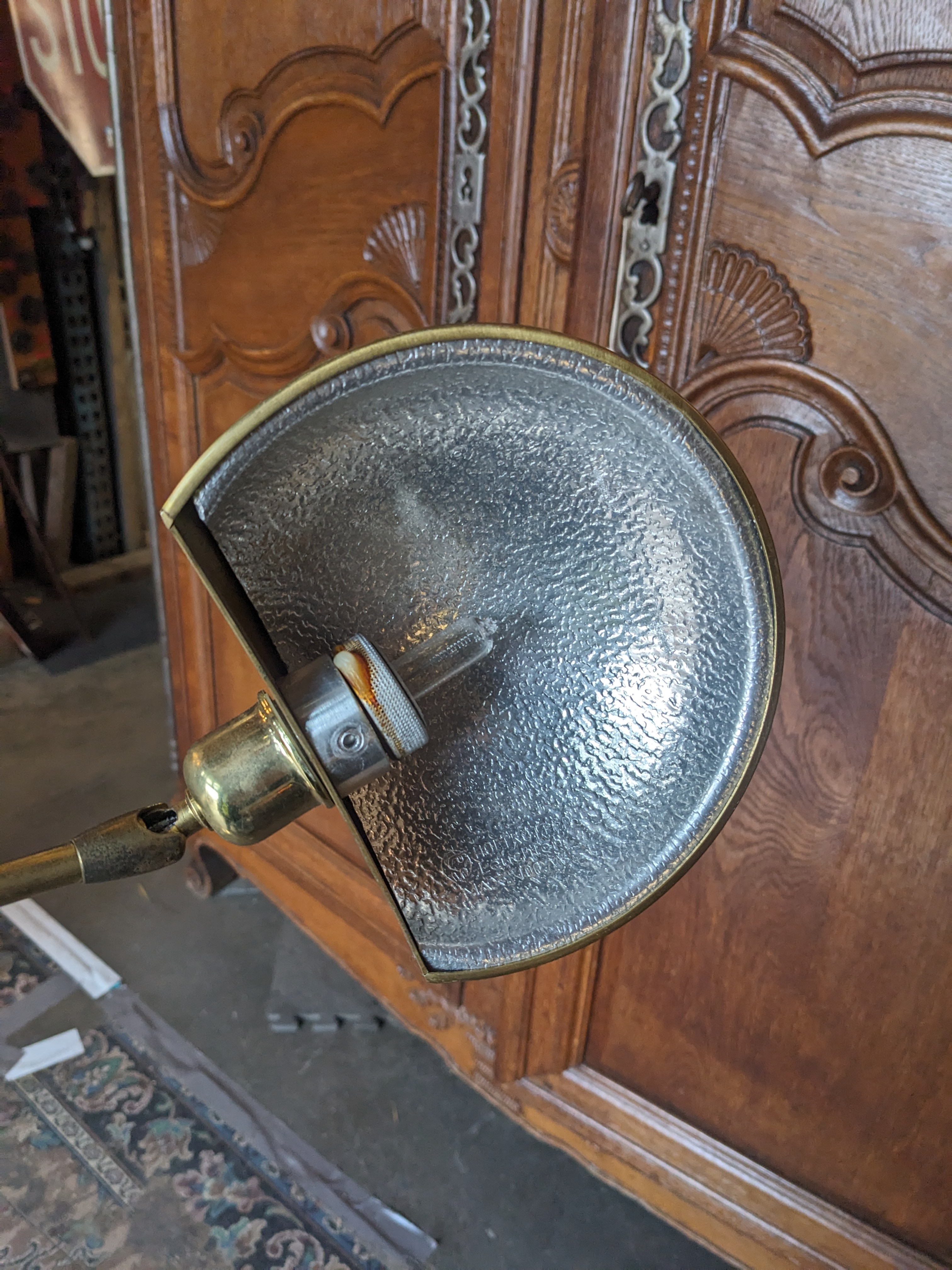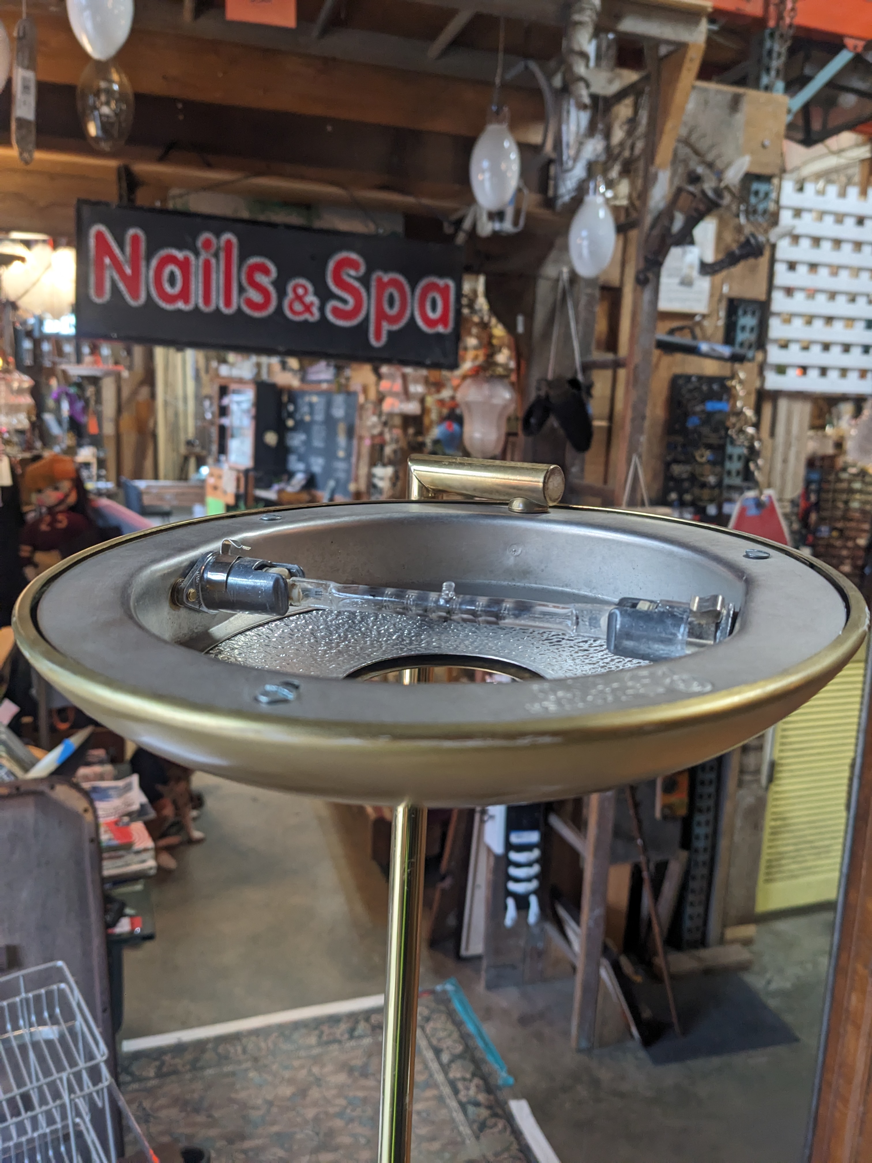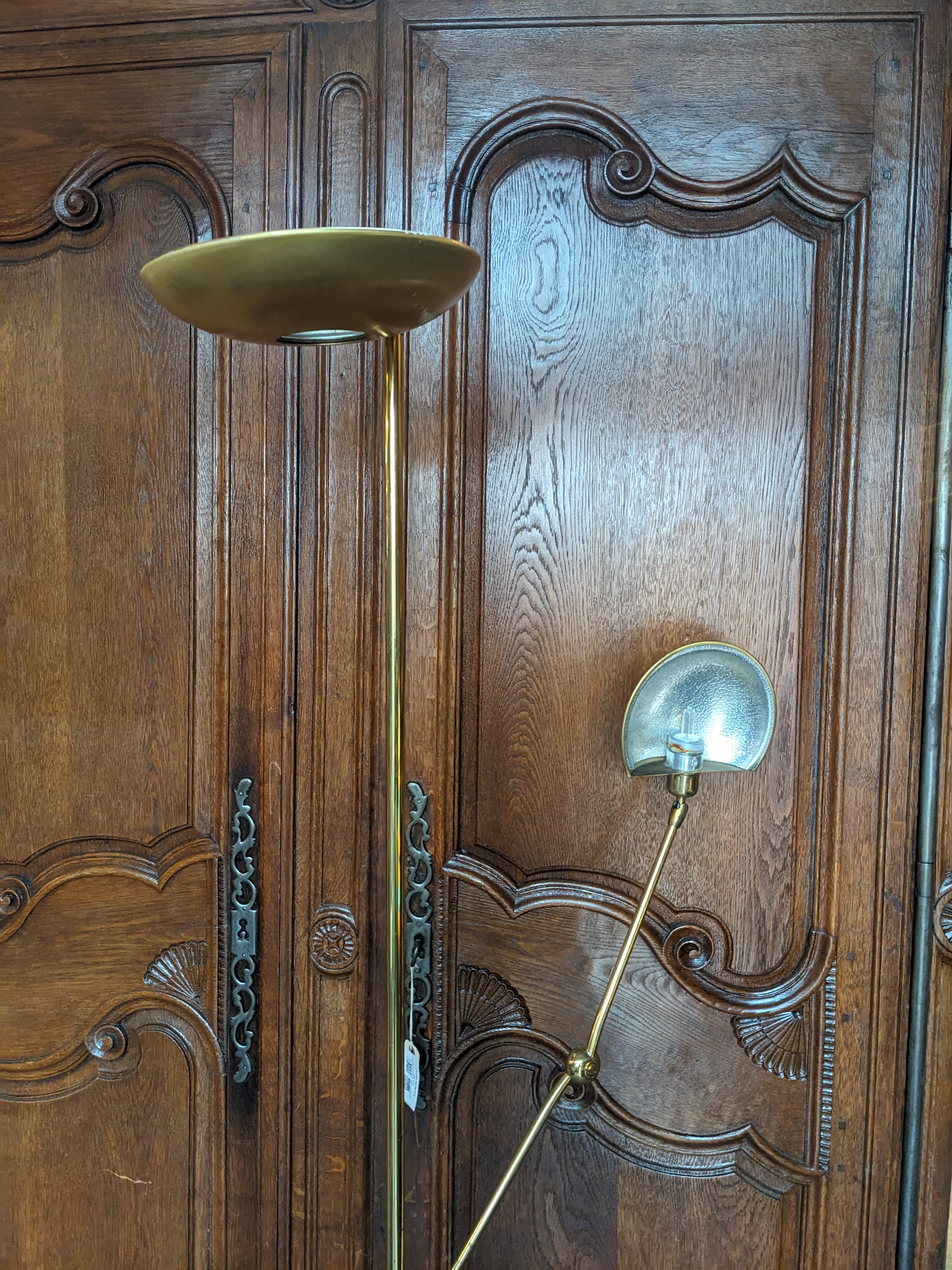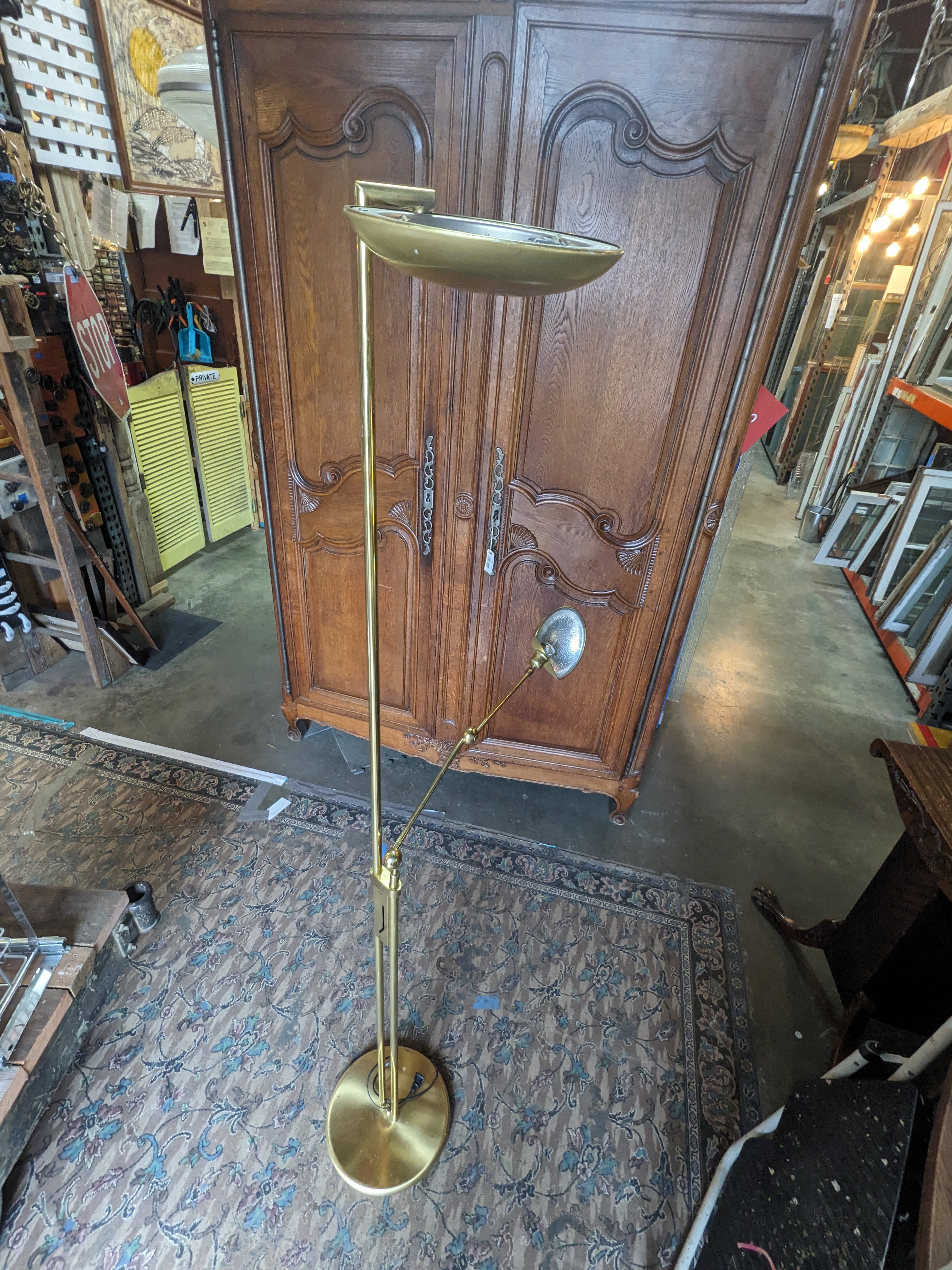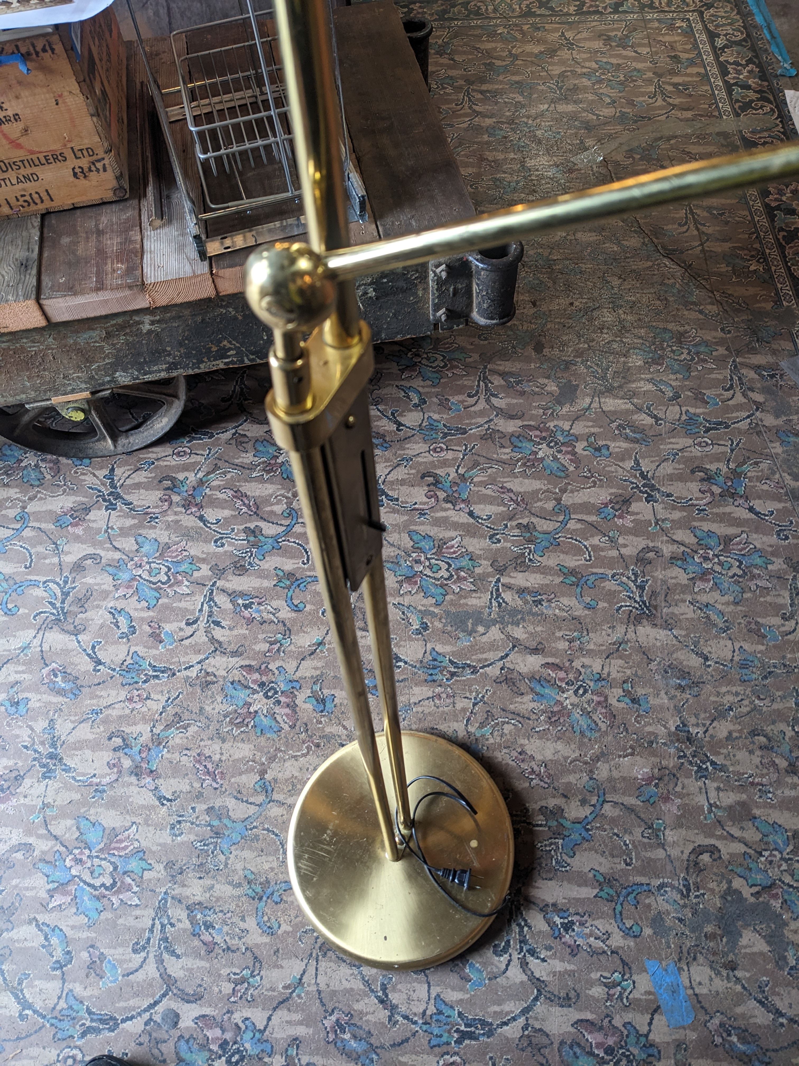 This beautiful floor lamp is quite large and stunning! The gold color and saucer lampshades are classy. It has 2 arms, the smaller one is adjustable so it would be great in a cozy corner to provide light to read a book. In great condition. Measures 1.5 inches wide at the base and 73 inches tall.
