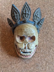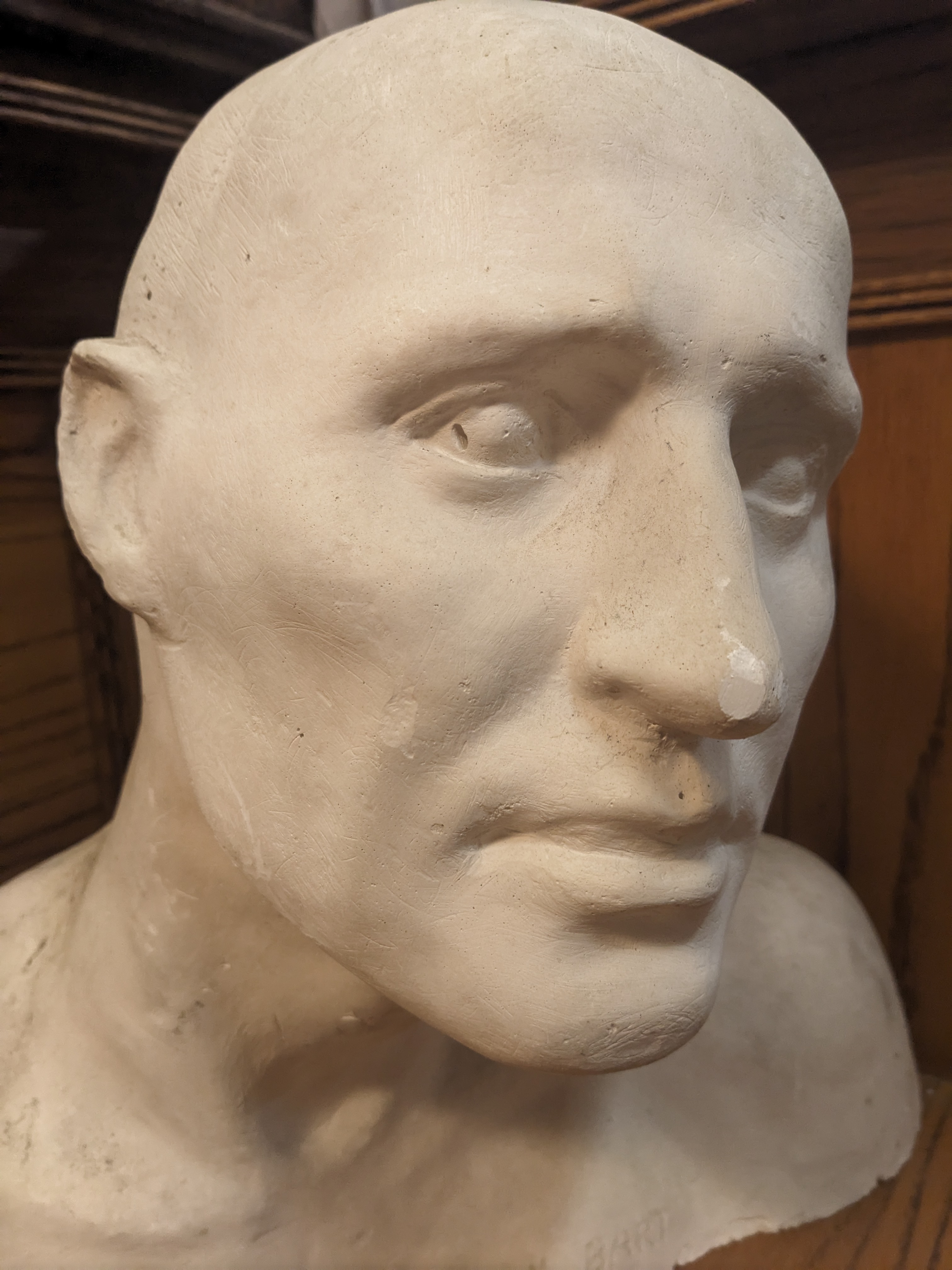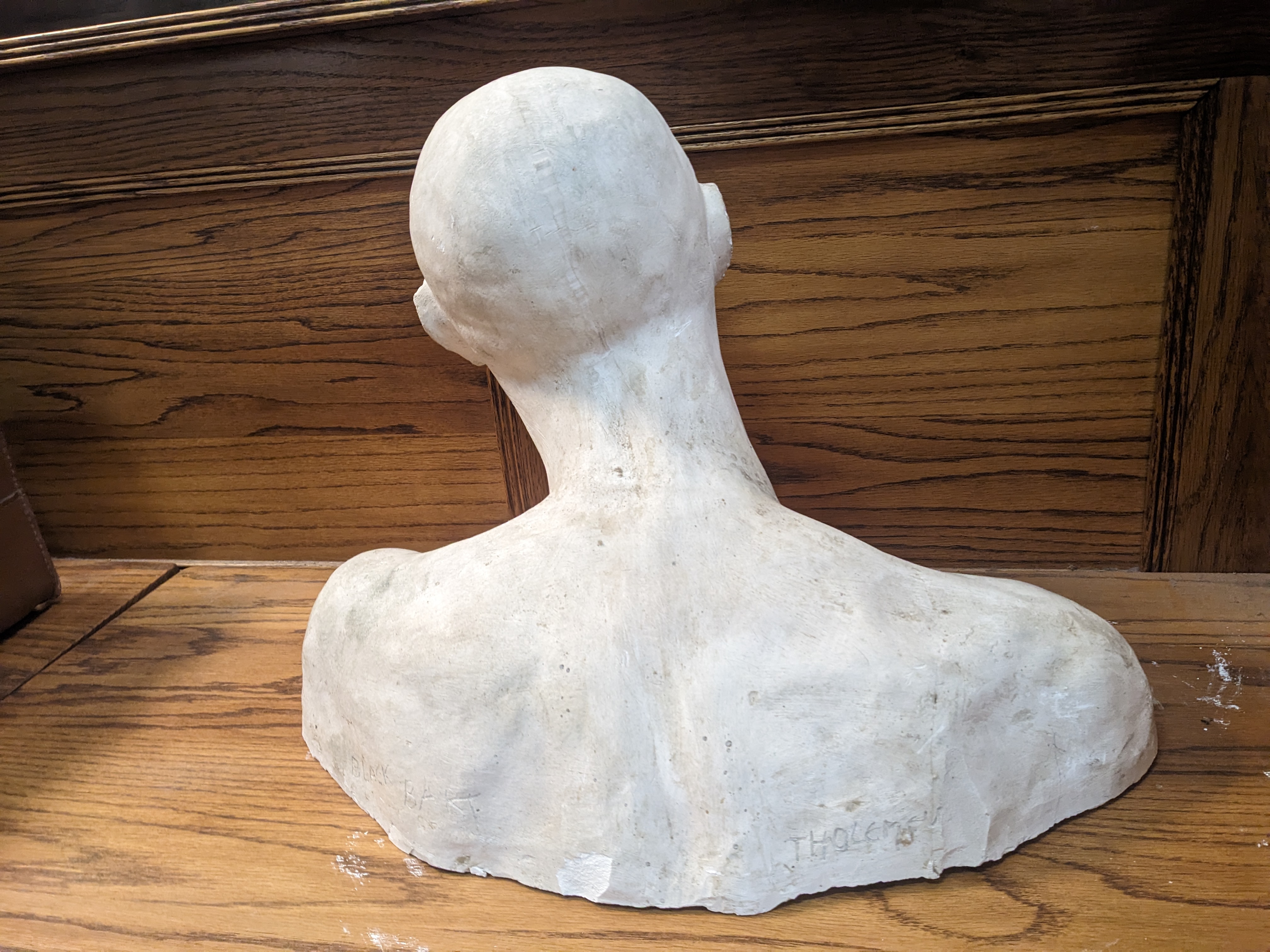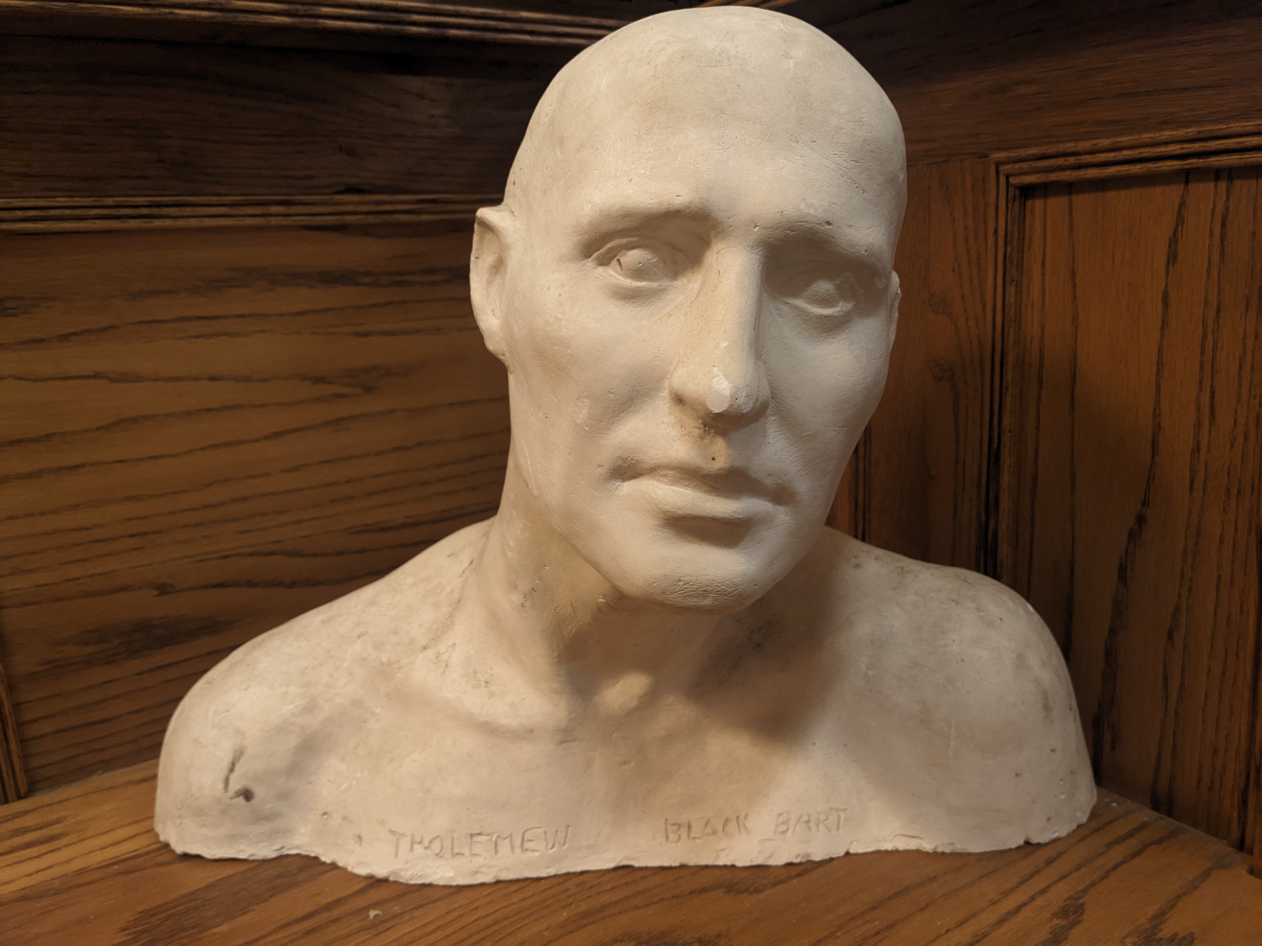 This handmade plaster bust is based off one of the artist's friends. He can stand up on his own and is highly detailed. He could use a slight nose job, but also, he's perfect as he is. It features an inscription of "Tholemew" and "Black Bart" but I heard his friends just call him Mew for short. Measures 19 x 15 x 12.