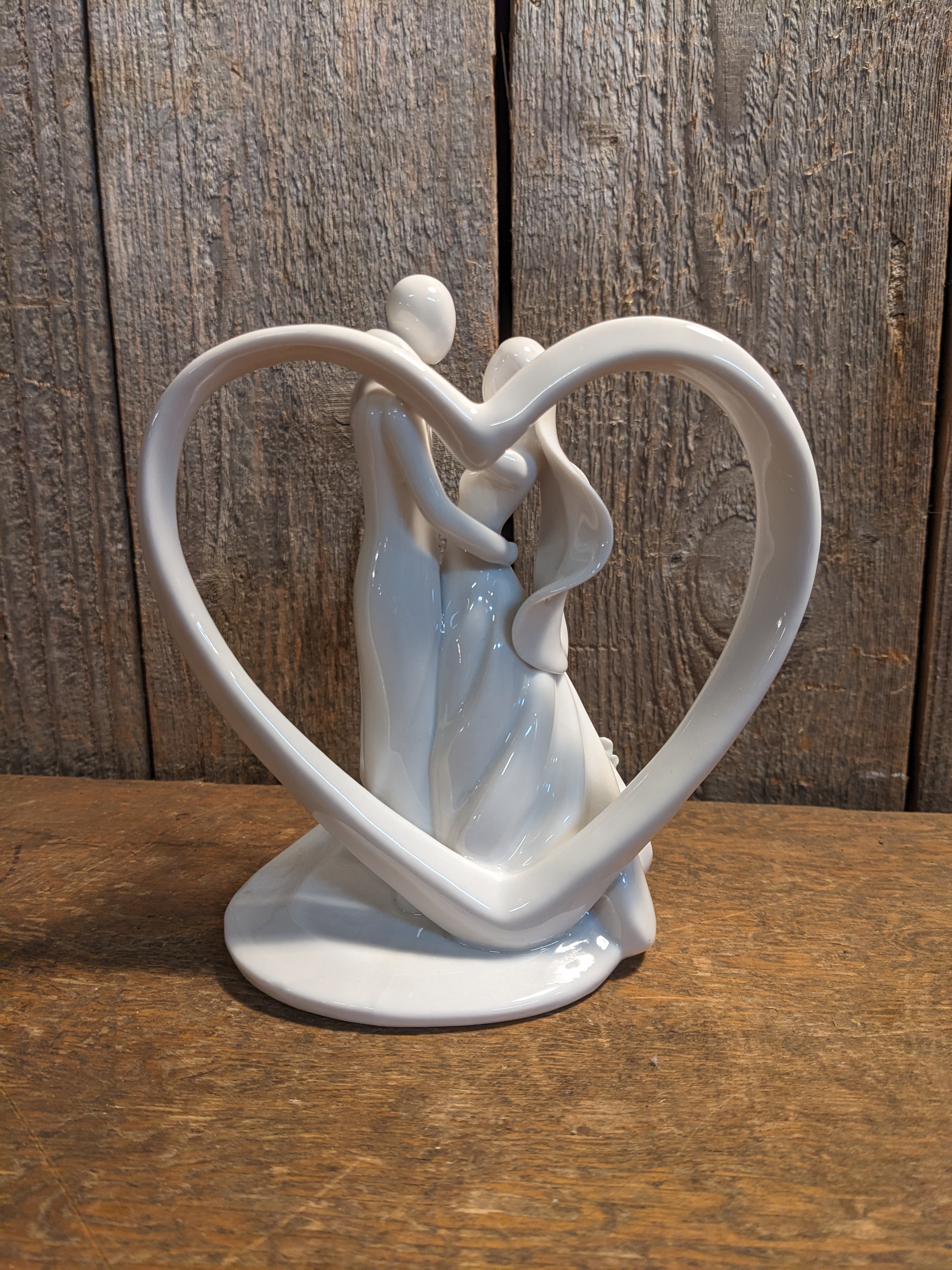 A porcelain wedding cake topper with a bride and groom in front of a heart. This piece is in good condition with no damage, and measures 5.25 x 6 x 3.25 inches.