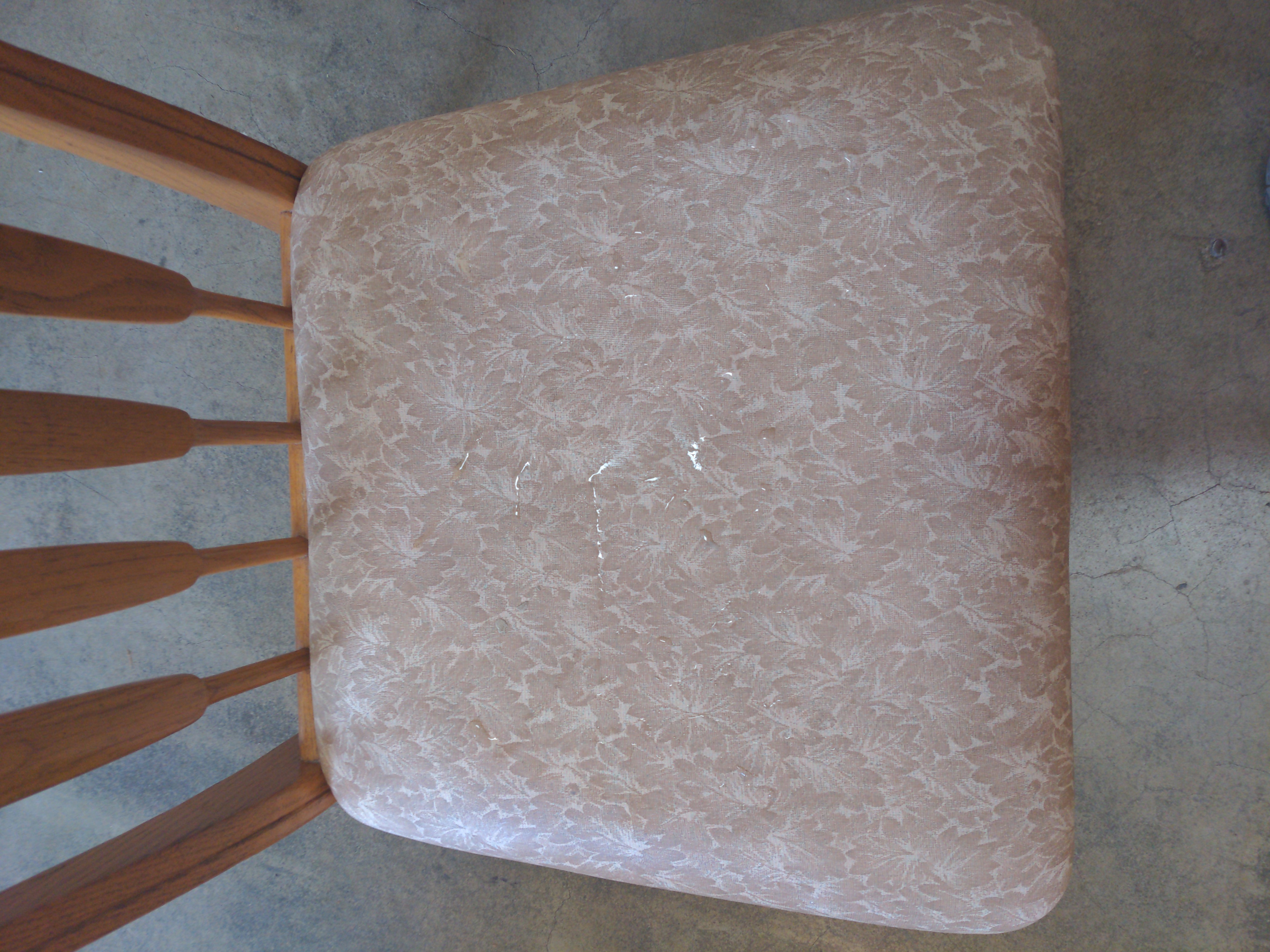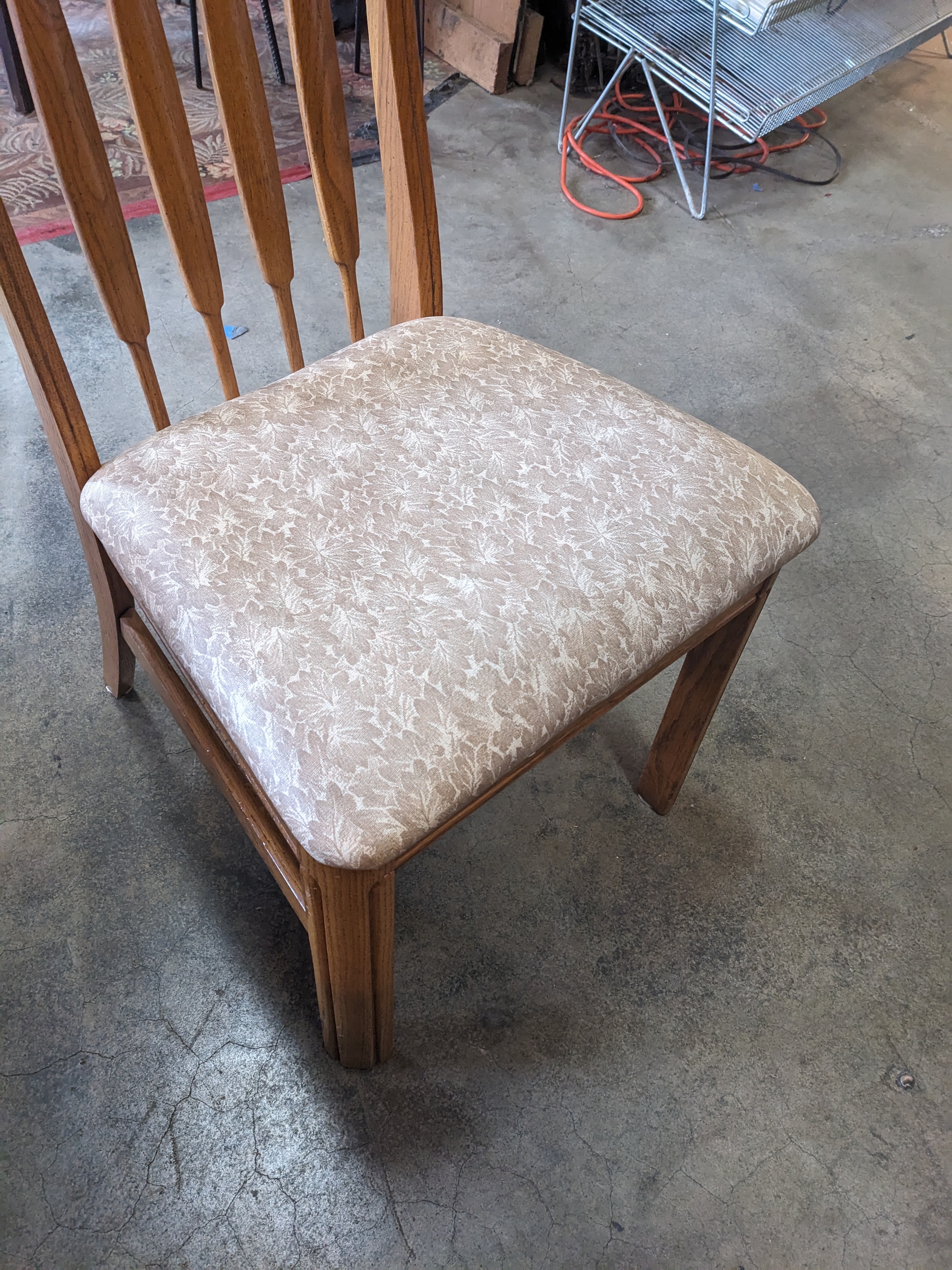 A great dining chair, sturdy and comfortable, the cushion has a lovely tope tone with a lovely leaf pattern. In good condition, no tears.