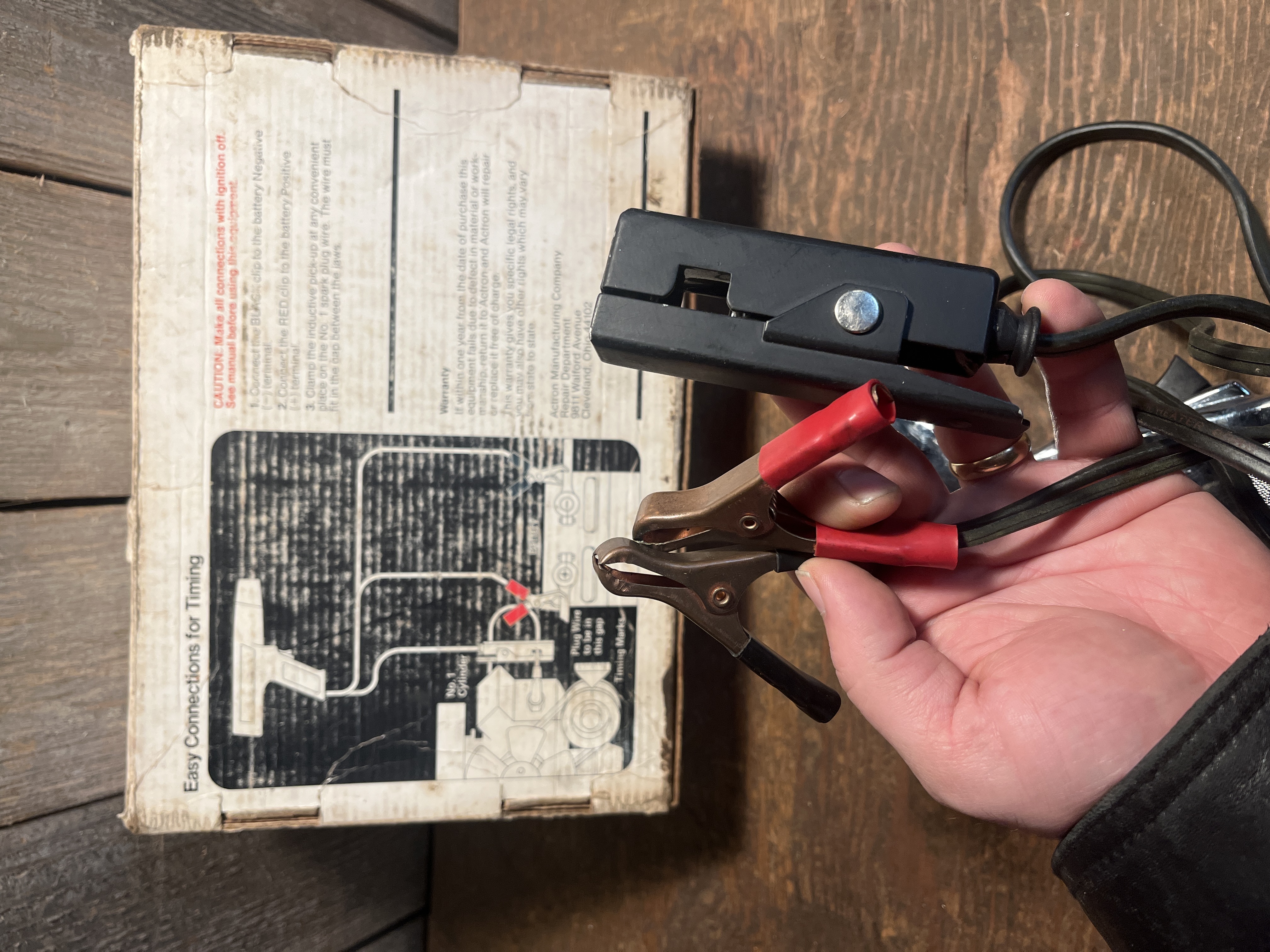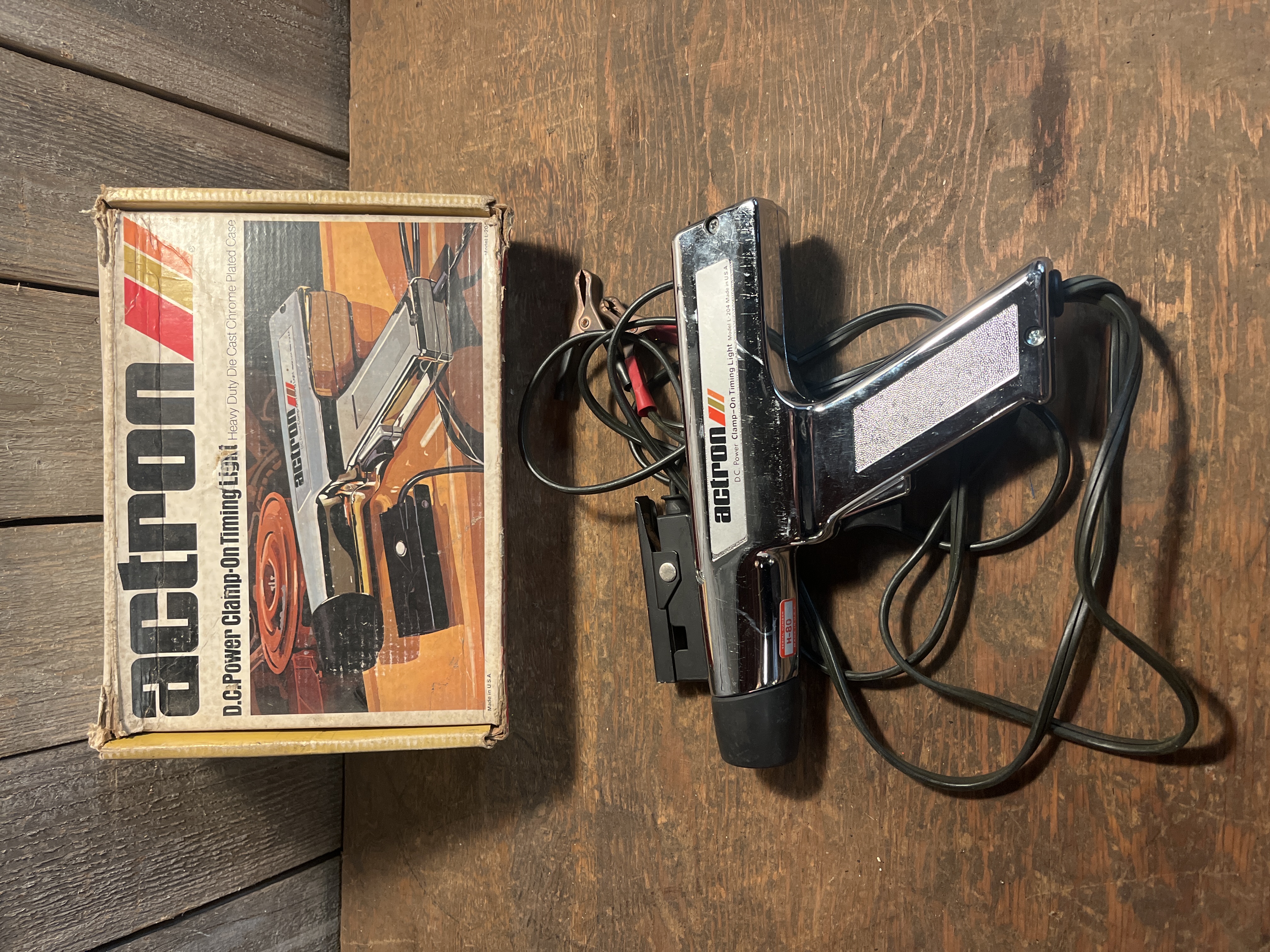 An old chrome timing light from Actron. The lense, cord, and terminals look good but we didn't hook it up. Try it out or display it! Box itself measures 12 x 3.5 x 8.25 inches.