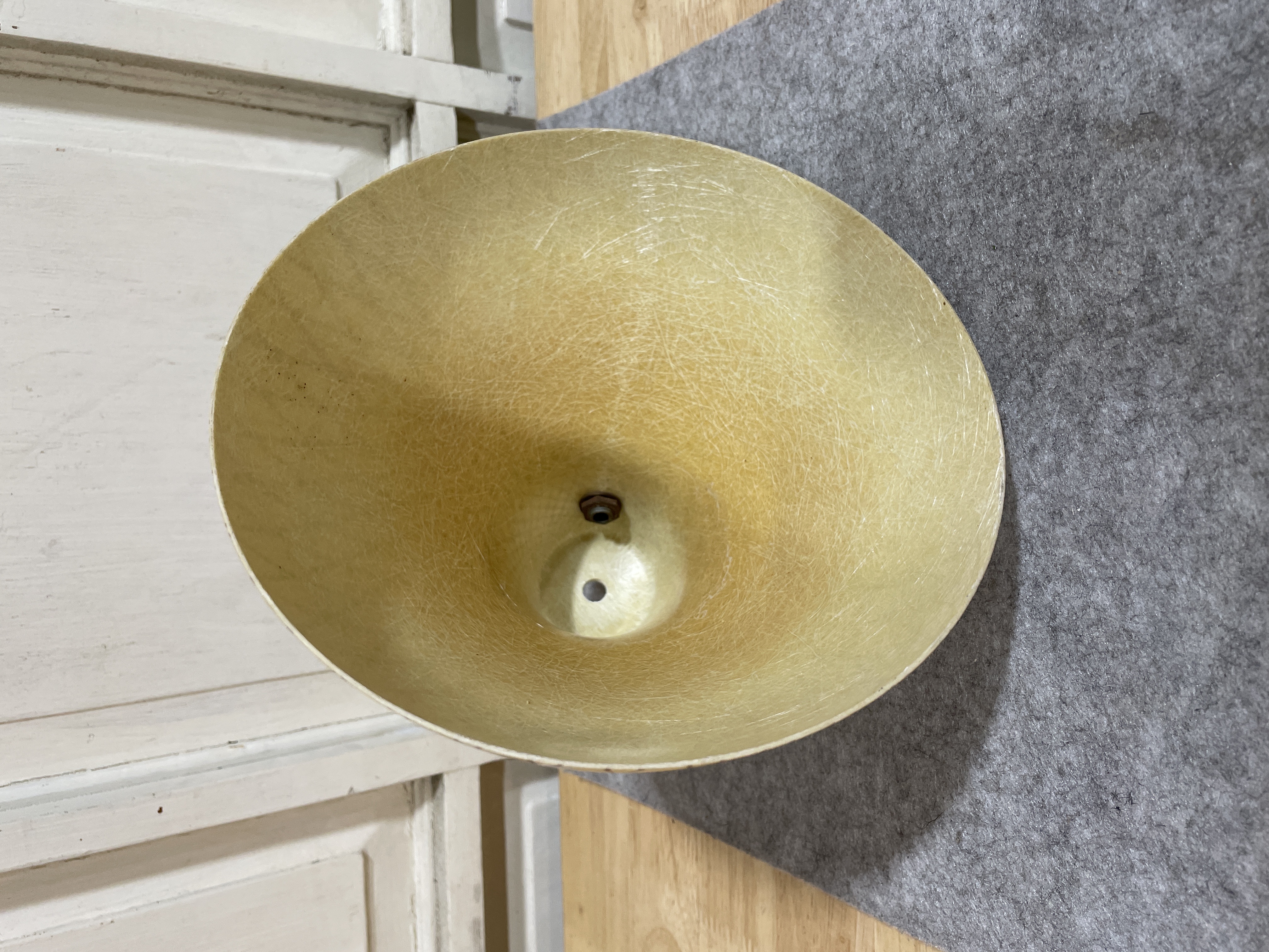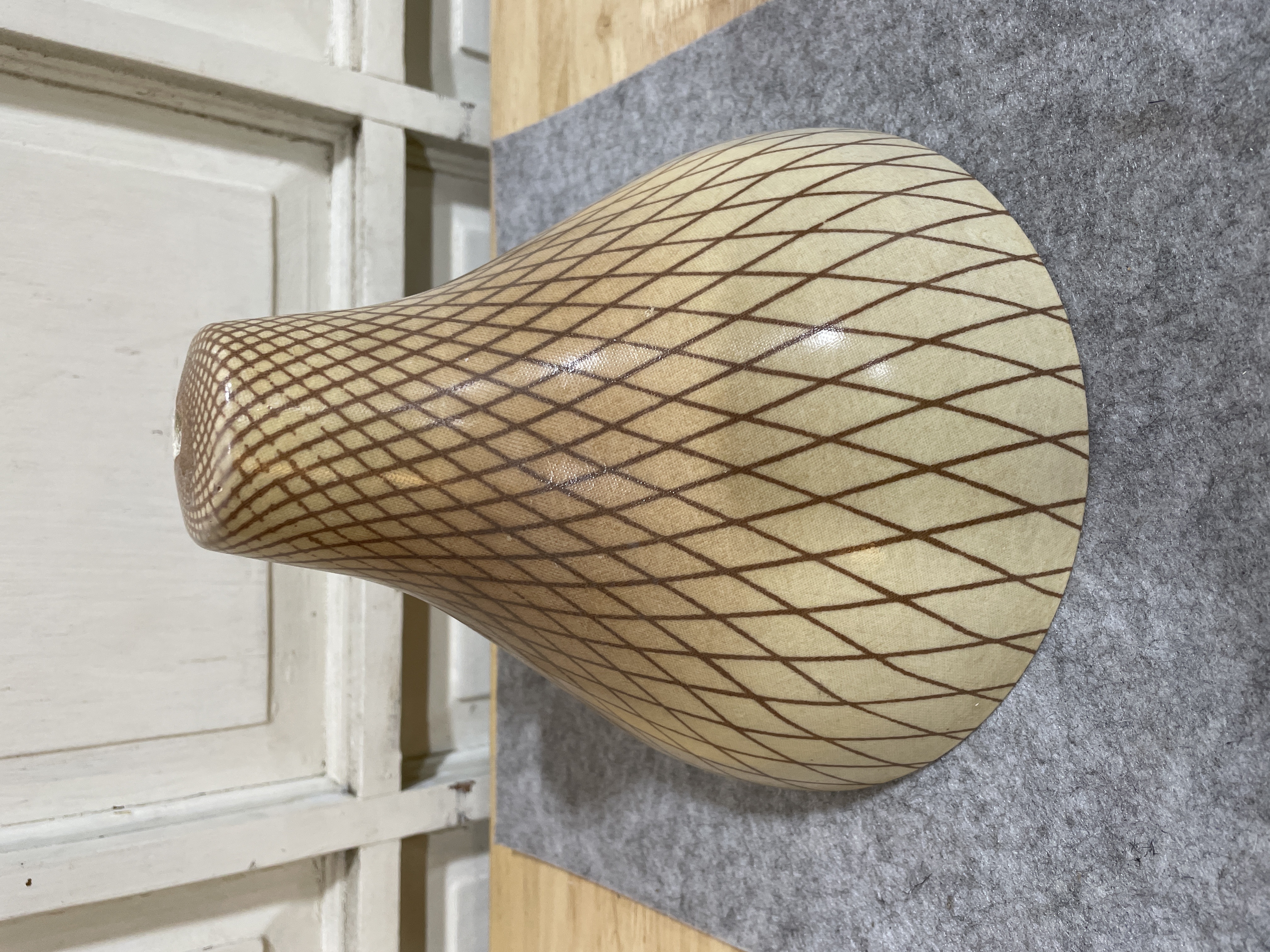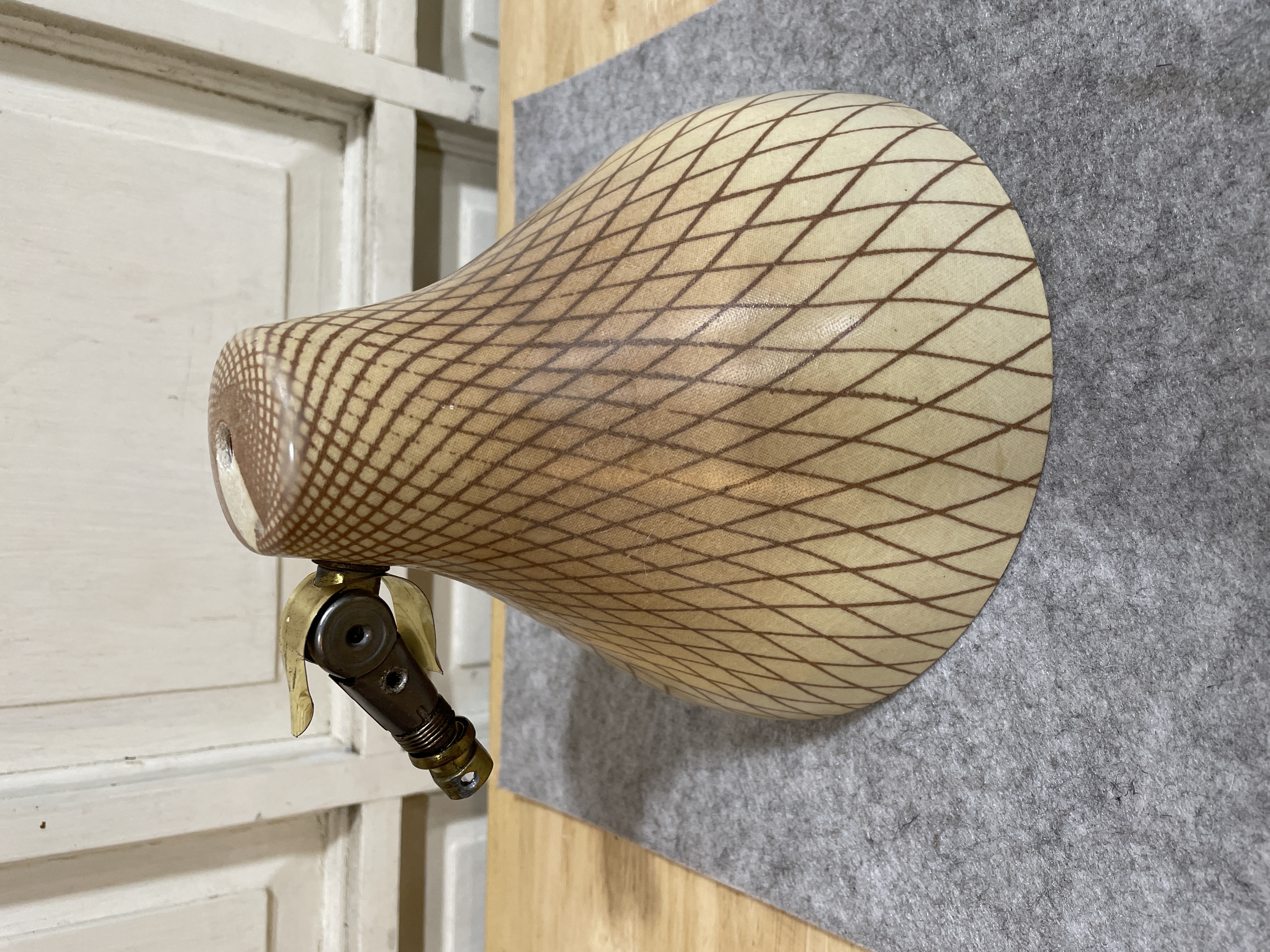 Brown and cream grid pattern. Brass connector. Some wear but no cracks.