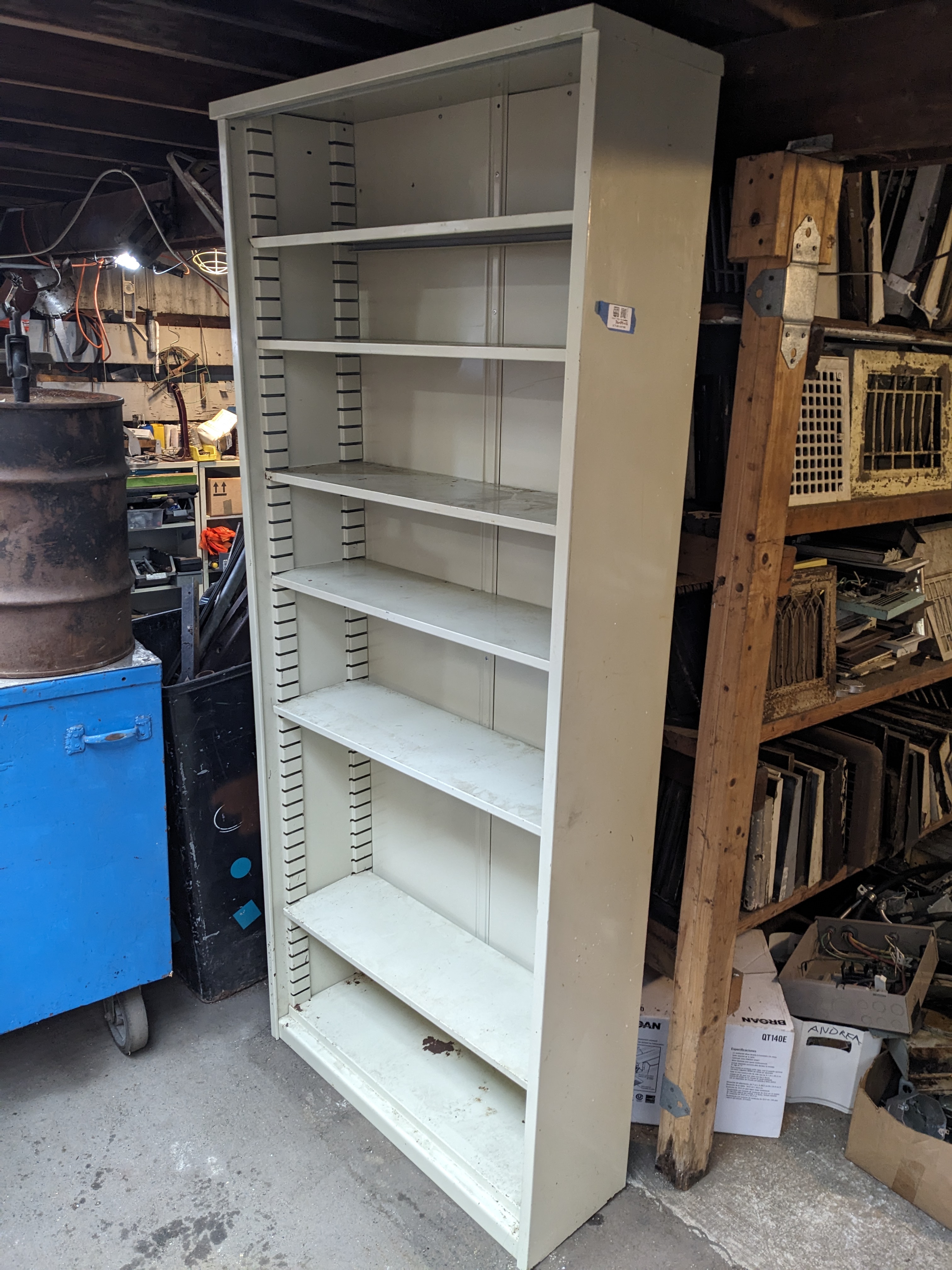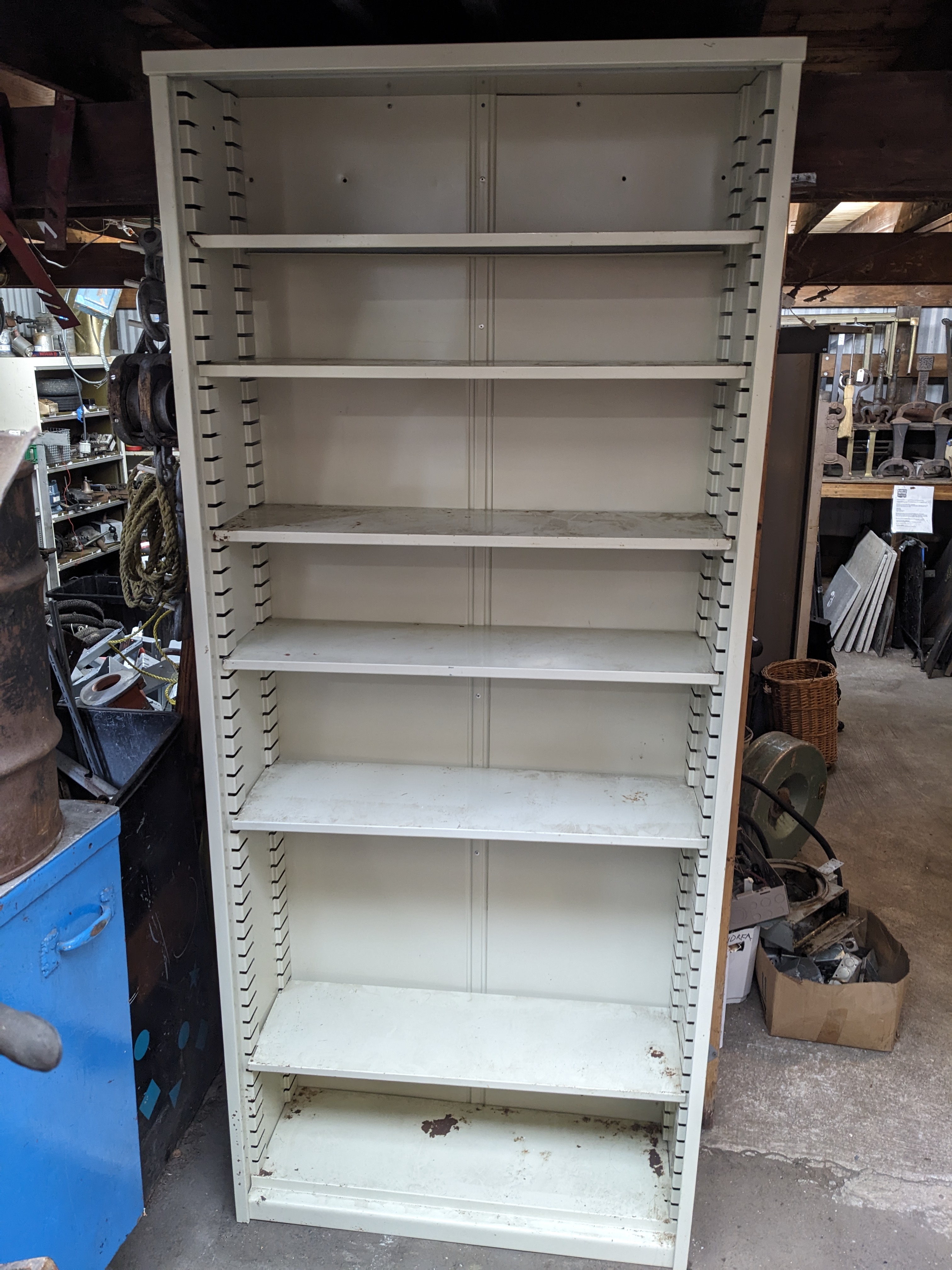This tall, off-white storage unit has 6 removable shelves and could be great for many different locations such as a garage, shop, basement, pantry, etc.!