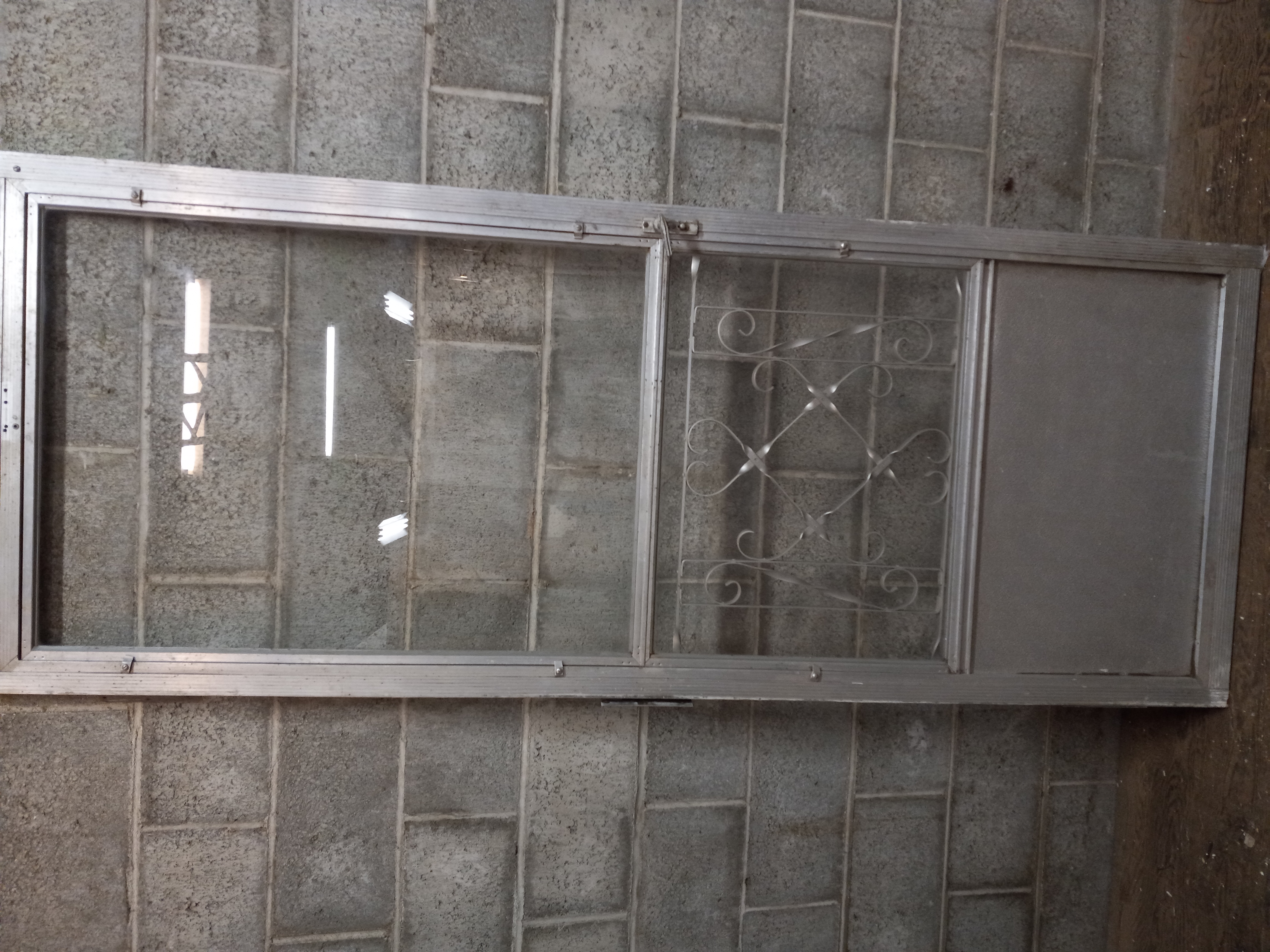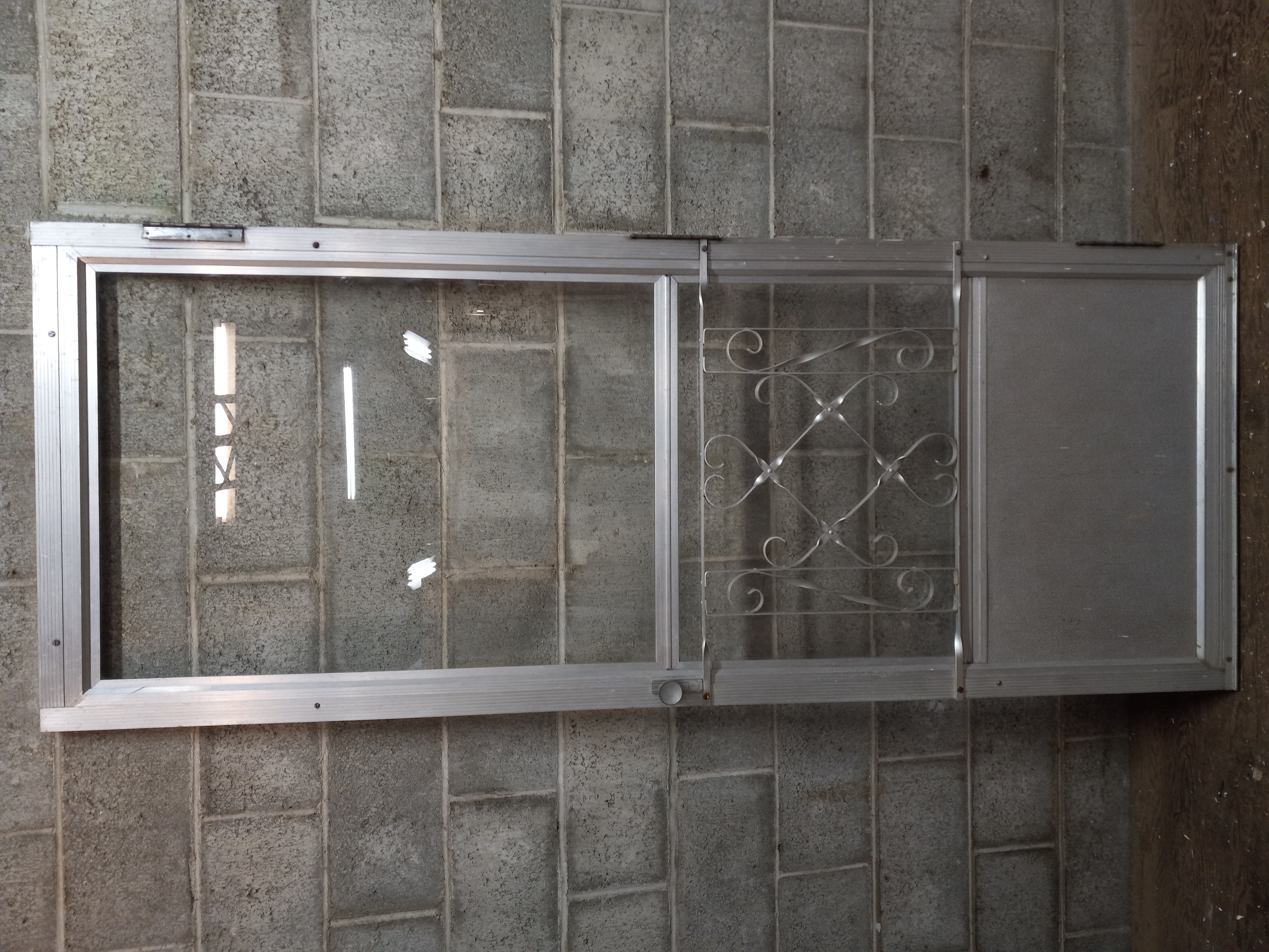 Vintage left swinging aluminum screen door with decorative metal section.