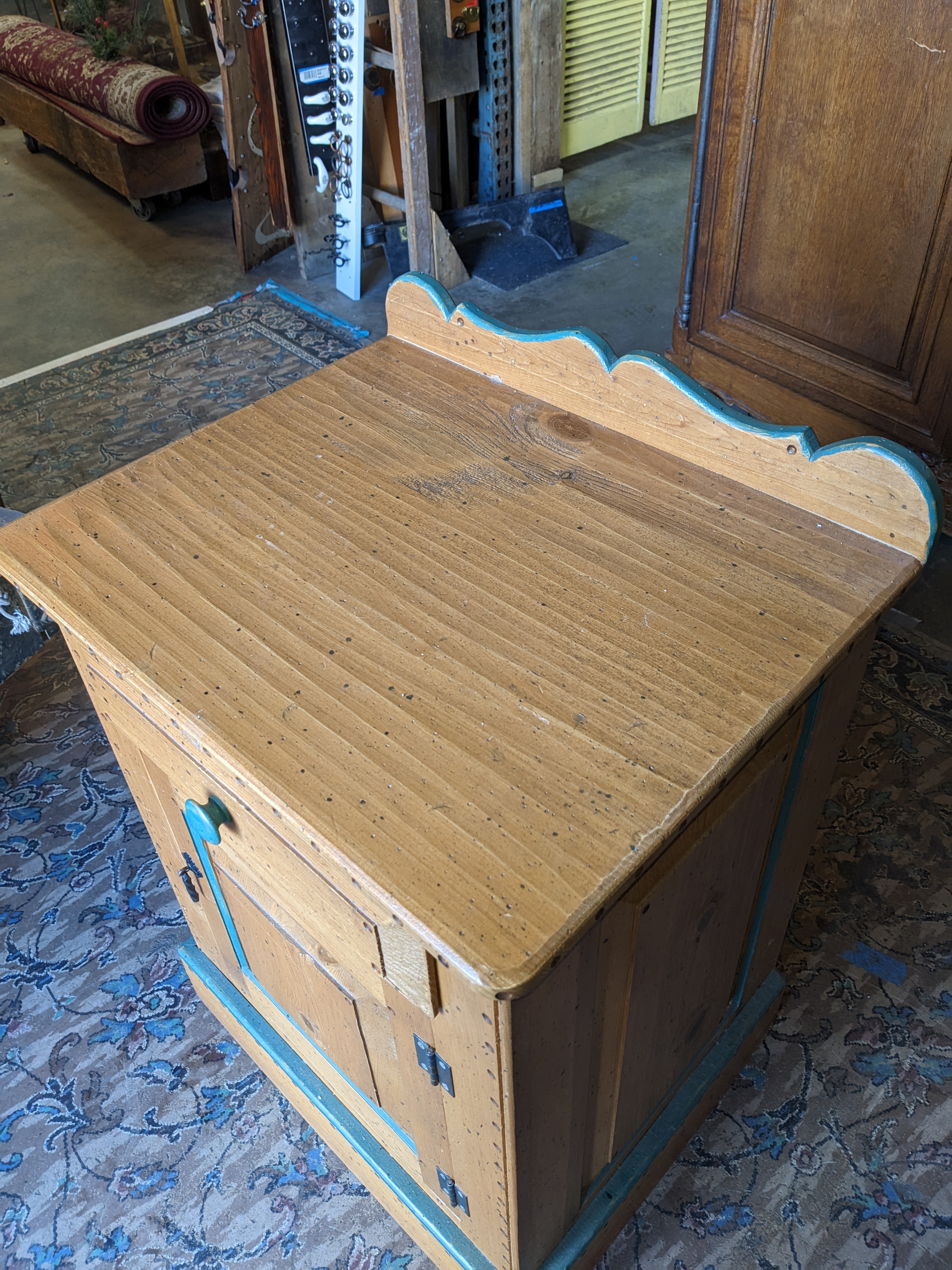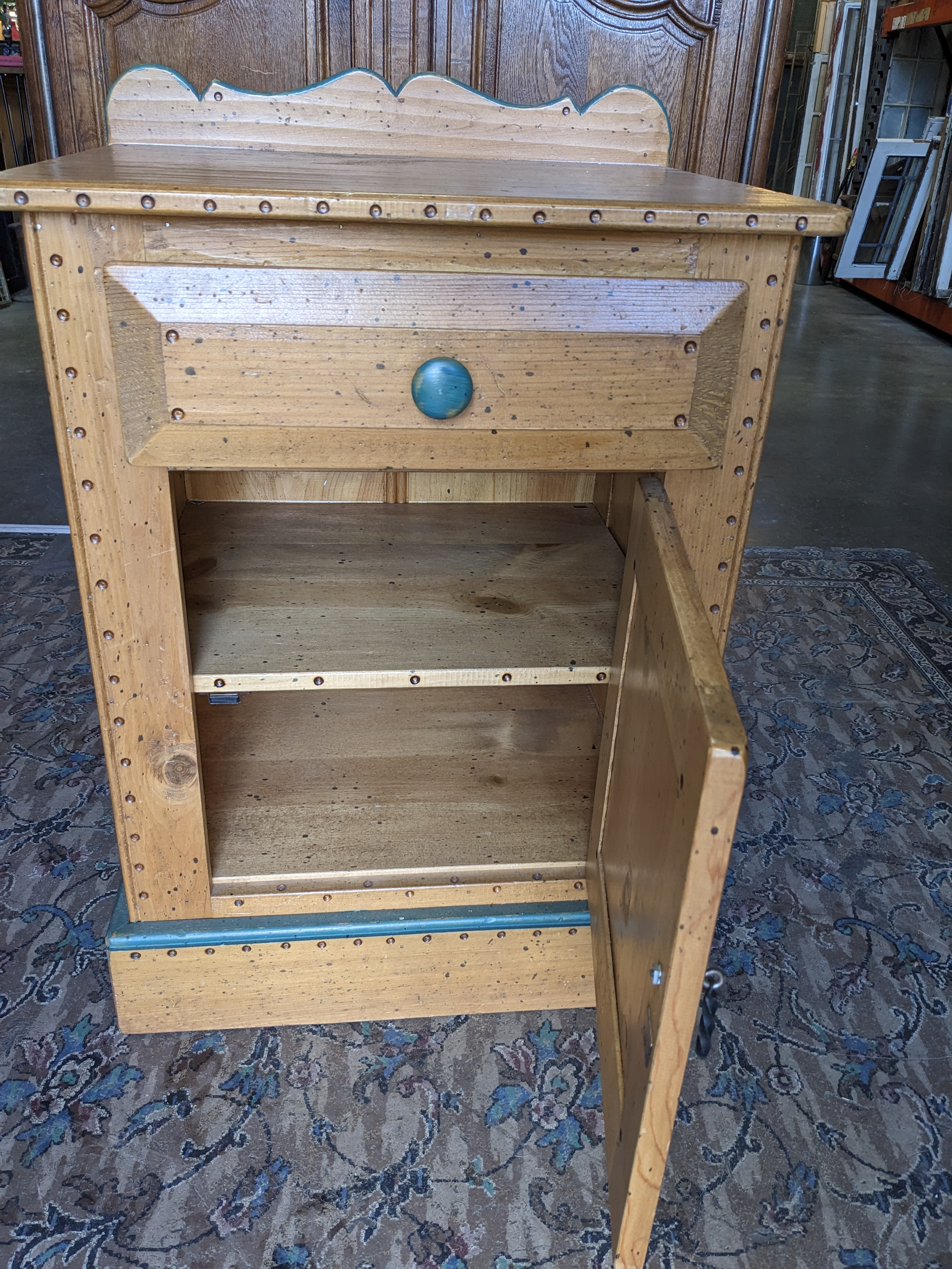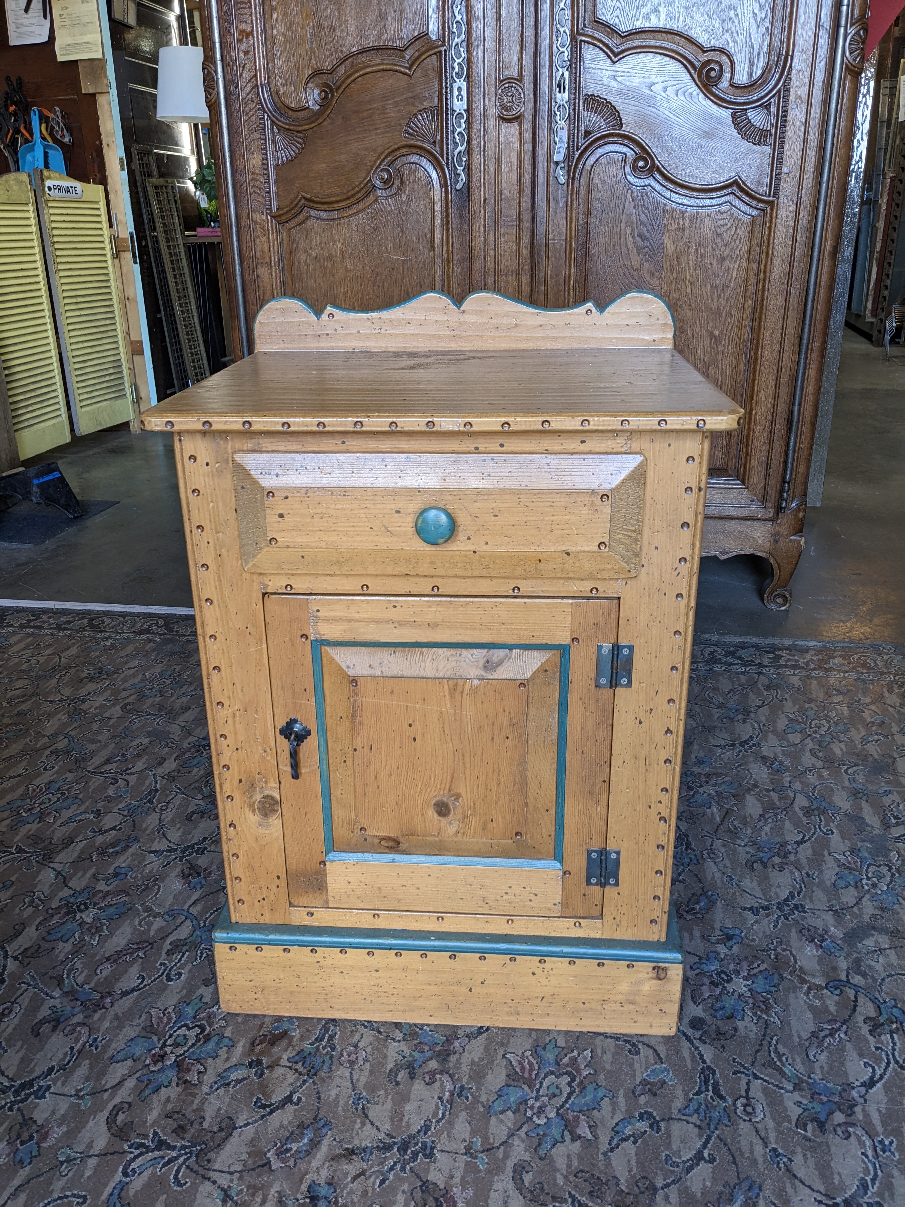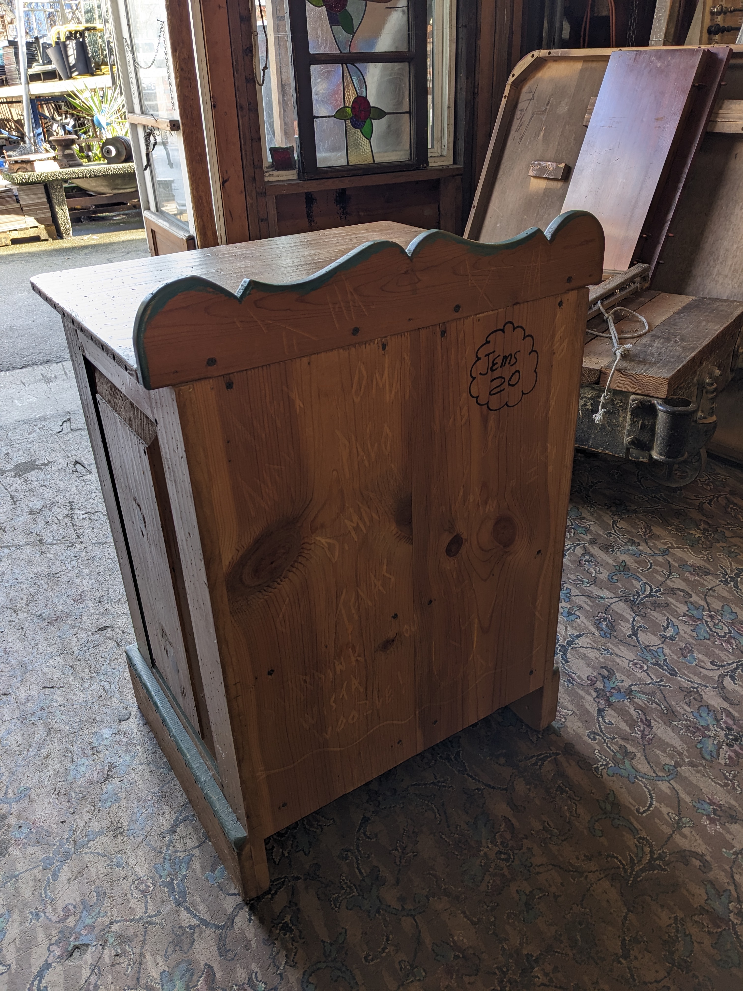 Cute cute cute! I love a creative paint job on a well made dresser. This pine has got some personality for sure, a well exposed grain with ample wood freckles makeup the construction. A green painted border defines the cabinet panel and knob pull . The hardware is in great shape and everything operates smoothly. Hinges for the door are located on the right side. This guy did come with a sibling, another small more decoratively painted dresser that mirrors this one. It is painted differently. We are selling them separately. 23.5 x 32.5 x 19