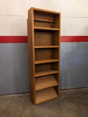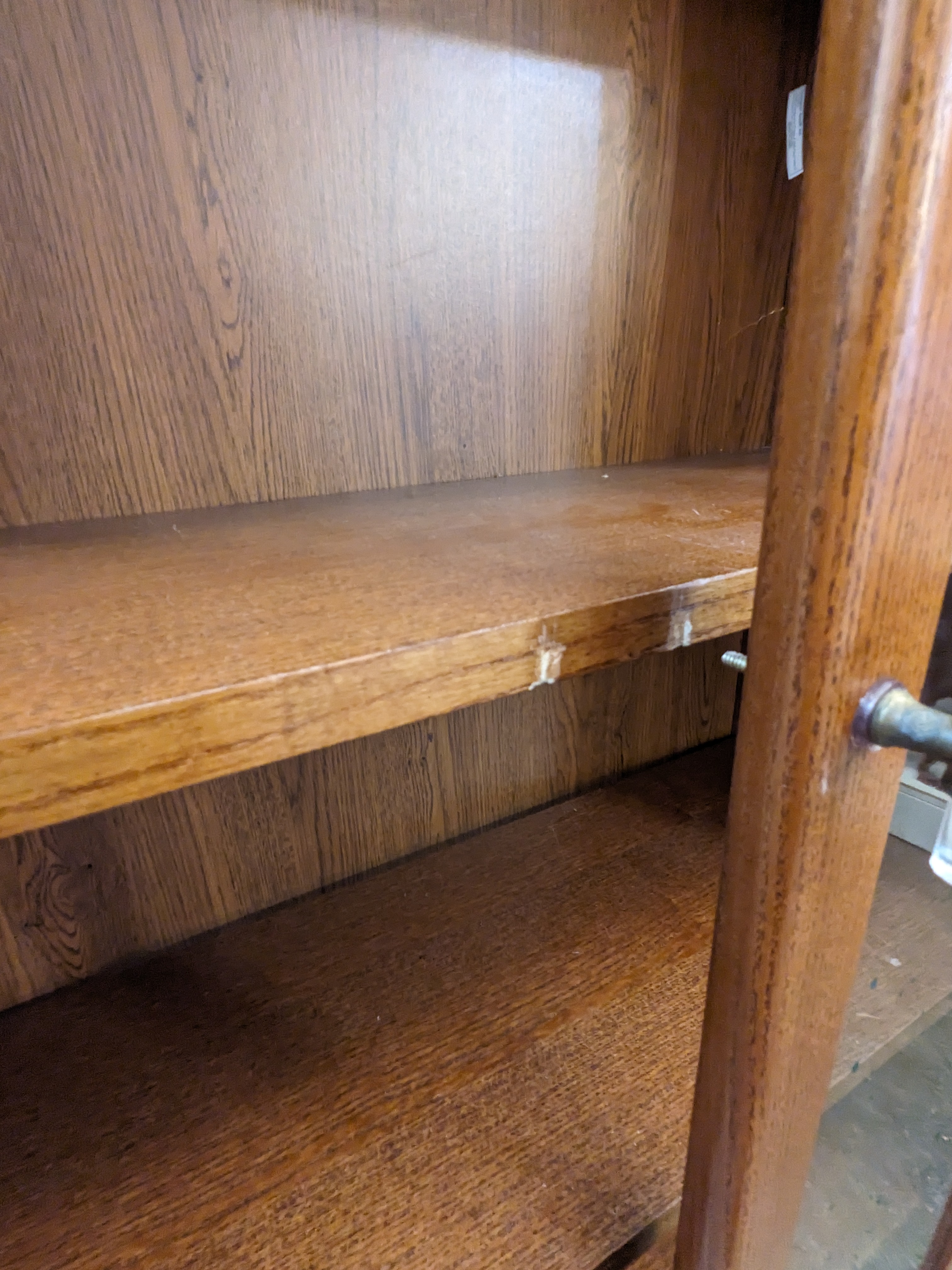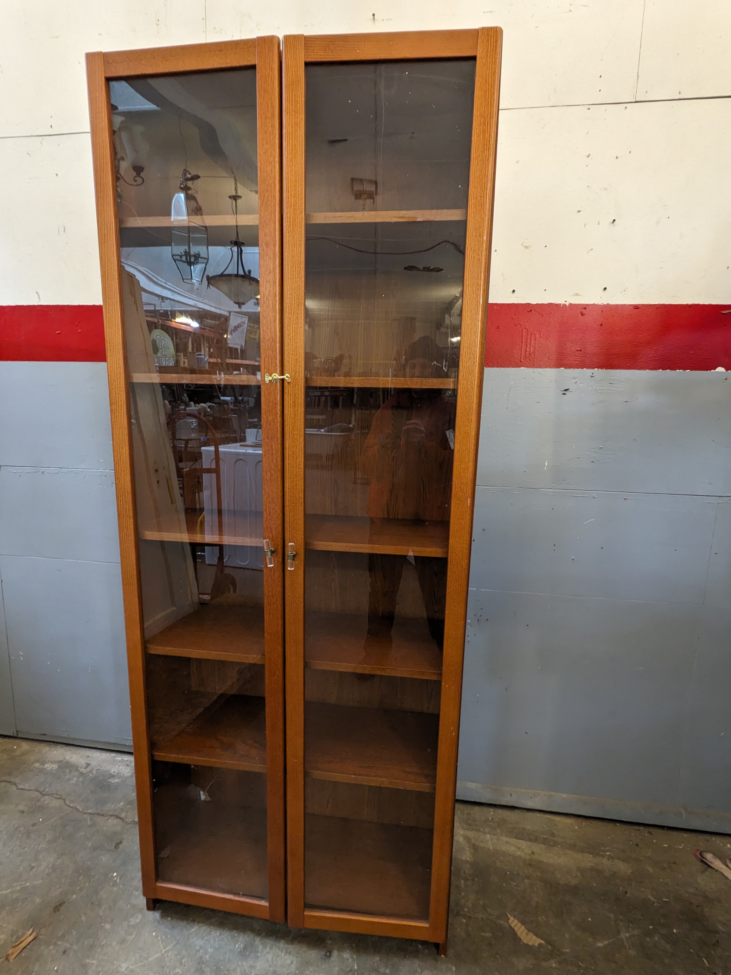 We have a particle board 6 shelf, Billy Bookcase style display cabinet. This cabinet is pretty front heavy with glass doors, and would need to be anchored to the wall. This one is in Ok used condition with some damage to the back panel and center shelf