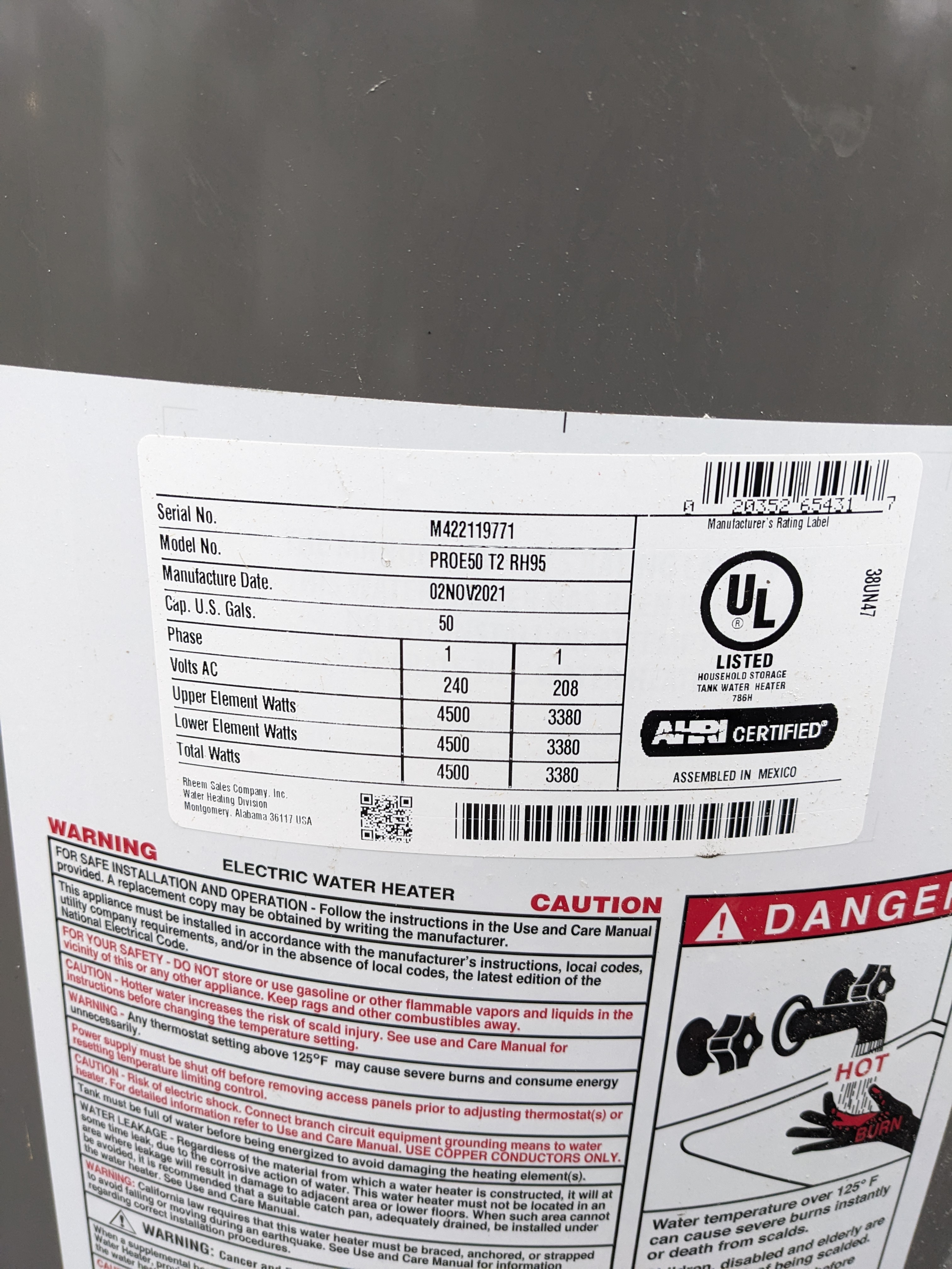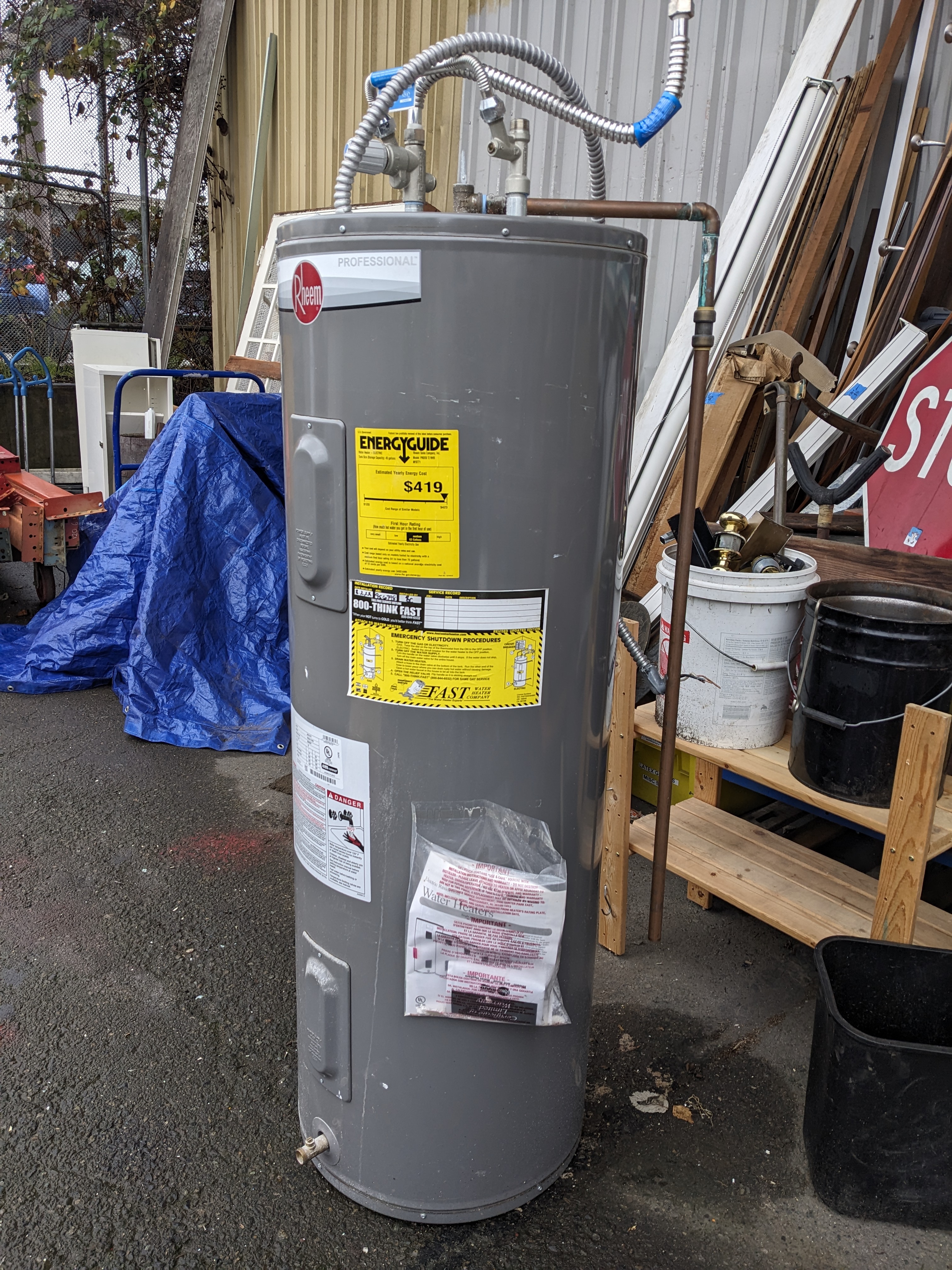 This Rheem Electric Water heater was manufactured in December 2021 and still has lots of life left. This unit holds 50 gallons. This unit was in working order prior to removal.