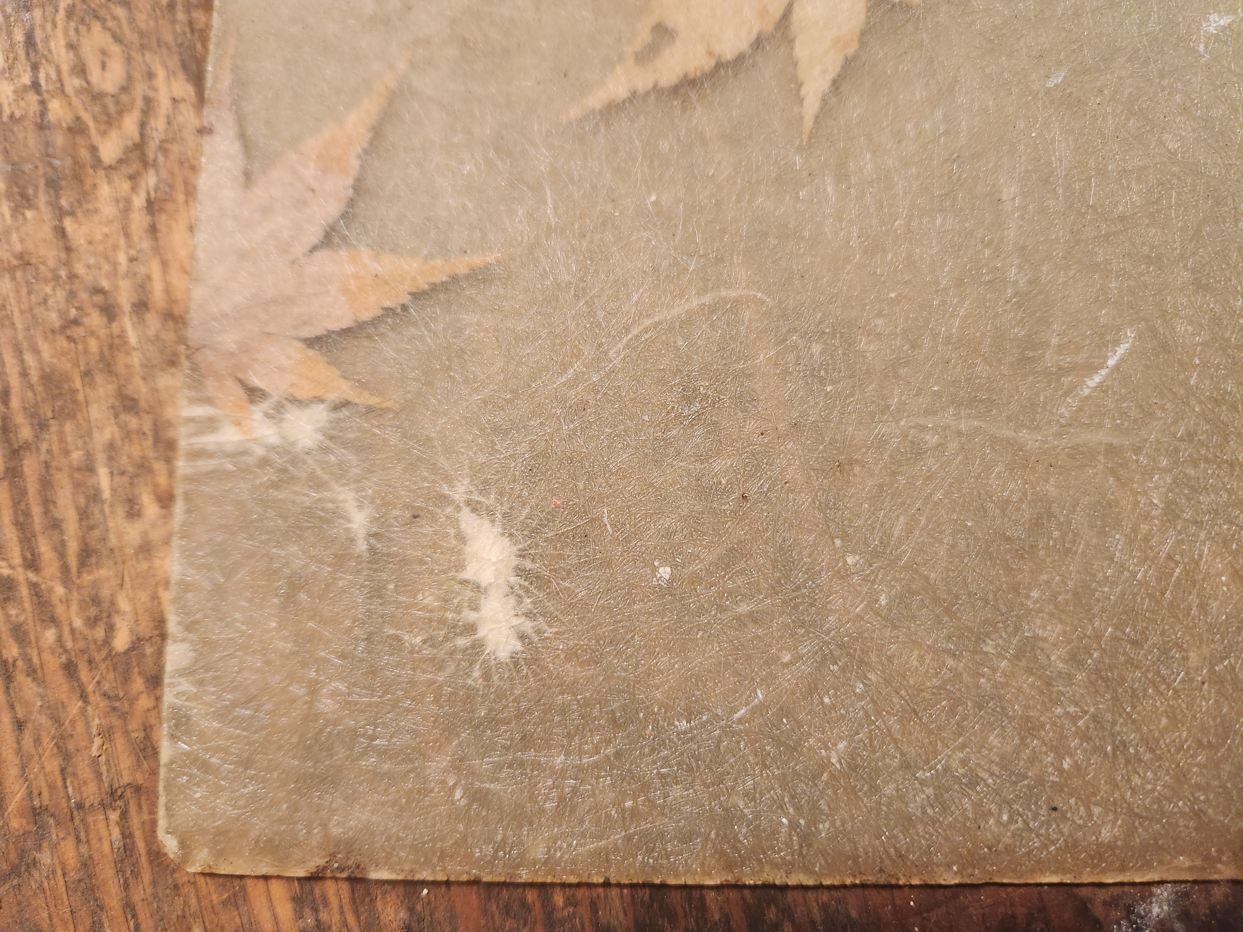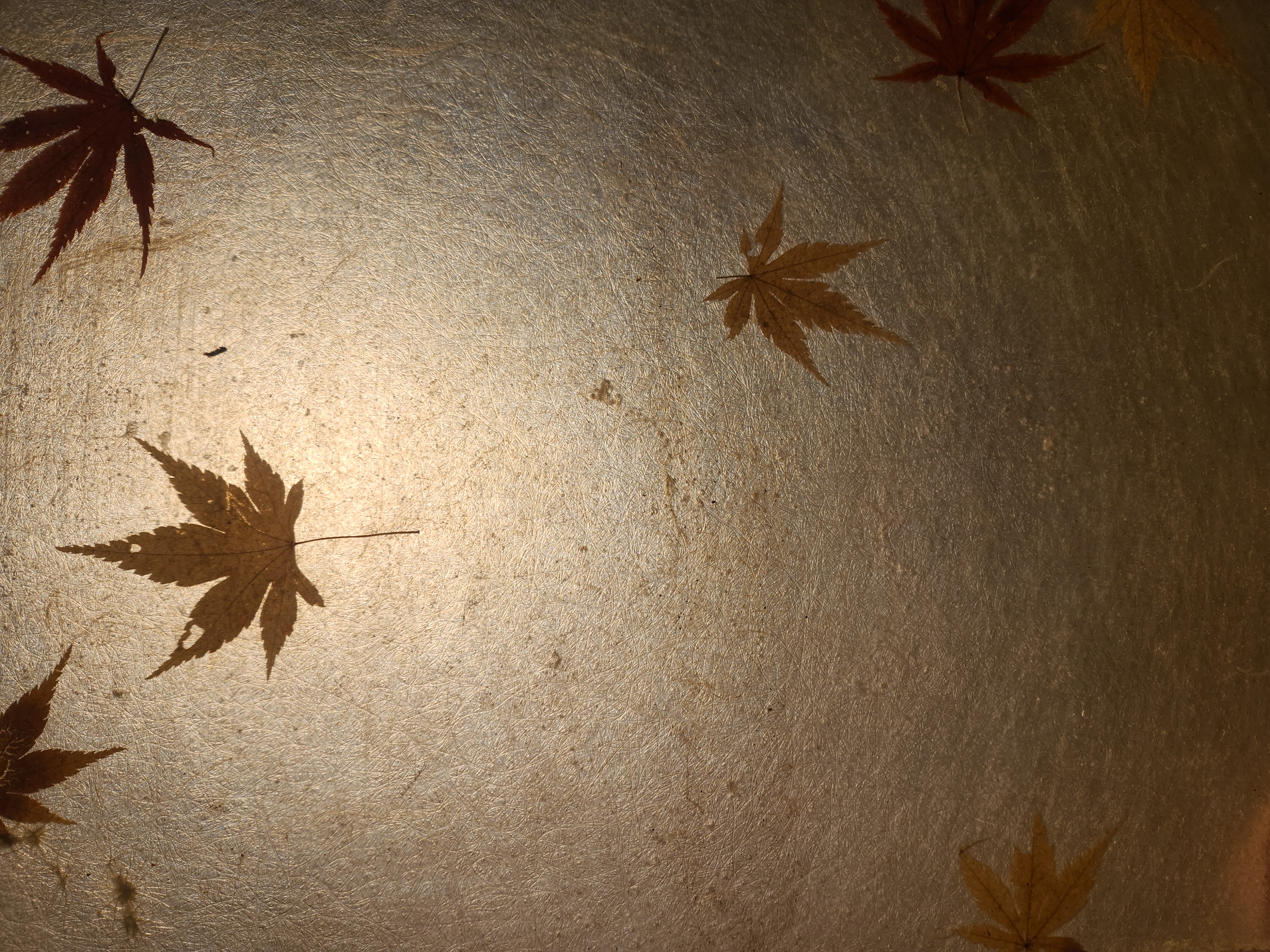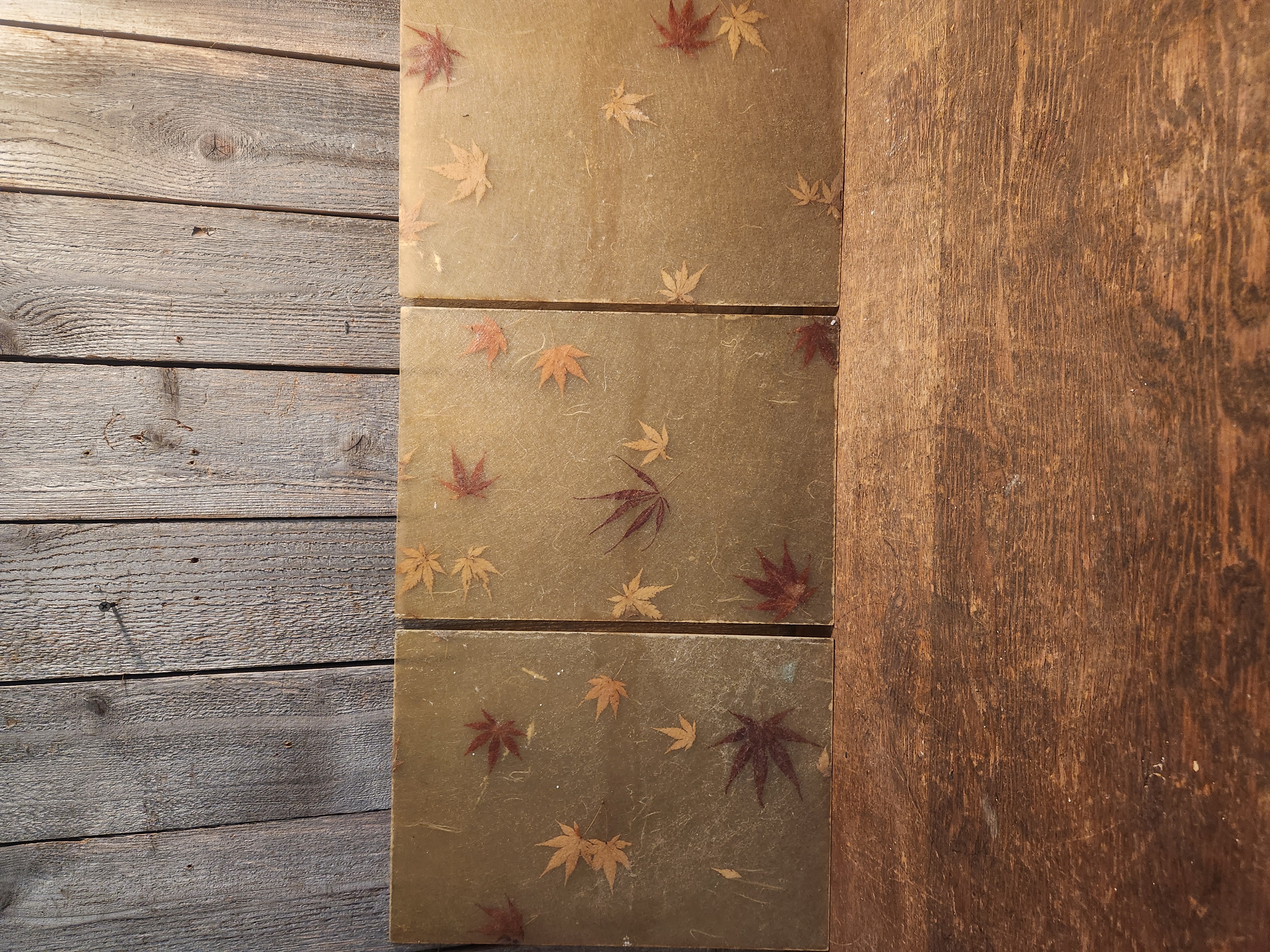 3 vintage panels made of a yellowed fiberglass material and maple leaves. They are in fair condition with some minor wear and scratches. They look very nice with light filtering through. They each measure 10.625 x 15.