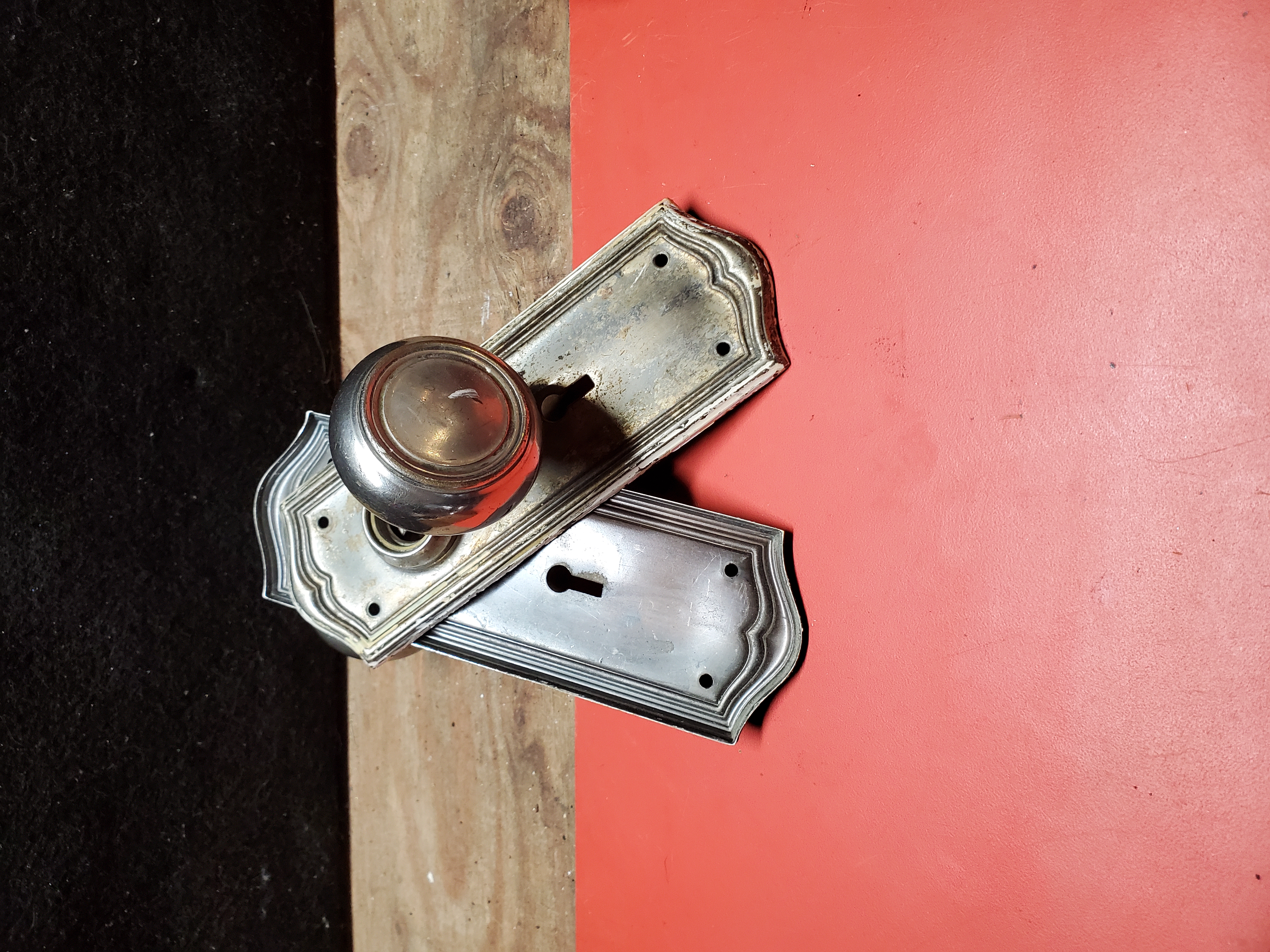 This vintage victorian style door knob set is in good condition. It is a little beat up but is still functional and beautiful.