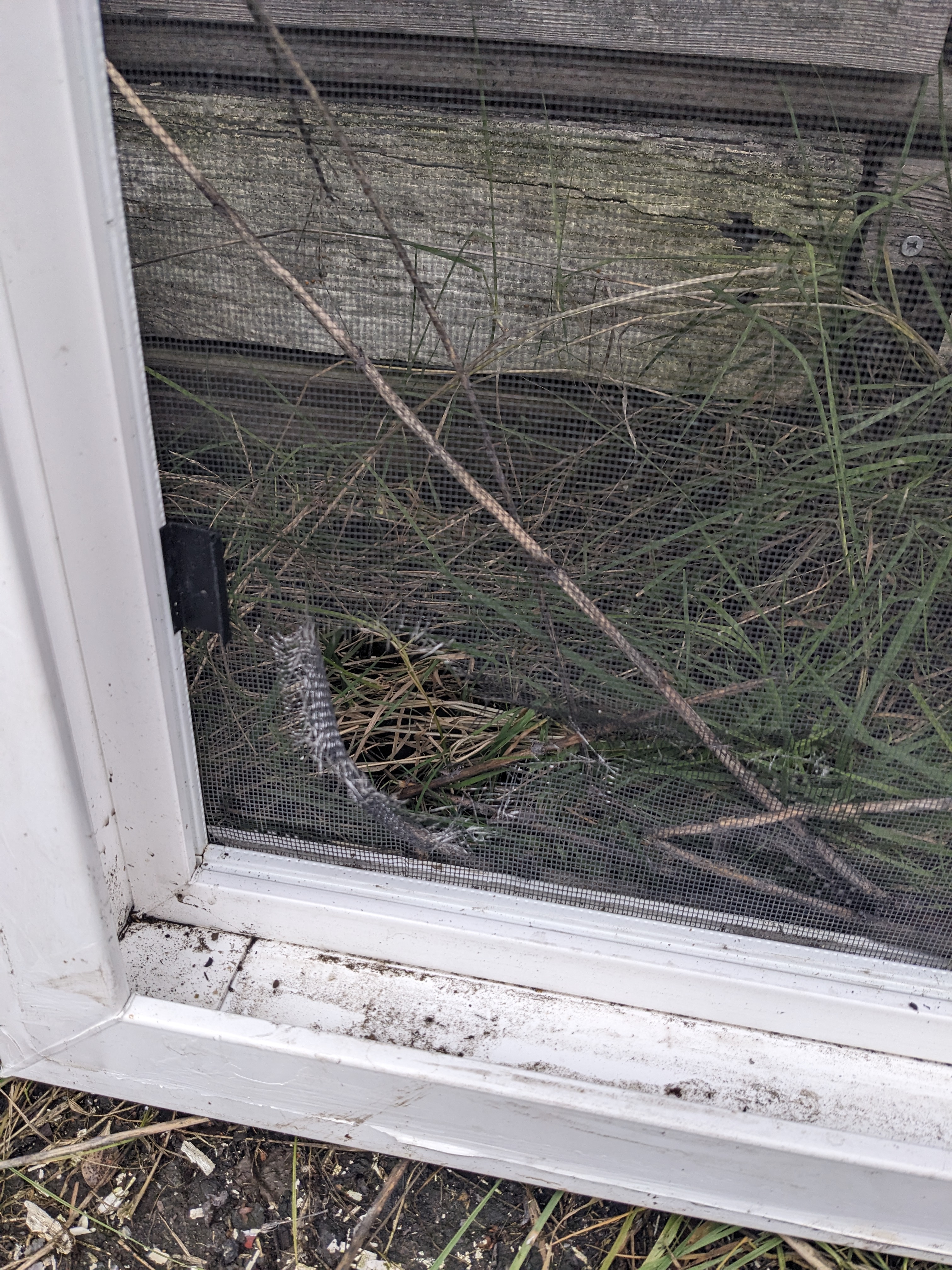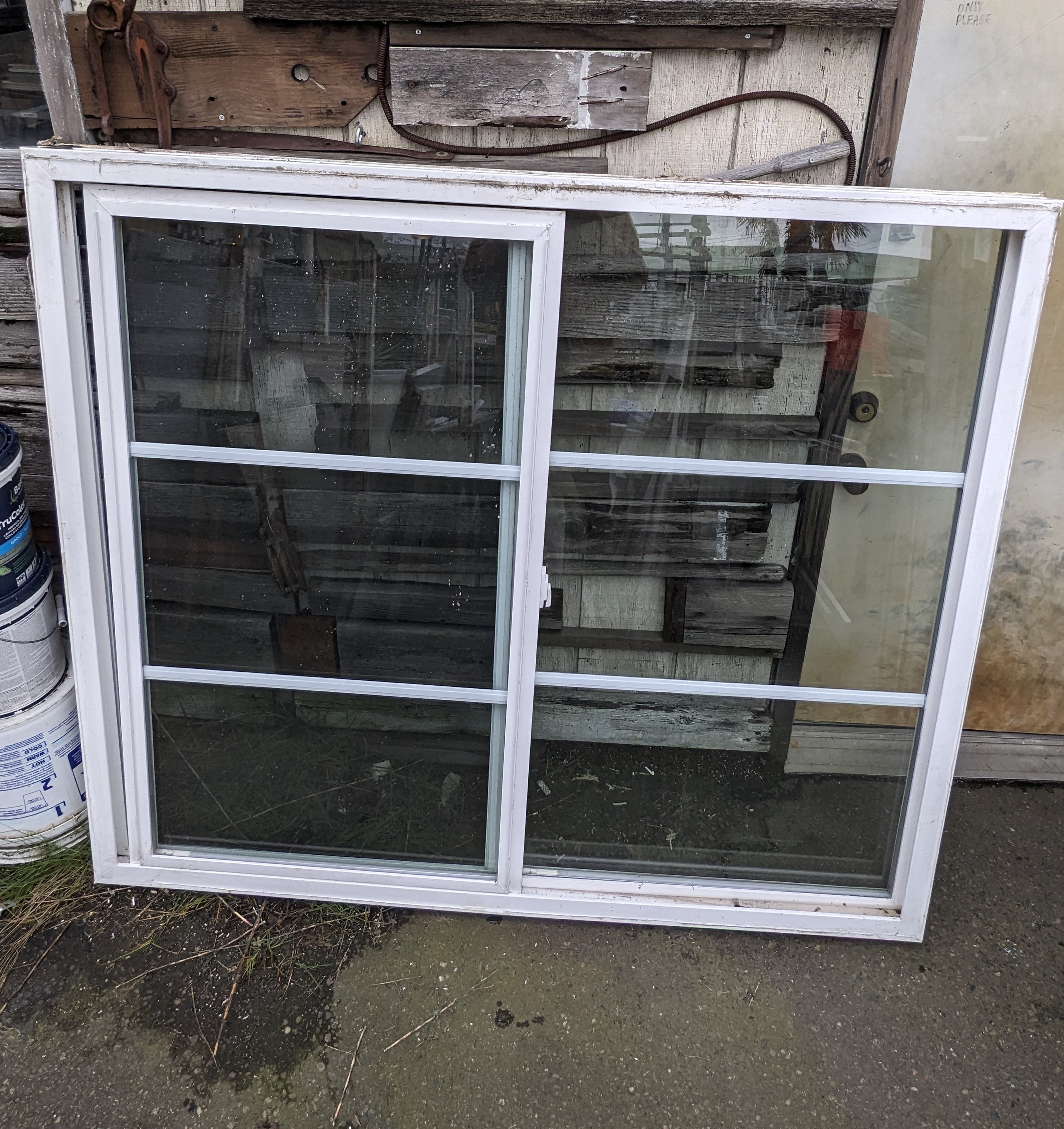 Large operable vinyl window. White on the interior and exterior. Please note a medium sized hole at the bottom of the screen (pictured). Caulking/sealant from previous installation is also present.