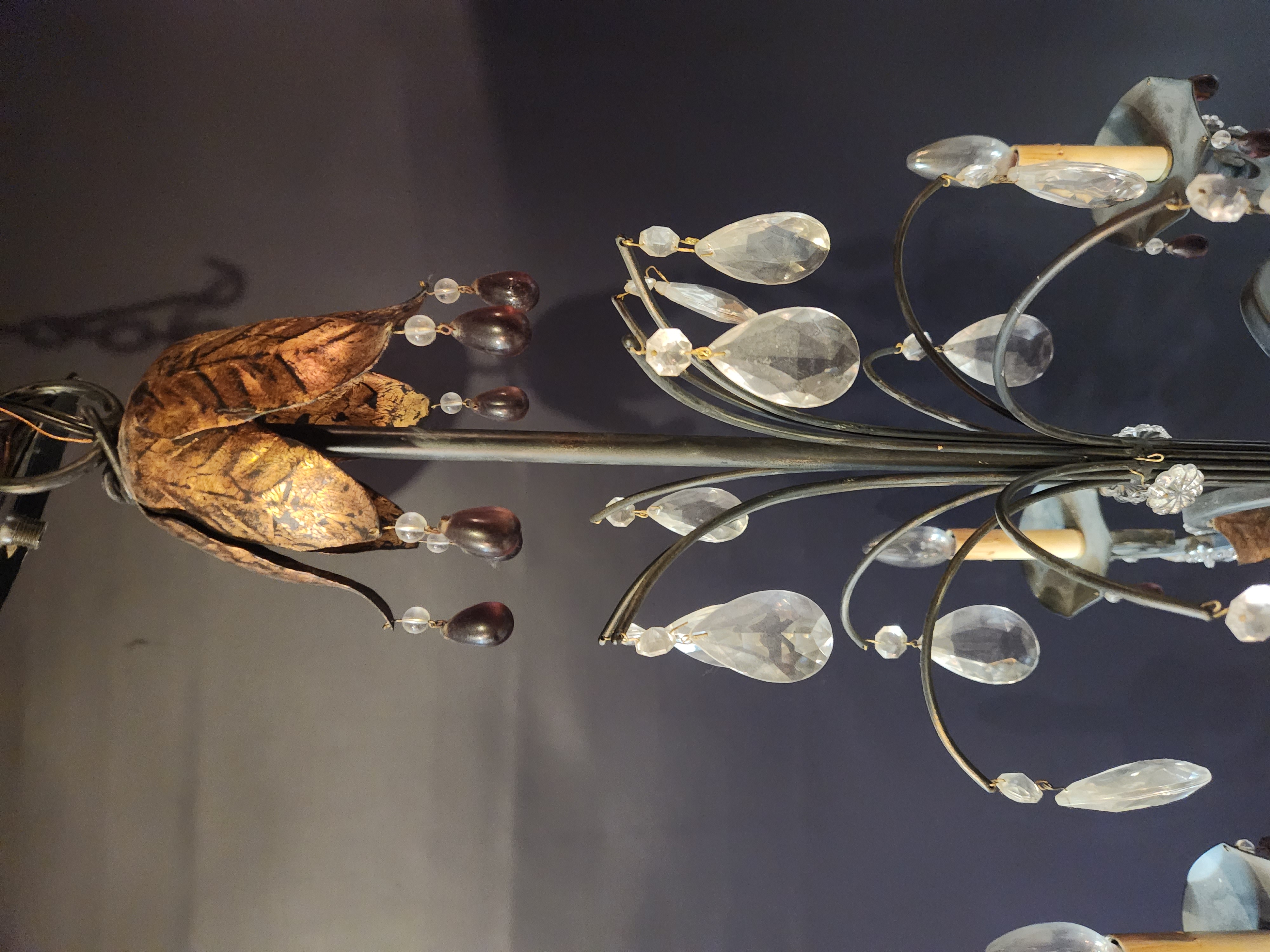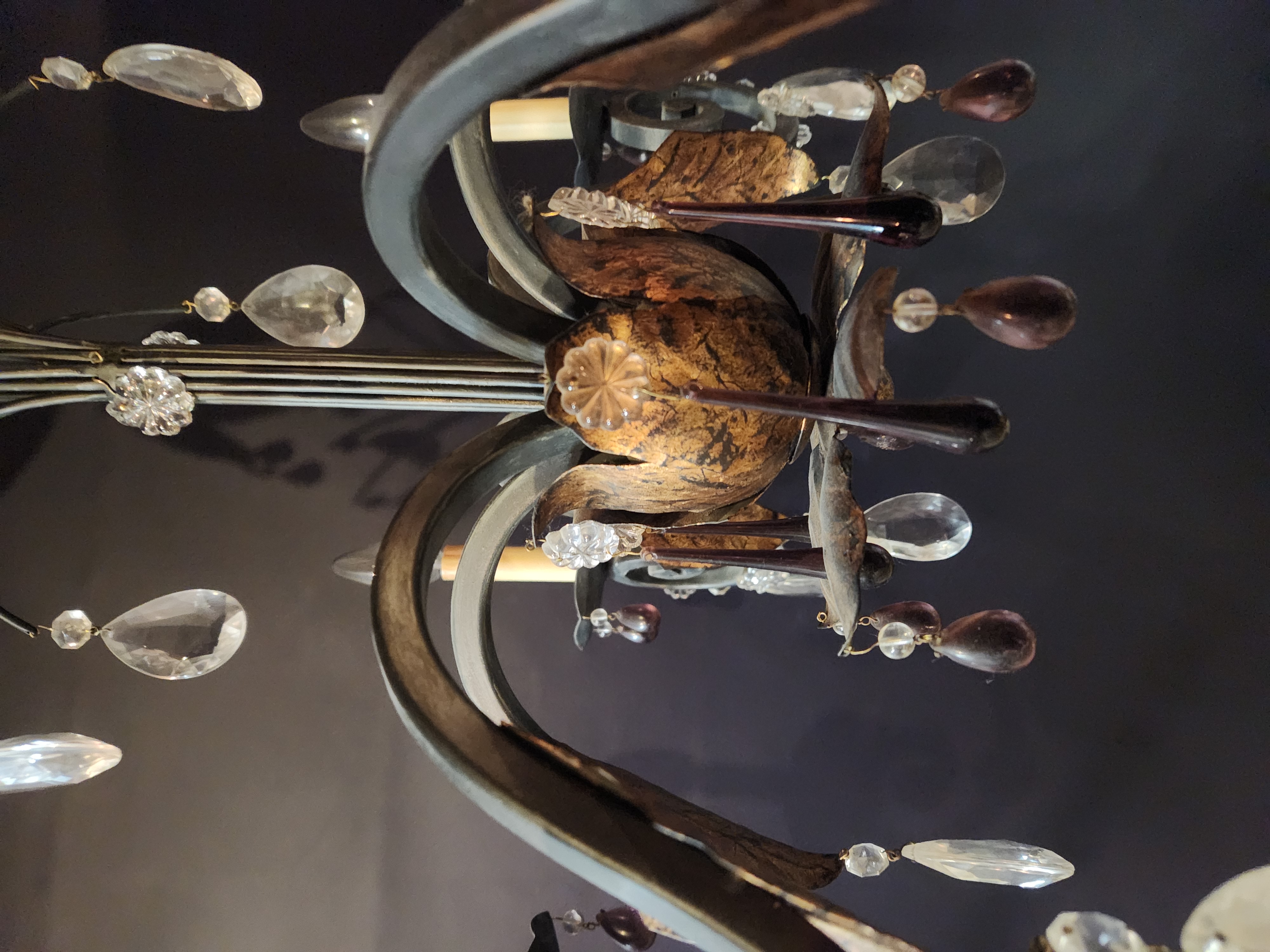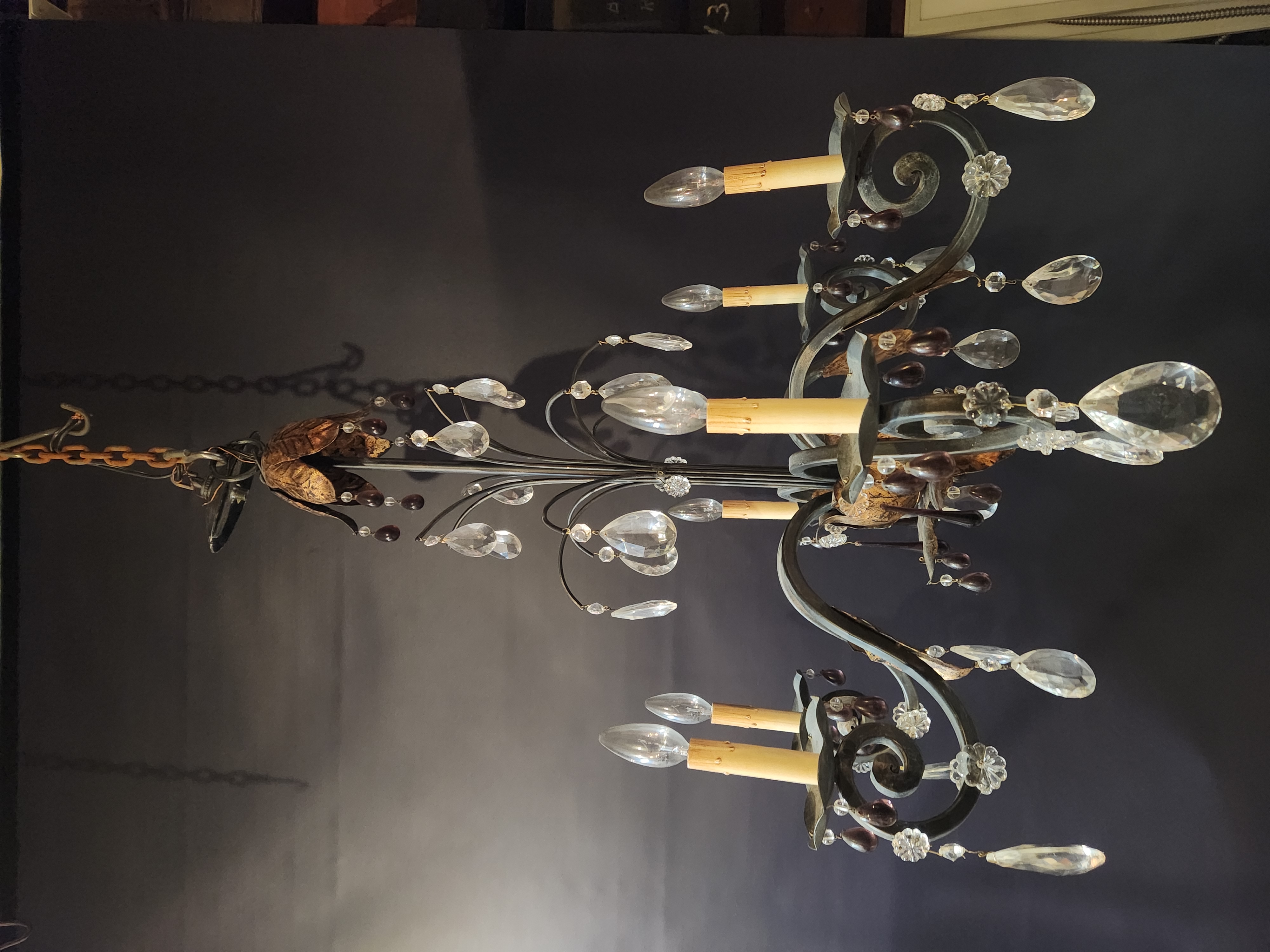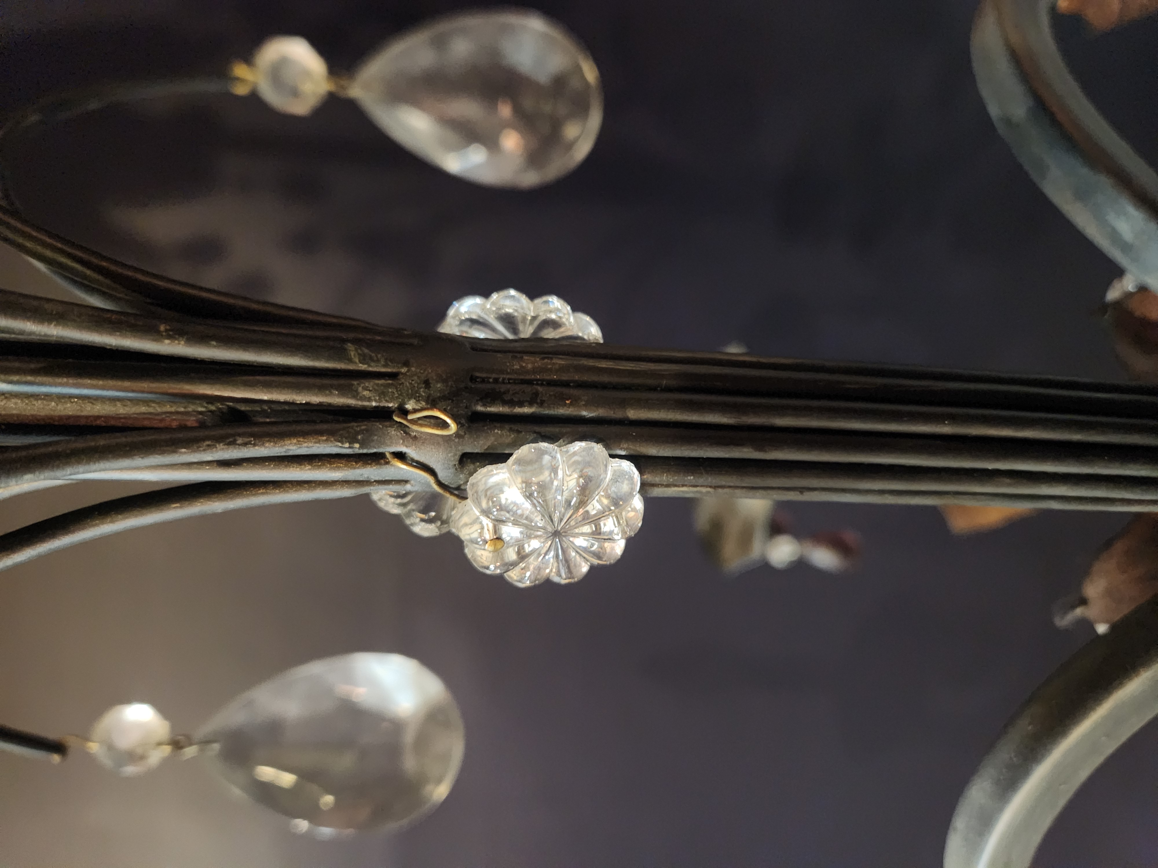 Large, contemporary wrought iron 6 arm chandelier with crystals and glass grapes. It has all of its hanging crystals, but is missing a glass flower on the body. It is in relatively good condition, though it may need another dusting. Measures 26 x 30.