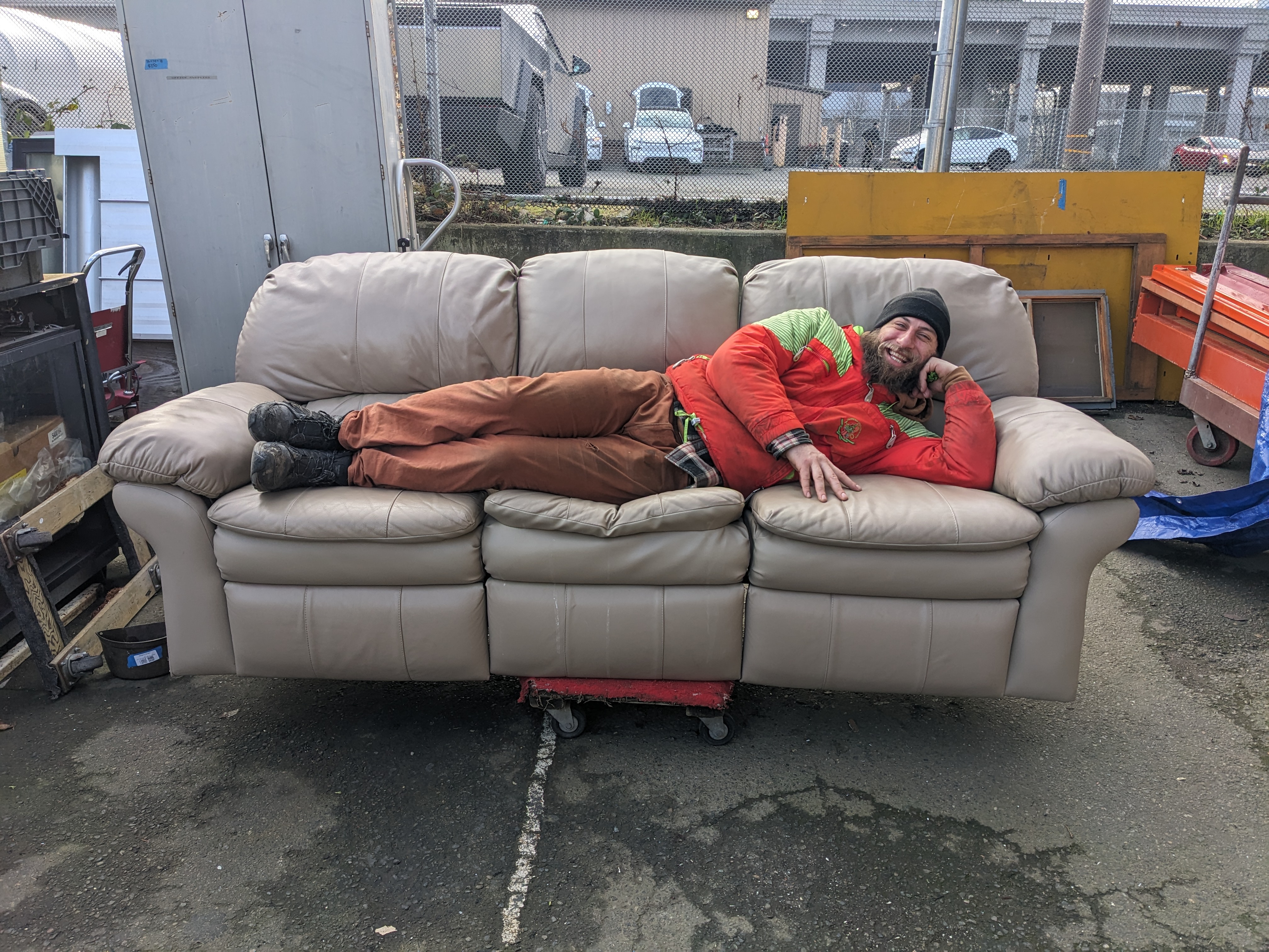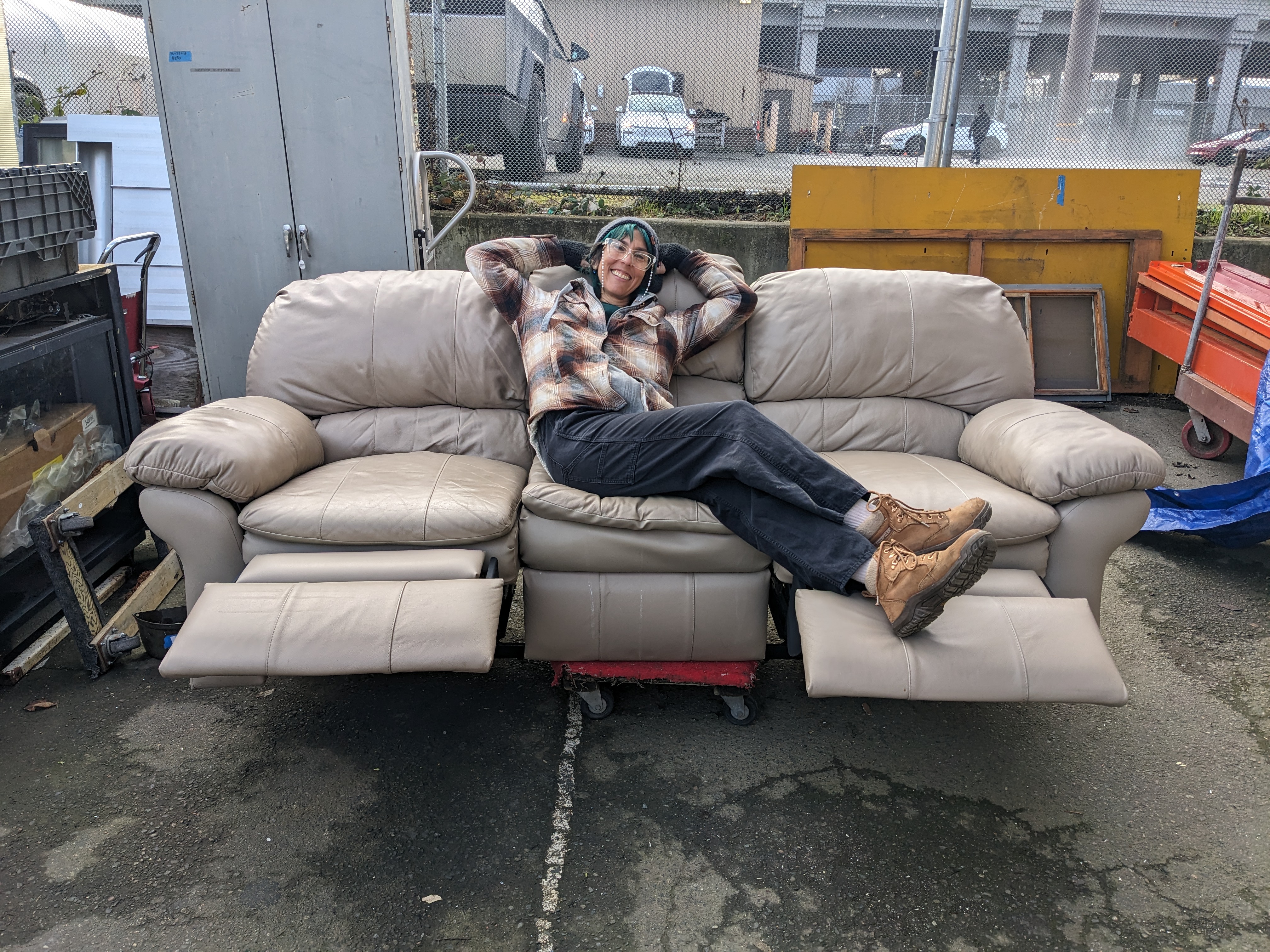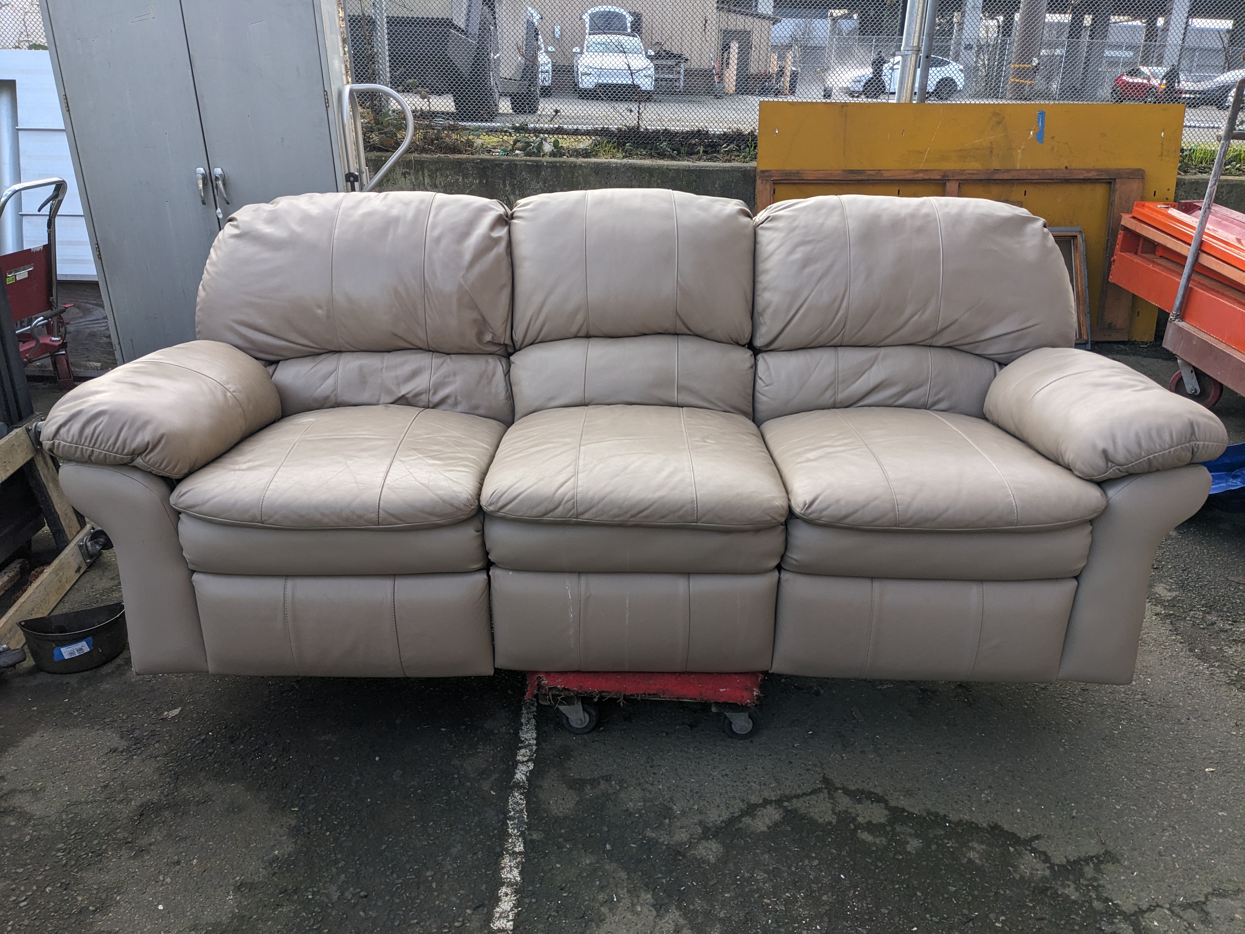 This leather couch is super comfy and in great shape! Dual recliners on the outside seats both function and the leather is in great shape. Priced to sell! (Earthwise employees not included)