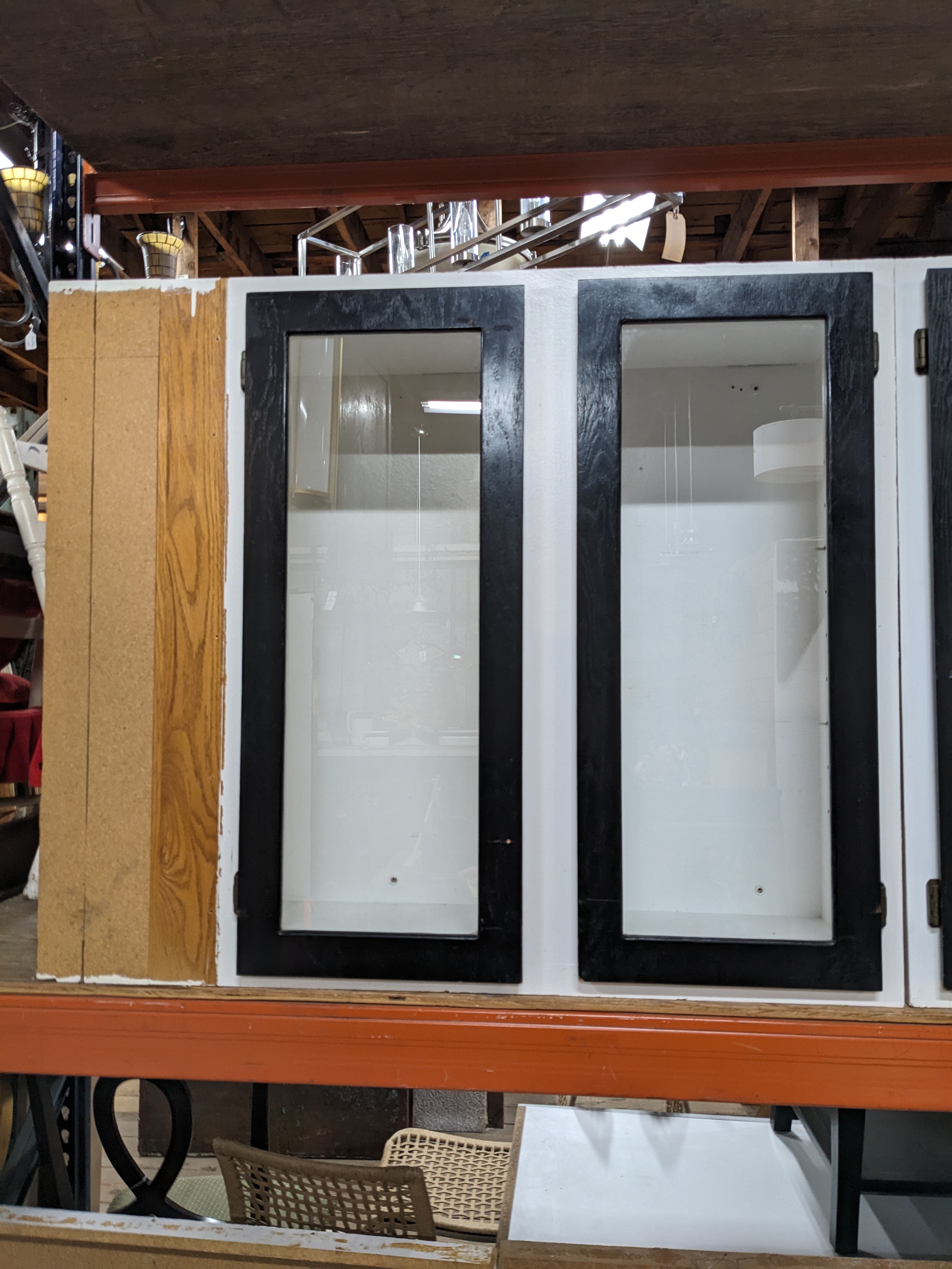 A large wall mounted kitchen cabinet. It's in good condition, though it's been installed before. It measures 42.50 x 35.75 x 12.25 inches.