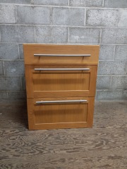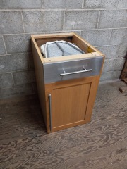 A base kitchen cabinet with cutting board. It's in good condition, though it's been installed before. It measures 21 x 31.75 x 24 inches.