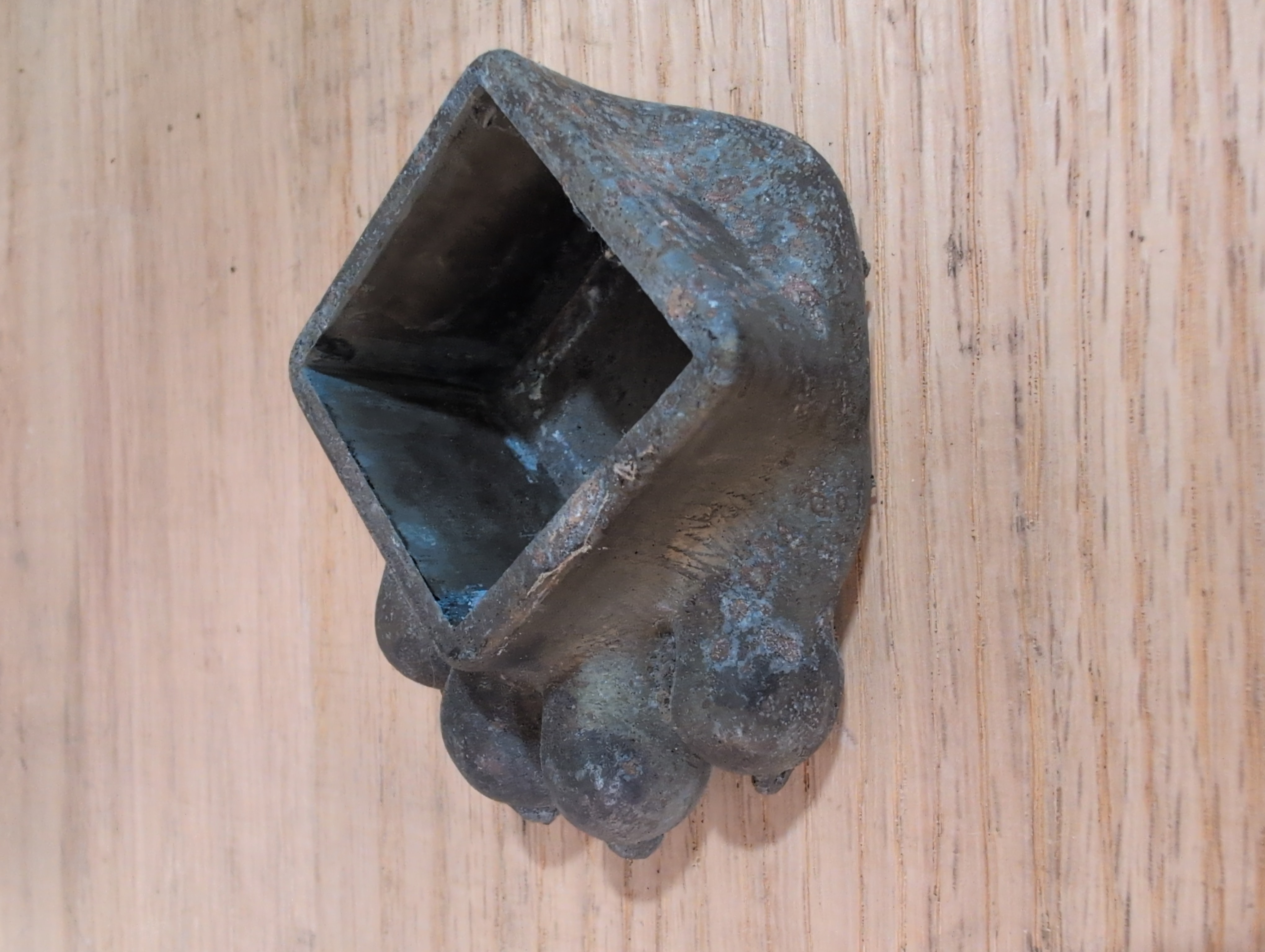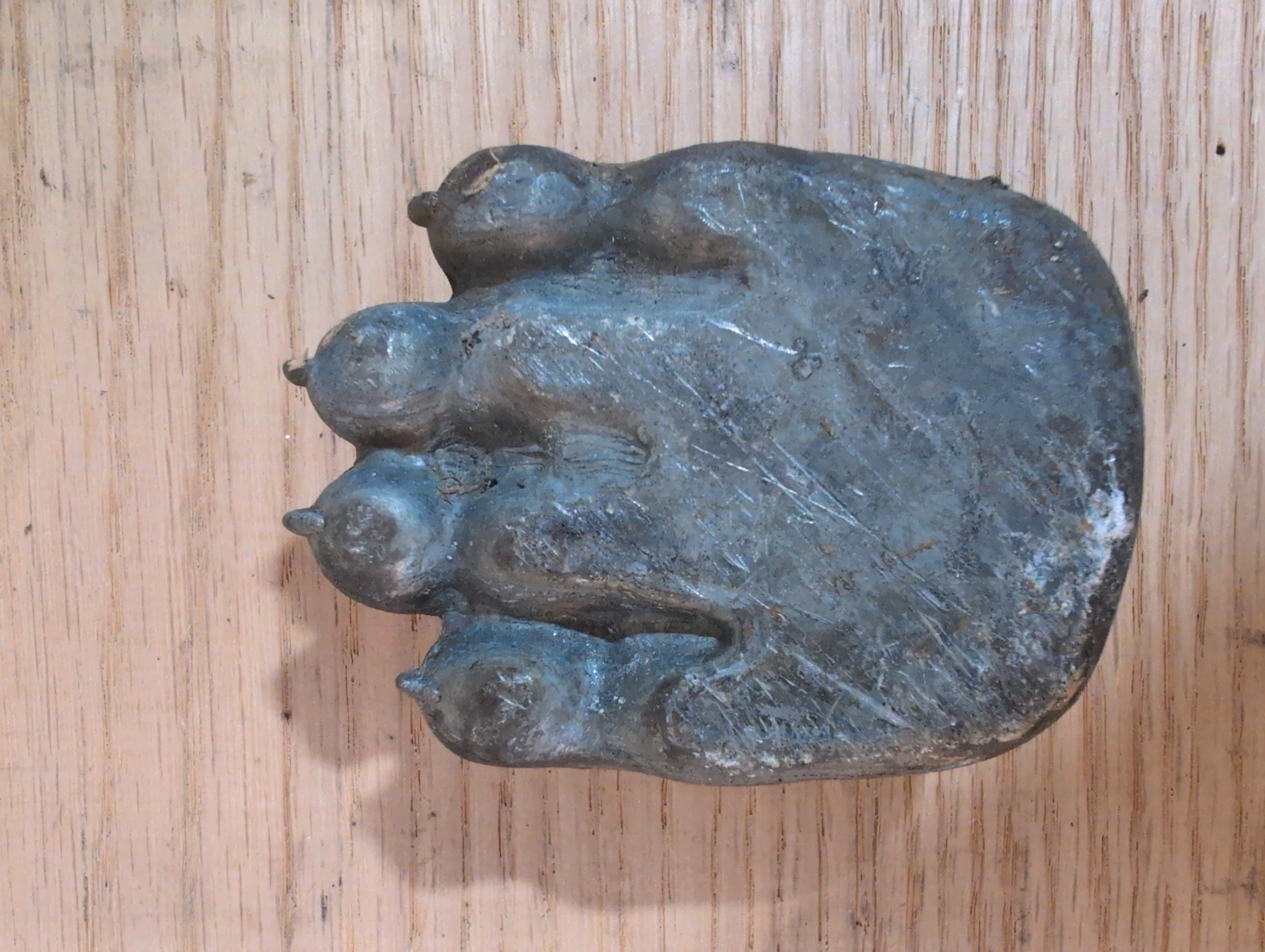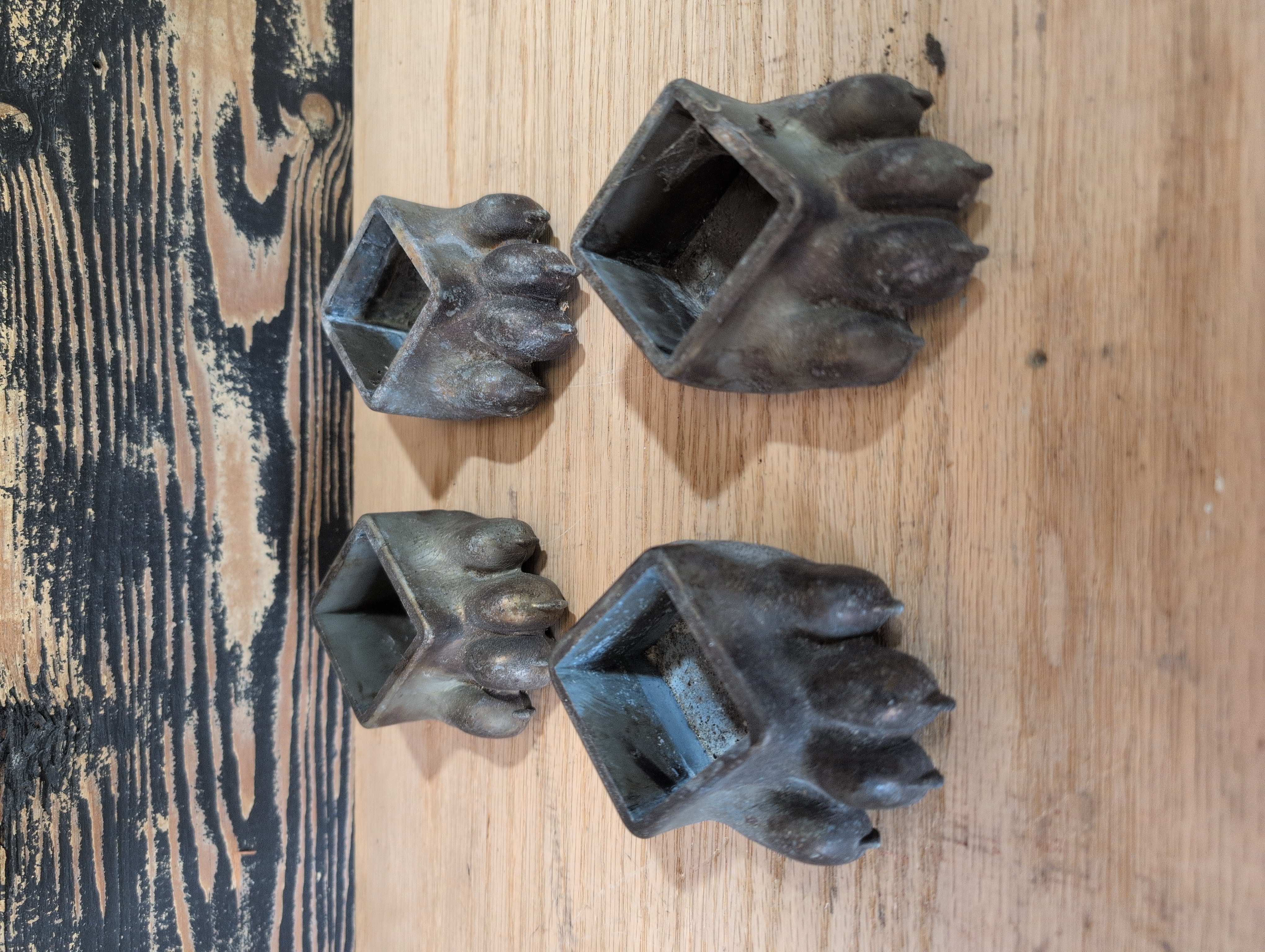 Set of four cast iron bear paw-shaped claw feet designed to fit a Fisher wood stove. Add a sturdy touch to your own stove or repurpose them to hold something else. Meant for indoor use, these have minor scratches and wear marks.