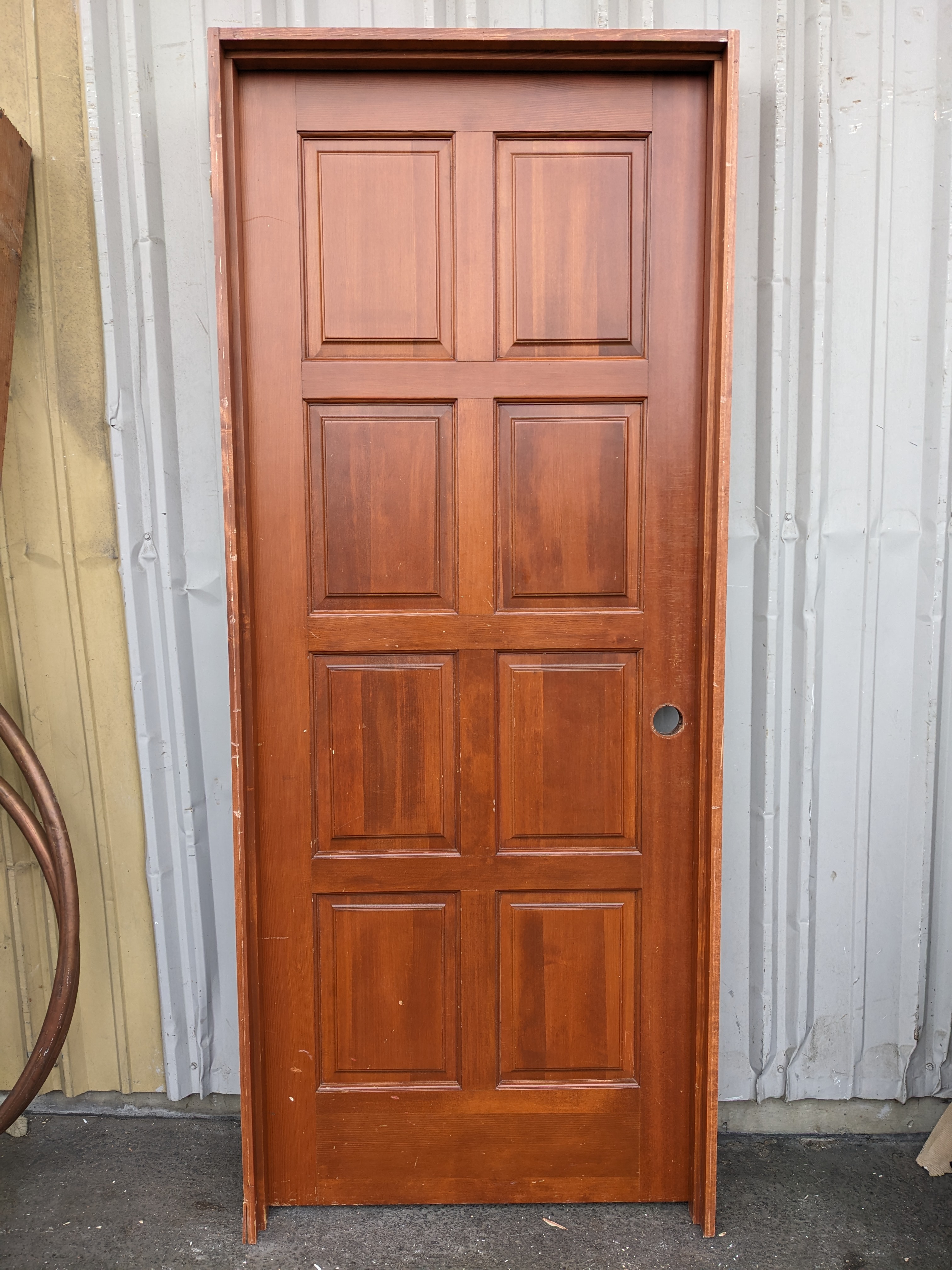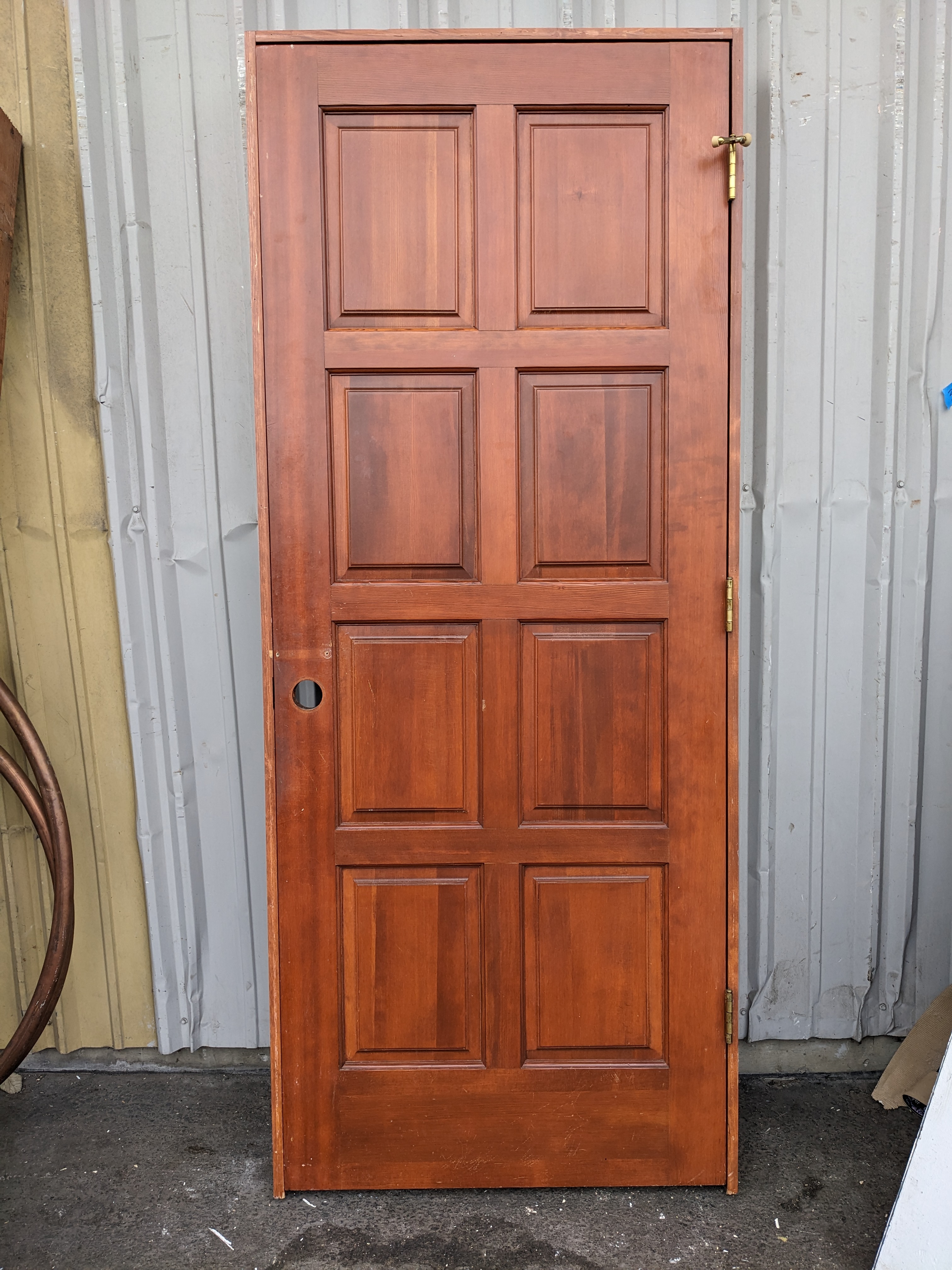 This CVG Fir door comes pre hung and measures 33.5 x 81.5 x 4.5. It is in good condition. Left Hand.
