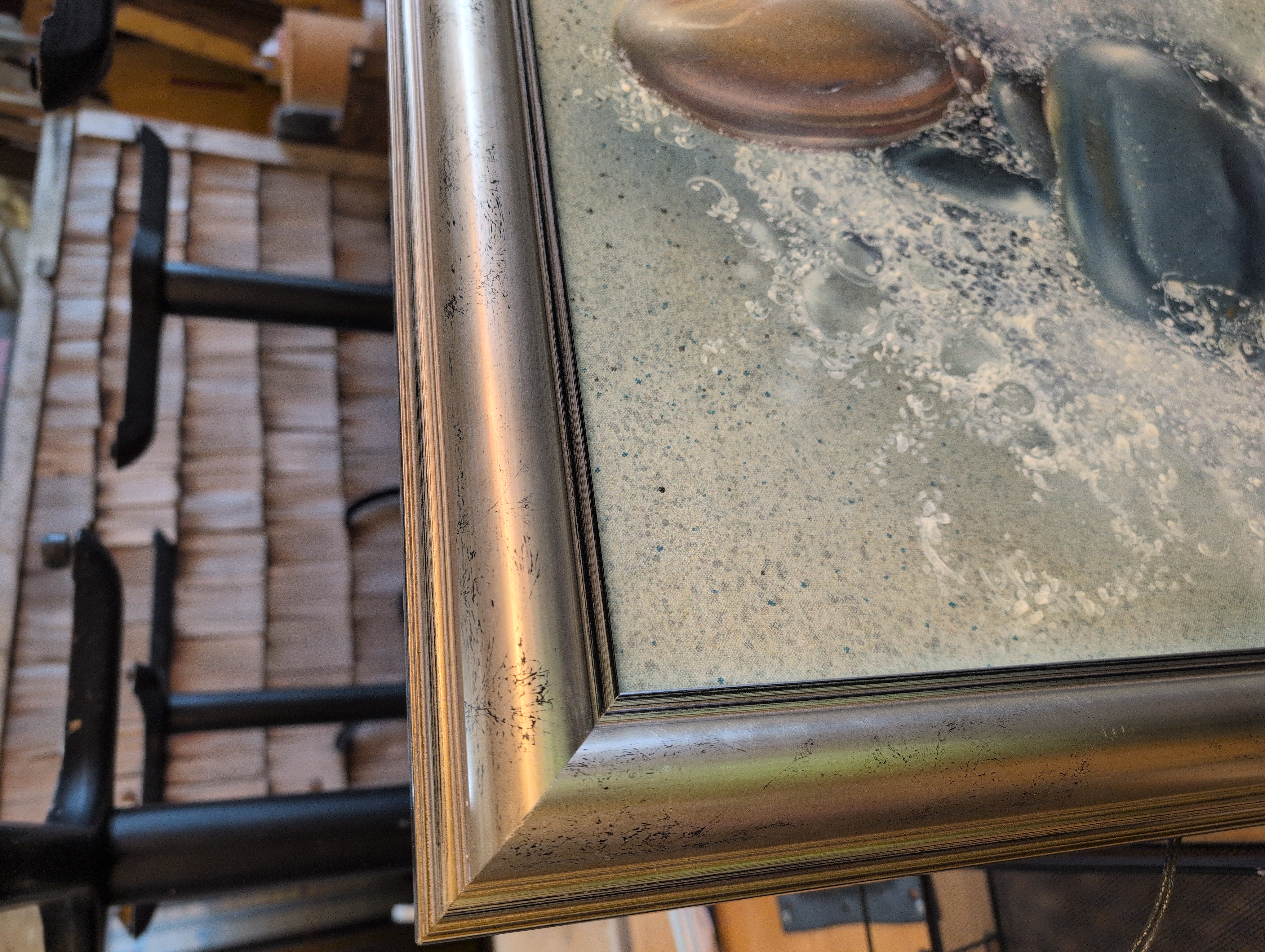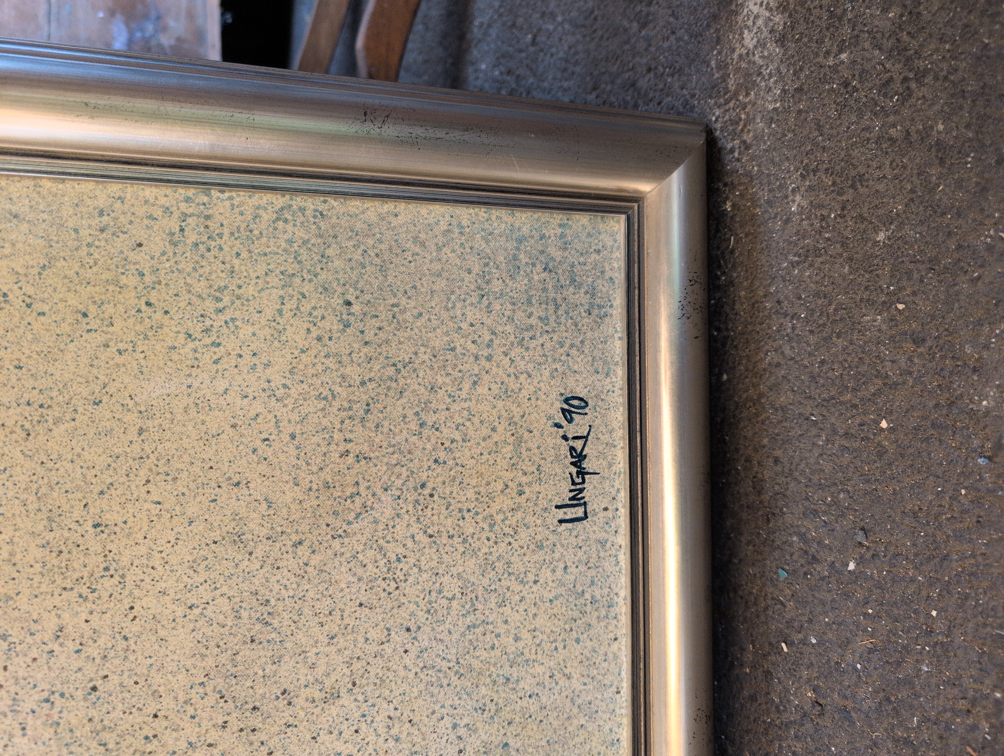 Framed oil on canvas painting of local artist Joseph Ungari's 1990 aptly named "Sand and Rocks." Has two hanging loops for wall mounting.