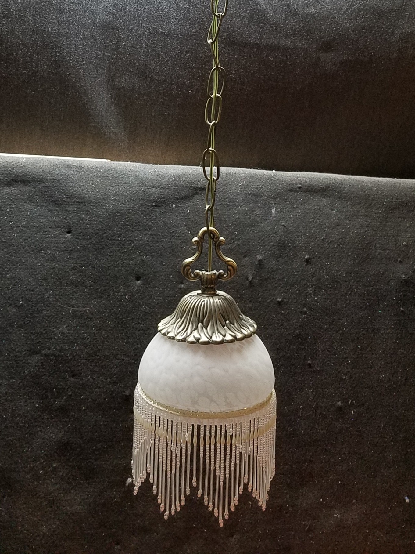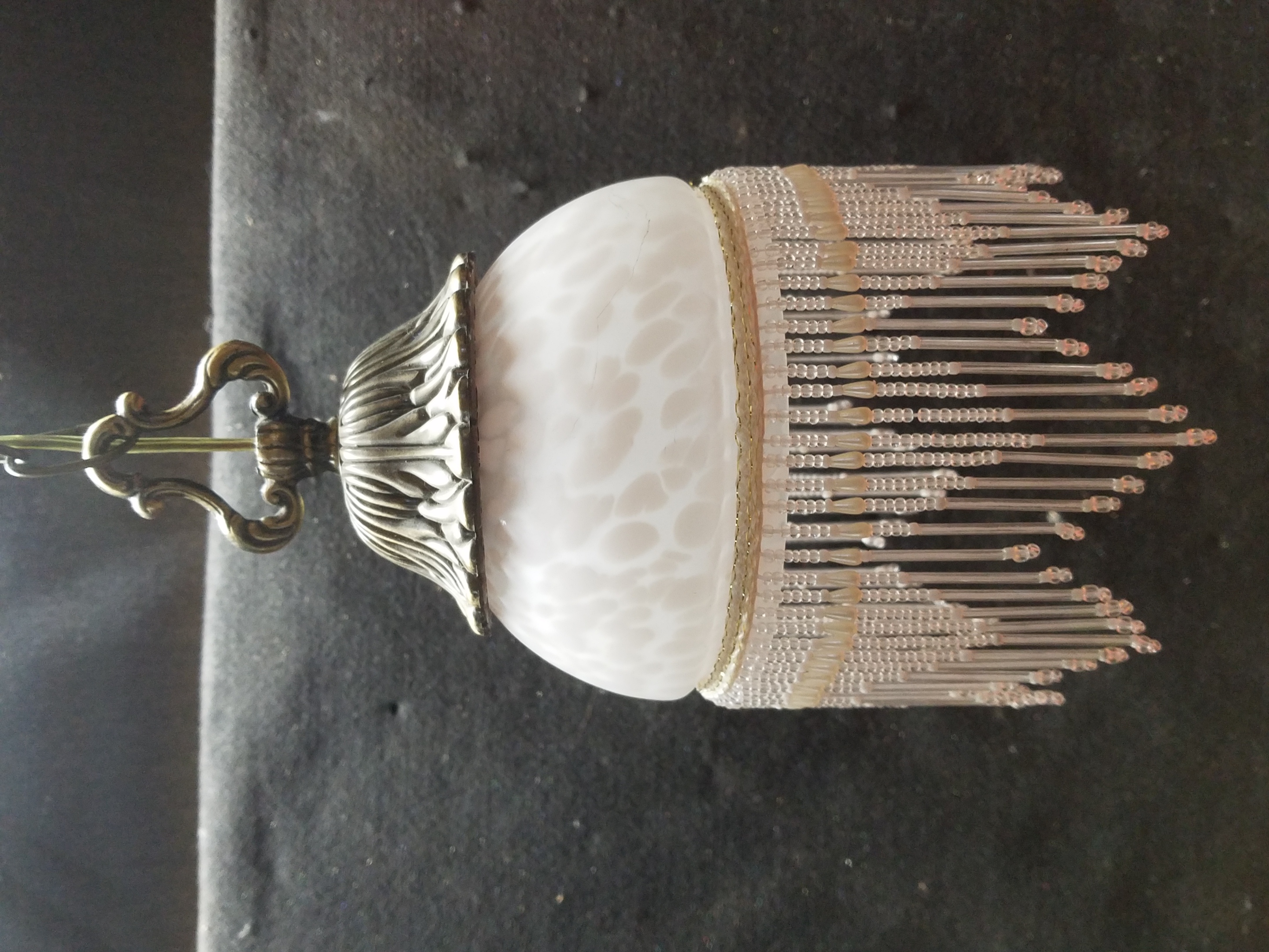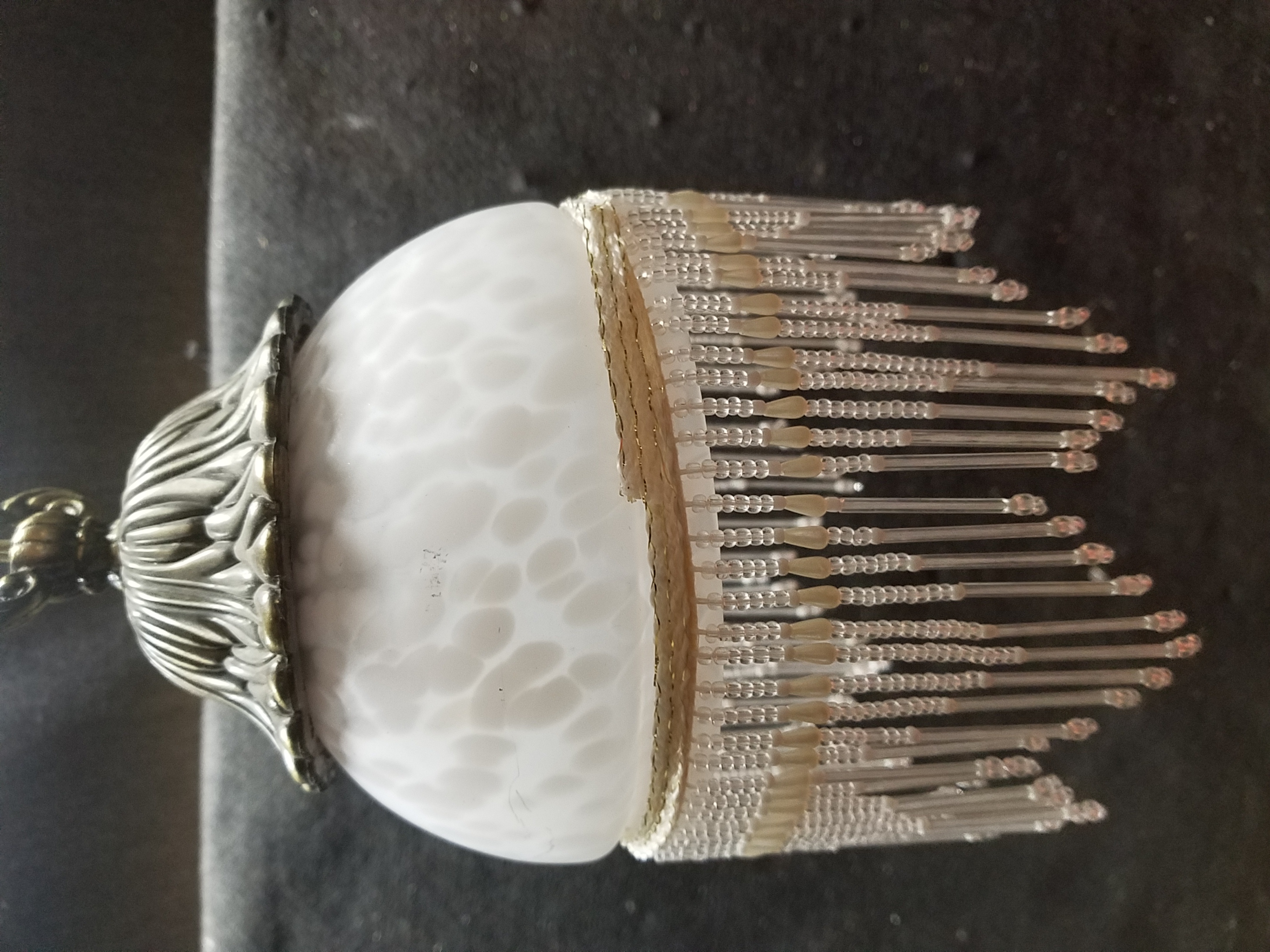 This light has steel fixture with an antique brass finish and styled with a creamy, opaque tortoiseshell shade rimmed with beaded fringe.