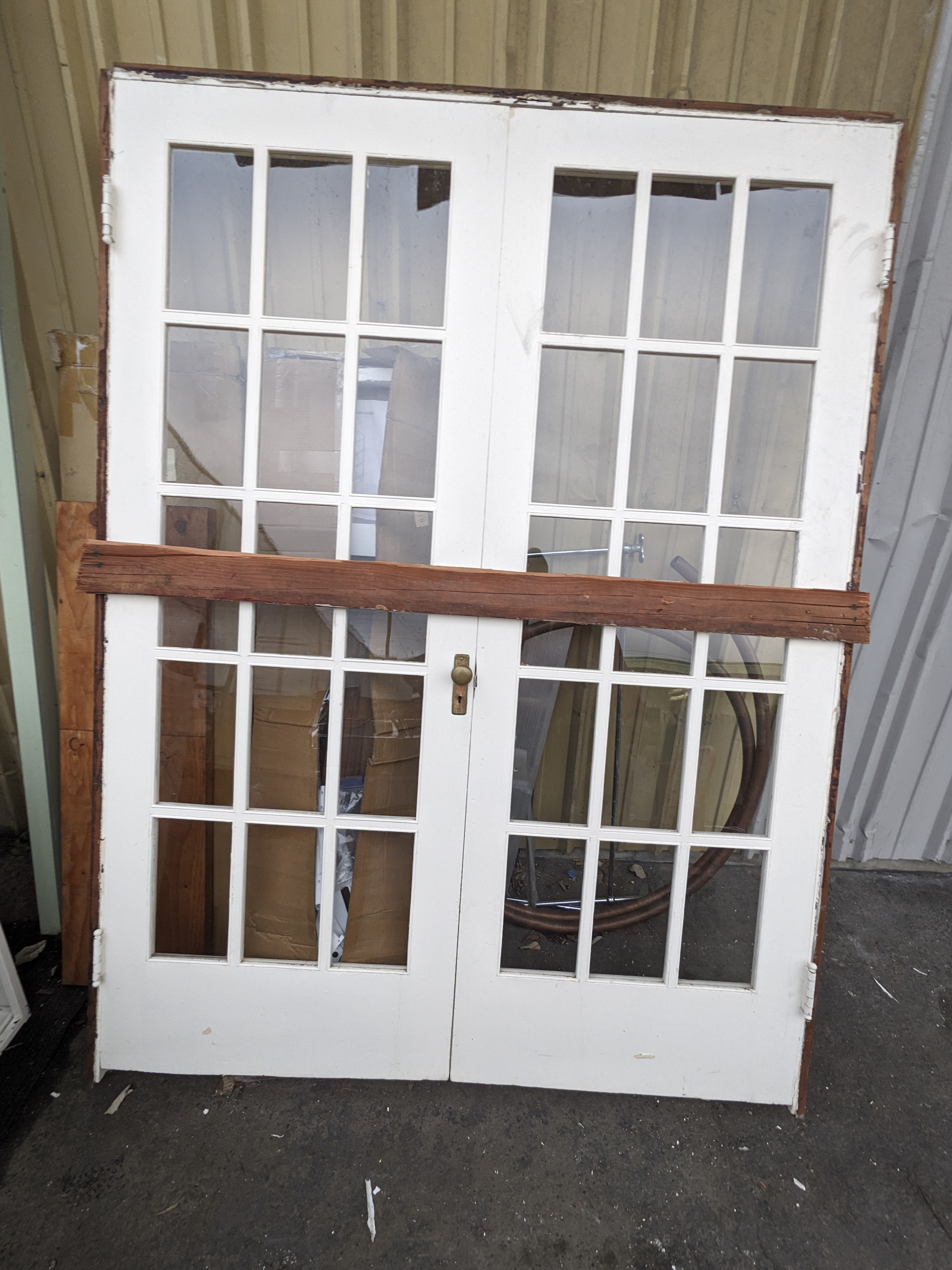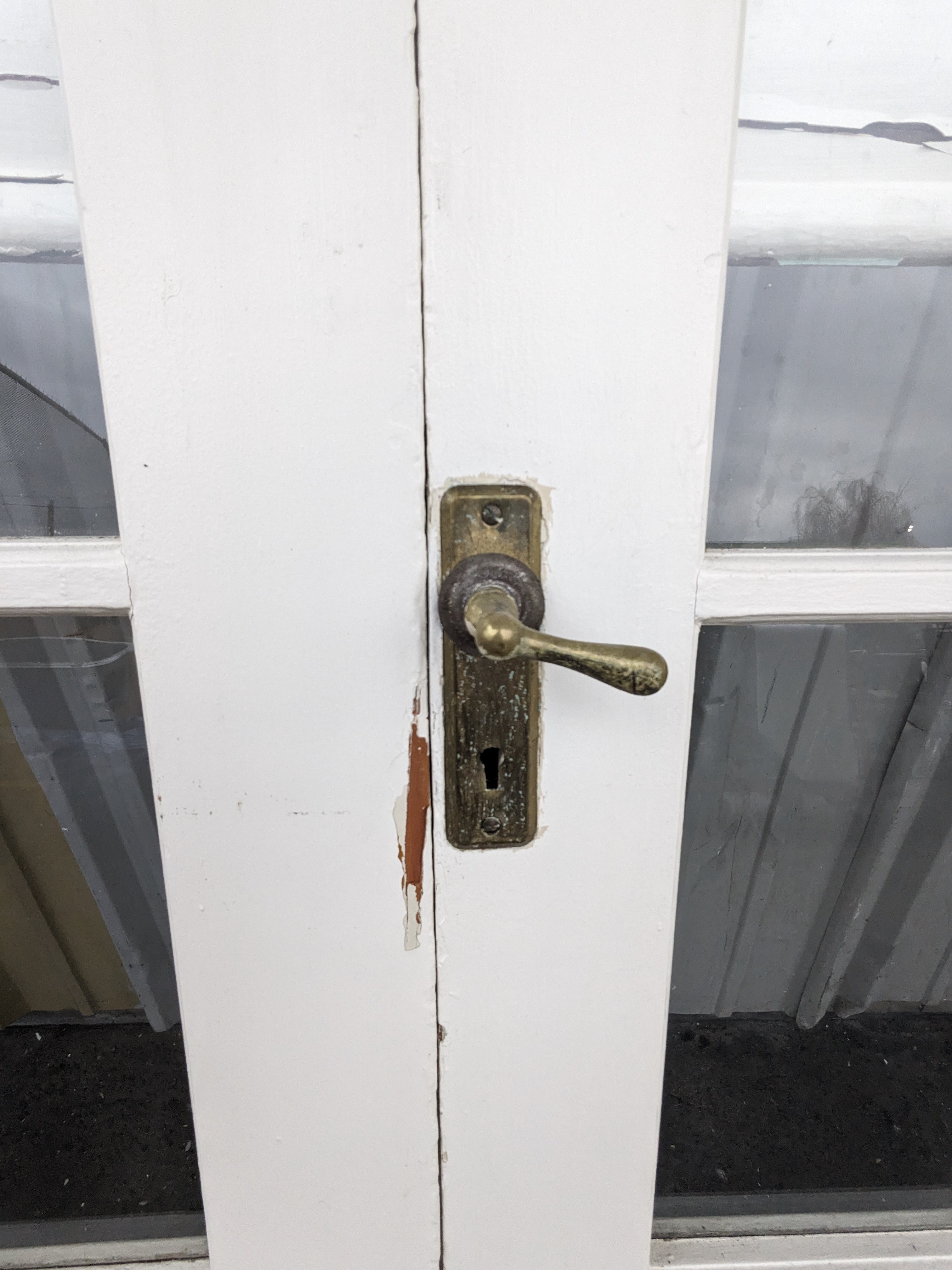 A great Full lite French door, perfect for letting that sunshine in or enjoying a rainy afternoon. In good condition, some paint chipping near the handle. In good condition otherwise.