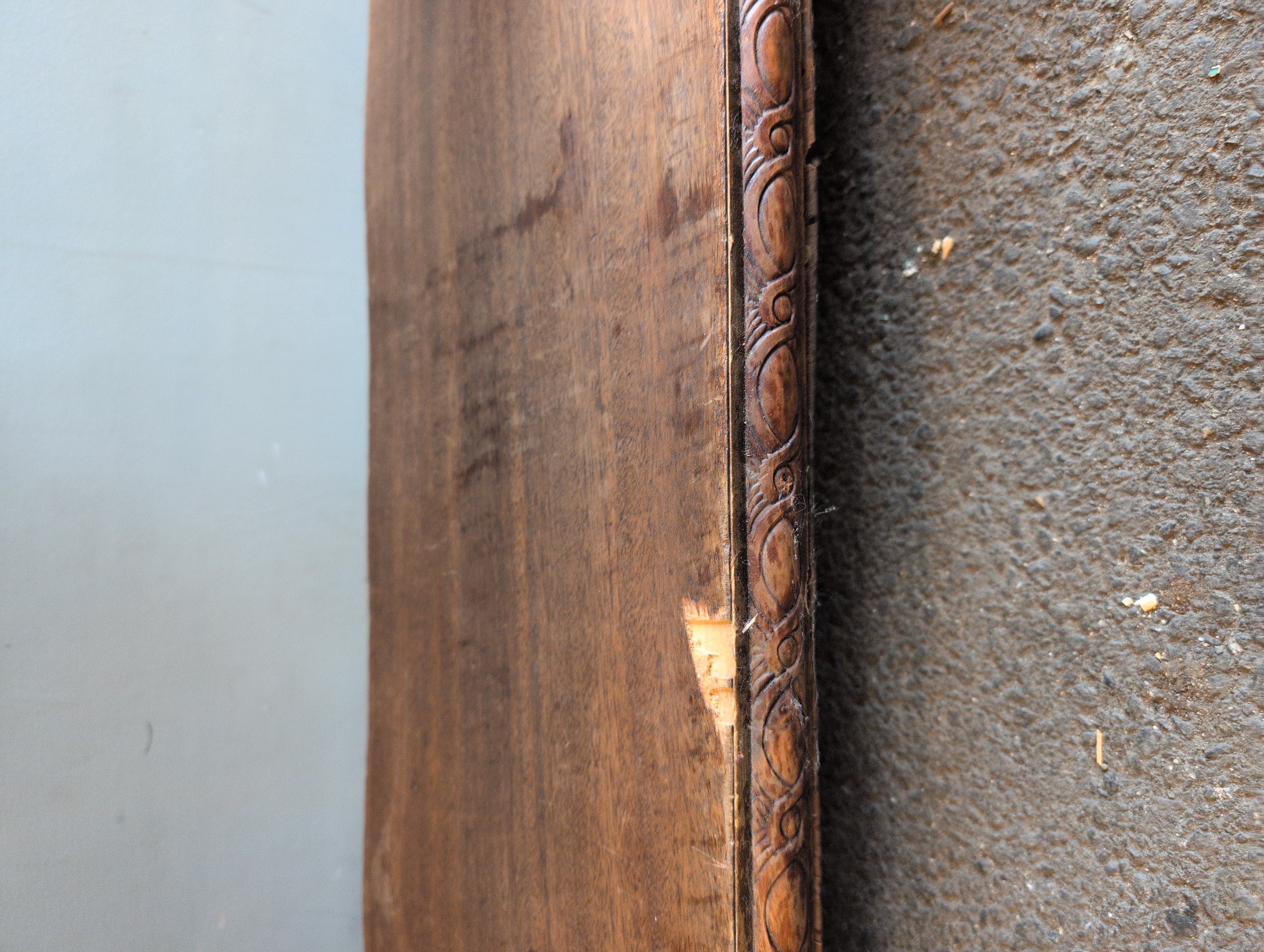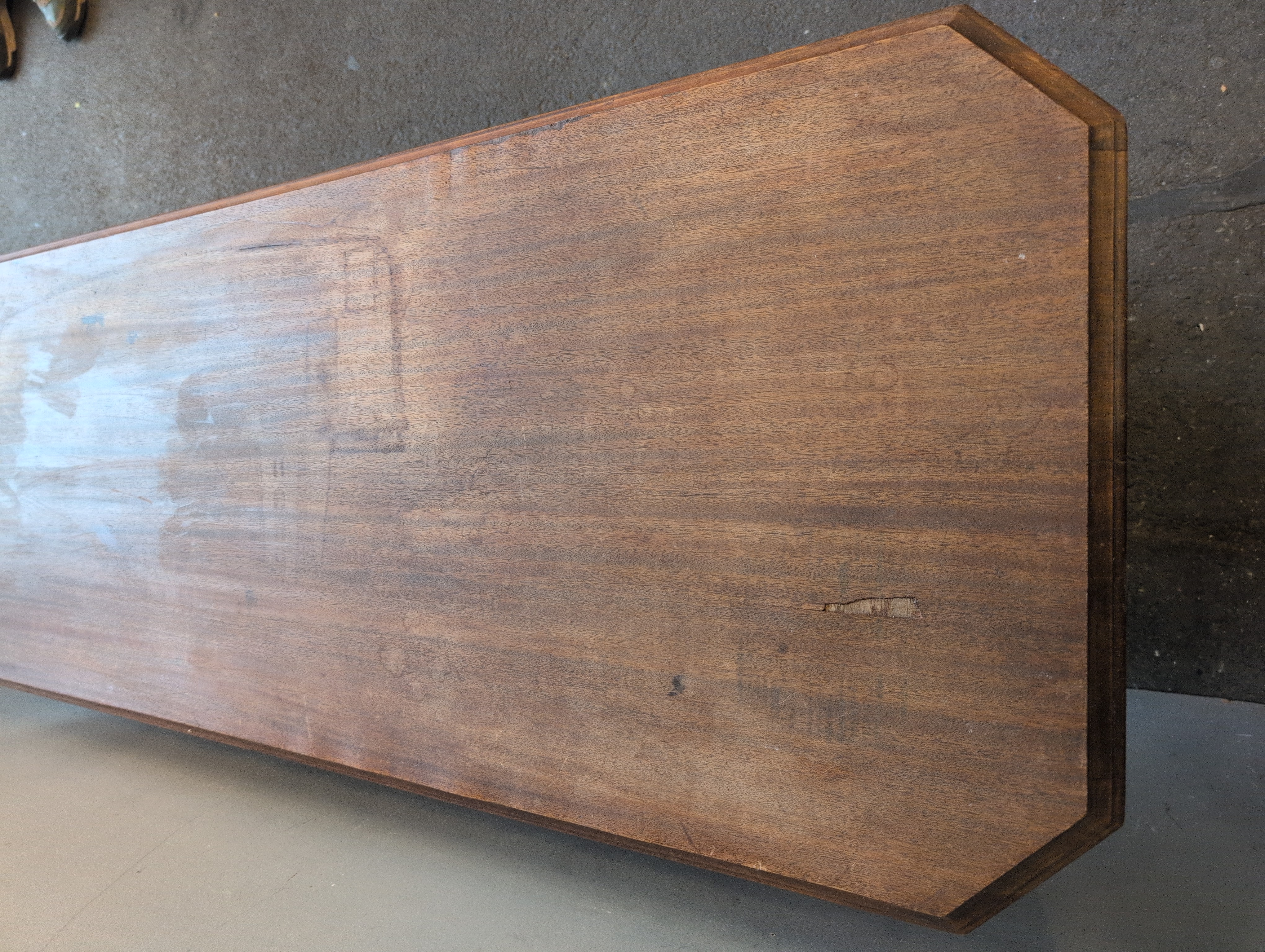 Vintage wood table with veneer finish. Would make a great console/entertainment center or entry, side, or behind the couch table. Has some missing chunks of veneer and a little warping on the bottom shelf. In addition the legs are a little wobbly but that should be fairly easy to fix or reinforce.