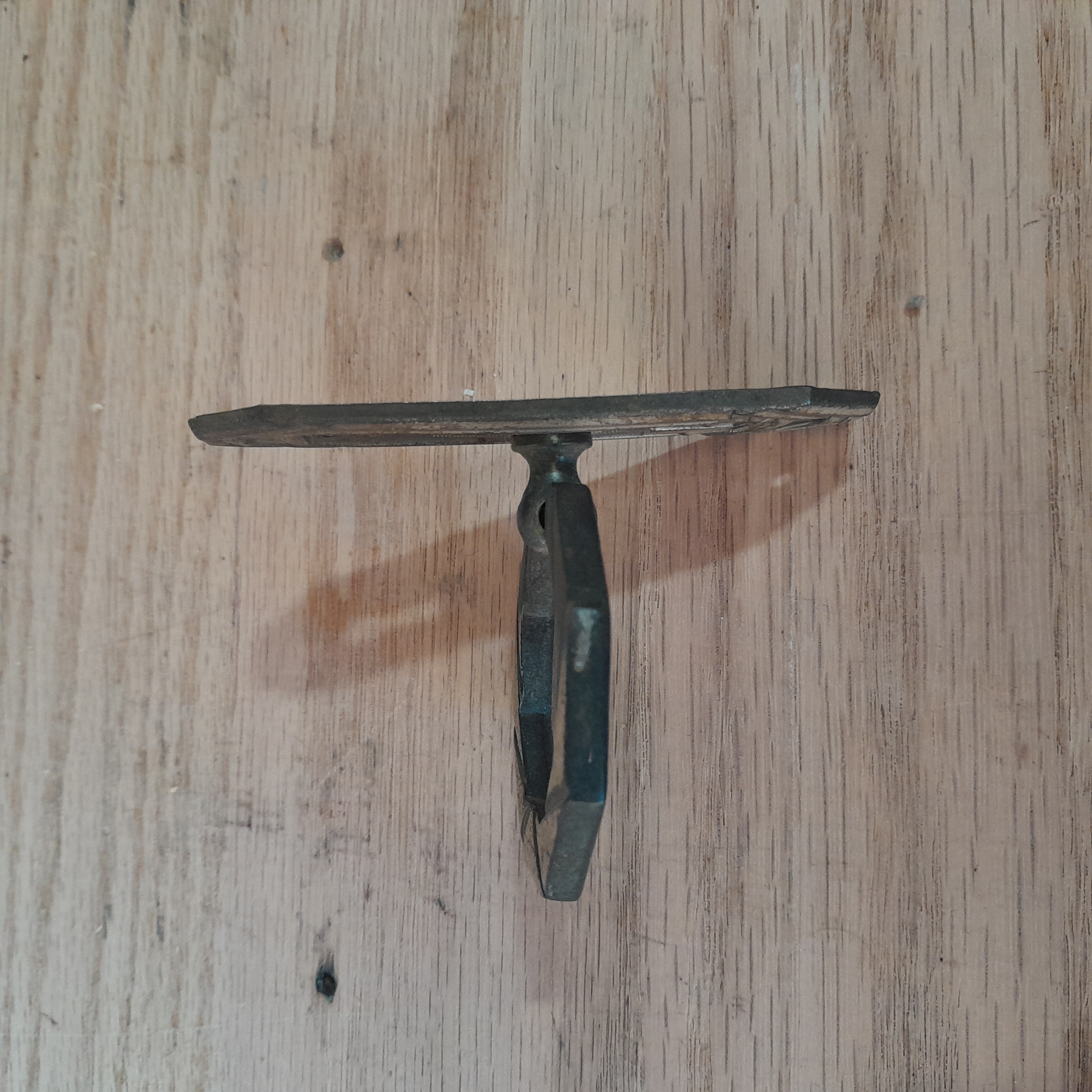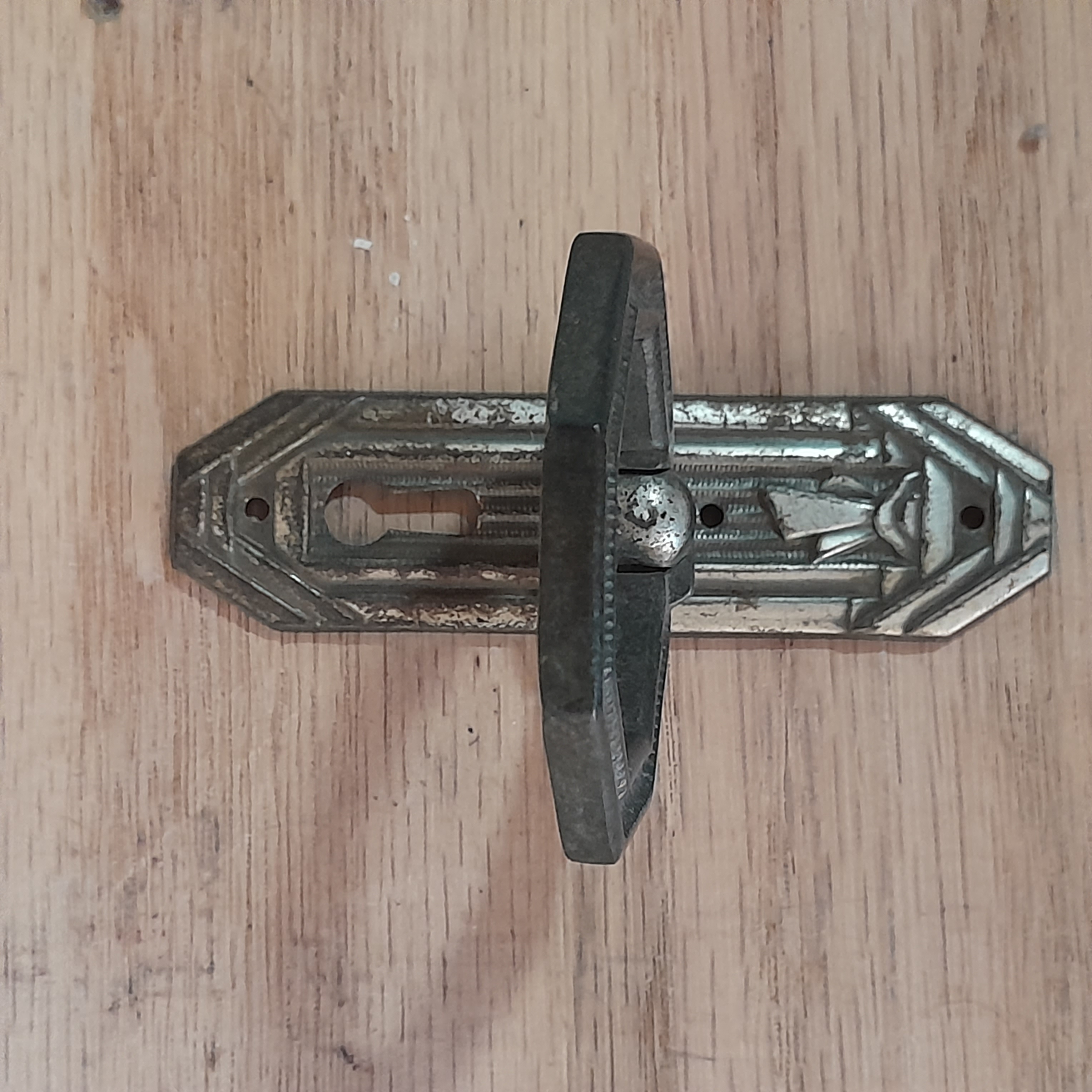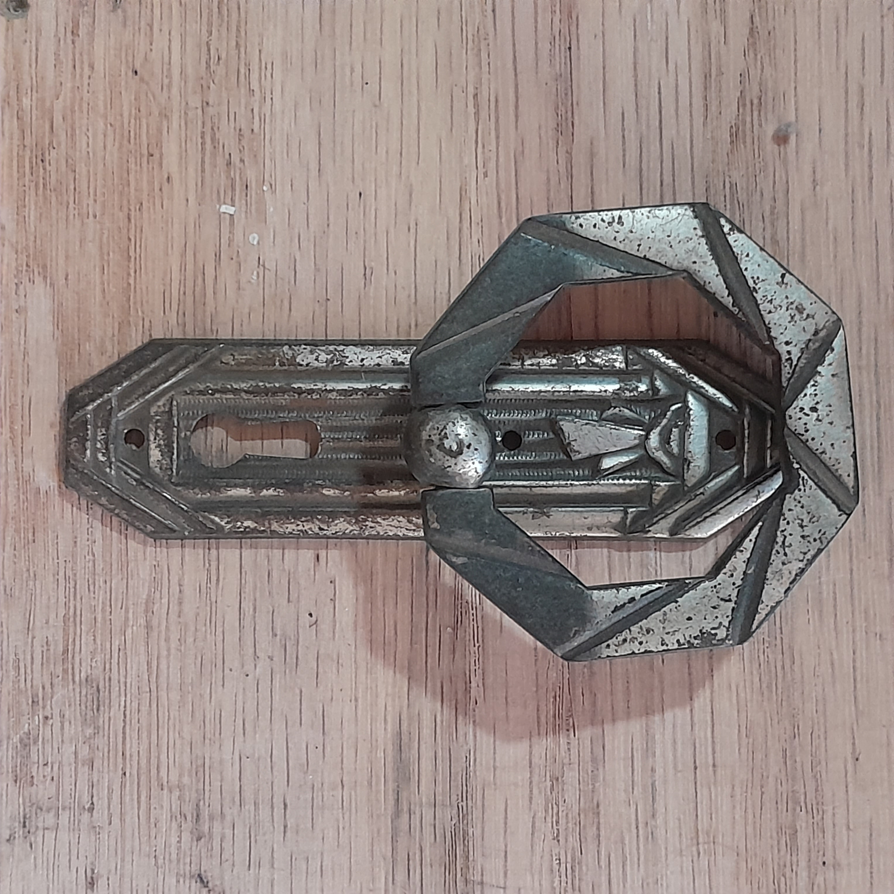 Made of stamped steel and with a fun patina. The large pull ring provides a comfortable feel. Art Deco lines and shapes abound.