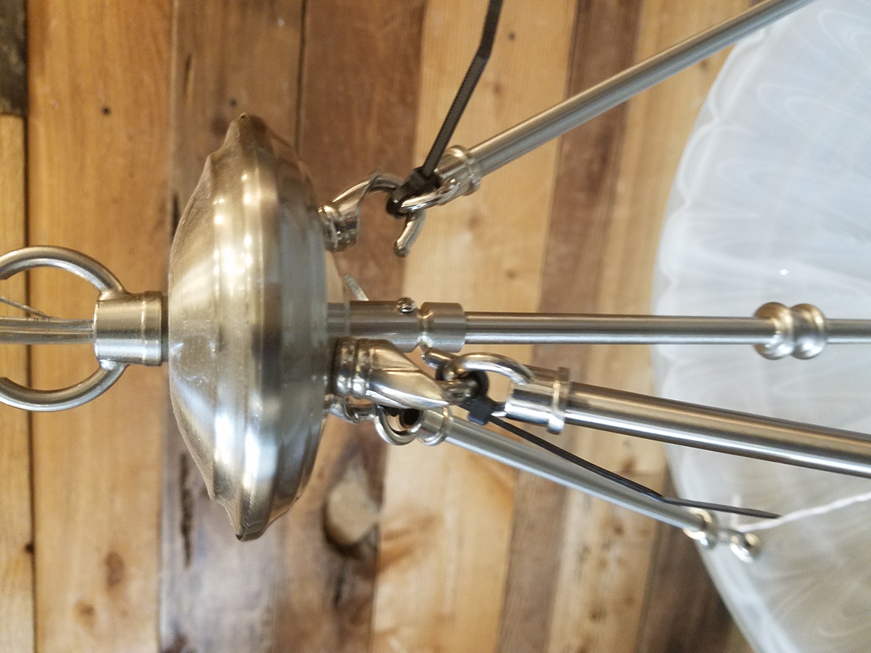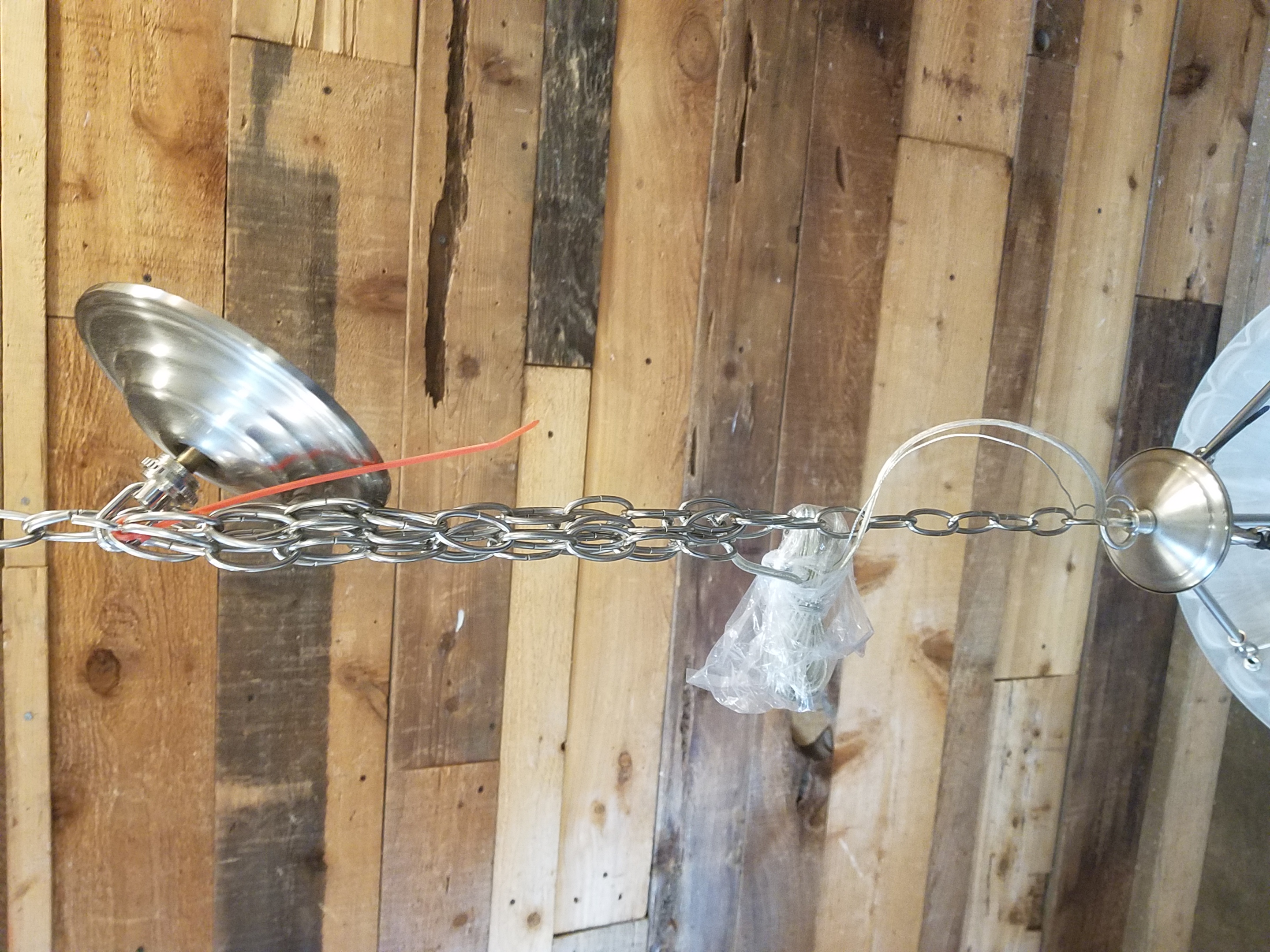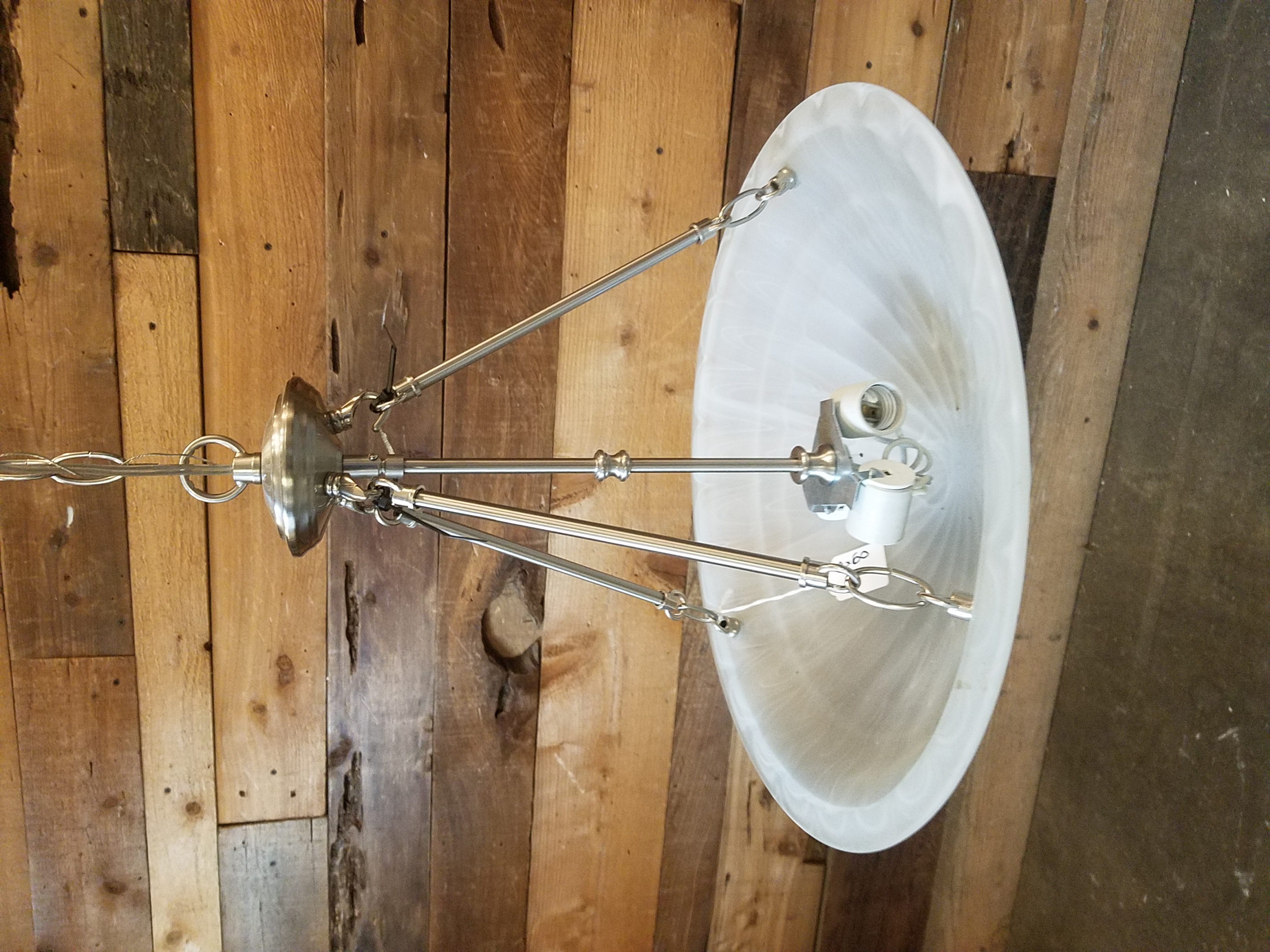 Modern brushed nickel fixture with 48 inches of chain to allow you to swag the light or hang it real low in a stairwell.