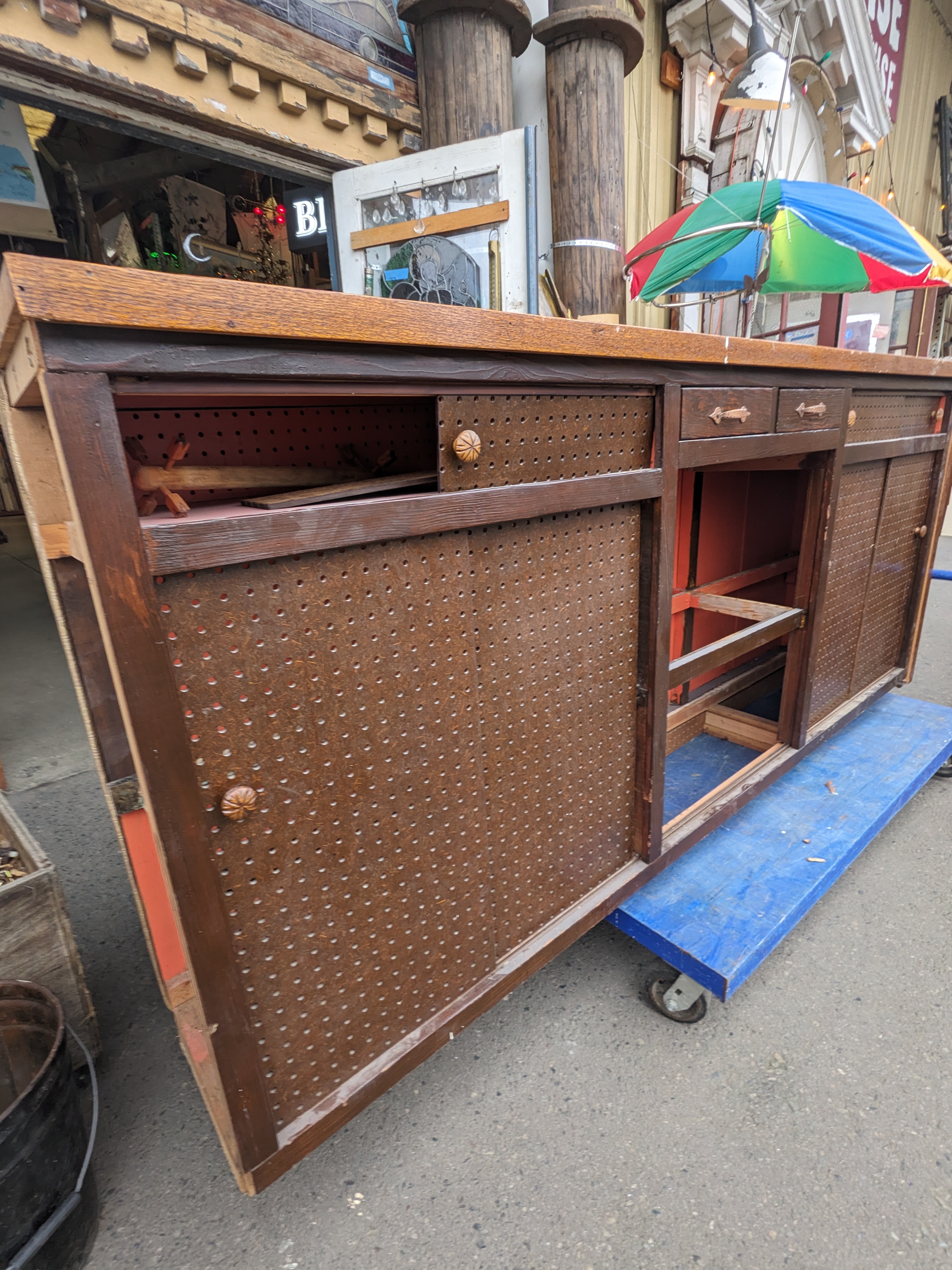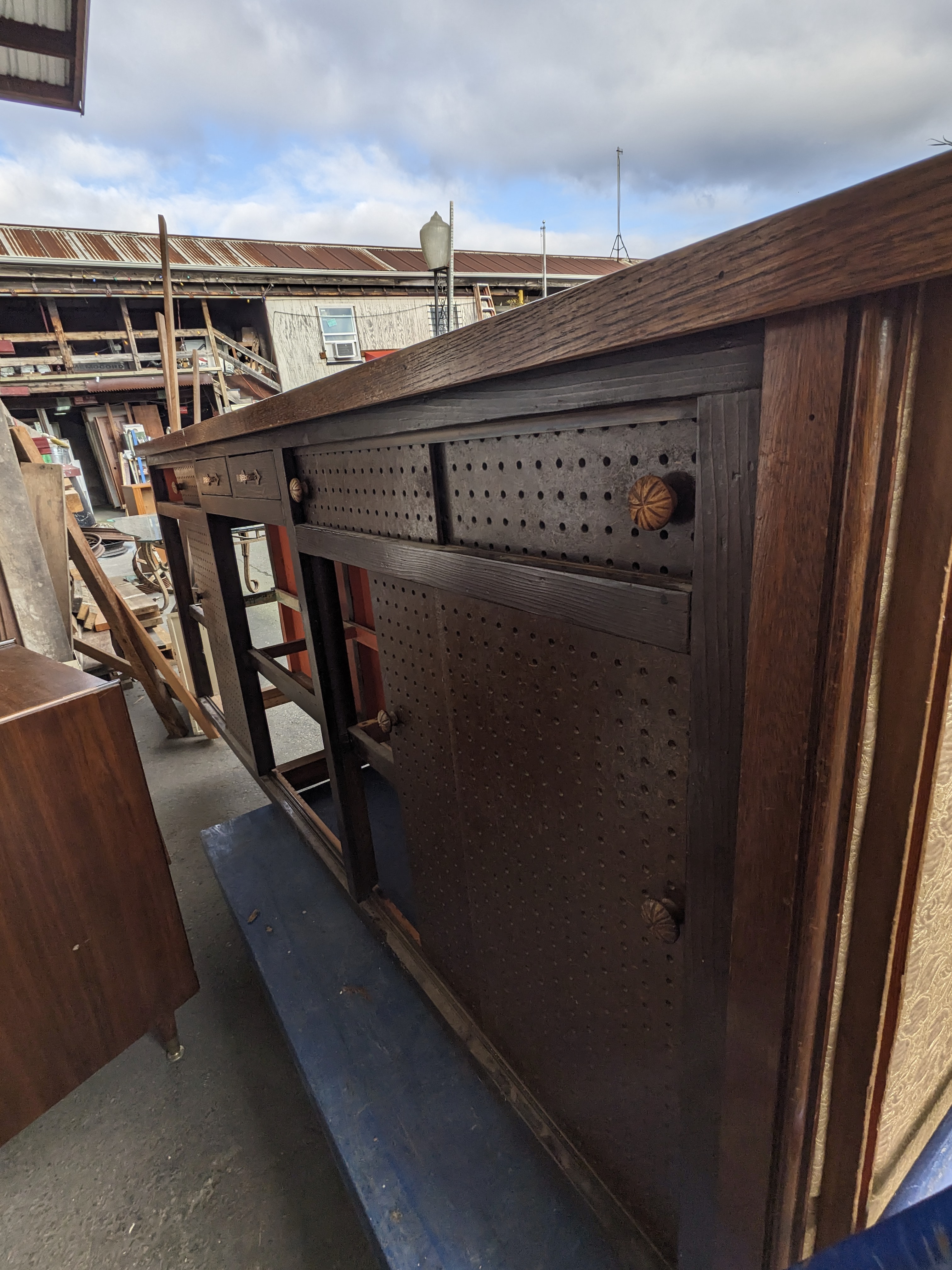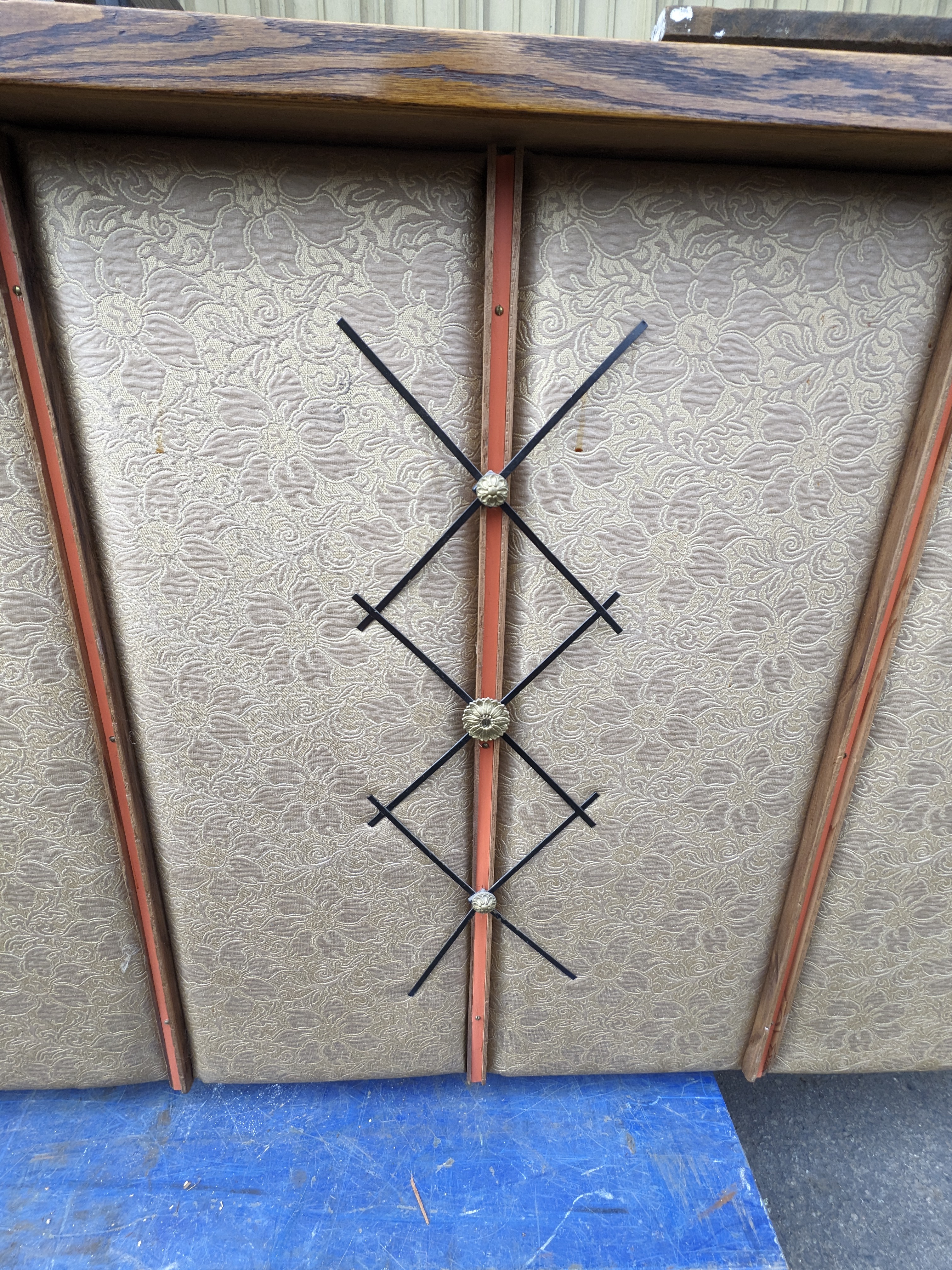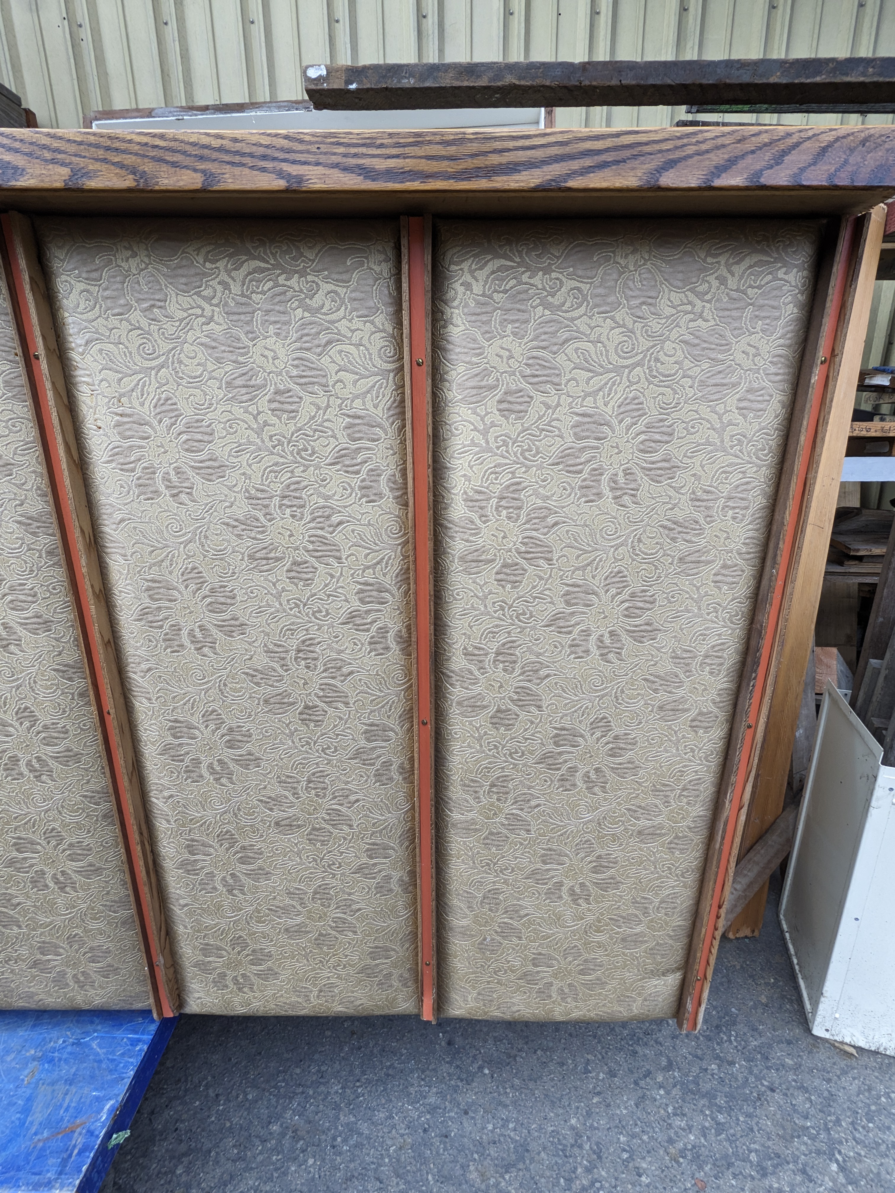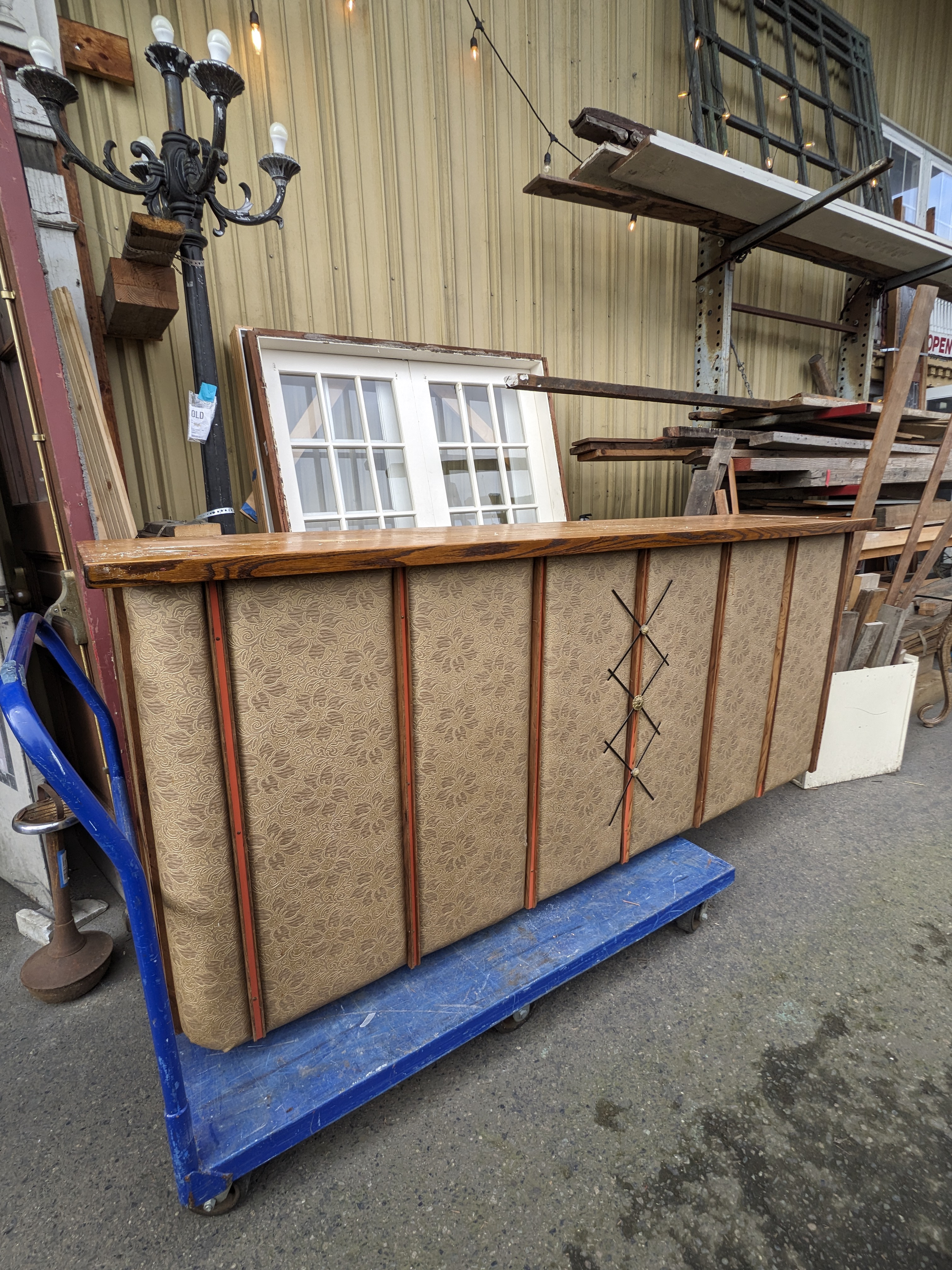 A wonderfully unique bar, flanked with tufted cushions around the facade adorned with a mites floral pattern, a muted color way makes it a great fit for the right space. No tears in the fabric or major staining. It also has plenty of storage for all your needs.