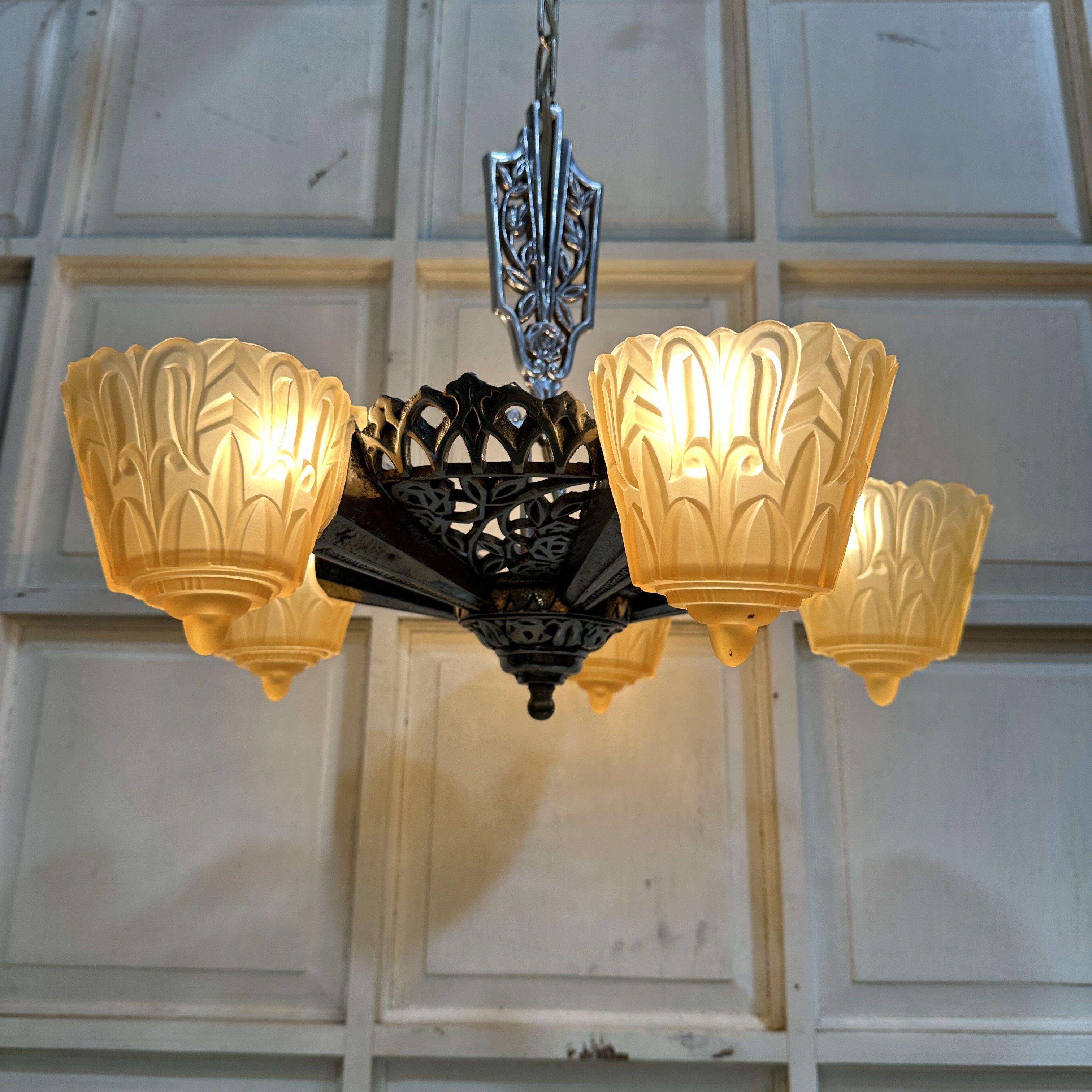 This is an amazing vintage 5-light chandelier from the Lincoln Lighting Company.