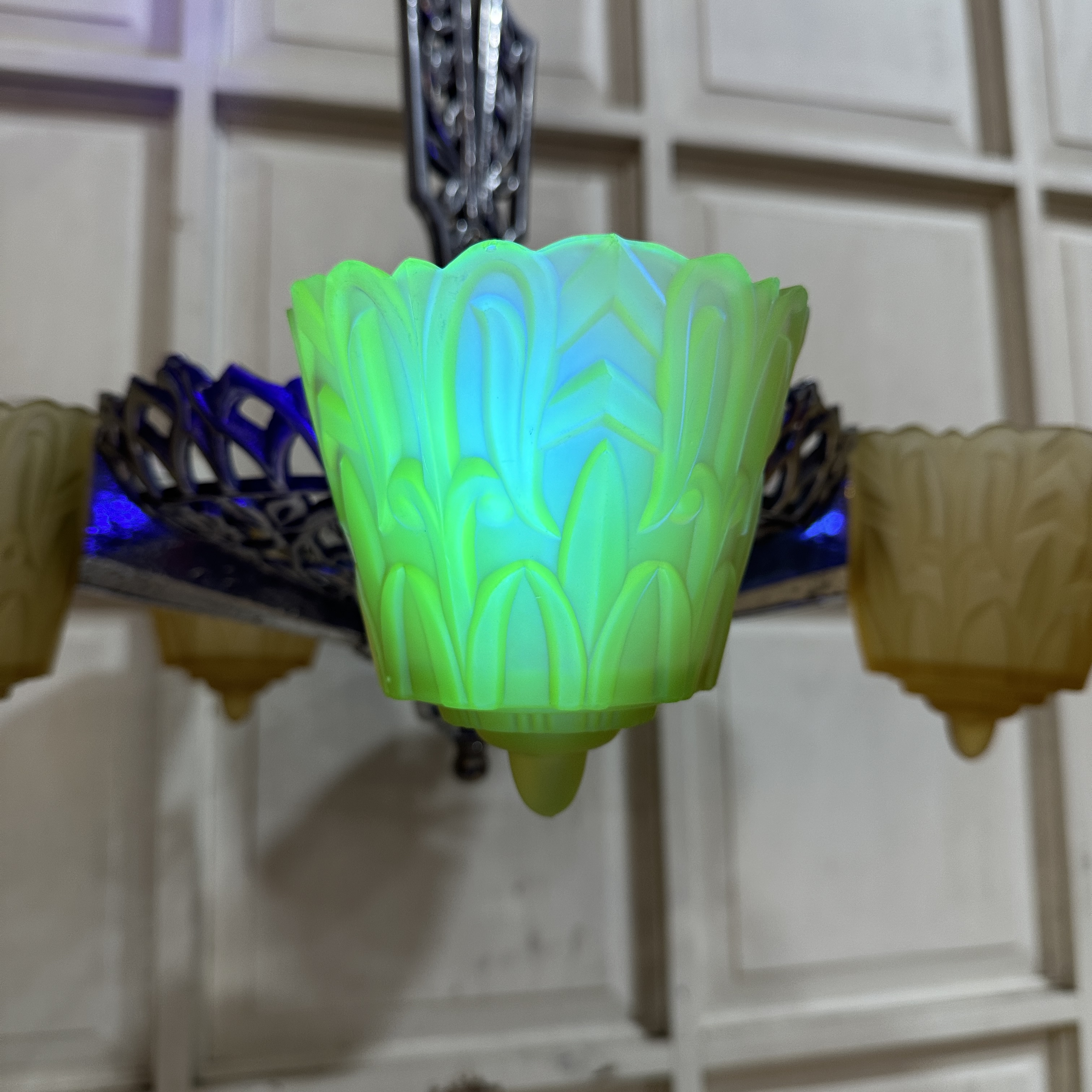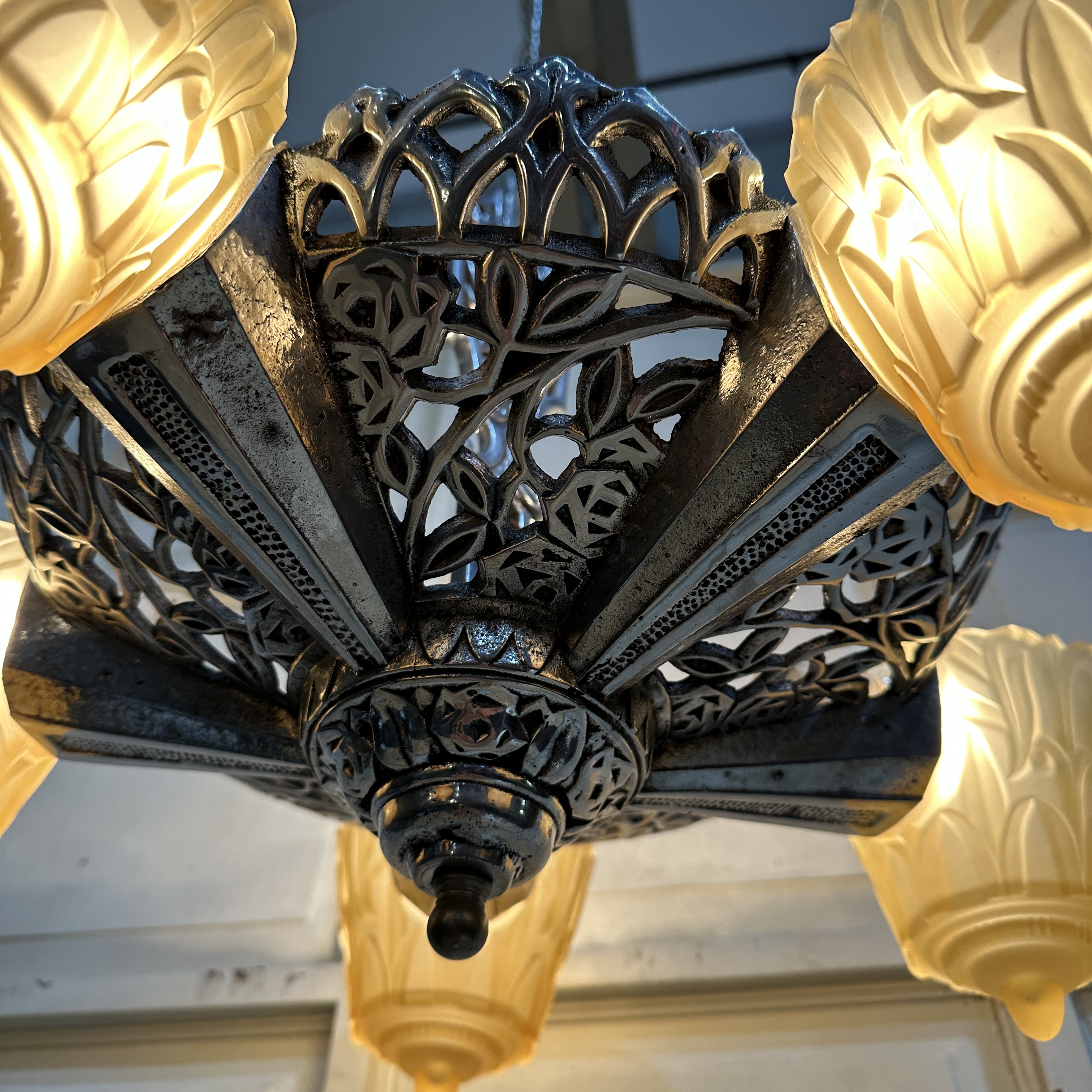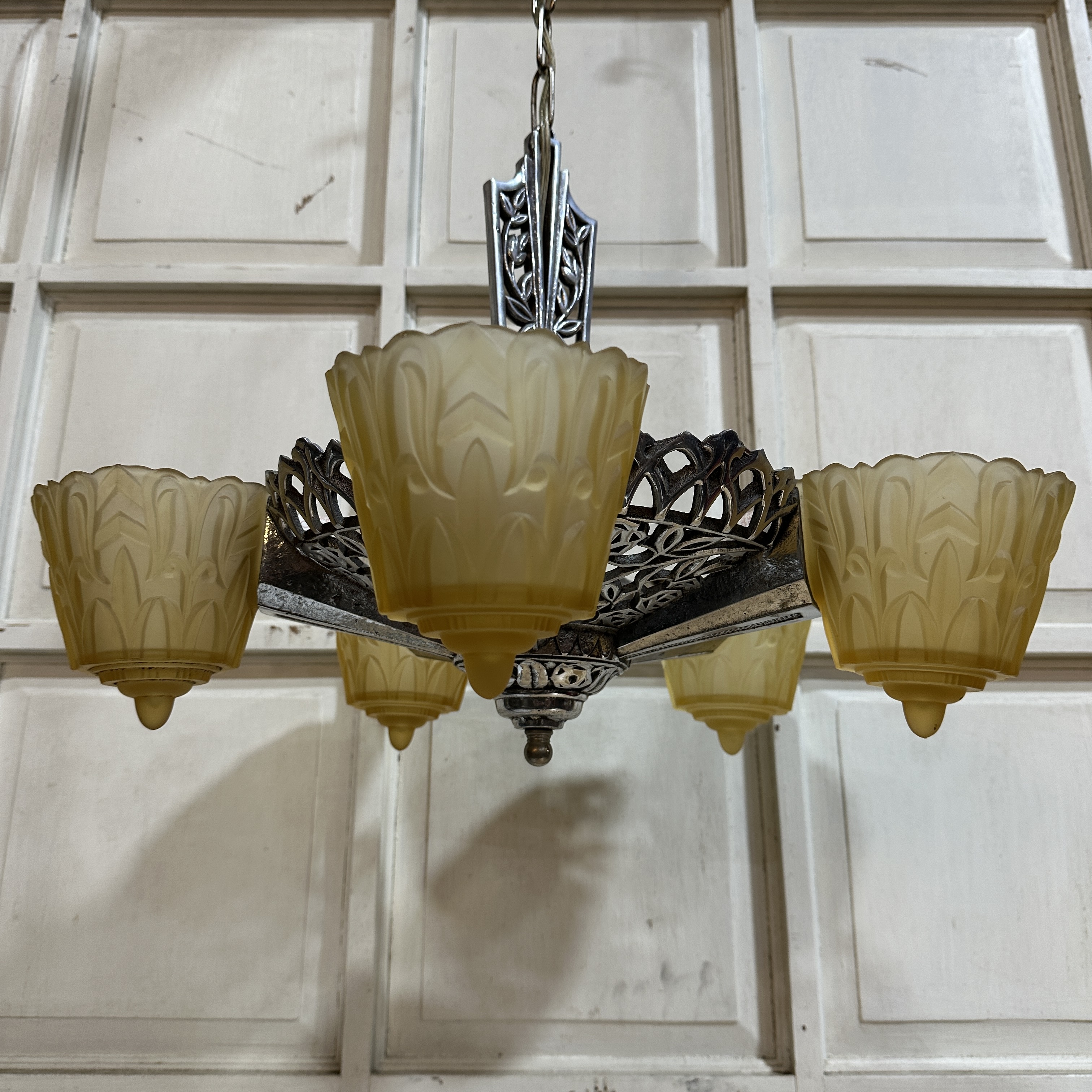 It features a cast aluminum body and canopy with an ornate rose and leaf design throughout. The piece includes all five original uranium glass slip shades in a light caramel color. While there are a few very small chips at the top of some shades, they are not noticeable unless inspected closely and are in the back where it slips into place.